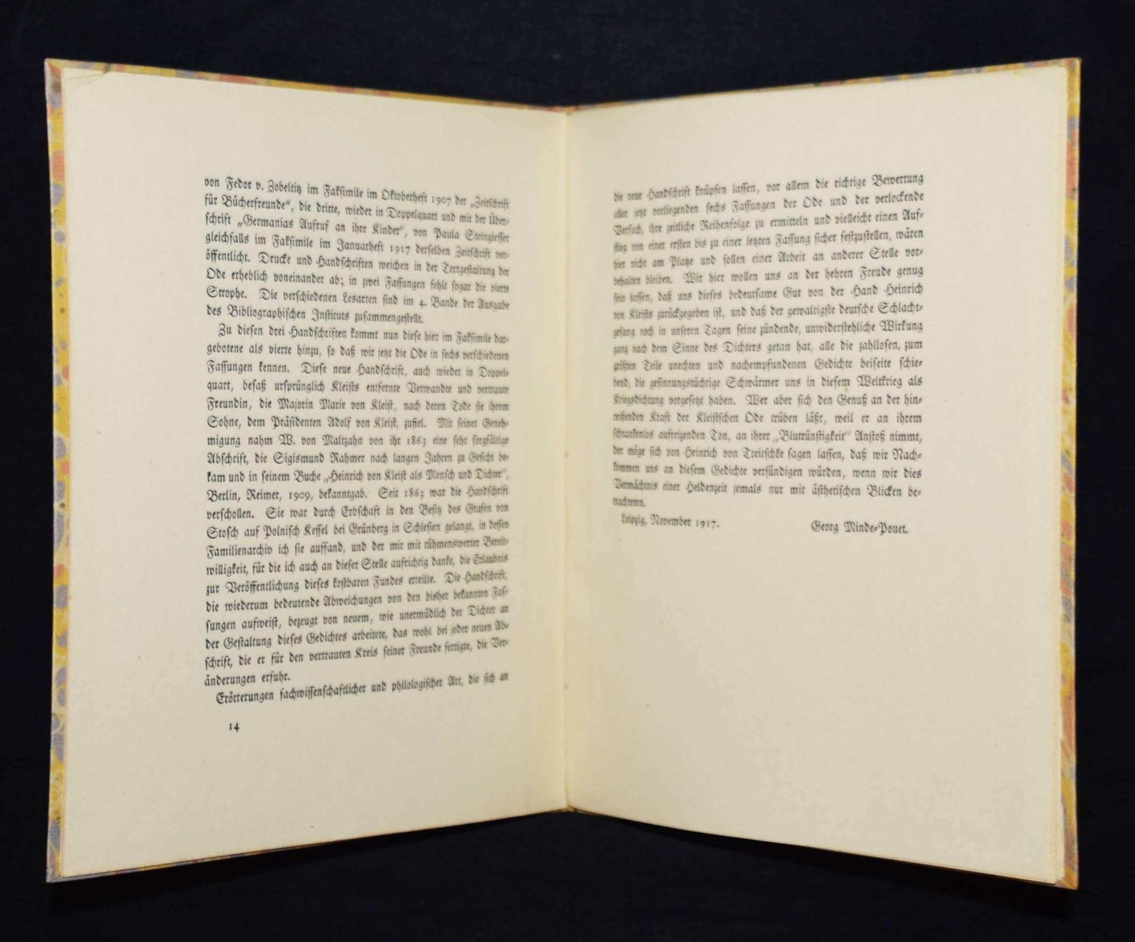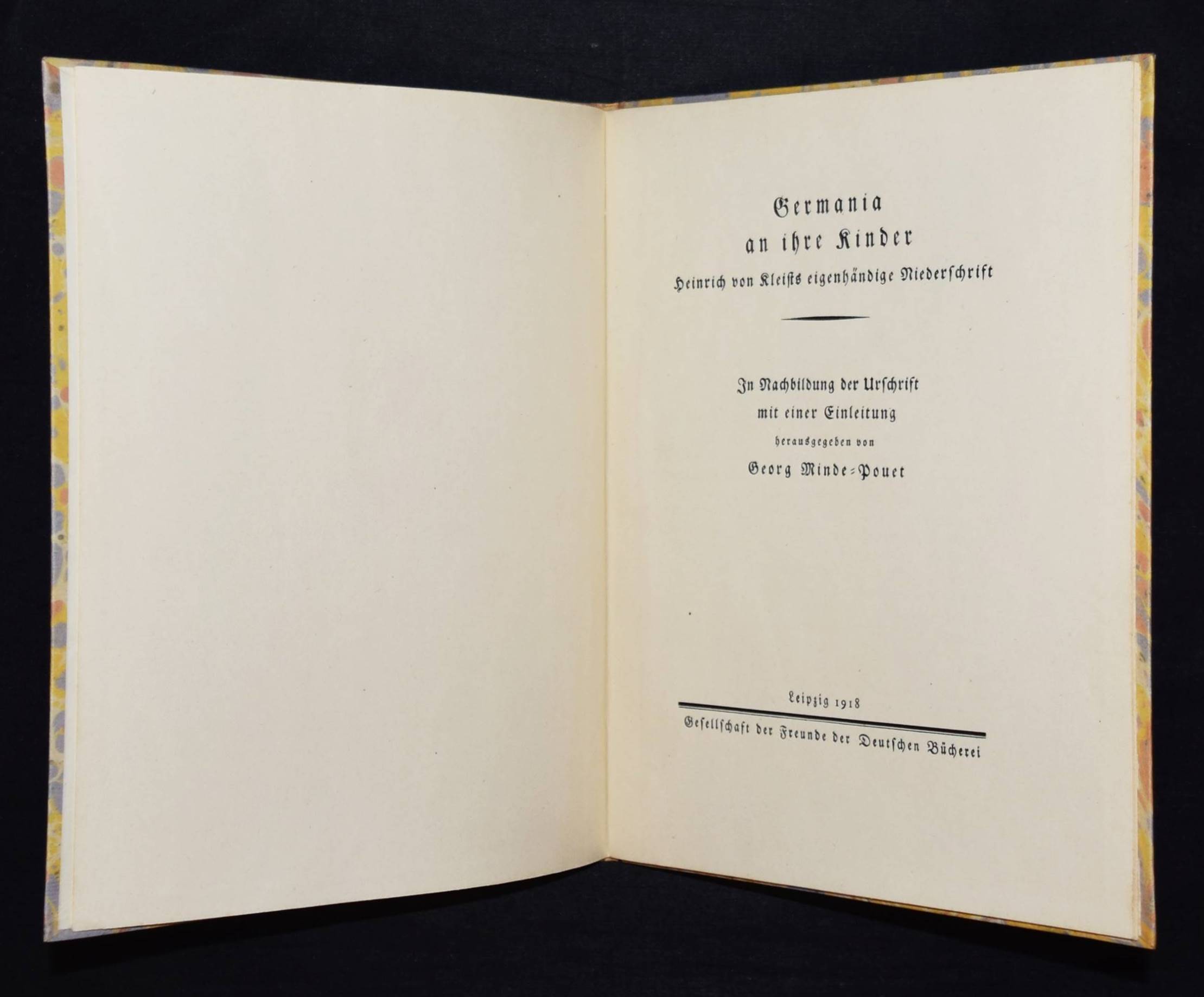 Kleist, Heinrich von. Germania an ihre Kinder. Heinrich von Kleists eigenhändige Niederschrift. In Nachbildung der Urschrift mit einer Einleitung herausgegeben von Georg Minde-Pouet. Leipzig, Gesellschaft der Freunde der Deutschen Bücherei 1918. Gr.-8°. 14 S., 1 Bl., 2 Bl. (Faksimile der Handschrift). Marm. OPbd. mit Deckelschild. (Jahresgabe der Gesellschaft der Freunde der Deutschen Bücherei). Faksimile. – Eines von 1300 num. Exemplaren. – Einband etwas berieben, Rücken etwa nachgedunkelt, sonst sehr gutes Exemplar.