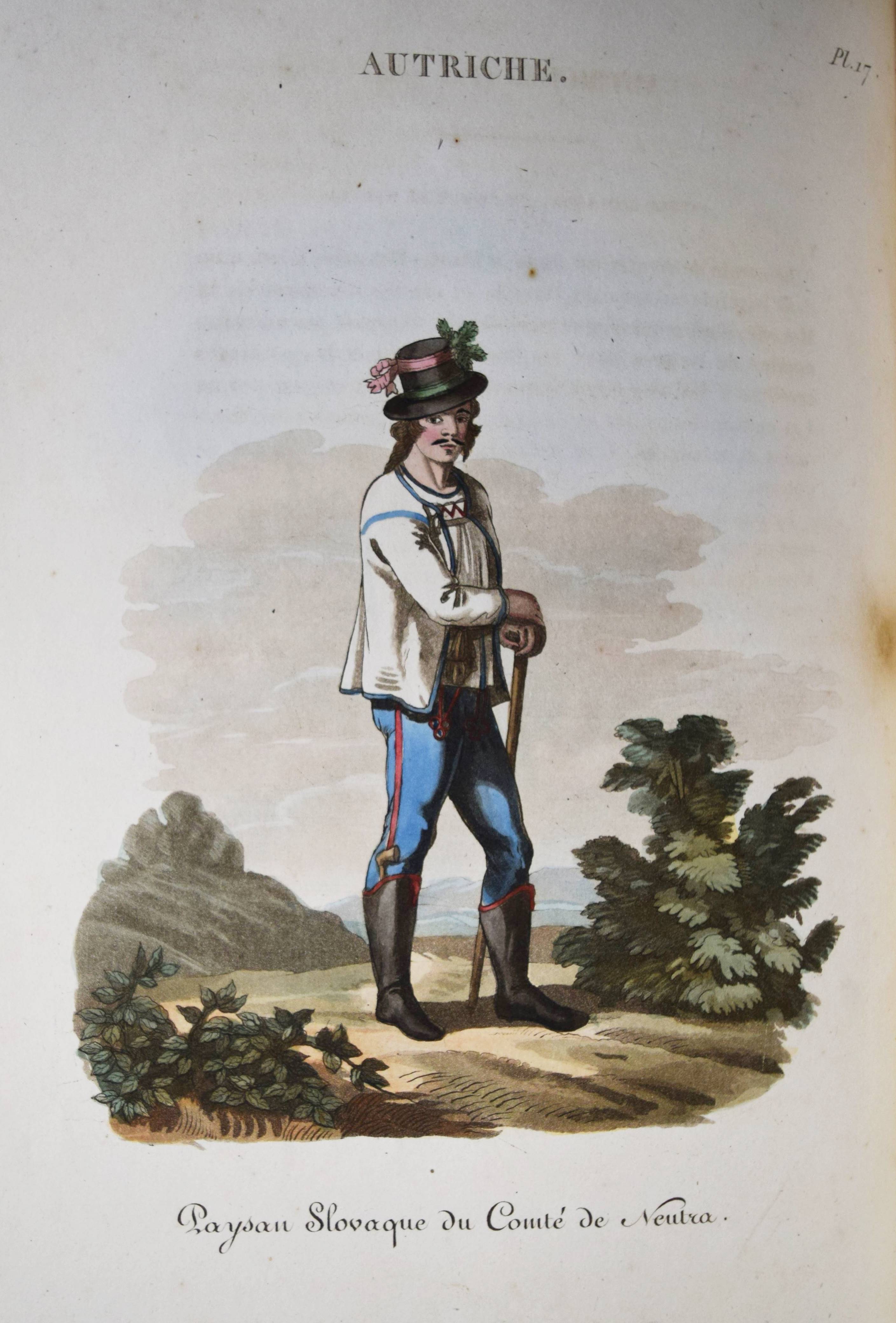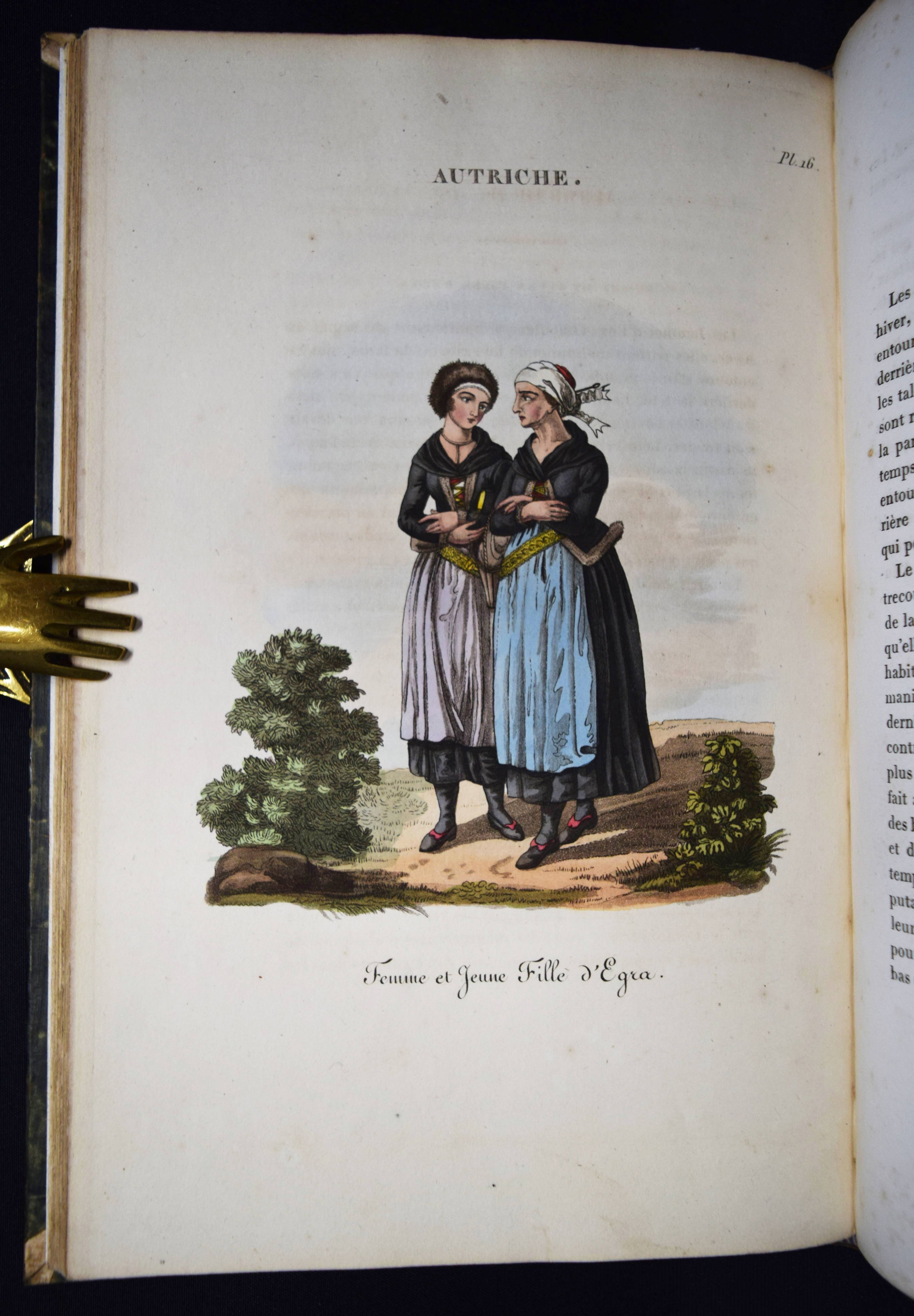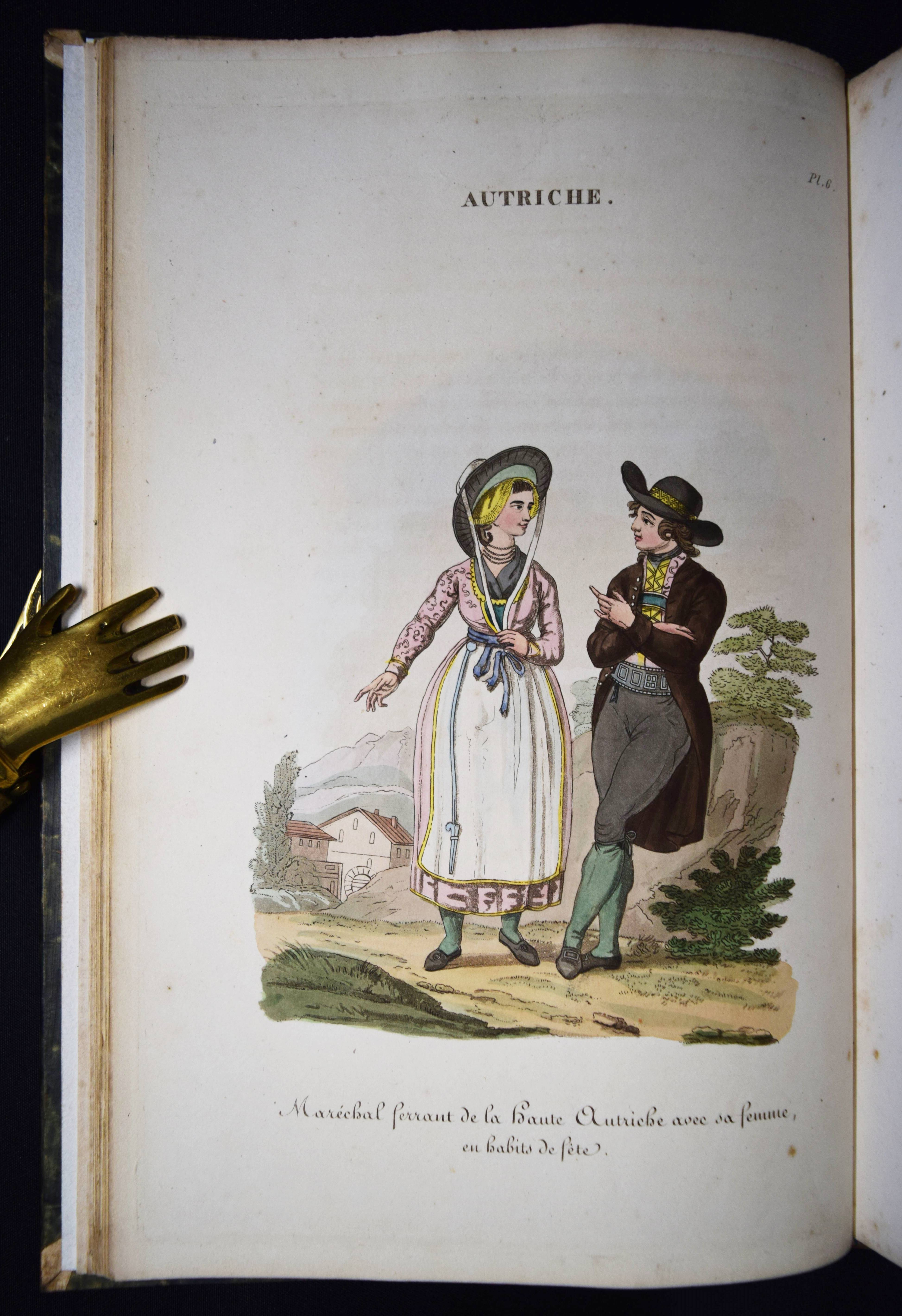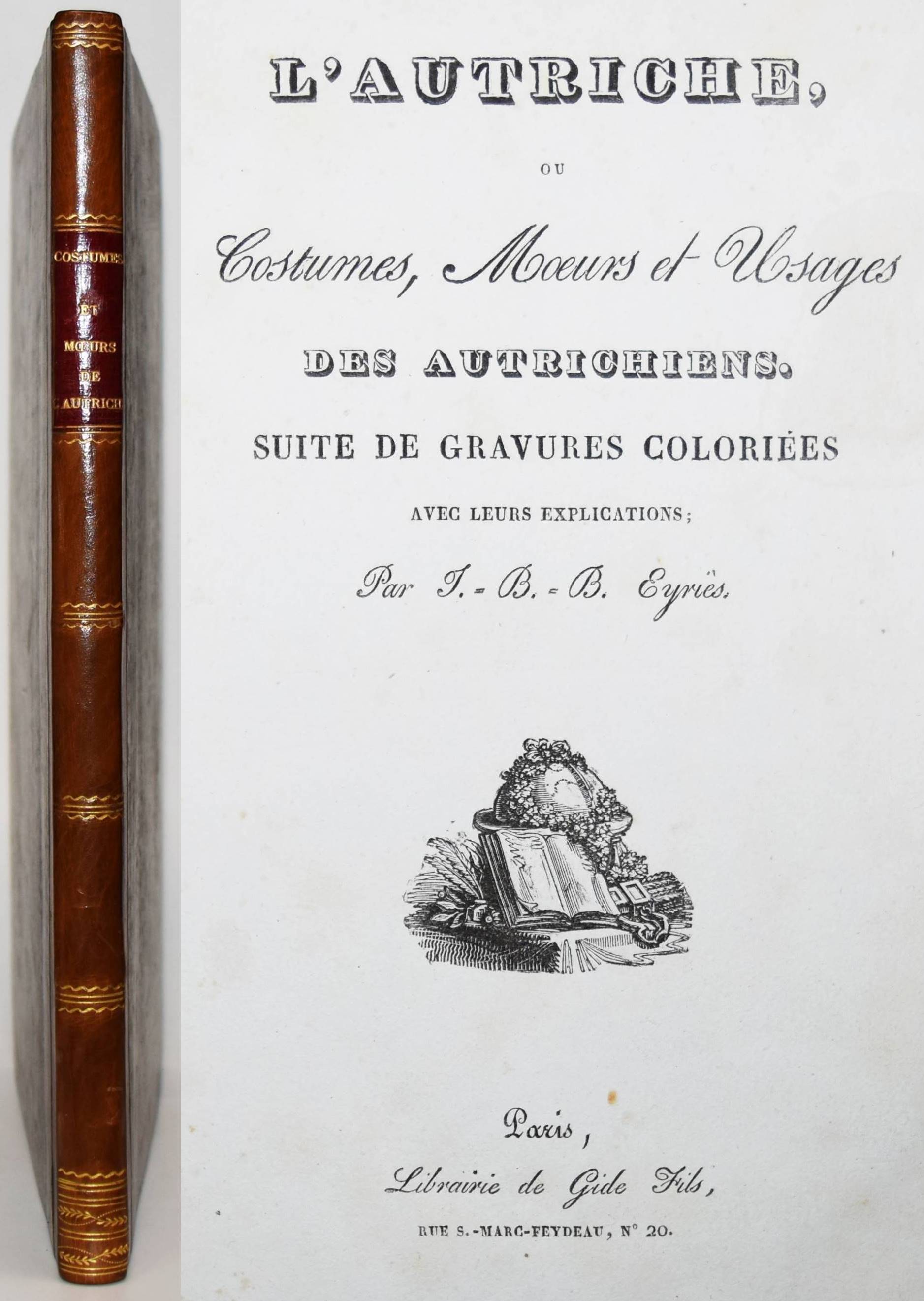 Eyriès, J(ean) B(aptiste) B(enoît). L’ Autriche, ou costumes, moeurs et usages des Autrichiens. Paris, Librairie de Gide Fils o. J. (um 1825). 4° (27 x 17 cm.). [68] S. mit Titelvignette und 24 handkol. lithogr. Tafeln. Halblederband der Zeit mit goldgepr. Rückenschild und Rückenvergoldung. Colas 1013. Hiler 300. Quérard III, 50. Nicht bei Lipperheide. – Erste und einzige Ausgabe. – Mit dekorativen Trachten-Darstellungen verschiedenster lokaler österreichischer Provenienz, und vertritt die gesamte ethnographische Breite des austro-ungarischen Reiches (u.a. Ungarn, Kroaten, Russen, Slowaken, Slowenen und polnische Juden). – Leder-Exlibris, die Textseiten teils etwas braunfleckig, schönes dekorativ gebundenes Exemplar.