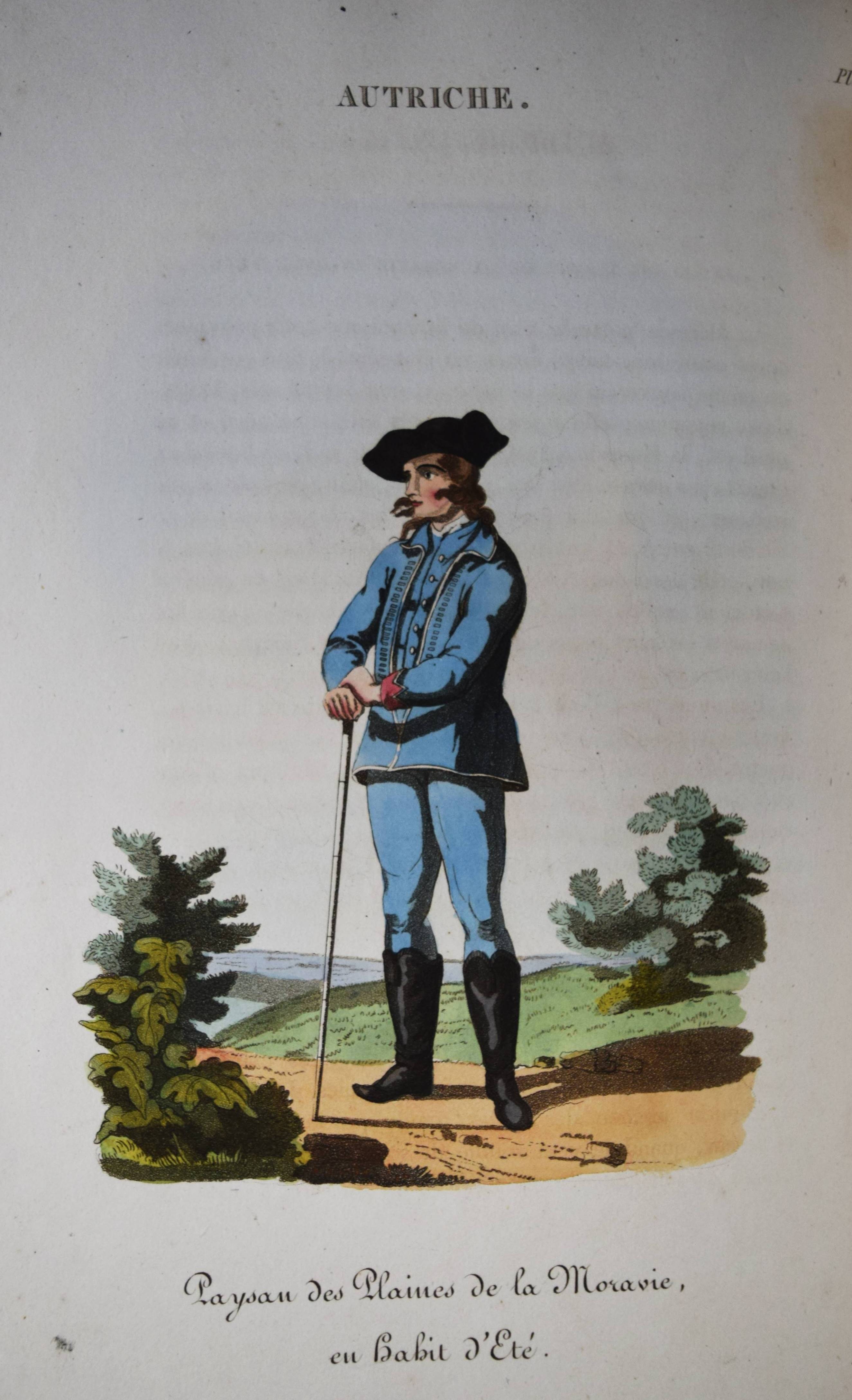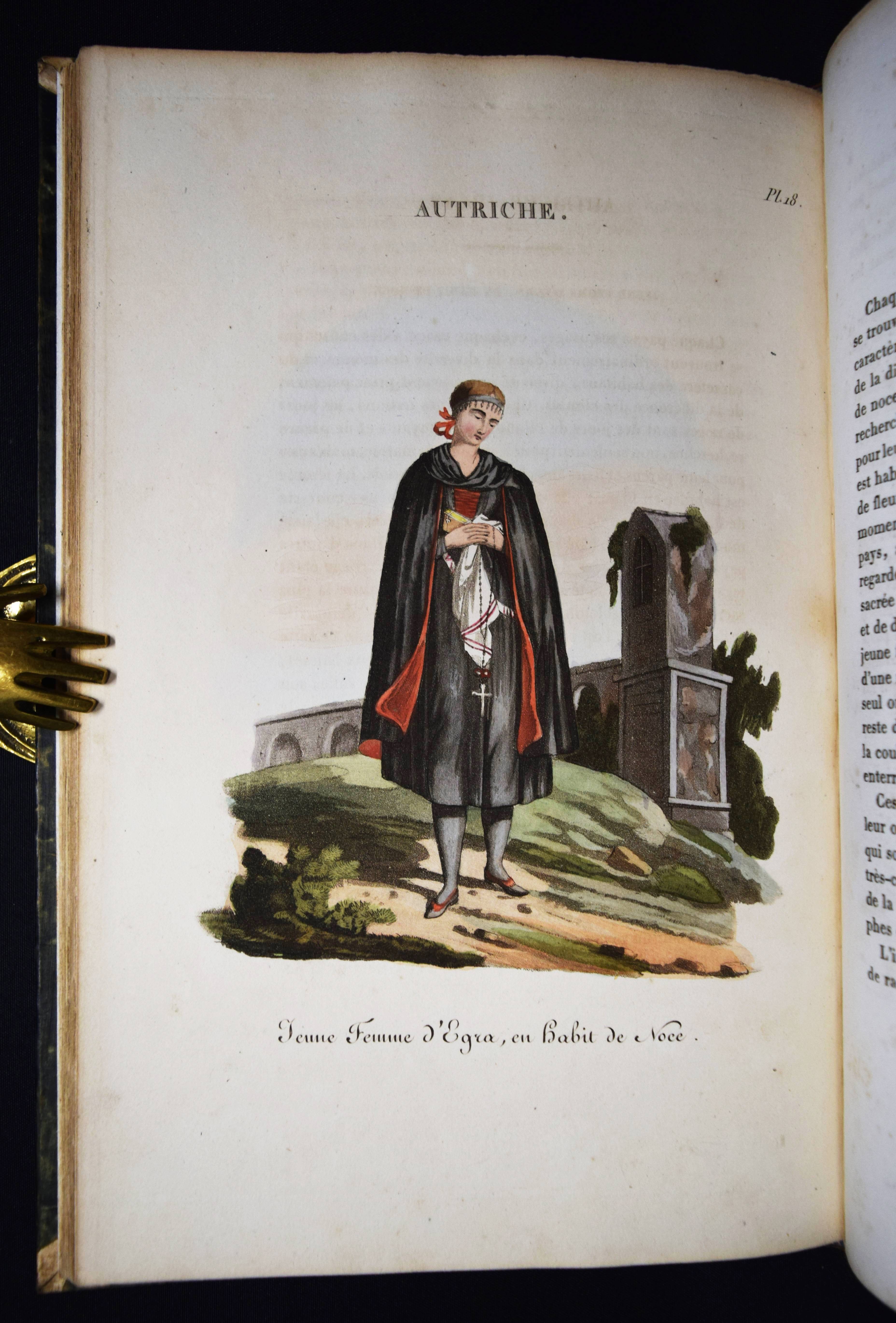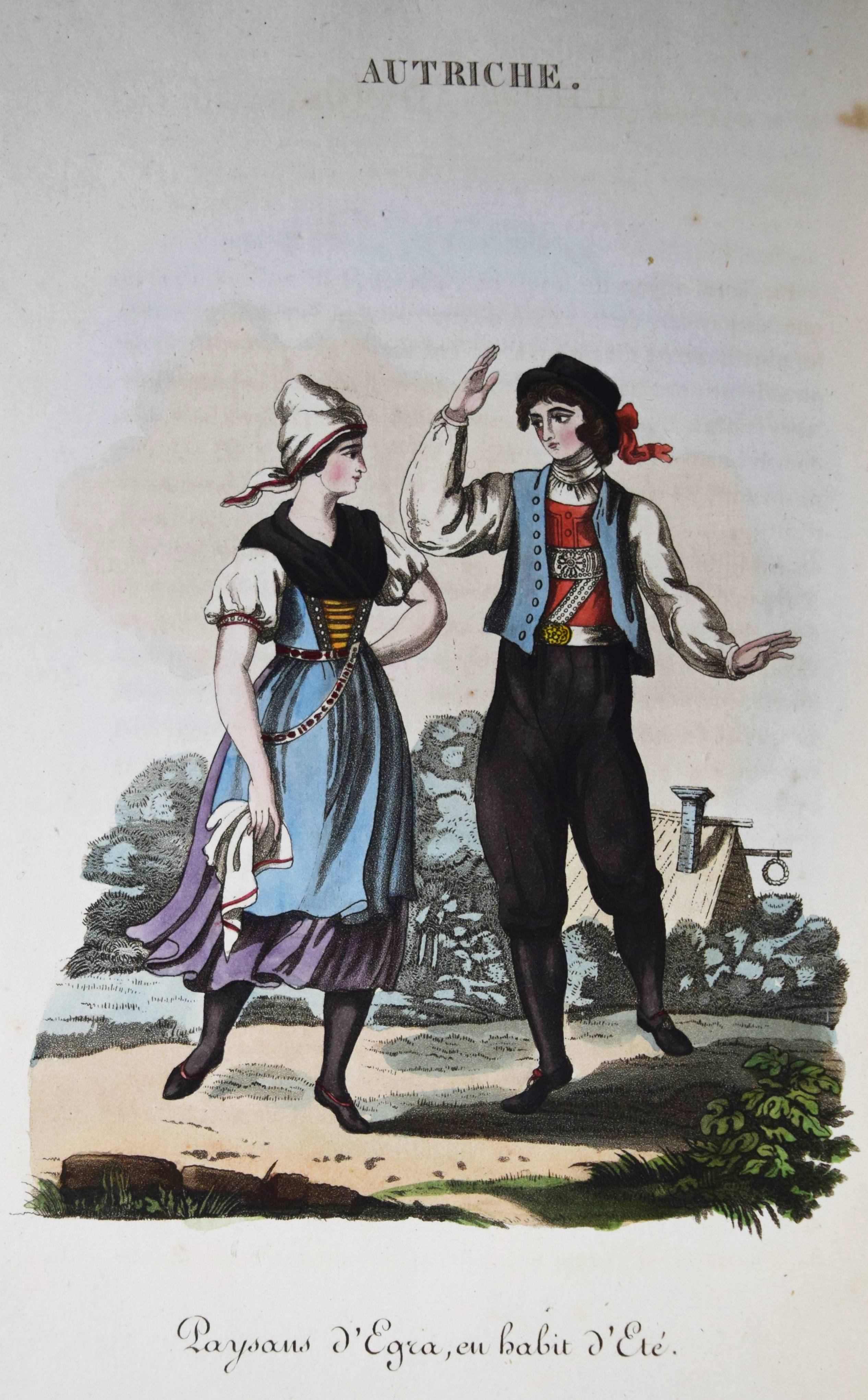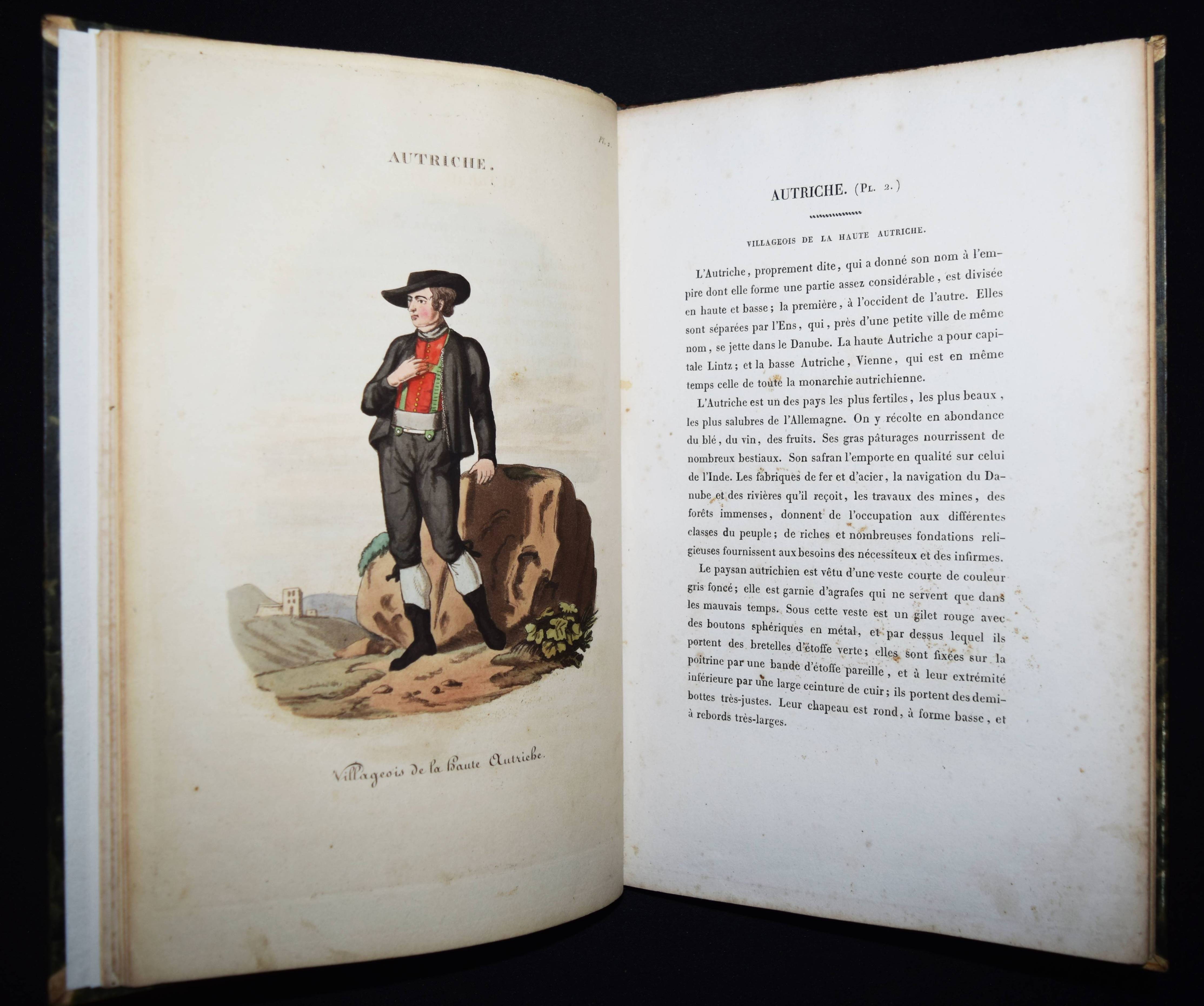 Eyriès, J(ean) B(aptiste) B(enoît). L’ Autriche, ou costumes, moeurs et usages des Autrichiens. Paris, Librairie de Gide Fils o. J. (um 1825). 4° (27 x 17 cm.). [68] S. mit Titelvignette und 24 handkol. lithogr. Tafeln. Halblederband der Zeit mit goldgepr. Rückenschild und Rückenvergoldung. Colas 1013. Hiler 300. Quérard III, 50. Nicht bei Lipperheide. – Erste und einzige Ausgabe. – Mit dekorativen Trachten-Darstellungen verschiedenster lokaler österreichischer Provenienz, und vertritt die gesamte ethnographische Breite des austro-ungarischen Reiches (u.a. Ungarn, Kroaten, Russen, Slowaken, Slowenen und polnische Juden). – Leder-Exlibris, die Textseiten teils etwas braunfleckig, schönes dekorativ gebundenes Exemplar.