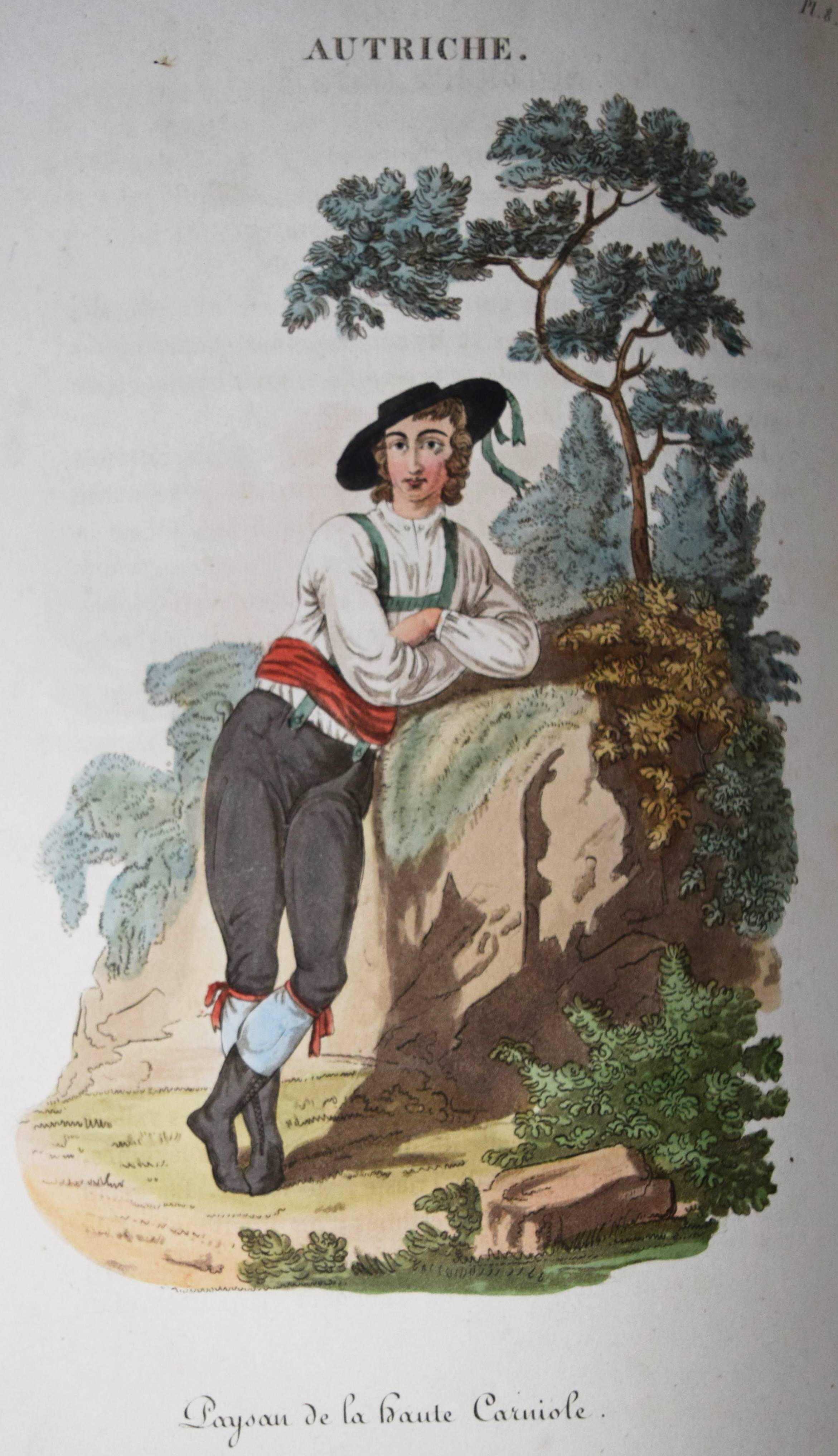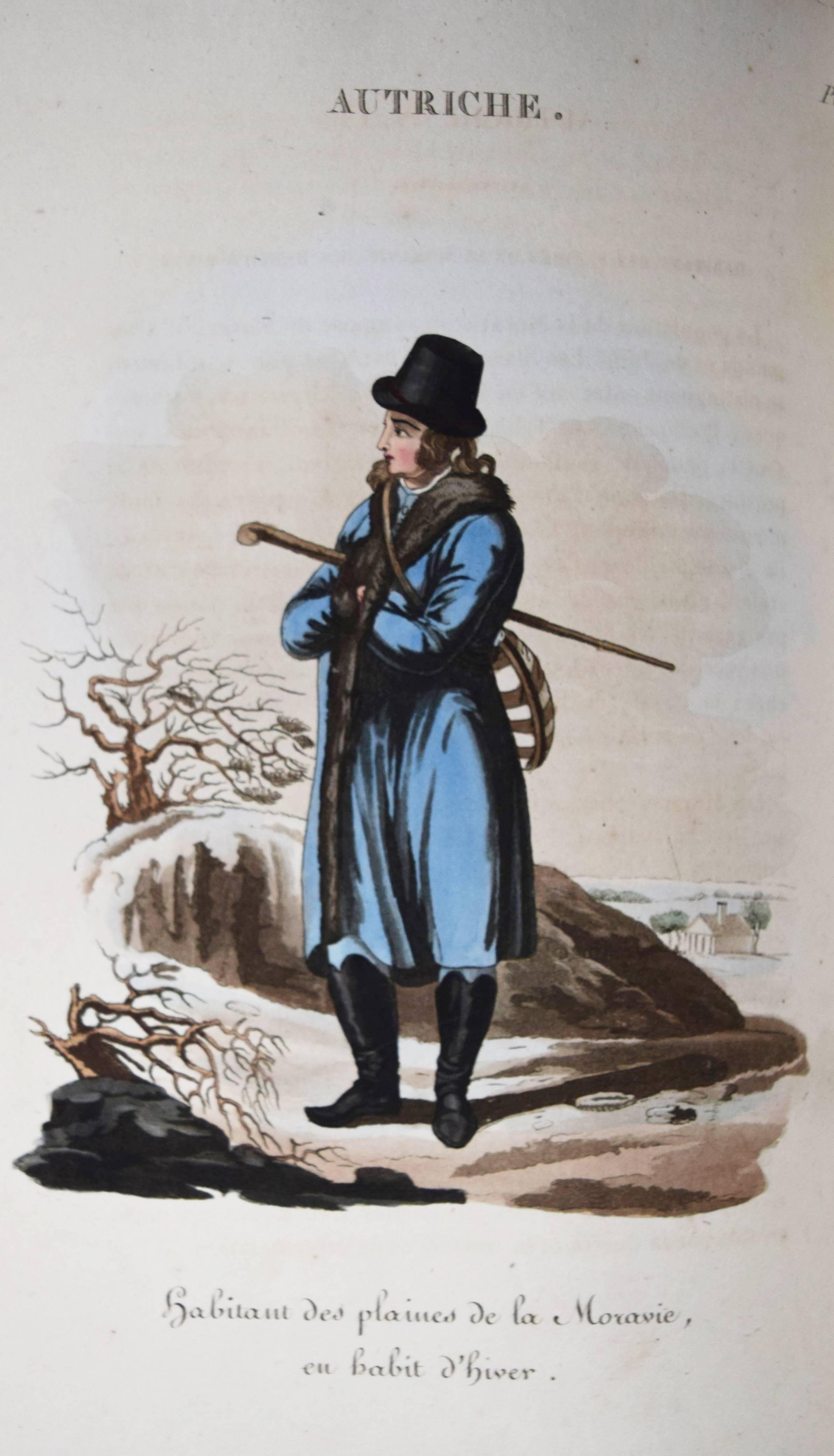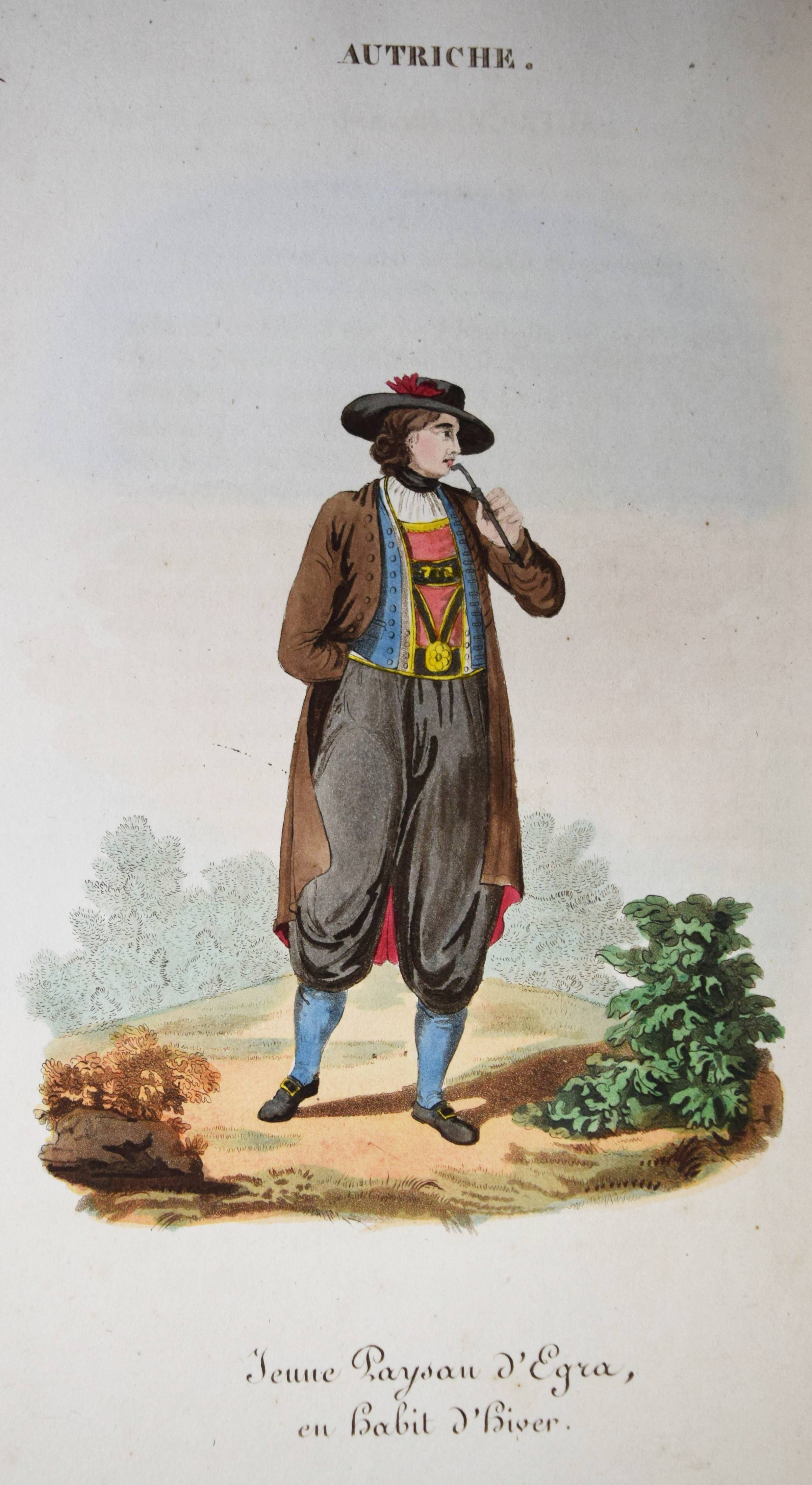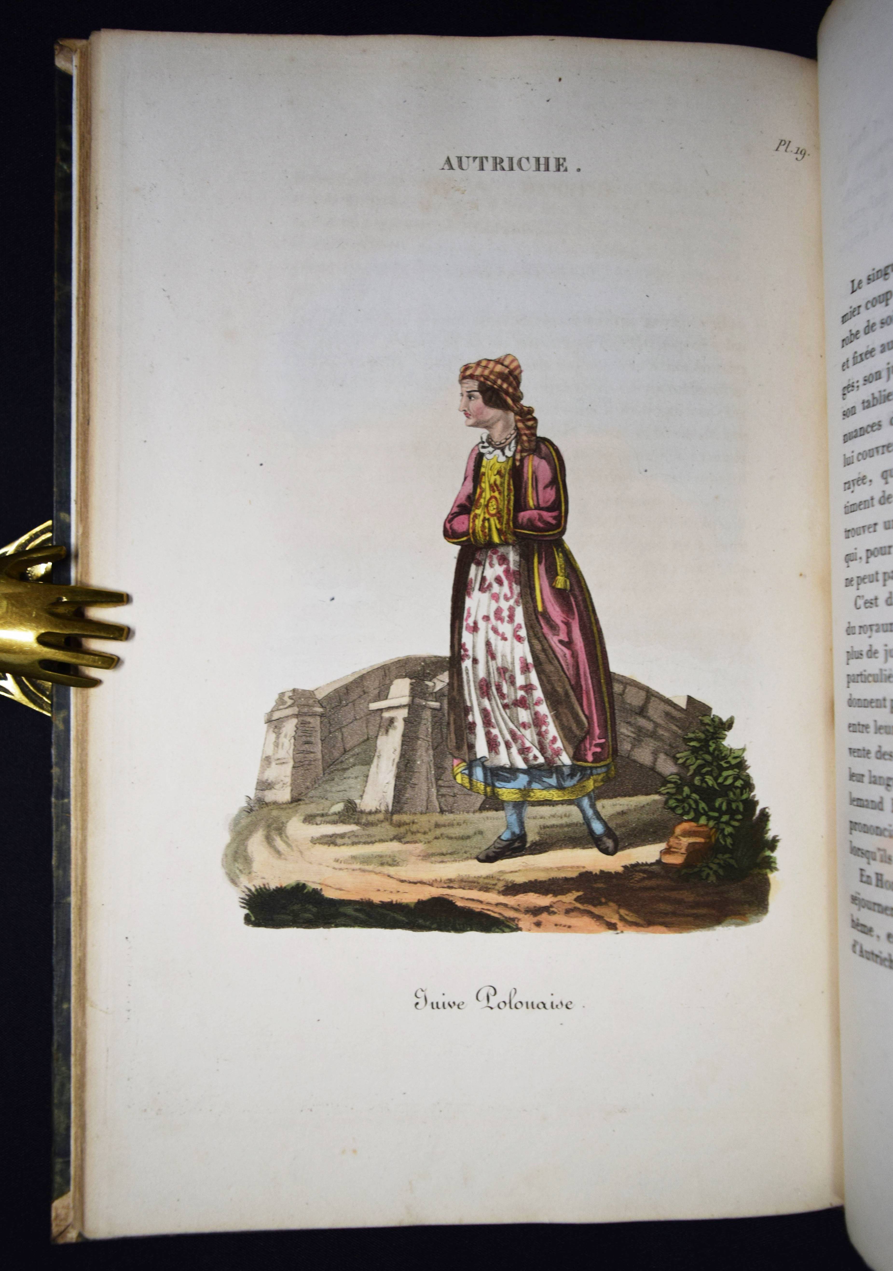 Eyriès, J(ean) B(aptiste) B(enoît). L’ Autriche, ou costumes, moeurs et usages des Autrichiens. Paris, Librairie de Gide Fils o. J. (um 1825). 4° (27 x 17 cm.). [68] S. mit Titelvignette und 24 handkol. lithogr. Tafeln. Halblederband der Zeit mit goldgepr. Rückenschild und Rückenvergoldung. Colas 1013. Hiler 300. Quérard III, 50. Nicht bei Lipperheide. – Erste und einzige Ausgabe. – Mit dekorativen Trachten-Darstellungen verschiedenster lokaler österreichischer Provenienz, und vertritt die gesamte ethnographische Breite des austro-ungarischen Reiches (u.a. Ungarn, Kroaten, Russen, Slowaken, Slowenen und polnische Juden). – Leder-Exlibris, die Textseiten teils etwas braunfleckig, schönes dekorativ gebundenes Exemplar.