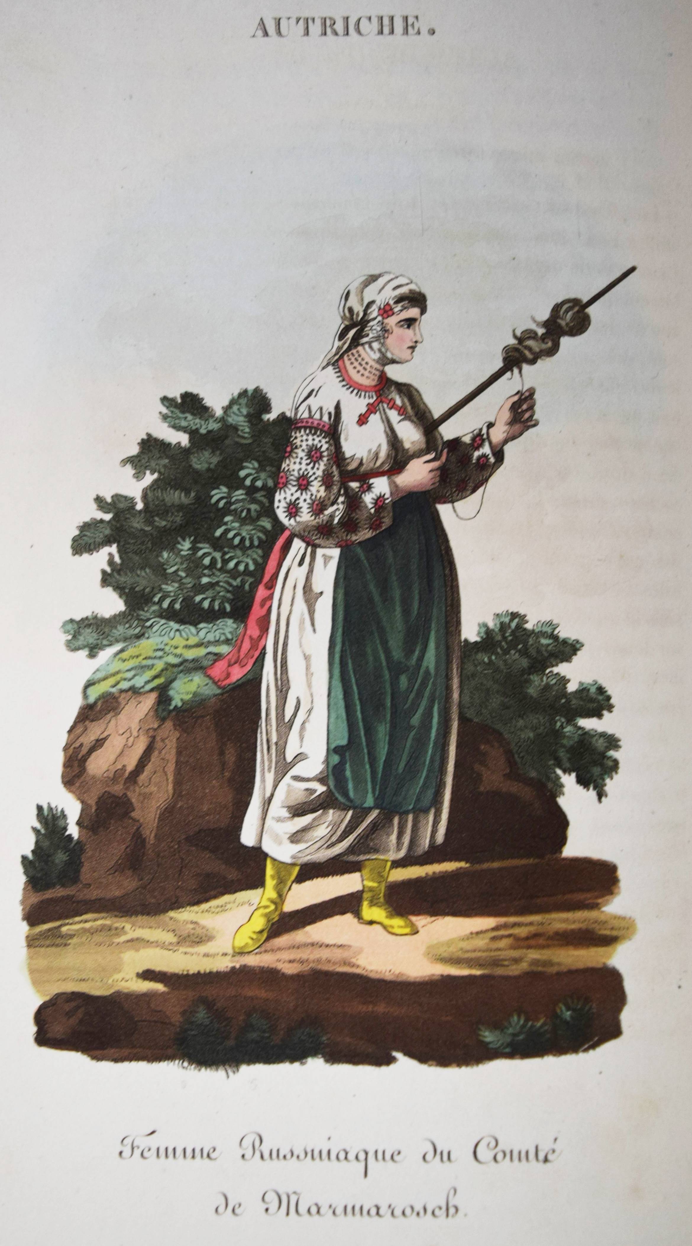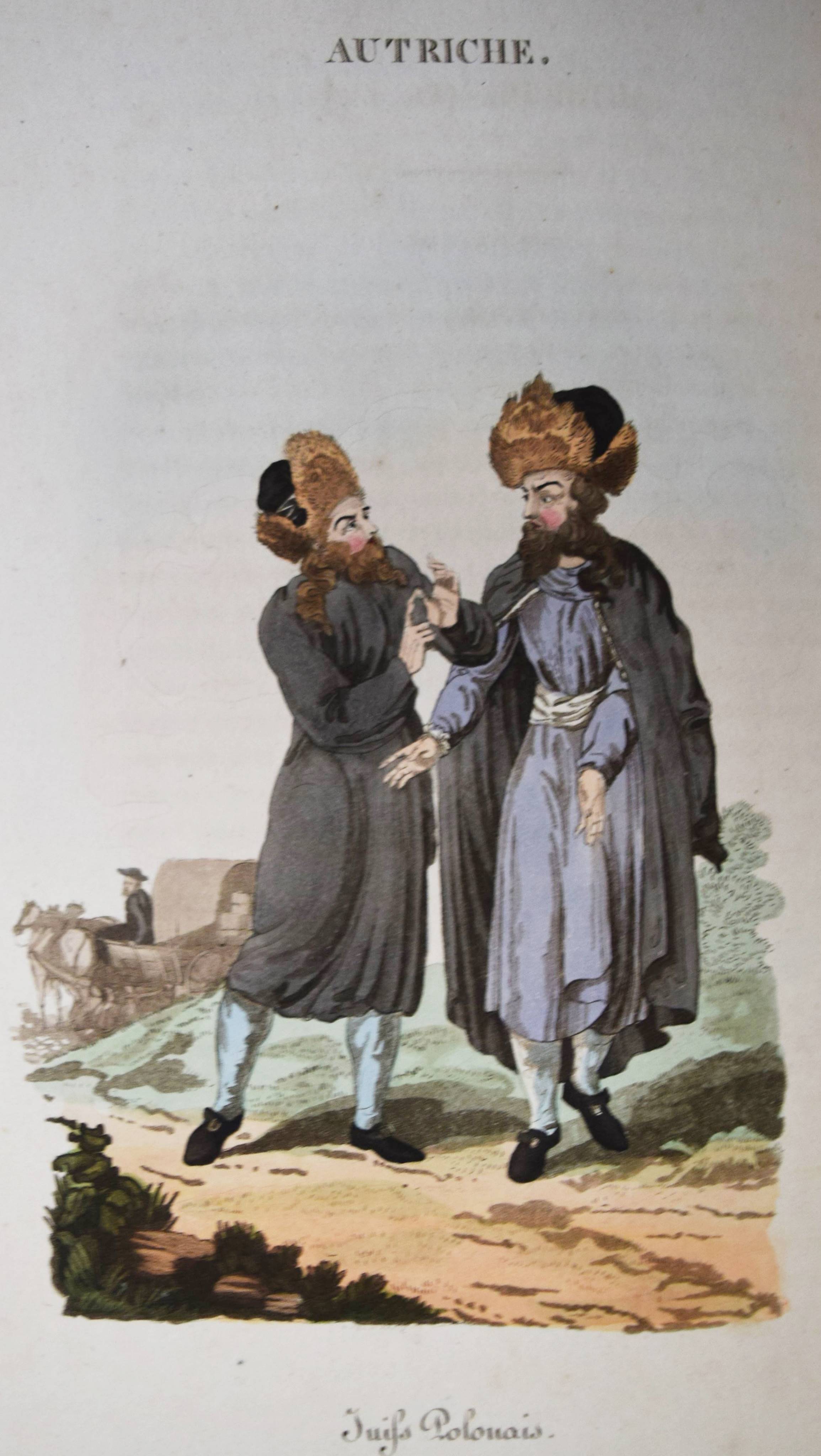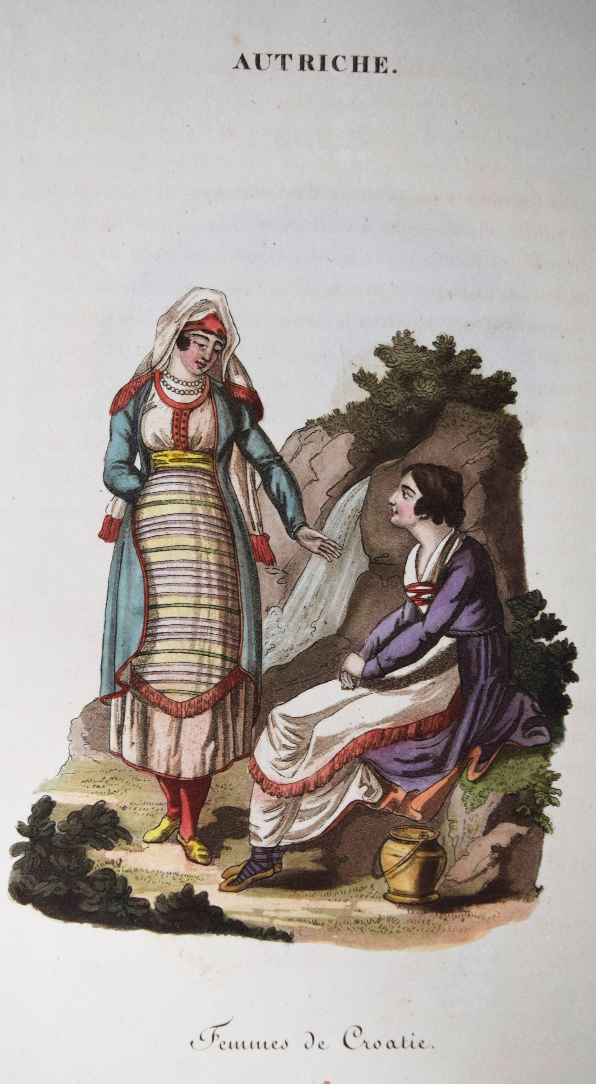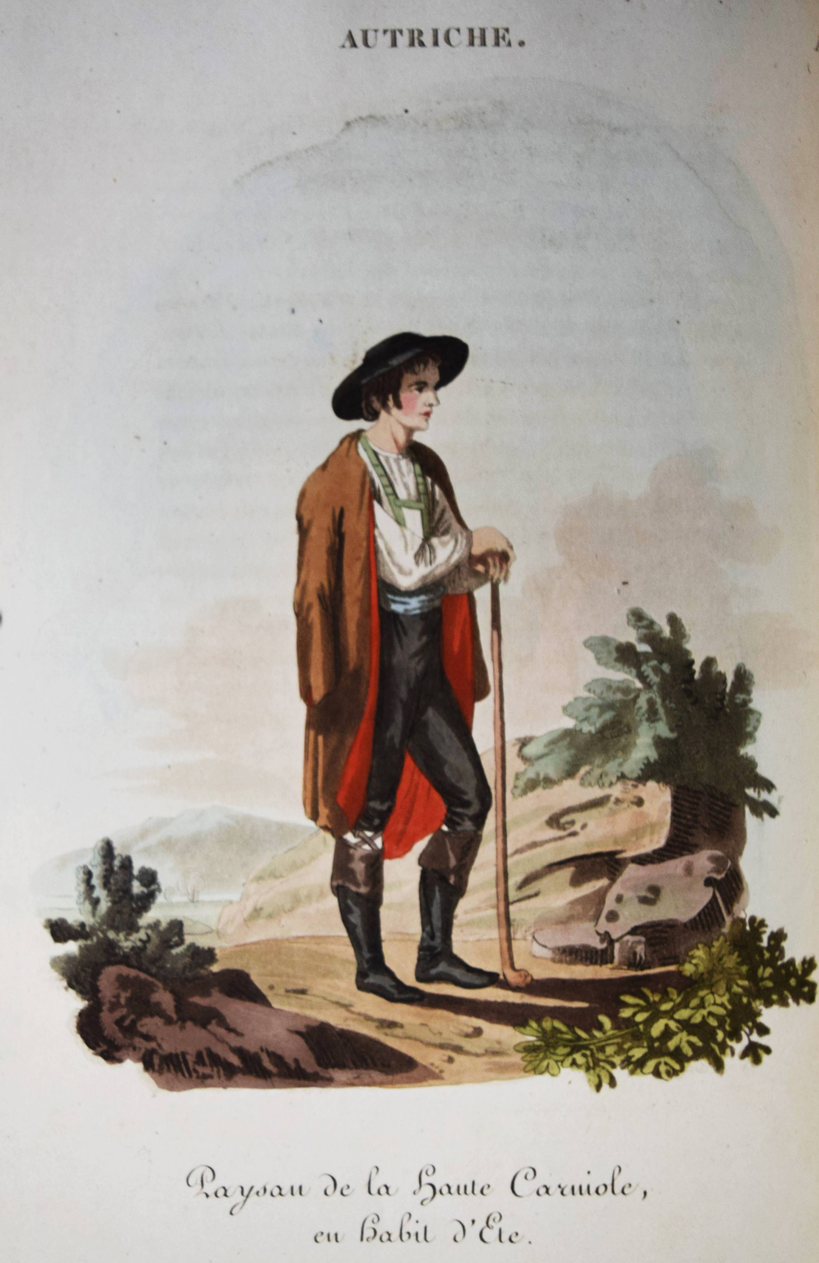 Eyriès, J(ean) B(aptiste) B(enoît). L’ Autriche, ou costumes, moeurs et usages des Autrichiens. Paris, Librairie de Gide Fils o. J. (um 1825). 4° (27 x 17 cm.). [68] S. mit Titelvignette und 24 handkol. lithogr. Tafeln. Halblederband der Zeit mit goldgepr. Rückenschild und Rückenvergoldung. Colas 1013. Hiler 300. Quérard III, 50. Nicht bei Lipperheide. – Erste und einzige Ausgabe. – Mit dekorativen Trachten-Darstellungen verschiedenster lokaler österreichischer Provenienz, und vertritt die gesamte ethnographische Breite des austro-ungarischen Reiches (u.a. Ungarn, Kroaten, Russen, Slowaken, Slowenen und polnische Juden). – Leder-Exlibris, die Textseiten teils etwas braunfleckig, schönes dekorativ gebundenes Exemplar.