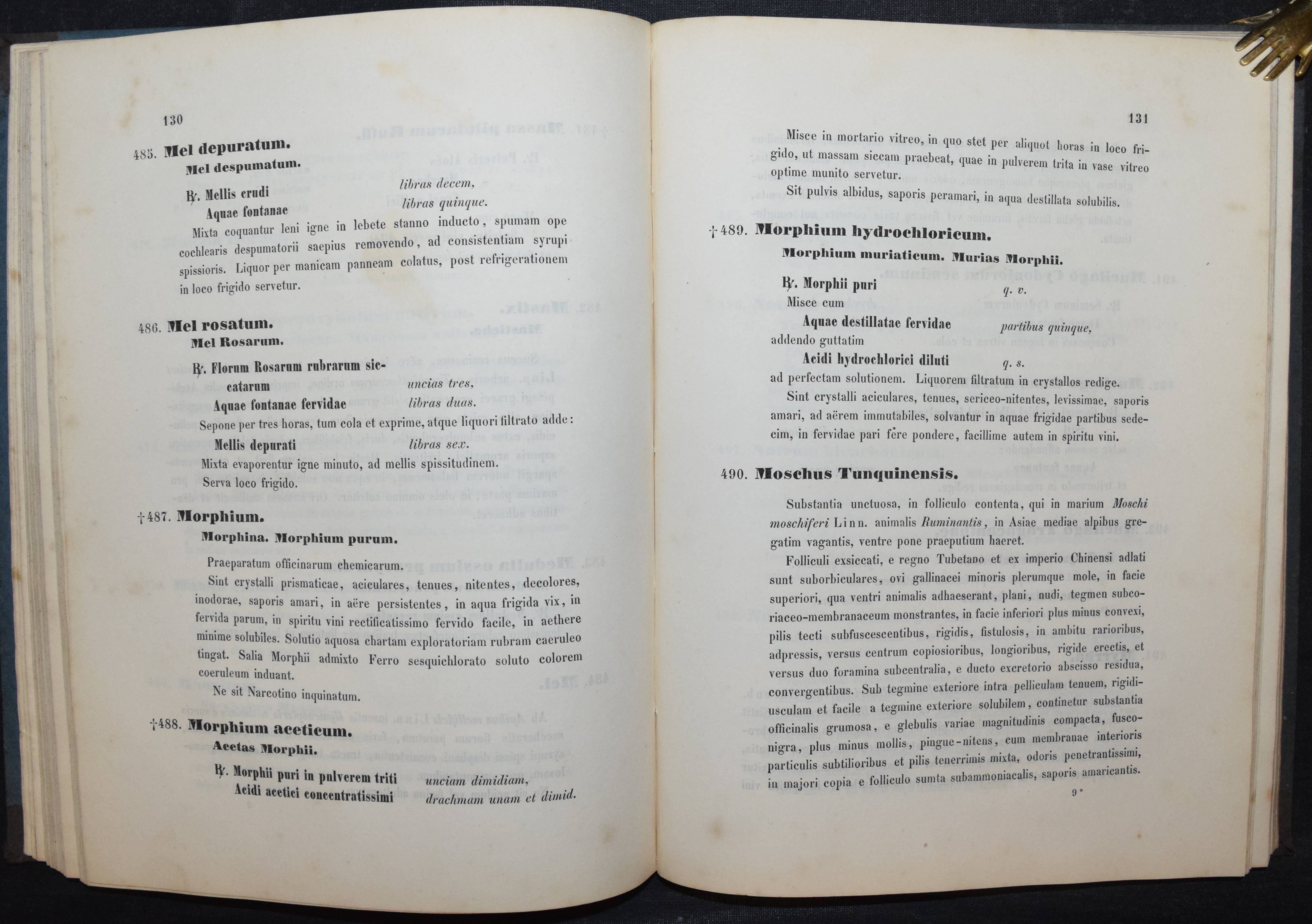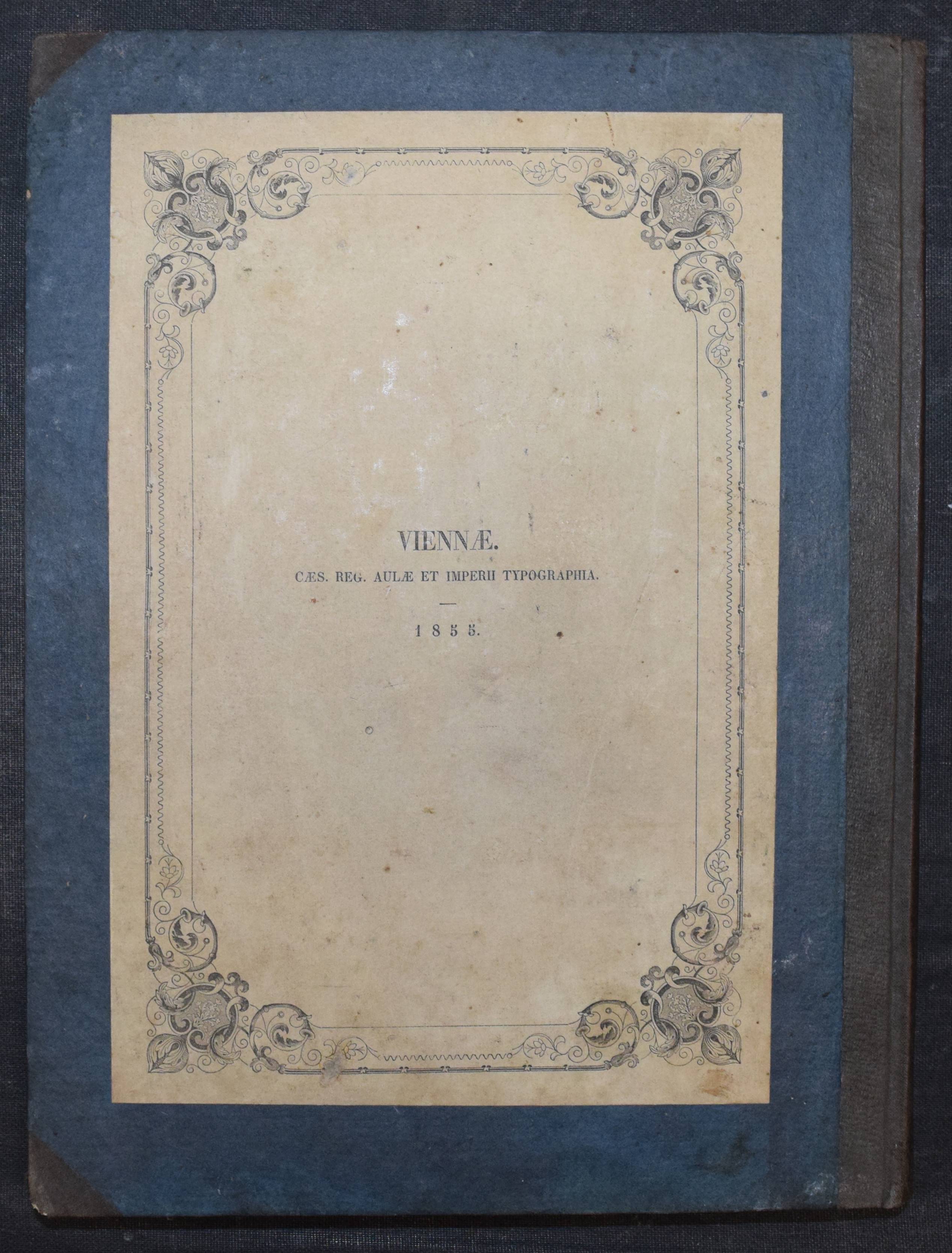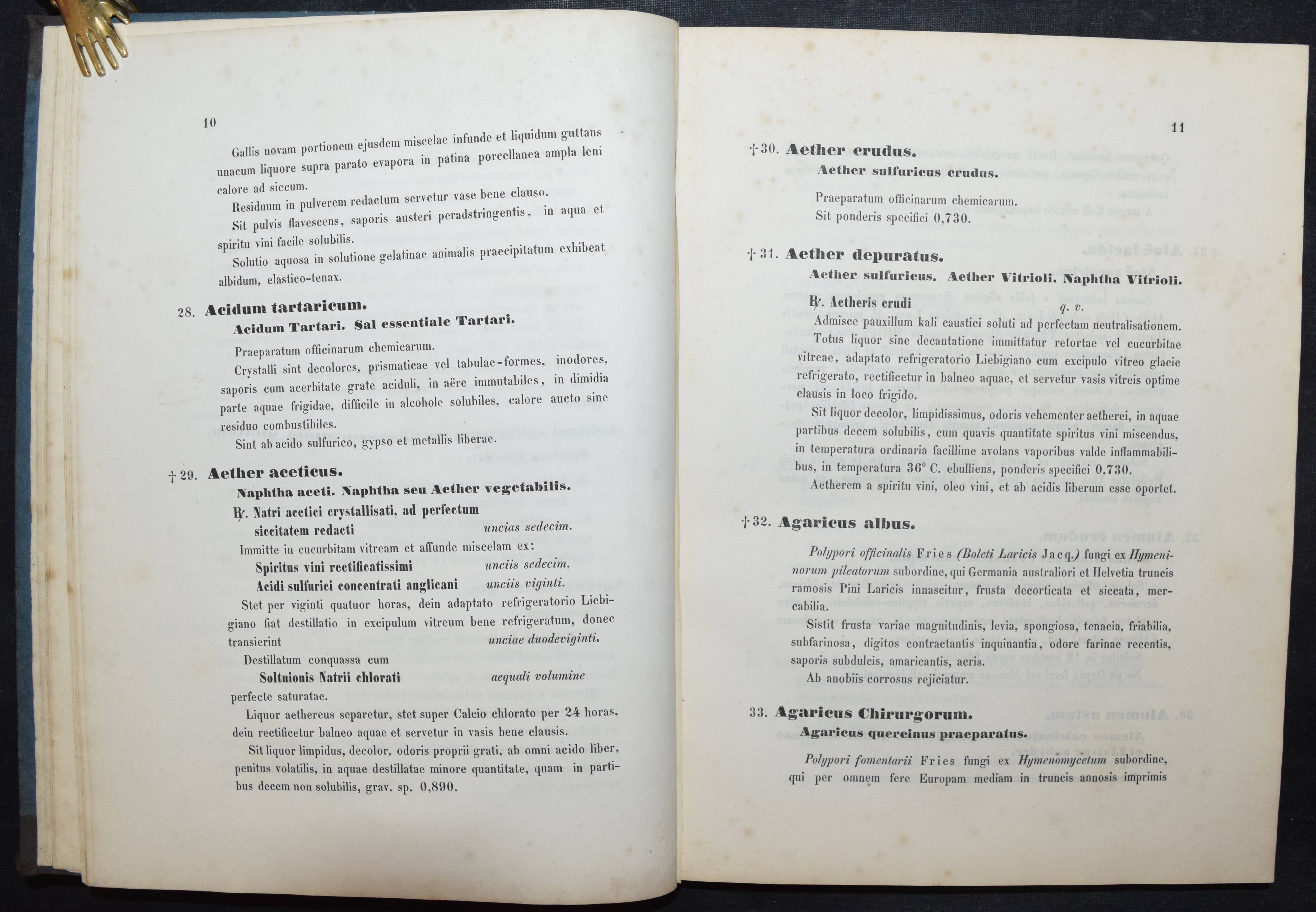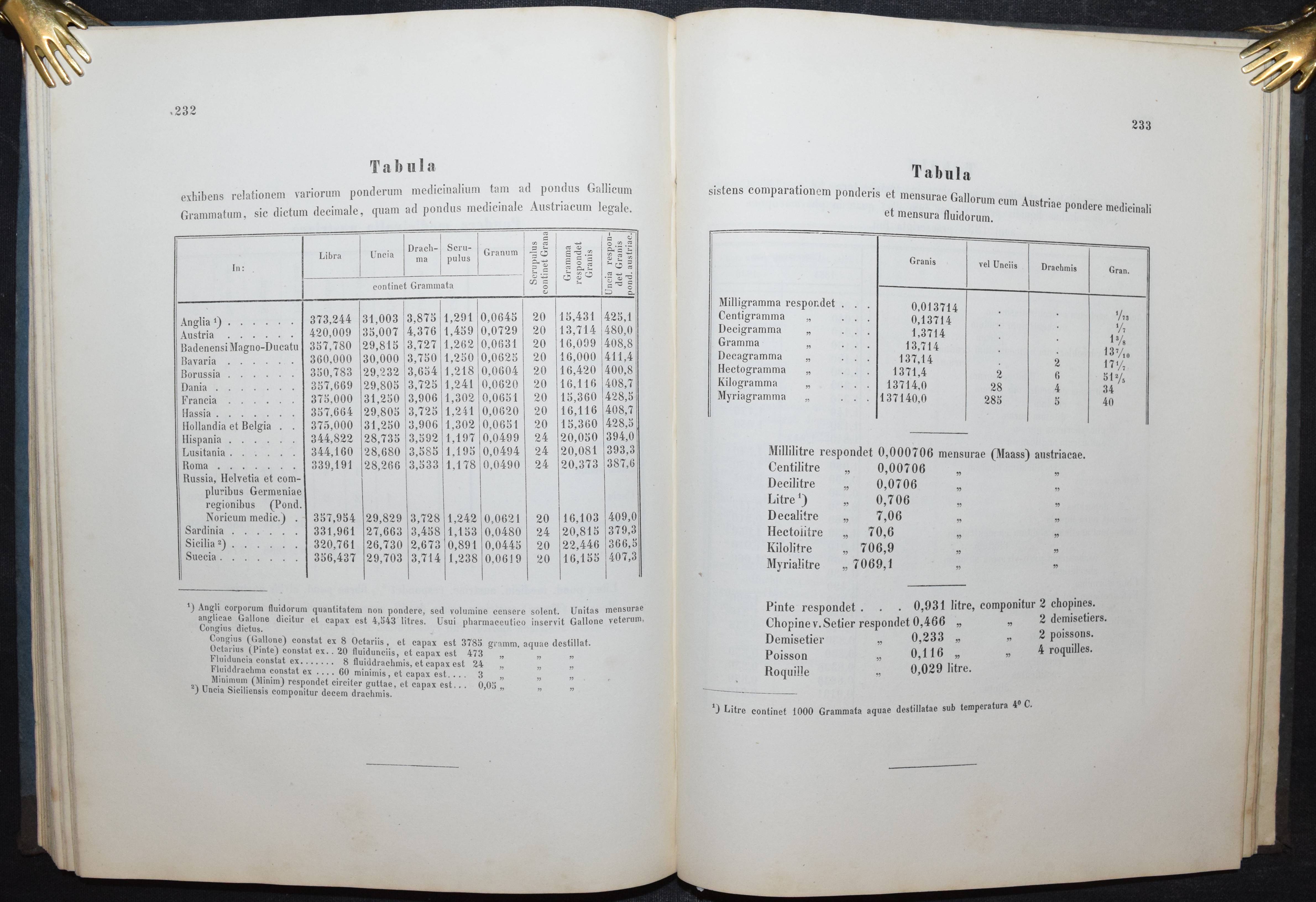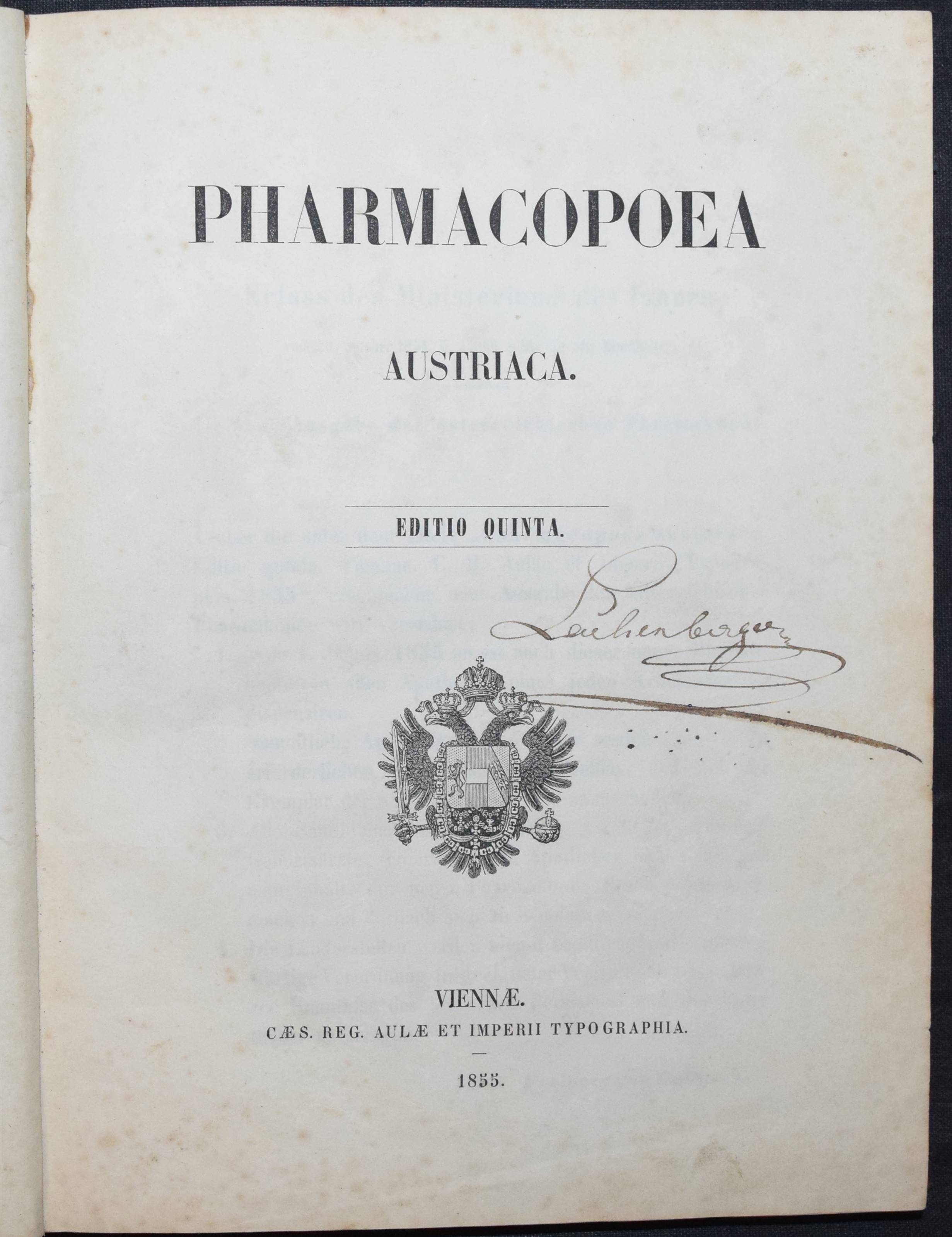 Pharmacopoea Austriaca. Editio quinta. Wien, Caes. Reg. Aulae et. Imp. Typ. 1855. 4°. VIII, 272 S. mit Holzschnitt-Titelvignette (Doppeladler). Hln. d. Zt. (mit mont. typogr. Orig.-Umschlag). Einband, Vorsätze u. Titel etwas angestaubt, N.a.T., stellenweise leicht fingerfl.