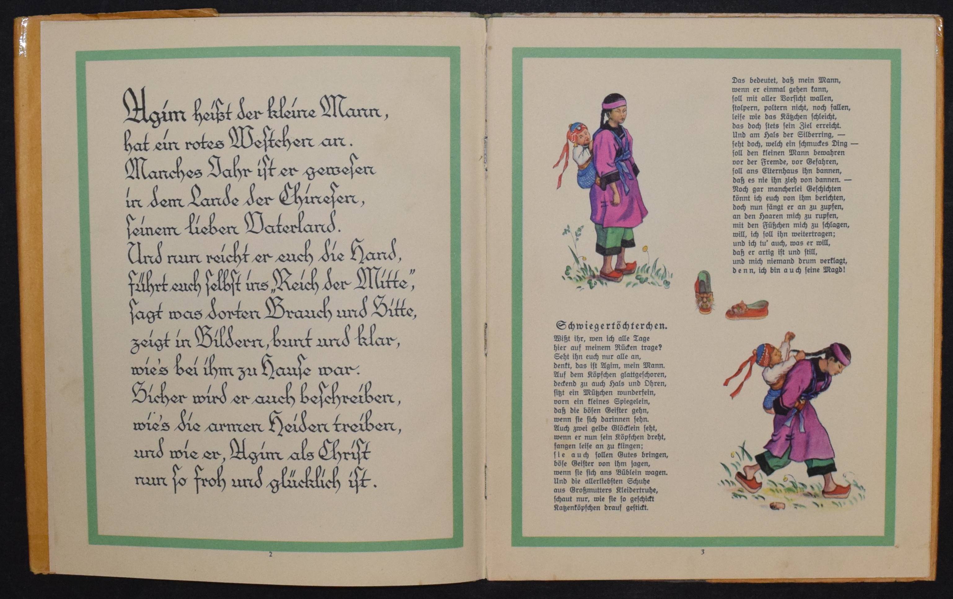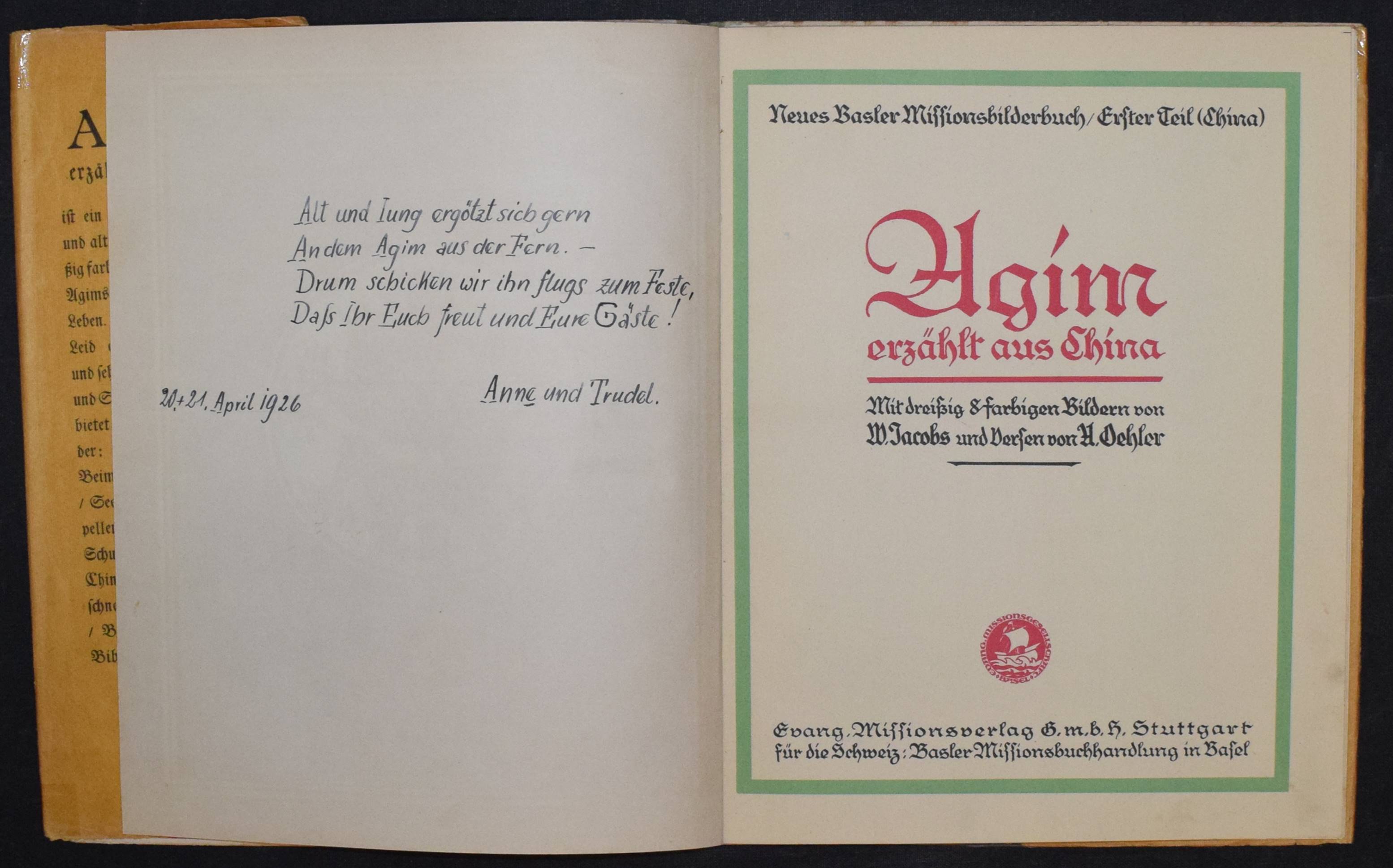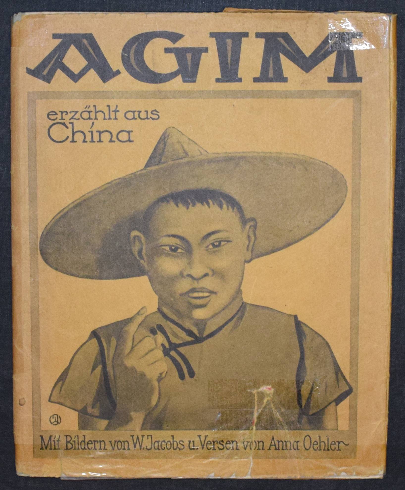 Oehler, A(nna). Agim erzählt aus China. Mit dreißig achtfarbigen Bildern von W(alter) Jacobs. Stuttgart, Basel, Missionsbuchhandlung o.J. (1924). 4°. 24 S. mit farb. Illustrationen. Farbig illustr. OHln. mit illustr. OU. (Neues Basler Missionsbilderbuch. Erster Teil). DBV VIII, 350. Klotz 5135/2. – Erste Ausgabe, selten. – „Agim erzählt aus China ist ein Bilderbuch für jung und alt und zeigt uns in dreißig farbenprächtigen Bildern Agims Volk, Heimat und Leben. Wir teilen Freud und Leid eines Chinesenknaben und sehen hinein in sein Lernen und Spielen…“ (Aus der Verlagswerbung). – Anna Oehler (1882-1951) hat für den Verlag mehrere ähnliche Kinderbücher verfaßt, über China, Japan und Indien. – Schutzumschlag mit Randläsuren mit Tesafilm geklebt, zeitgenöss. Widmung a. V., sonst sehr gut erhalten.