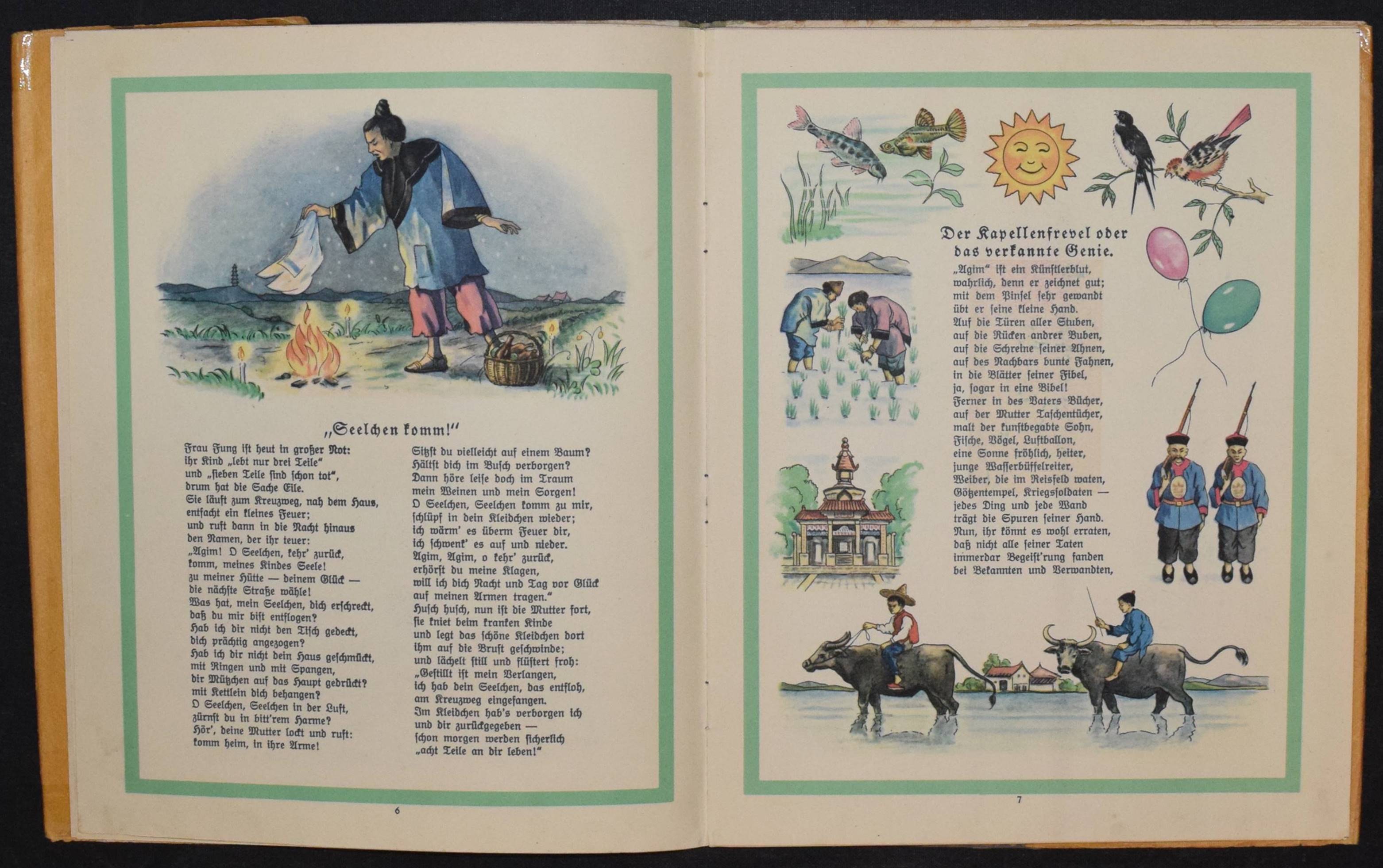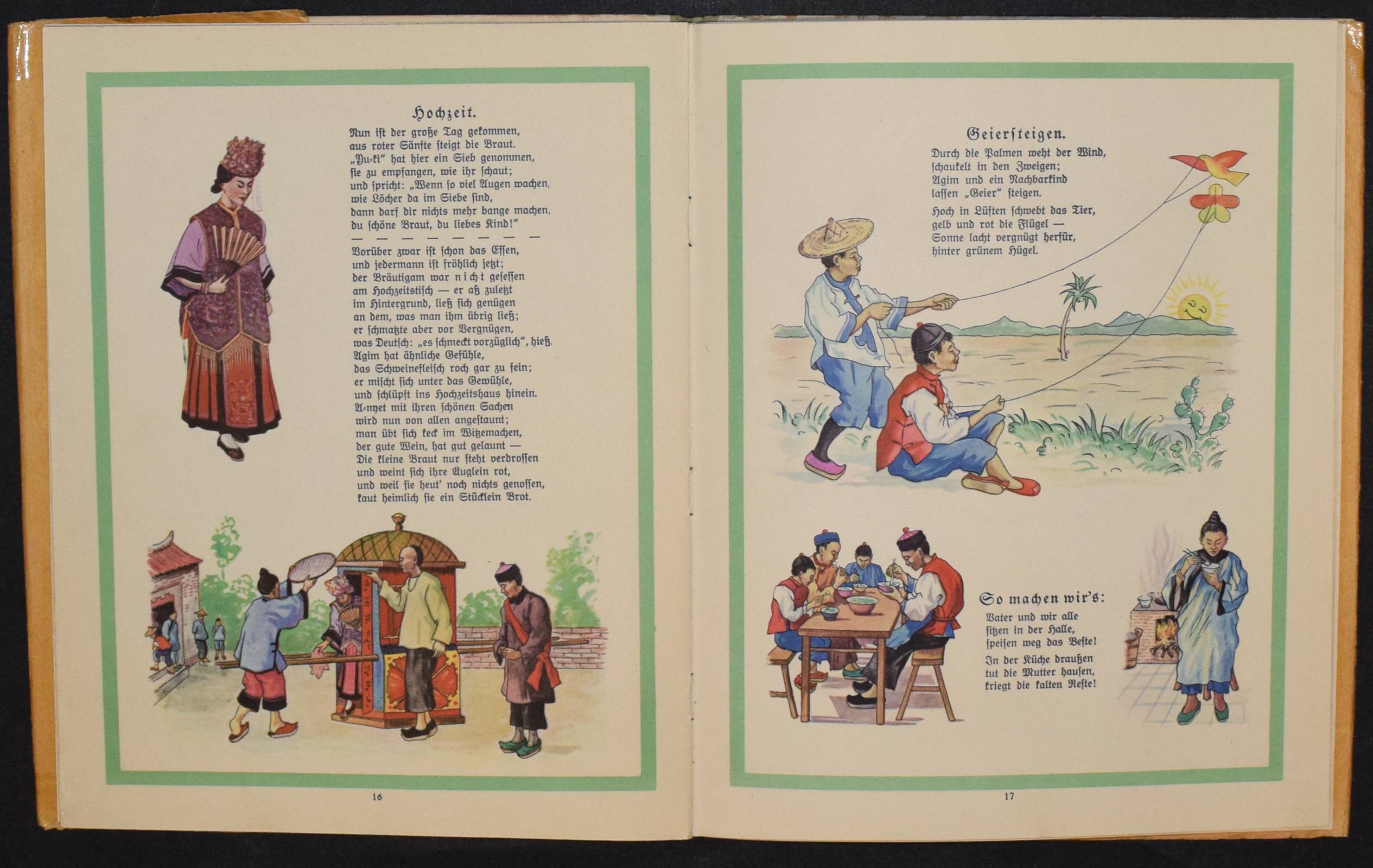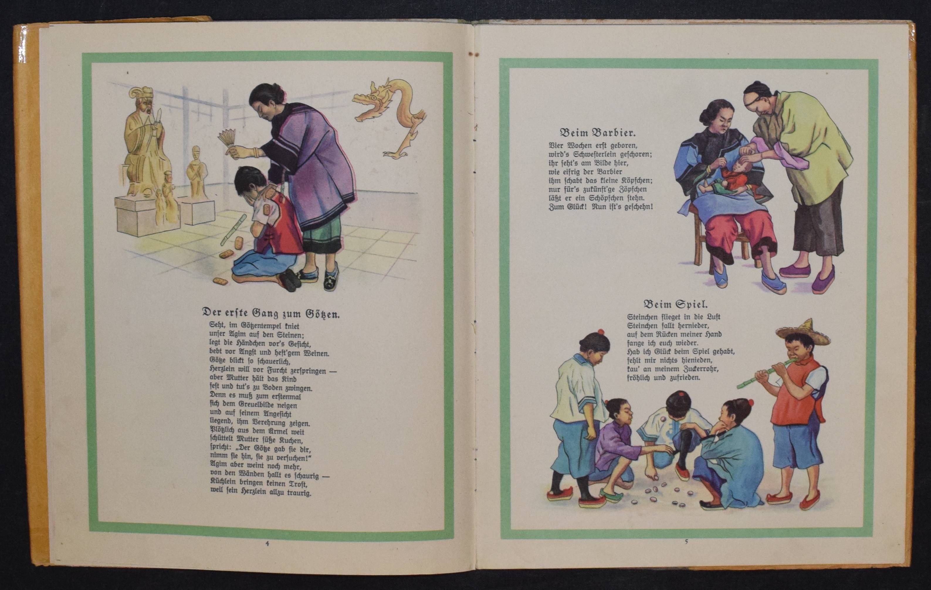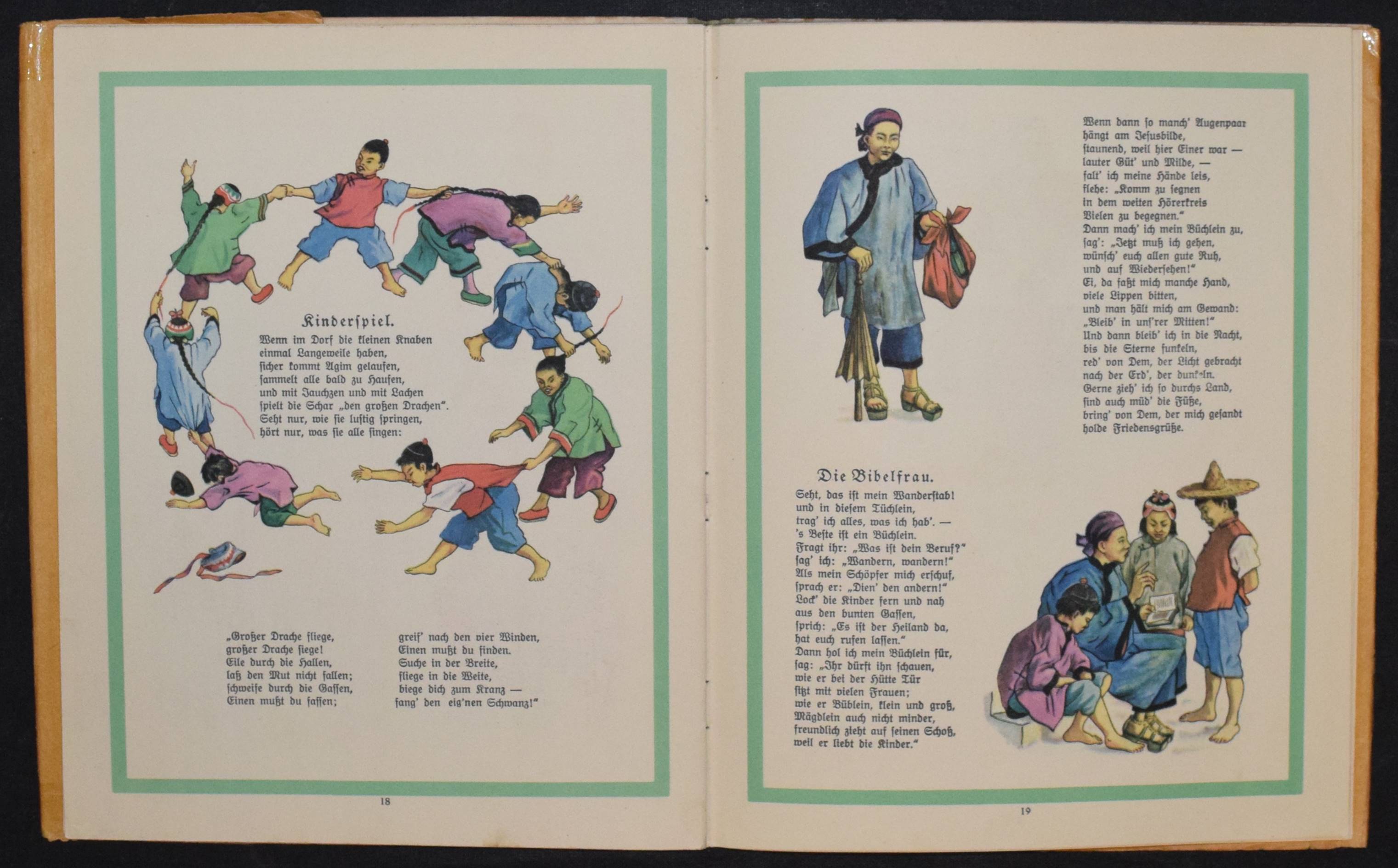 Oehler, A(nna). Agim erzählt aus China. Mit dreißig achtfarbigen Bildern von W(alter) Jacobs. Stuttgart, Basel, Missionsbuchhandlung o.J. (1924). 4°. 24 S. mit farb. Illustrationen. Farbig illustr. OHln. mit illustr. OU. (Neues Basler Missionsbilderbuch. Erster Teil). DBV VIII, 350. Klotz 5135/2. – Erste Ausgabe, selten. – „Agim erzählt aus China ist ein Bilderbuch für jung und alt und zeigt uns in dreißig farbenprächtigen Bildern Agims Volk, Heimat und Leben. Wir teilen Freud und Leid eines Chinesenknaben und sehen hinein in sein Lernen und Spielen…“ (Aus der Verlagswerbung). – Anna Oehler (1882-1951) hat für den Verlag mehrere ähnliche Kinderbücher verfaßt, über China, Japan und Indien. – Schutzumschlag mit Randläsuren mit Tesafilm geklebt, zeitgenöss. Widmung a. V., sonst sehr gut erhalten.
