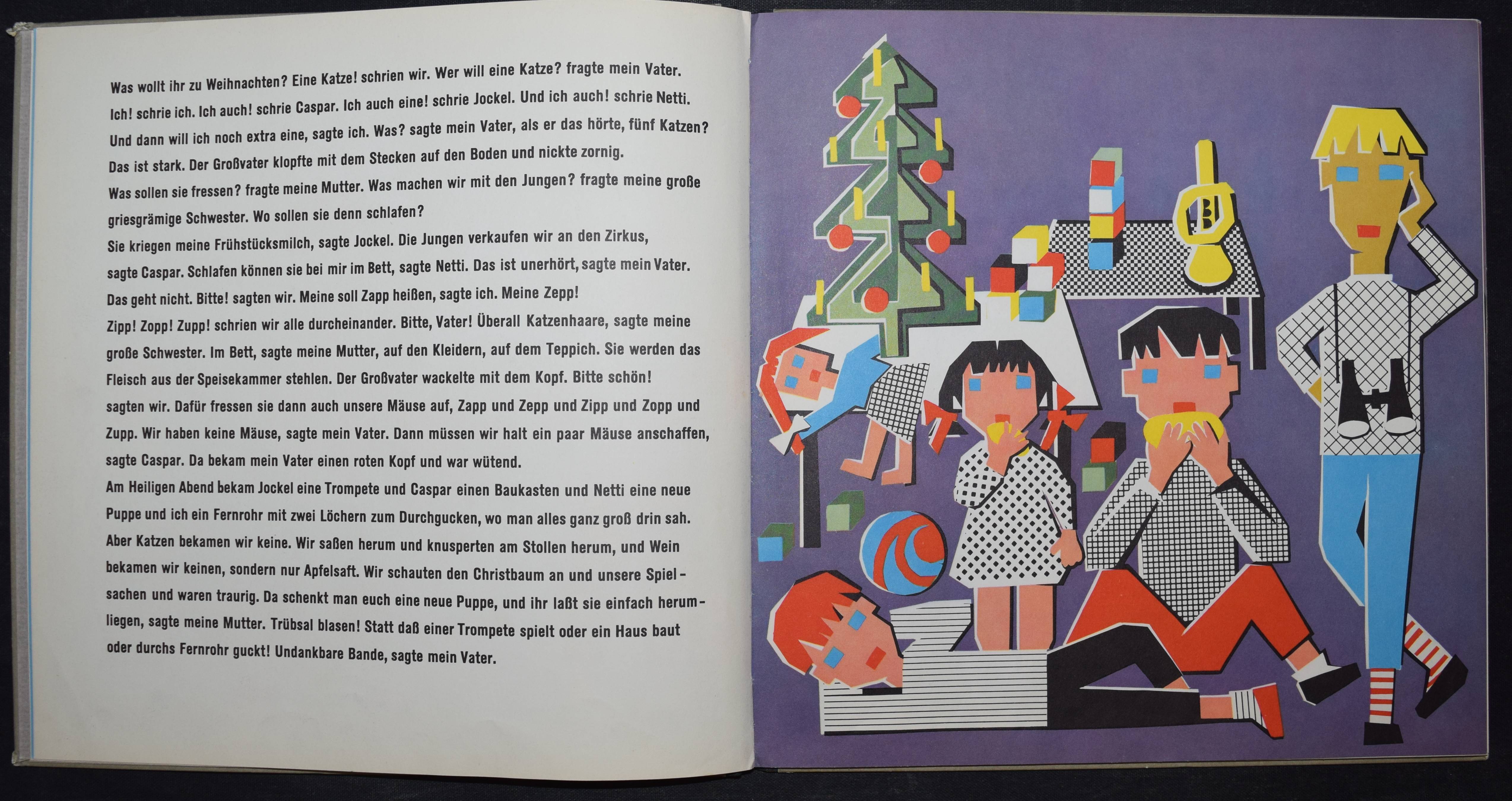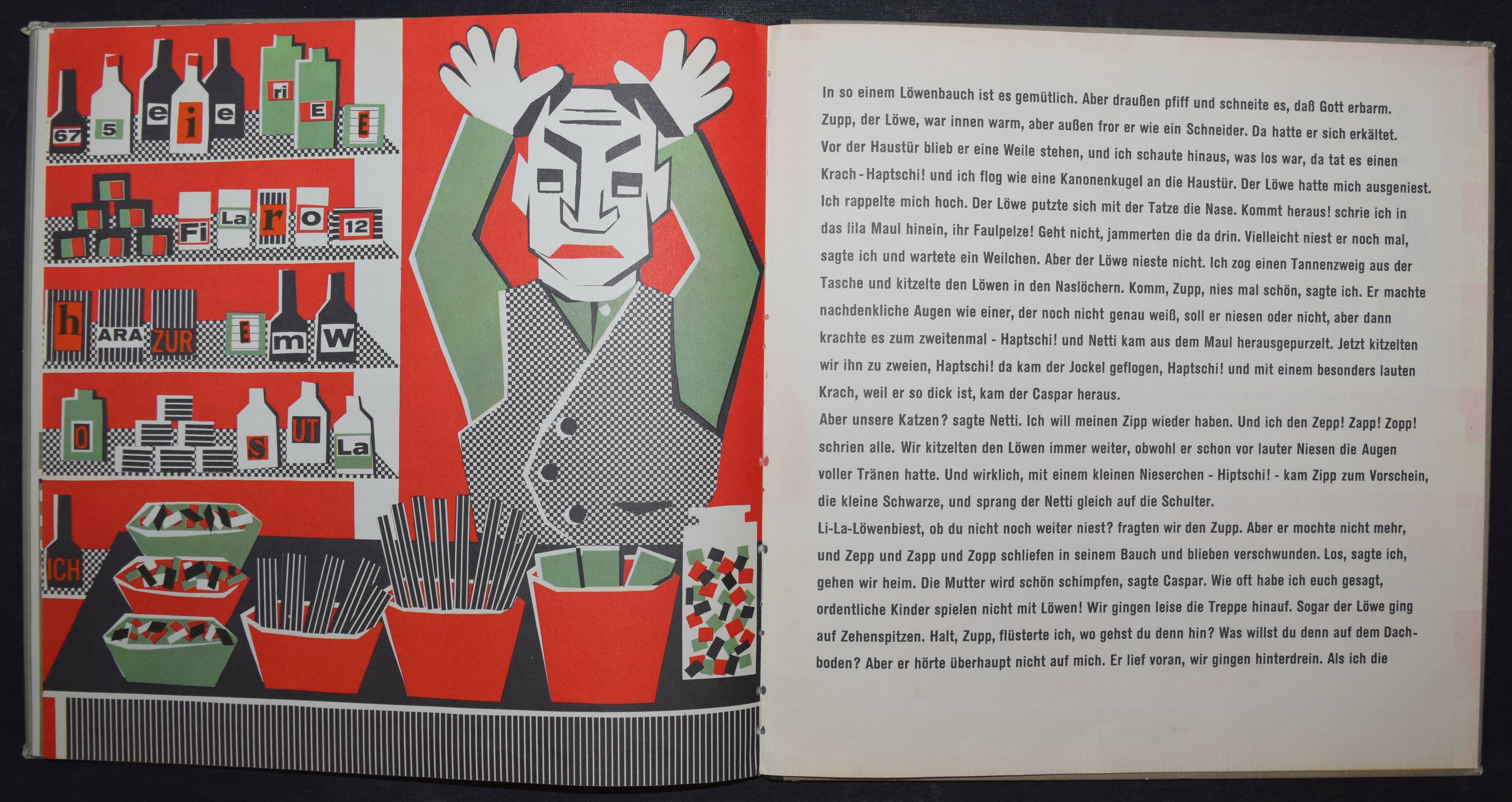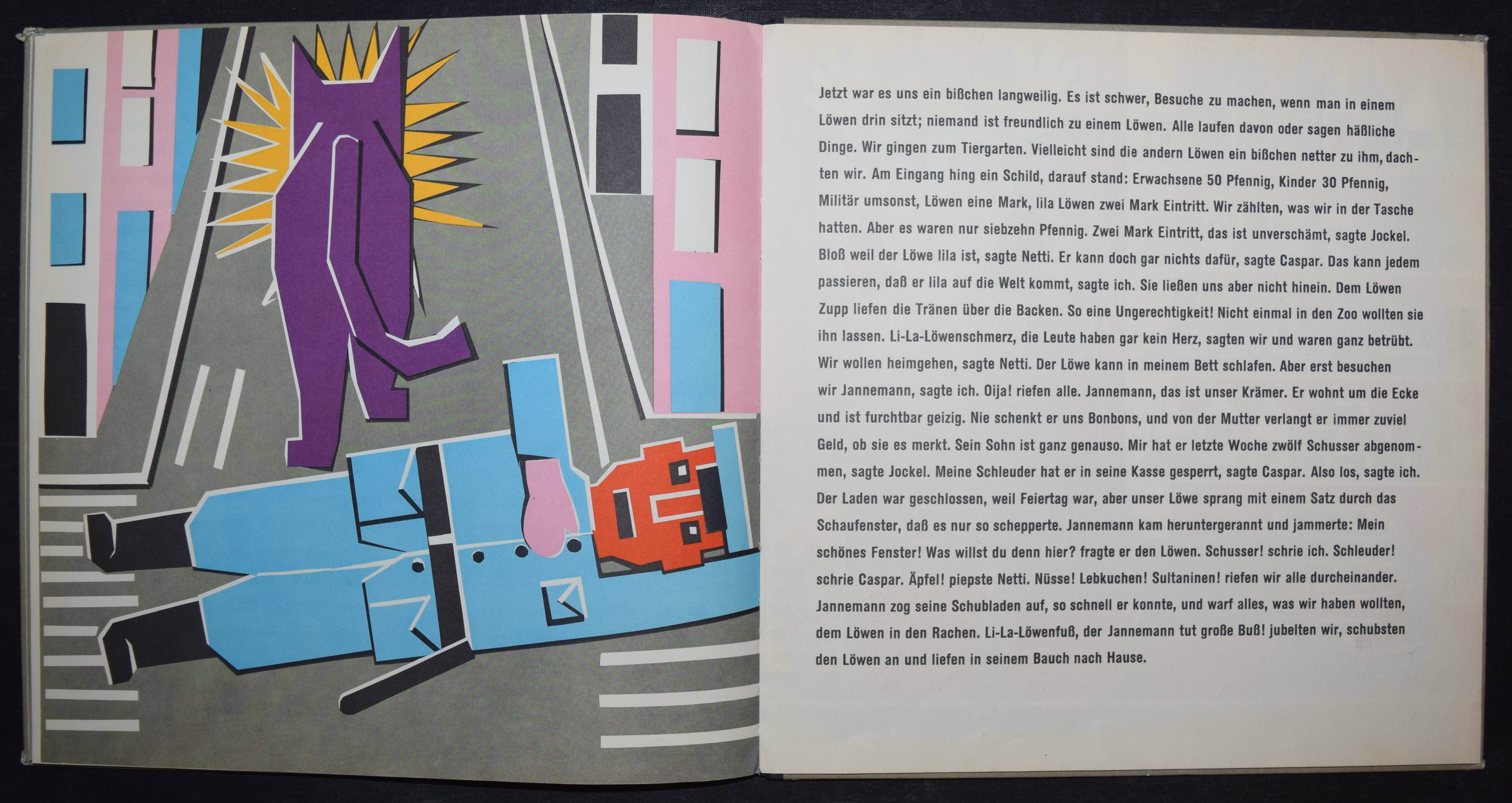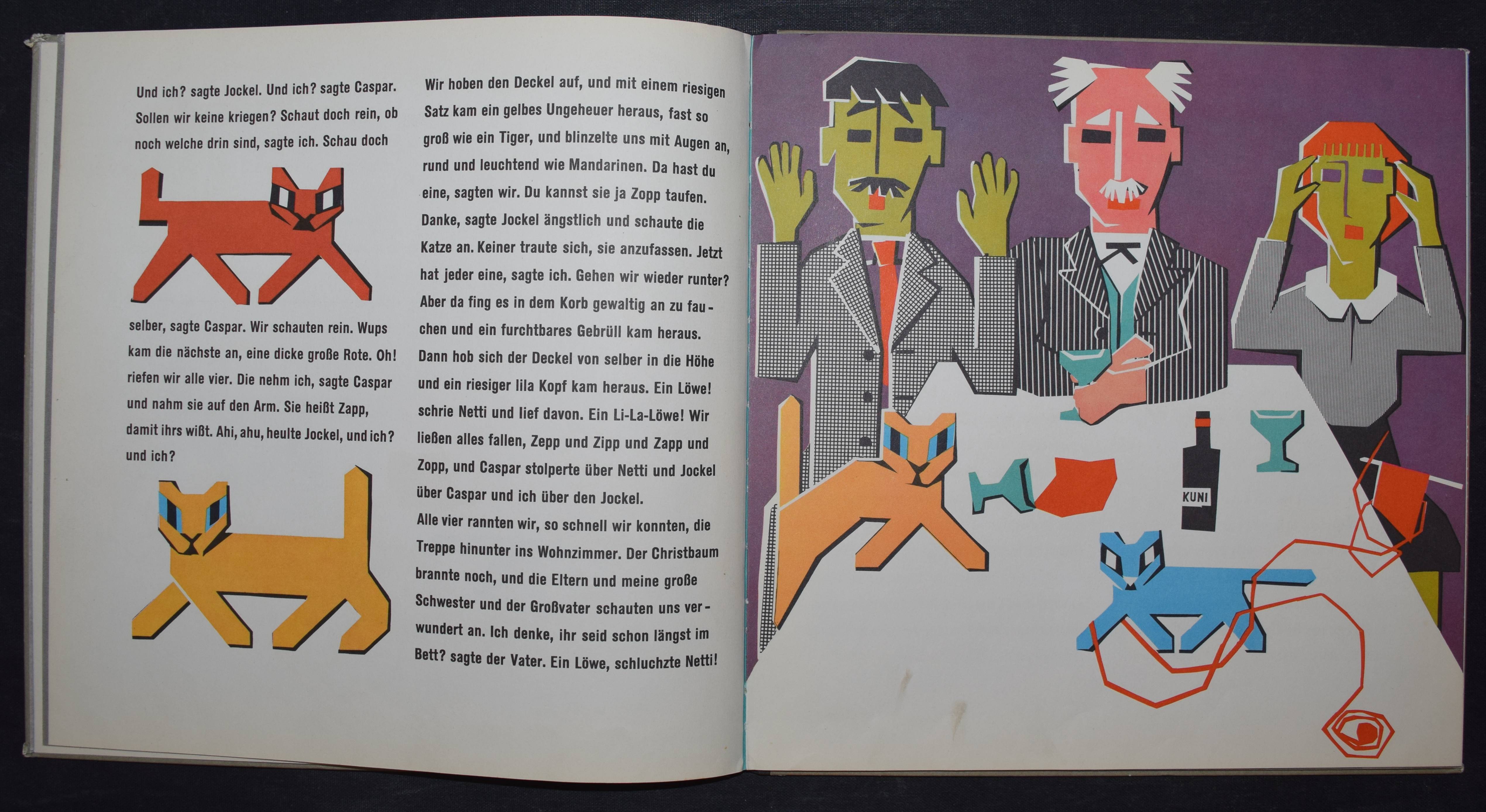 Enzensberger, Hans Magnus. Zupp. Eine Geschichte in der sehr viel vorkommt mit Bildern von Gisela Andersch auf denen sehr viel drauf ist, nämlich… Olten u. Freiburg, Walter-Verlag (1959). Quer-4°. 16 Bl. mit farb. Illustrationen. Farbig illustr. OHln. Bilderwelt 850. LKJ I, 353. – Erste Ausgabe, selten. – „Reich an phantastischen Motiven erzählt das Kinderbuch ‚Zupp‘, wie drei Geschwister gegen den Willen ihrer Eltern und der älteren Schwester zu den gewünschten Katzen, sogar zu einem Löwen, kommen, und welche Abenteuer sie mit ihm erleben. Zu dem freien Spiel der Phantasie stehen die Illustrationen Andersch’ teils in krassem Gegensatz, weil sie in ihrer geometrischen Gestaltung von einem starren Grundraster ausgehen, teils ergänzen sie aber auch die antiautoritären Tendenzen des Inhalts durch aggressiv wirkende Farbkontraste“ (R. Raab in LKJ). – Kanten geringf. berieben, gutes Exemplar.