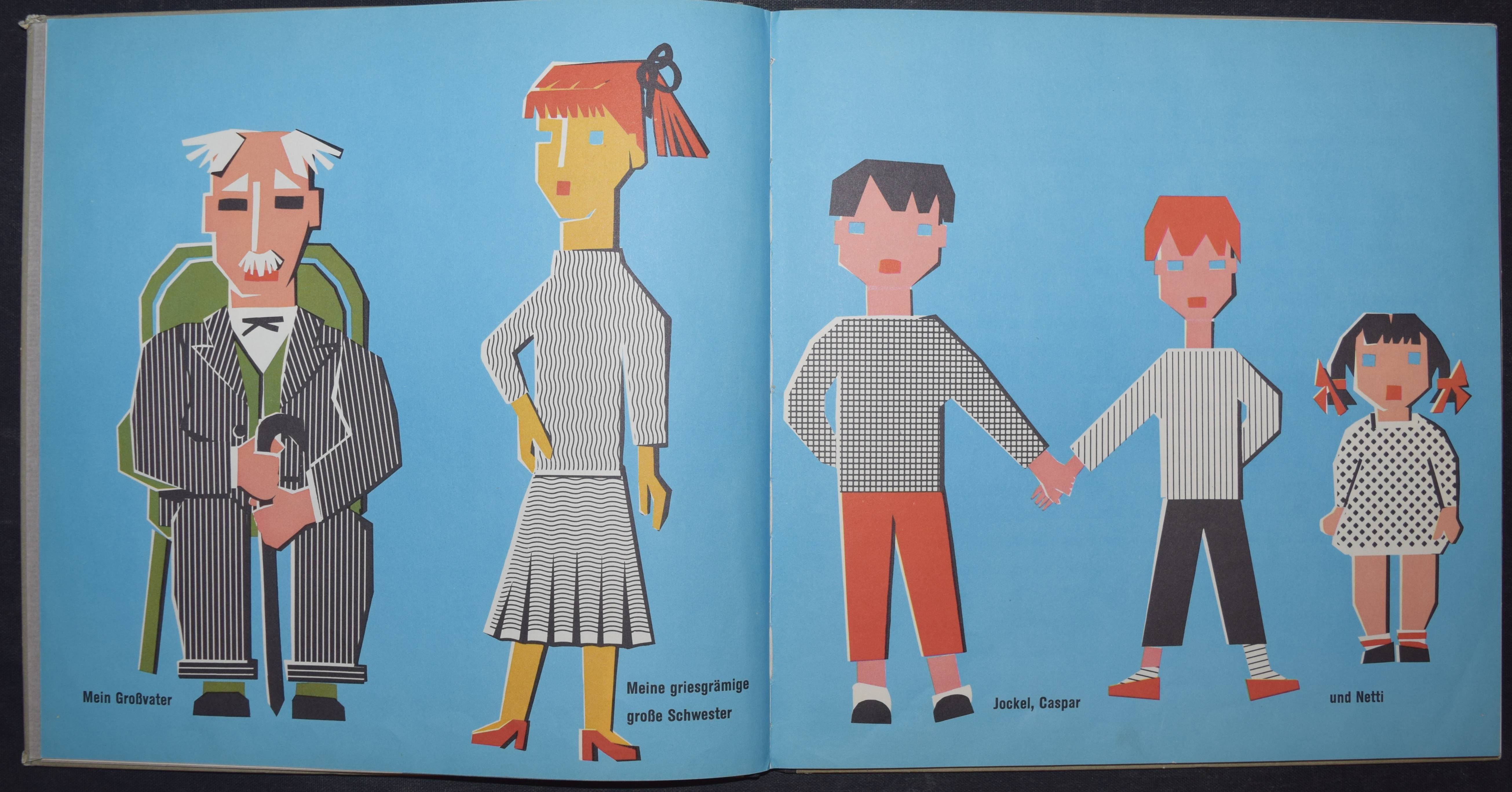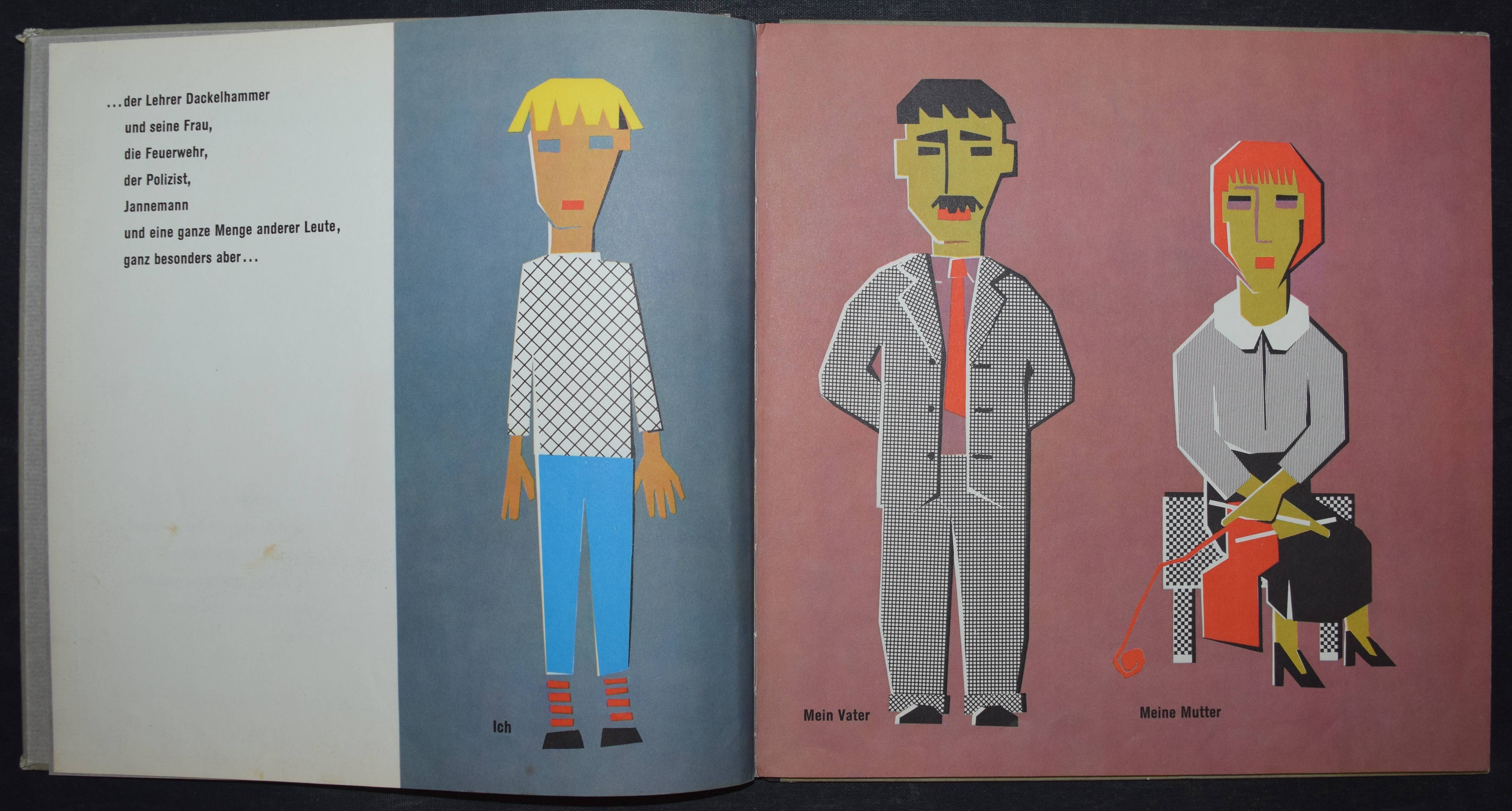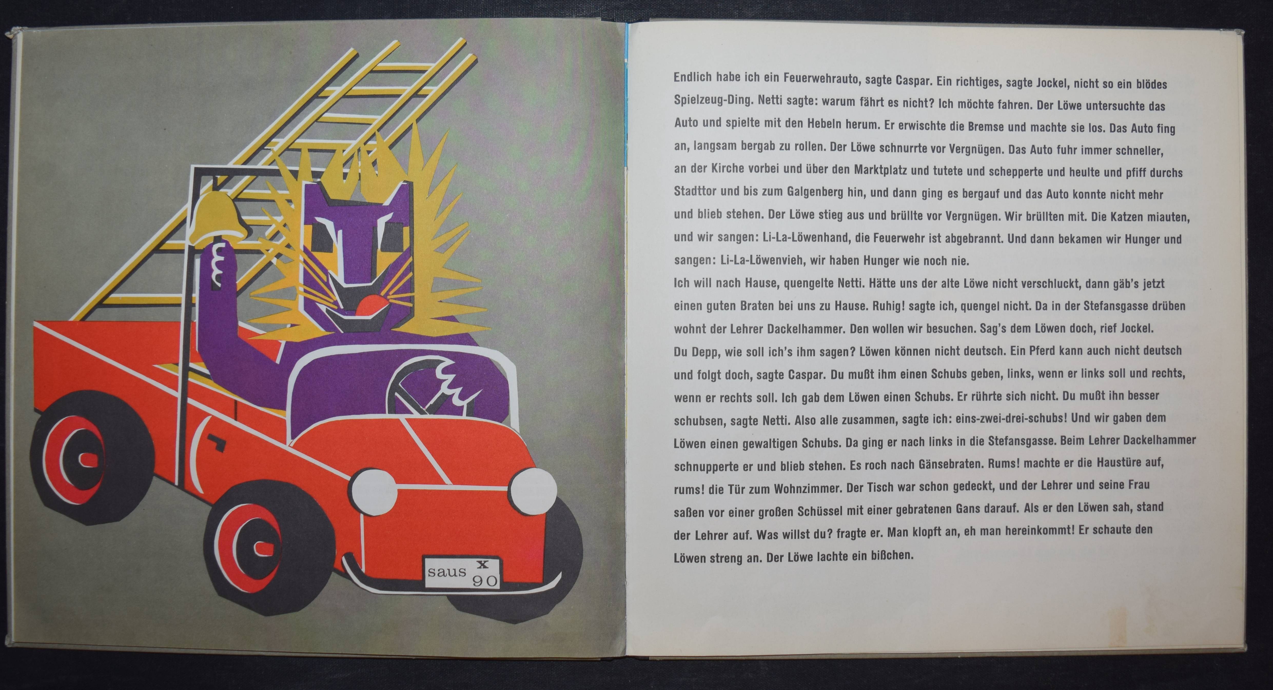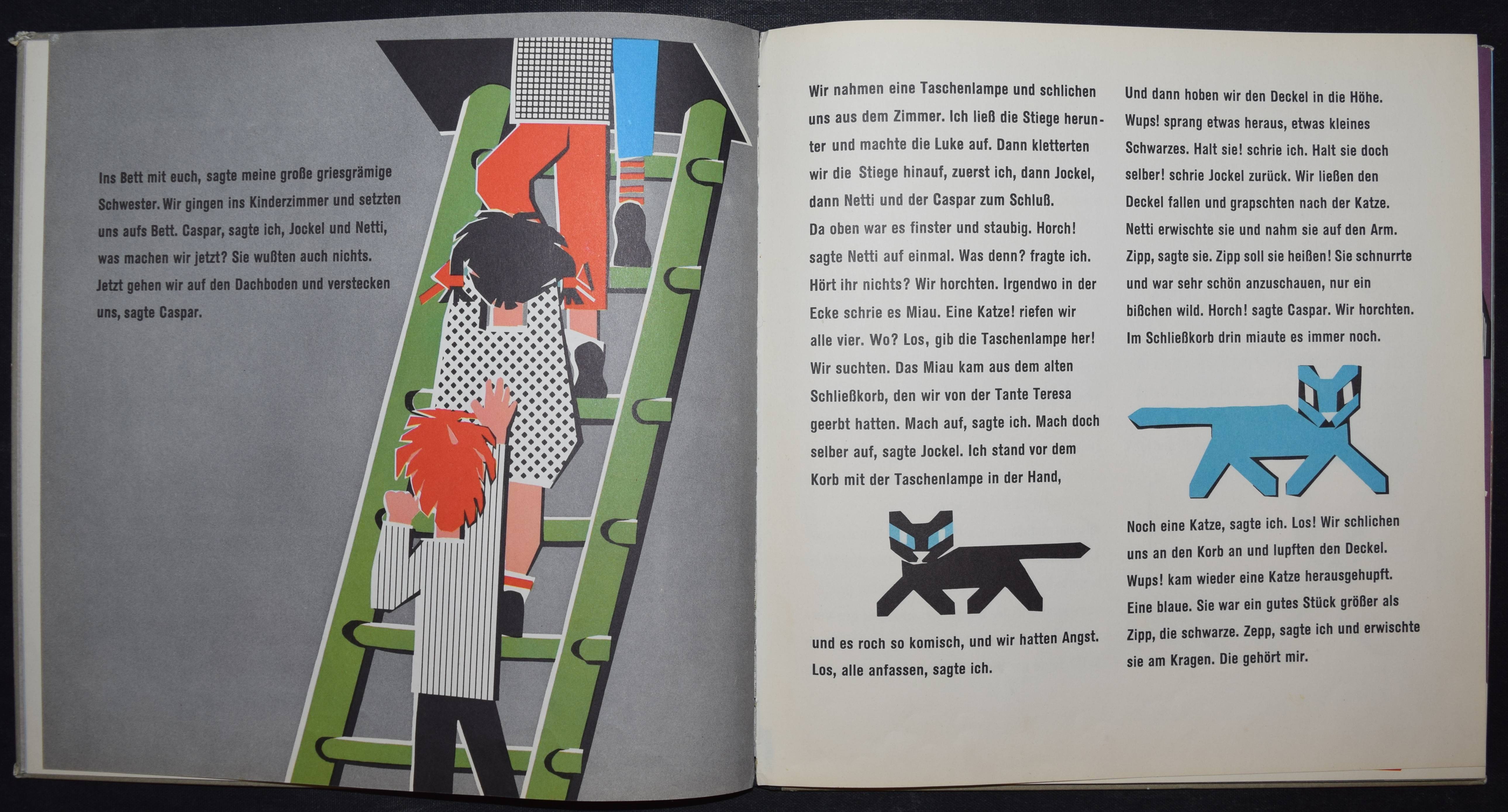 Enzensberger, Hans Magnus. Zupp. Eine Geschichte in der sehr viel vorkommt mit Bildern von Gisela Andersch auf denen sehr viel drauf ist, nämlich… Olten u. Freiburg, Walter-Verlag (1959). Quer-4°. 16 Bl. mit farb. Illustrationen. Farbig illustr. OHln. Bilderwelt 850. LKJ I, 353. – Erste Ausgabe, selten. – „Reich an phantastischen Motiven erzählt das Kinderbuch ‚Zupp‘, wie drei Geschwister gegen den Willen ihrer Eltern und der älteren Schwester zu den gewünschten Katzen, sogar zu einem Löwen, kommen, und welche Abenteuer sie mit ihm erleben. Zu dem freien Spiel der Phantasie stehen die Illustrationen Andersch’ teils in krassem Gegensatz, weil sie in ihrer geometrischen Gestaltung von einem starren Grundraster ausgehen, teils ergänzen sie aber auch die antiautoritären Tendenzen des Inhalts durch aggressiv wirkende Farbkontraste“ (R. Raab in LKJ). – Kanten geringf. berieben, gutes Exemplar.