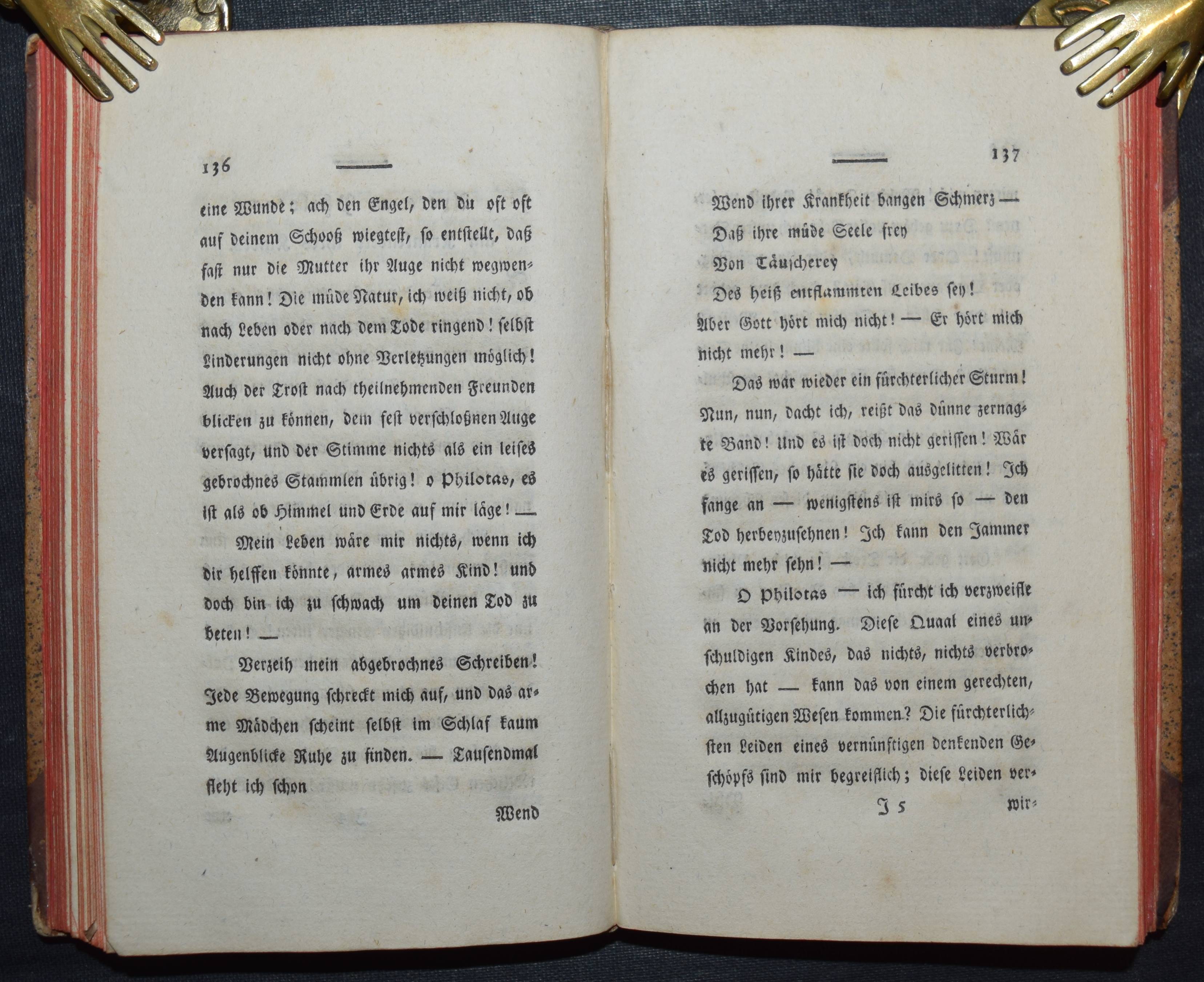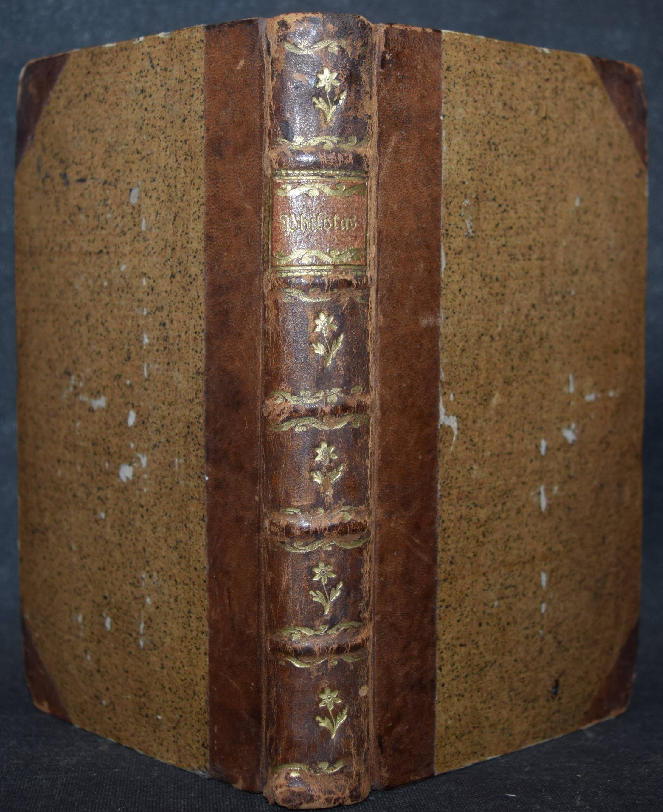 (Niemeyer, August Hermann). Philotas. Ein Versuch zur Beruhigung und Belehrung für Leidende und Freunde der Leidenden. Leipzig, Weidmanns Erben u. Reich 1779. Kl.-8°. [2] Bl., 250 D. mit gestoch. Titelvignette. Hldr. d. Zt. mit goldgepr. Rückenschild u. floraler Rückenverg. Goed. VII, 264, 7. Jördens IV, 75 (ausführl.). Kosch XI, 297. VD18 11209615. – Erste Ausgabe. – 1782 und 1791 erschienen noch Fortsetzungen. – Stellenweise etwas gebräunt, sehr gutes dekorativ gebundenes Exemplar.