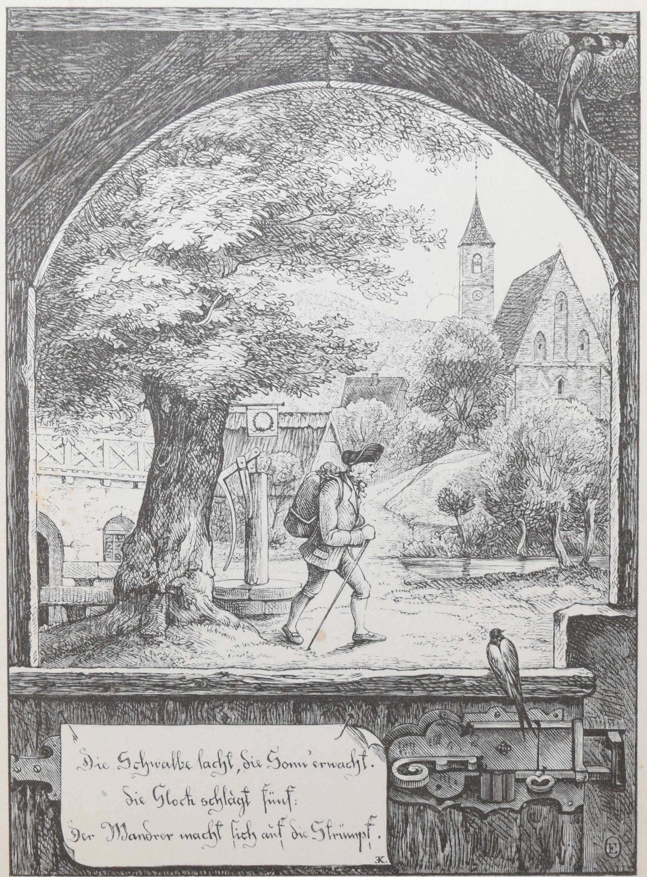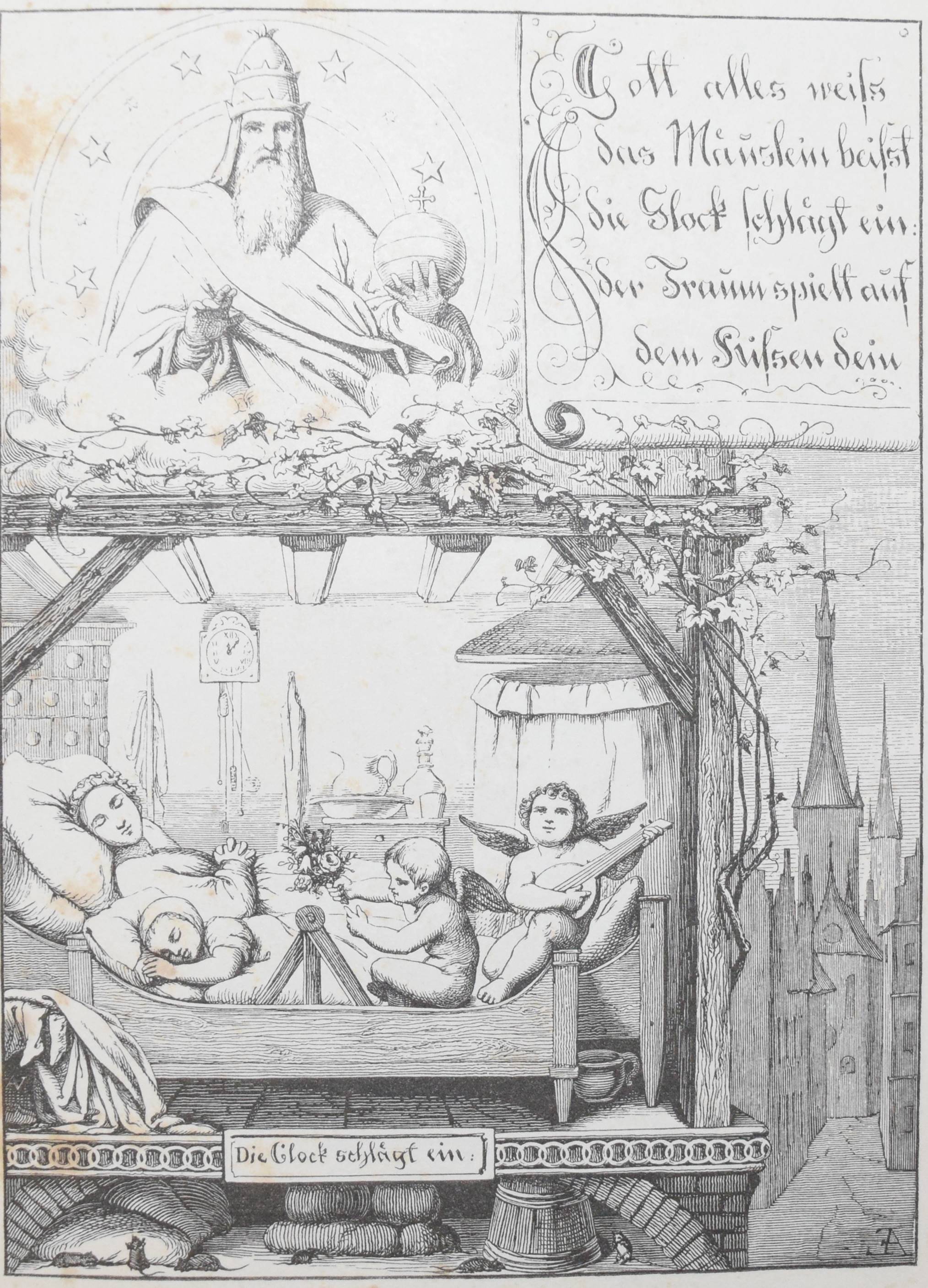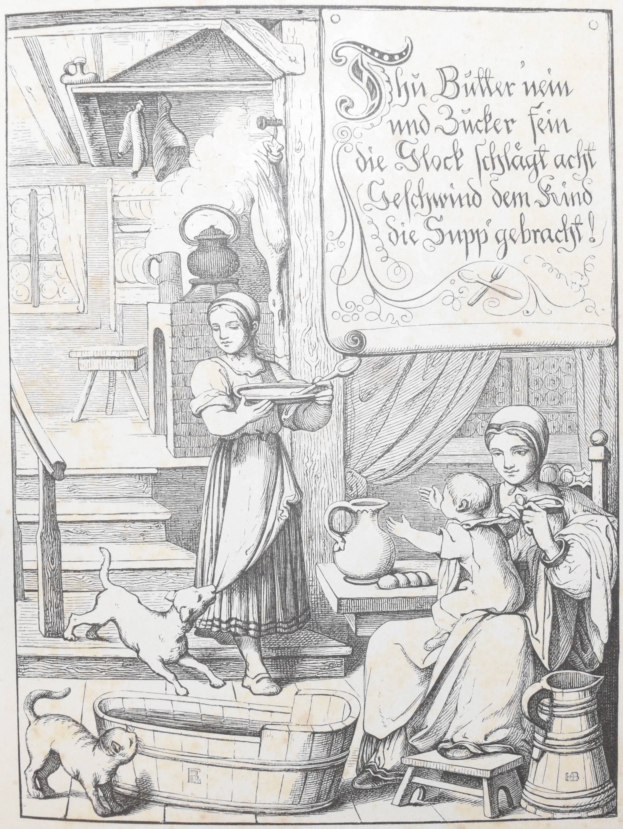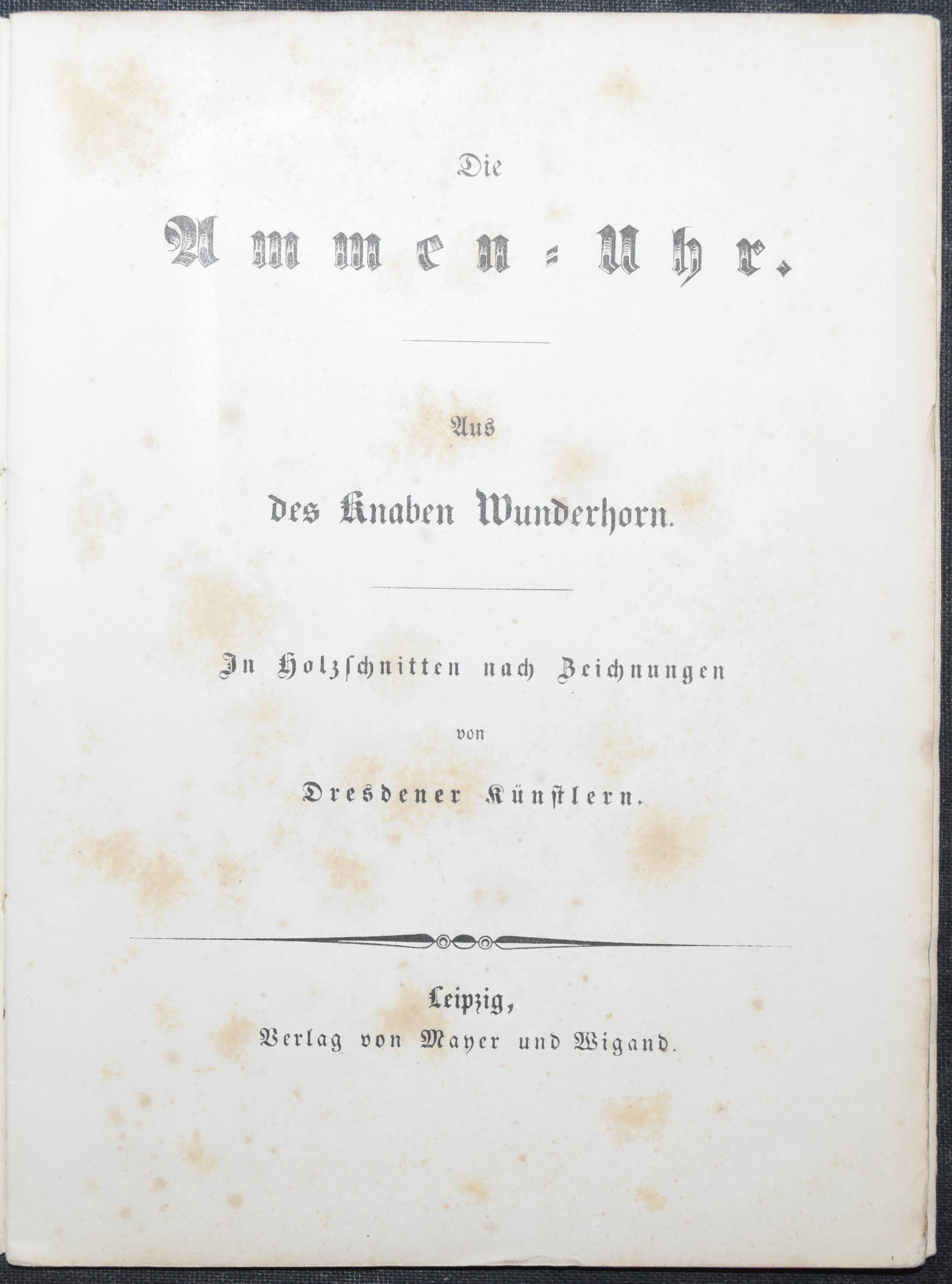 | Die Ammen-Uhr. Aus des Knaben Wunderhorn. In Holzschnitten nach Zeichnungen von Dresdener Künstlern. Leipzig, Mayer und Wiegand o.J. (1843). 8°. 12 Bl. (incl. Umschlag) mit 10 ganzs. Holzschnitten nach (Eduard Bendemann, Julius Hübner, Karl Ludwig Adolf Ehrhardt, Carl Gottlob Peschel, Ludwig Richter, Otto Wagner, Ernst Friedrich Oehme, Ernst Rietschel und Theobald v. Oer). OBr. mit Heftstr. Bilderwelt 271. Hauswedell 117 a. Hobrecker, Frankfurt 4. Hoff-Budde 1176. Pressler S. 202 (mit Abb. 157). Rümann 1883. Seebaß II, 52. – „Eins der bekanntesten Kinderbücher des 19. Jahrhunderts“ (A. Seebaß). – „Die Vierzeiler wurden unter neun Künstlern zum Illustrieren ausgelost… Eduard Bendemann malte 2, nämlich auch das Titelbild…“ (H. Müller). – Umschlag fl., stockfl.