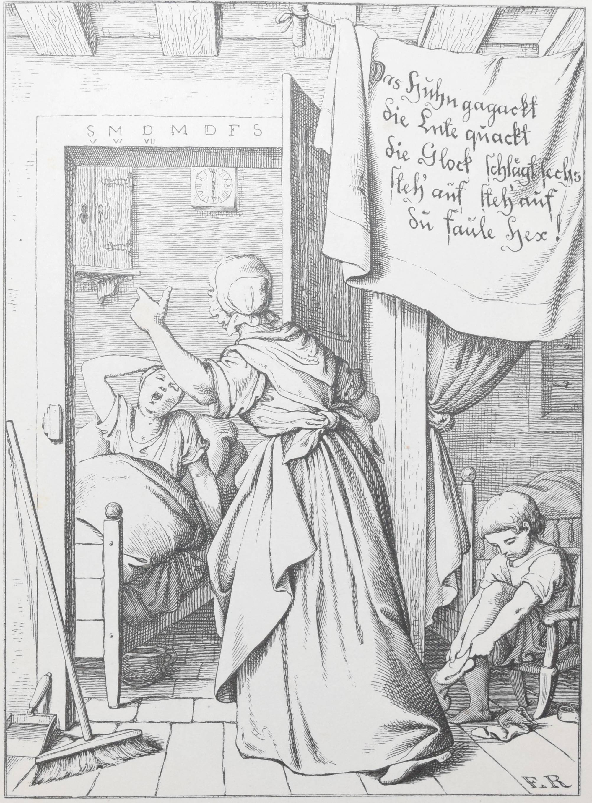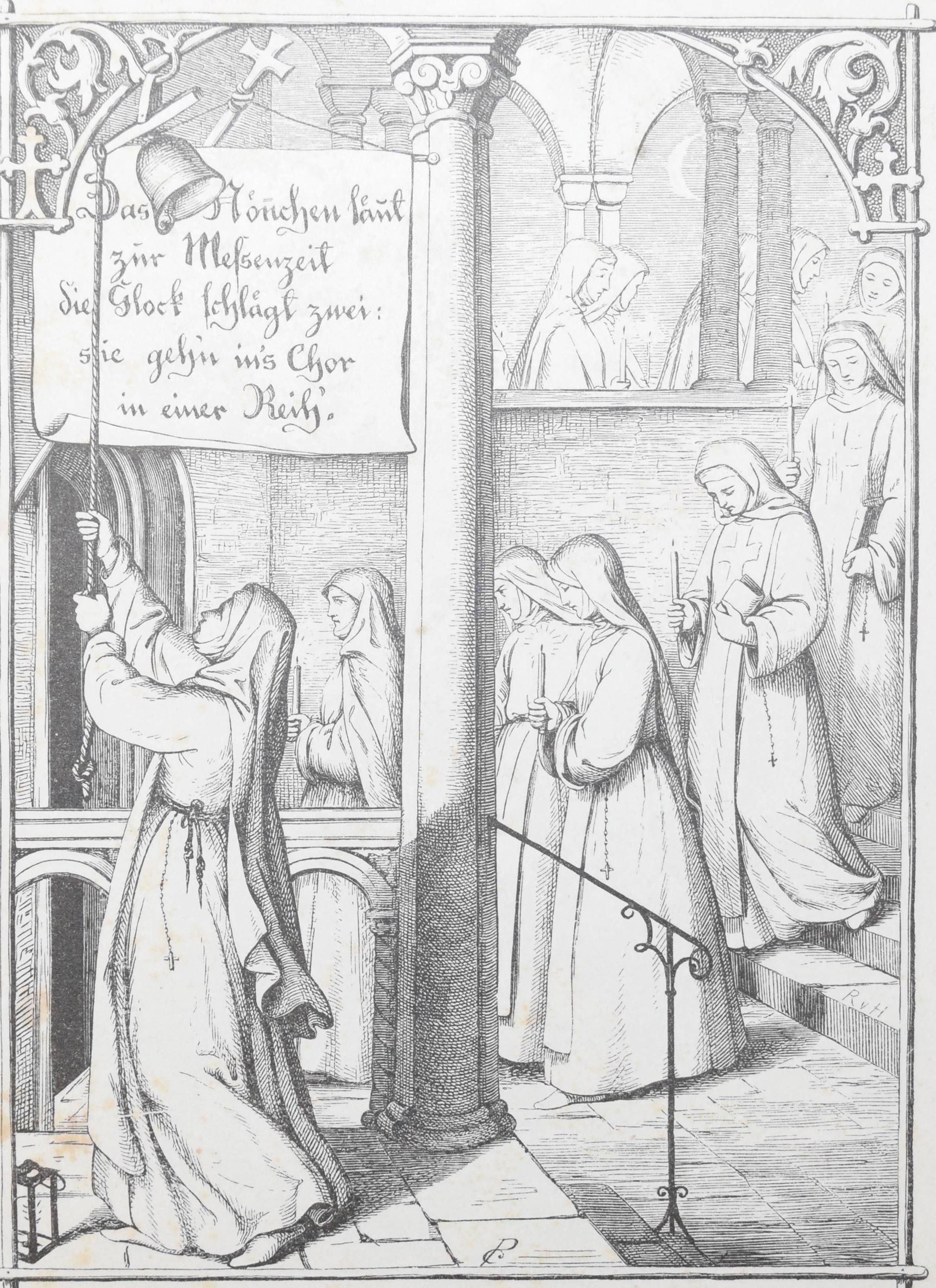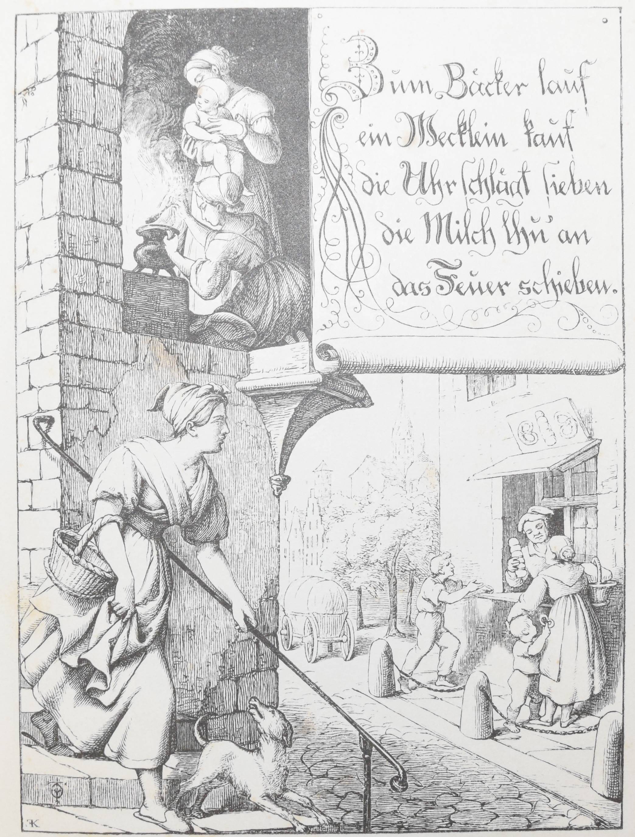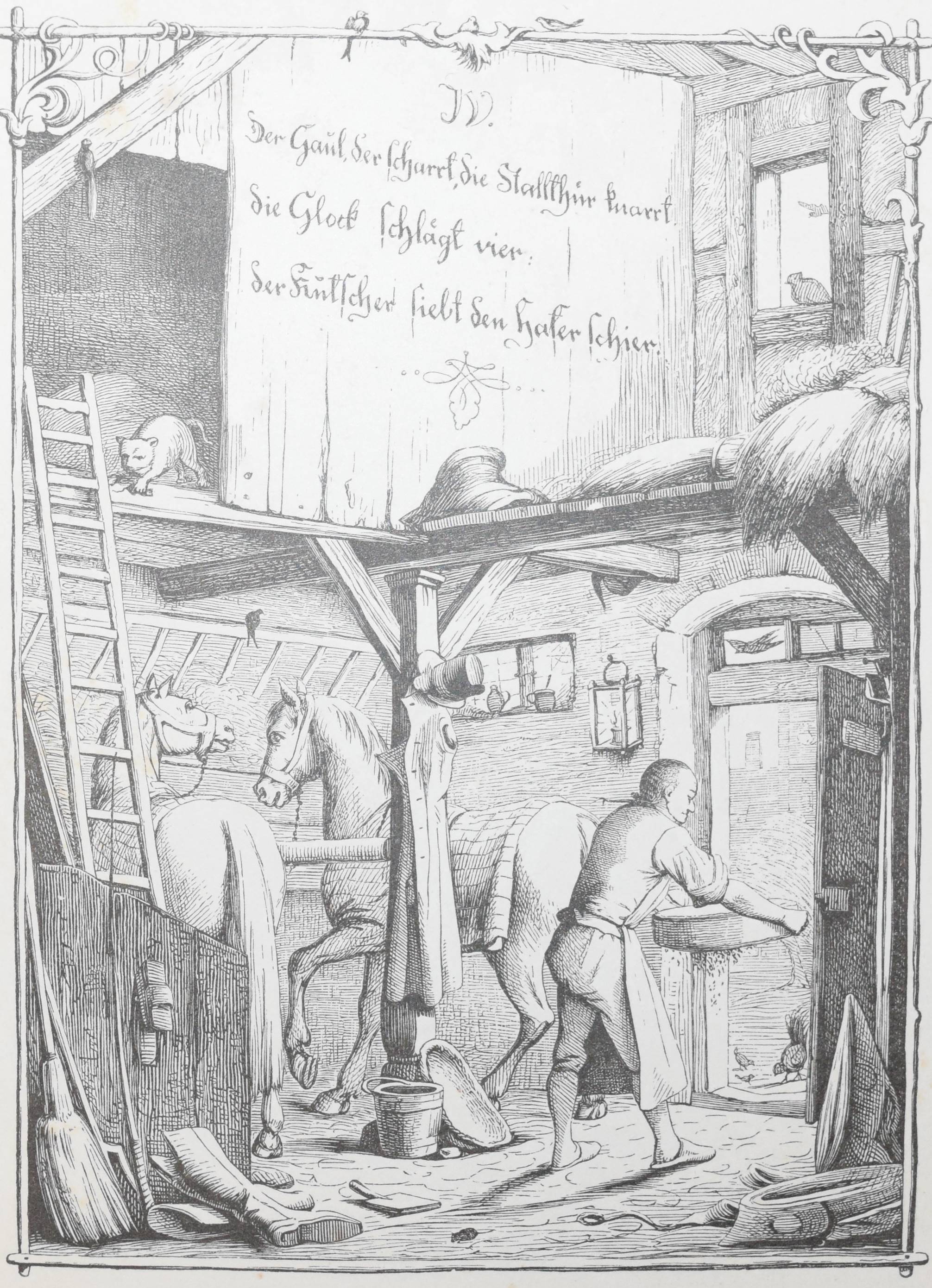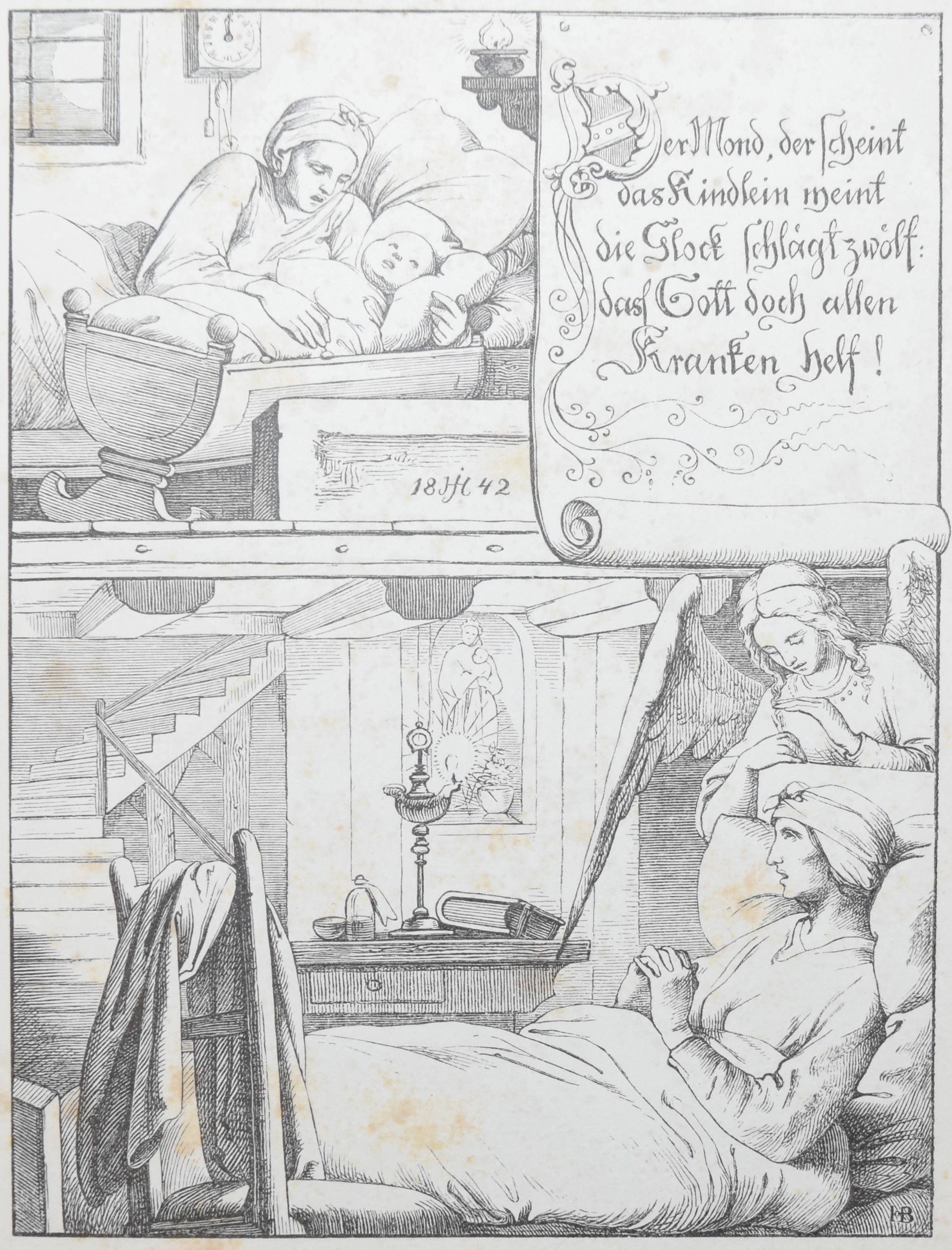 | Die Ammen-Uhr. Aus des Knaben Wunderhorn. In Holzschnitten nach Zeichnungen von Dresdener Künstlern. Leipzig, Mayer und Wiegand o.J. (1843). 8°. 12 Bl. (incl. Umschlag) mit 10 ganzs. Holzschnitten nach (Eduard Bendemann, Julius Hübner, Karl Ludwig Adolf Ehrhardt, Carl Gottlob Peschel, Ludwig Richter, Otto Wagner, Ernst Friedrich Oehme, Ernst Rietschel und Theobald v. Oer). OBr. mit Heftstr. Bilderwelt 271. Hauswedell 117 a. Hobrecker, Frankfurt 4. Hoff-Budde 1176. Pressler S. 202 (mit Abb. 157). Rümann 1883. Seebaß II, 52. – „Eins der bekanntesten Kinderbücher des 19. Jahrhunderts“ (A. Seebaß). – „Die Vierzeiler wurden unter neun Künstlern zum Illustrieren ausgelost… Eduard Bendemann malte 2, nämlich auch das Titelbild…“ (H. Müller). – Umschlag fl., stockfl.