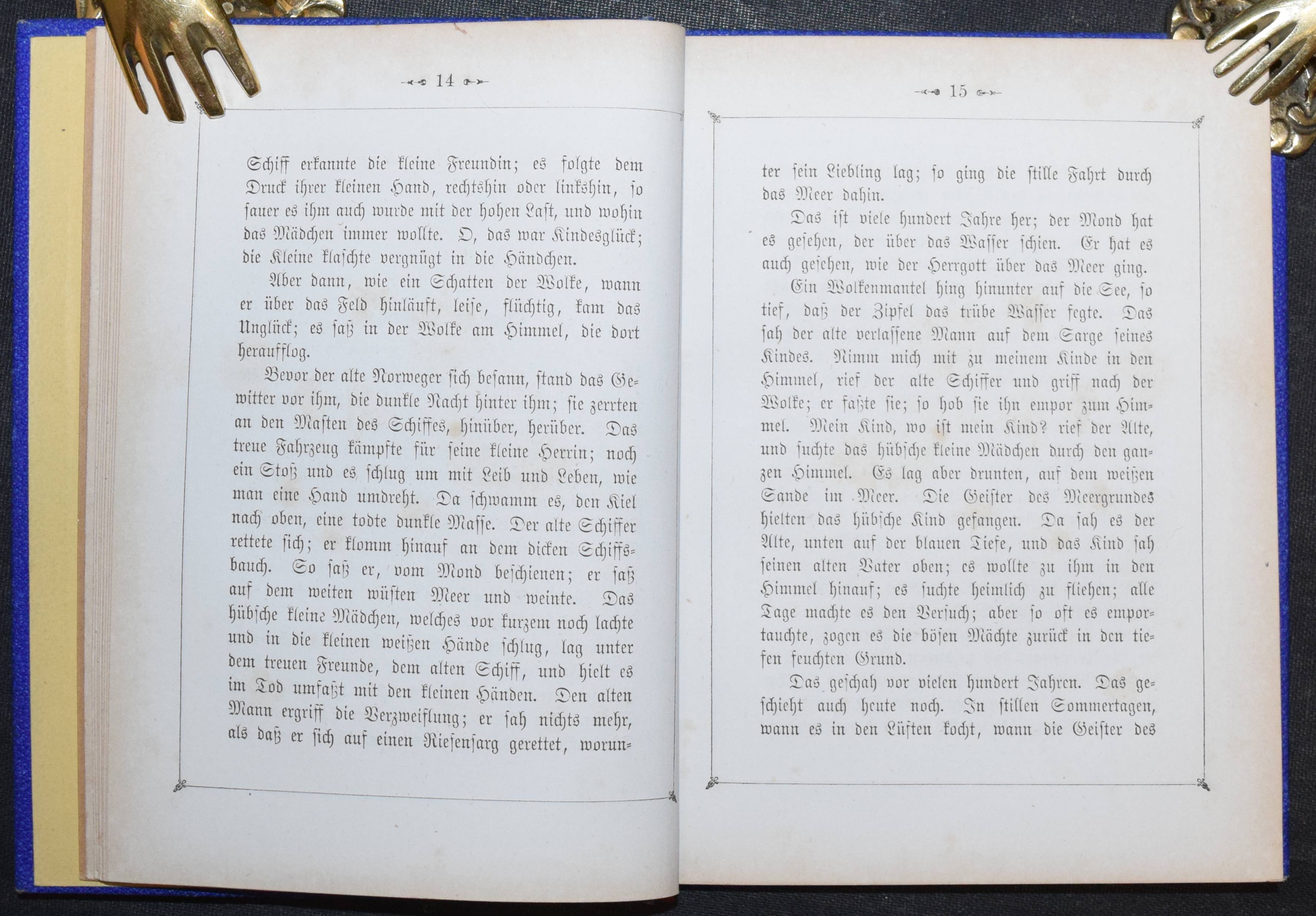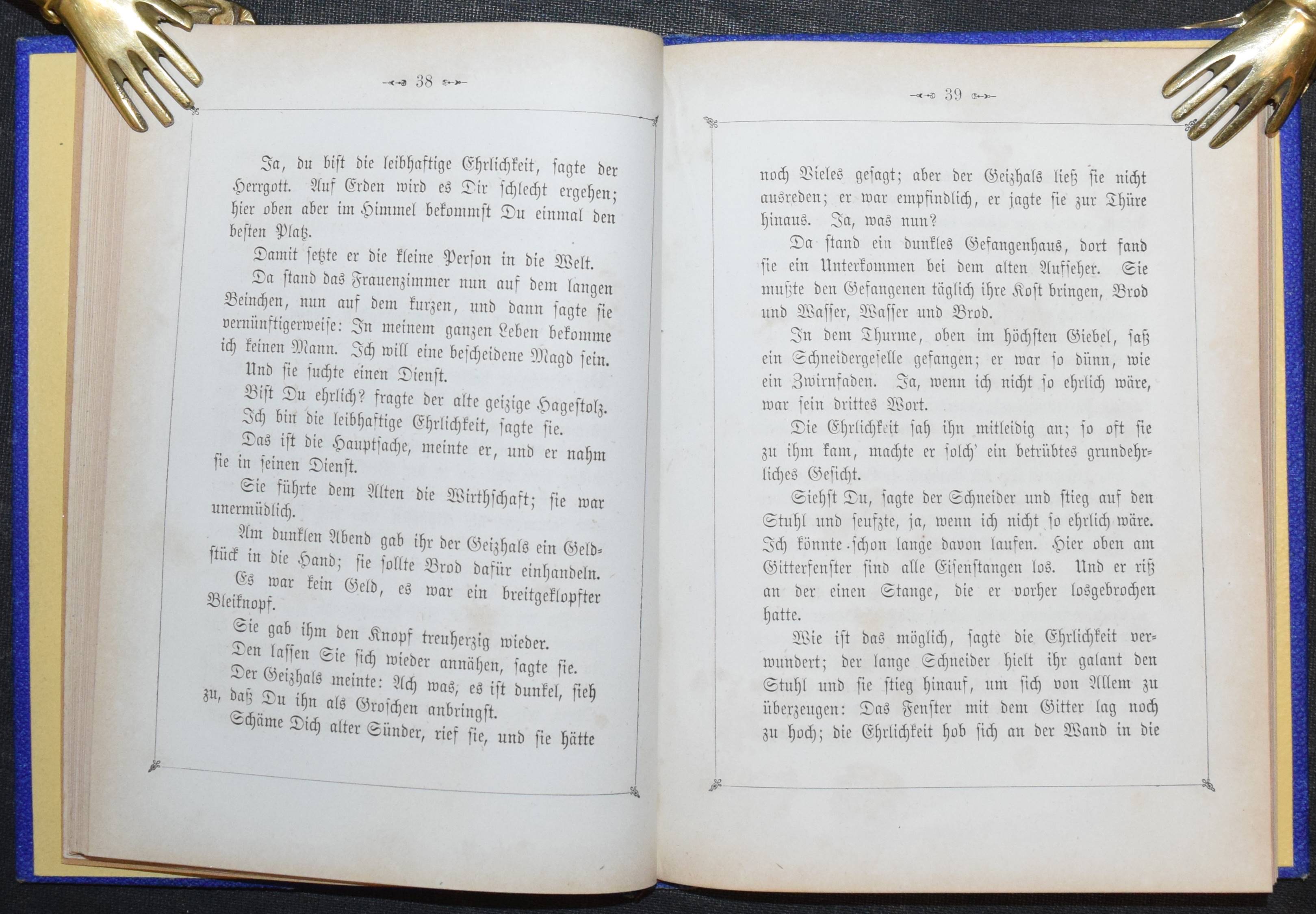(Gaedcke, Hugo). Das Bilder-Buch eines armen Studenten. 2., verm. Aufl. Berlin, Duncker 1868. Kl.-8°. Titel, 98 S. OLn. mit goldgepr. Deckeltitel in Ornamentrahmen u. Goldschnitt. Erschien zuerst 1867. – Der Jurist und Schriftsteller H. Gaedcke (1835-1875) arbeitete nach seinem Studium in Heidelberg, Tübingen und Rostock in der Justizkanzlei Rostock. – N.a.V., stellenw. etwas stockfl., gutes Exemplar.