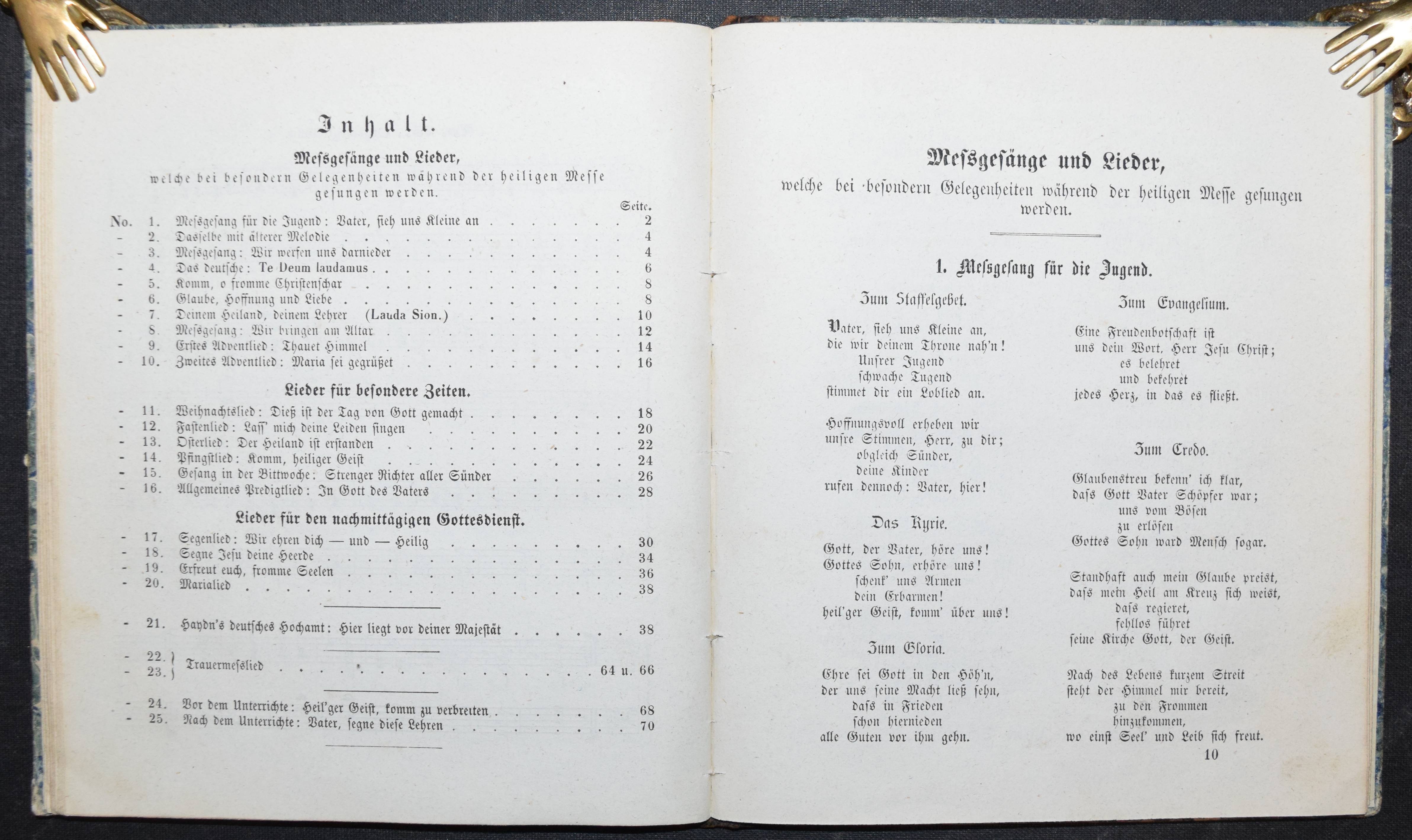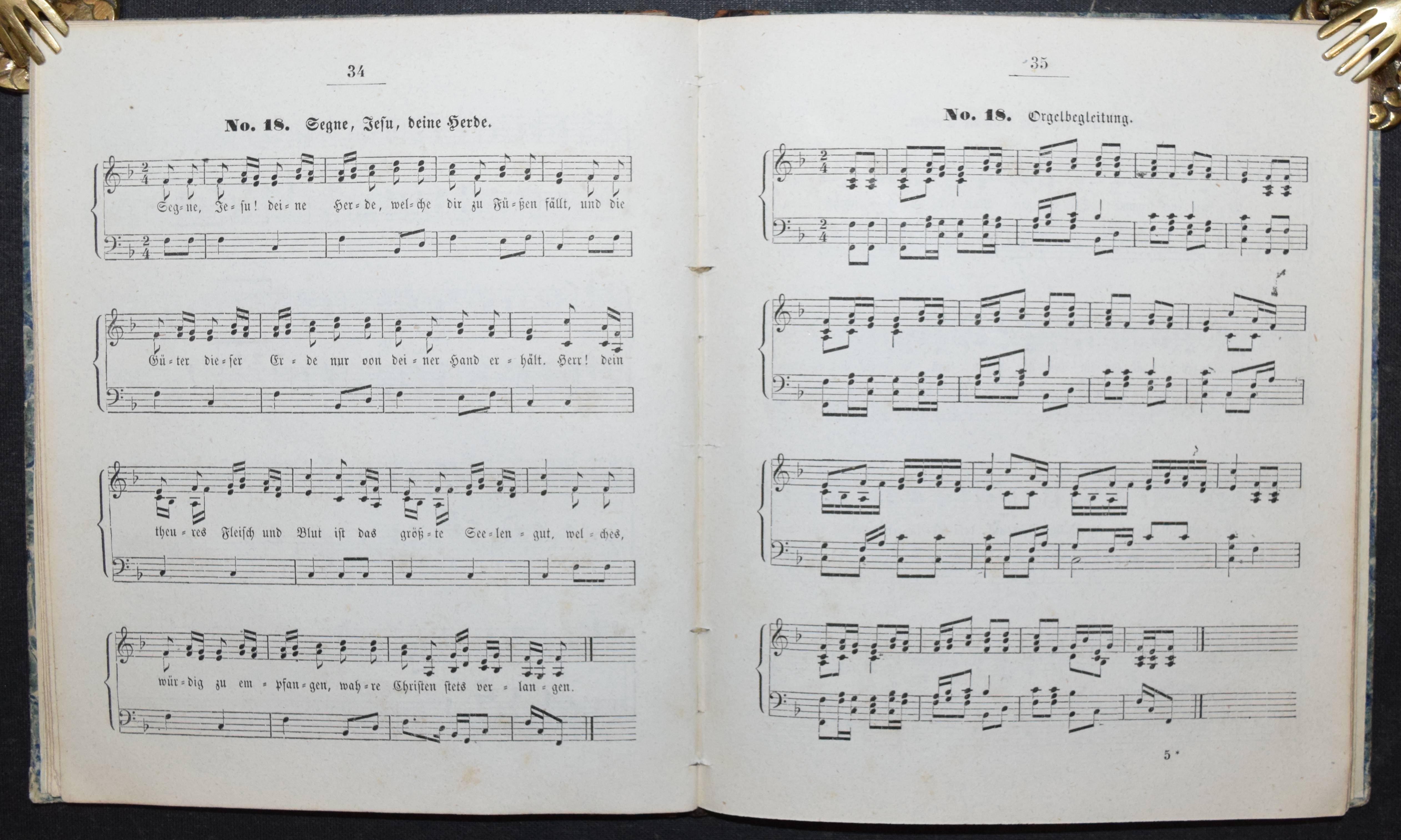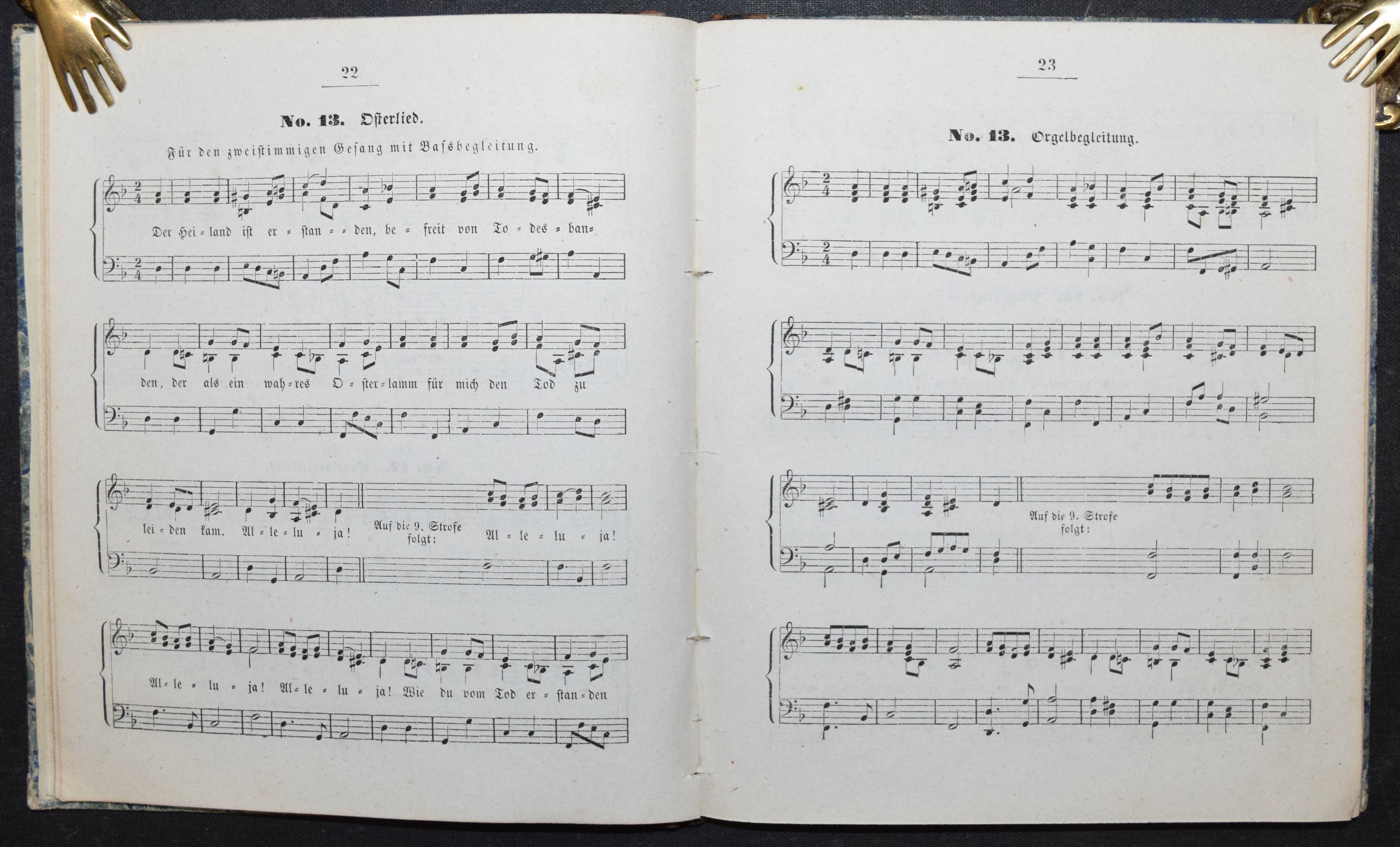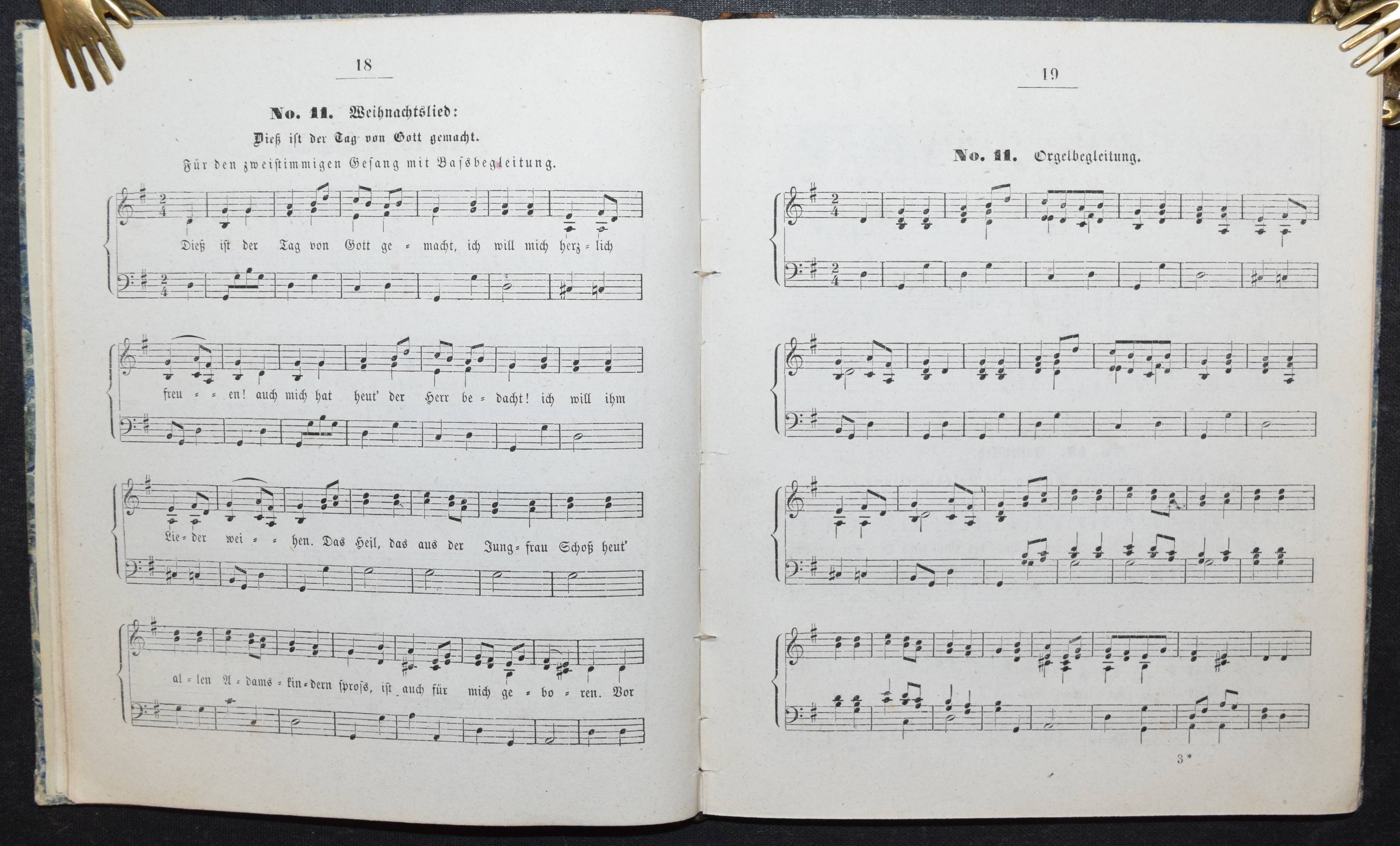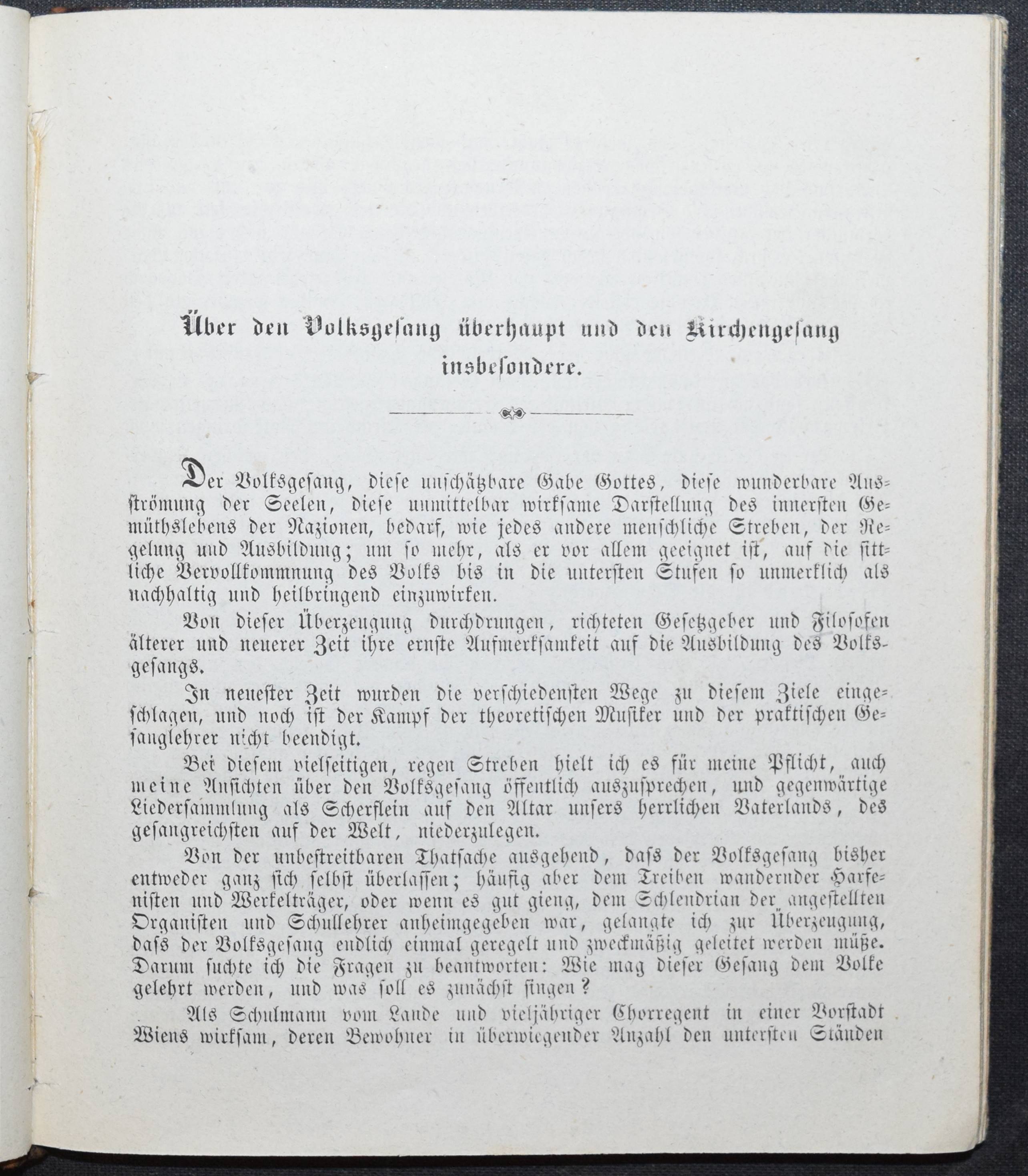 Pichler, Karl. Volksweisen deutscher Kirchenlieder zum Schulunterrichte. Für den zweistimmigen Gesang mit vollständiger Orgelbegleitung dargestellt von Karl Pichler, fürsterzbischöfl. Thorregenten, Lehrer des Volksgesangs an den k. k. Mädchenschulen in Wien und Professor des Wiener Musik-Konservatoriums. Wien, Gerold und Sohn 1851. 8°. XVI, 96 S. mit zahlr. Notenbeispielen. Hldr. der Zeit. Erste Ausgabe. – Rücken stärker berieben, zeitgen. Namensschild a. V., gutes Exemplar.