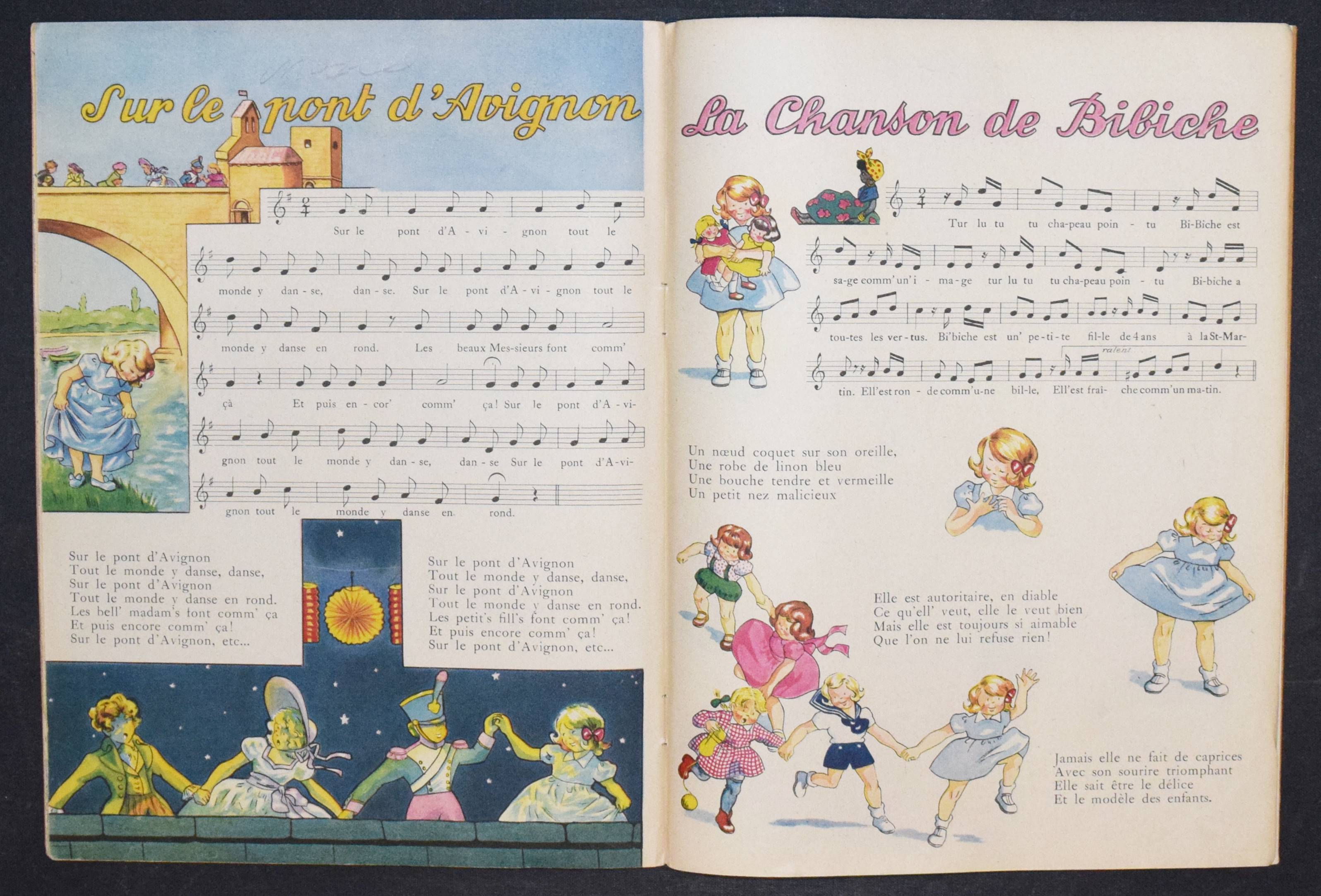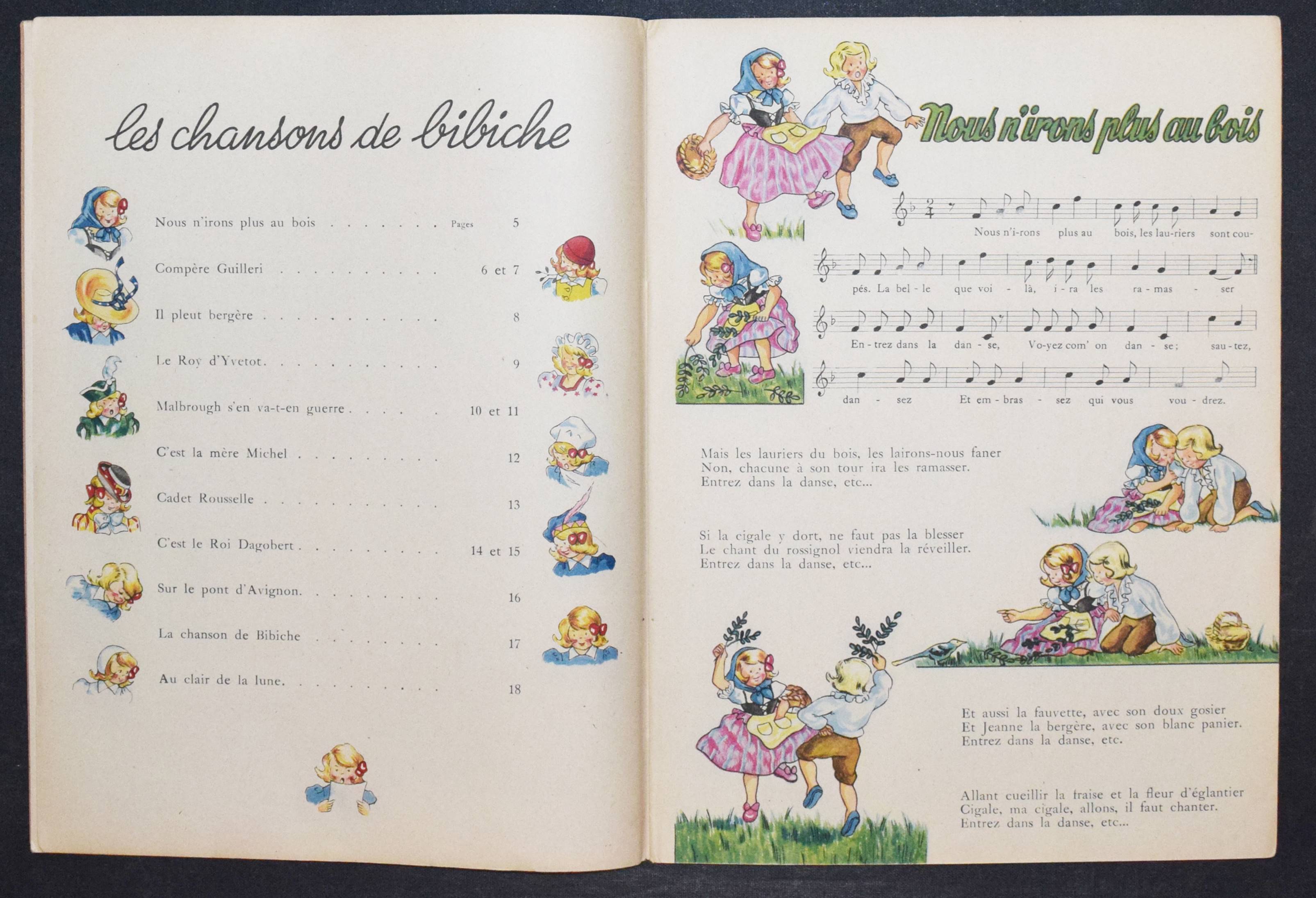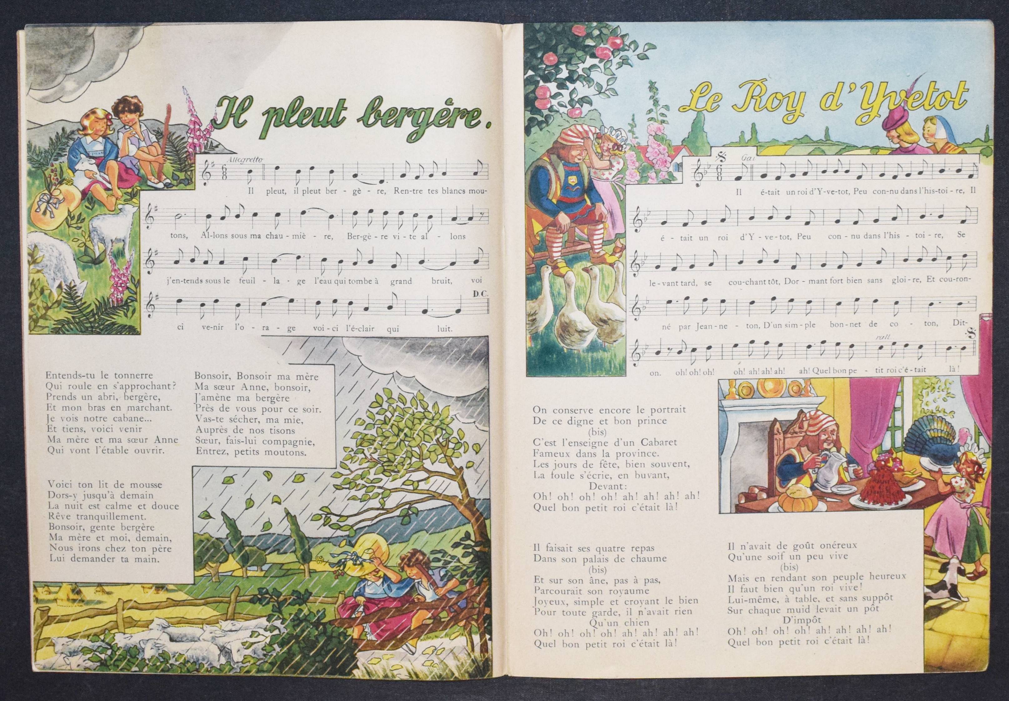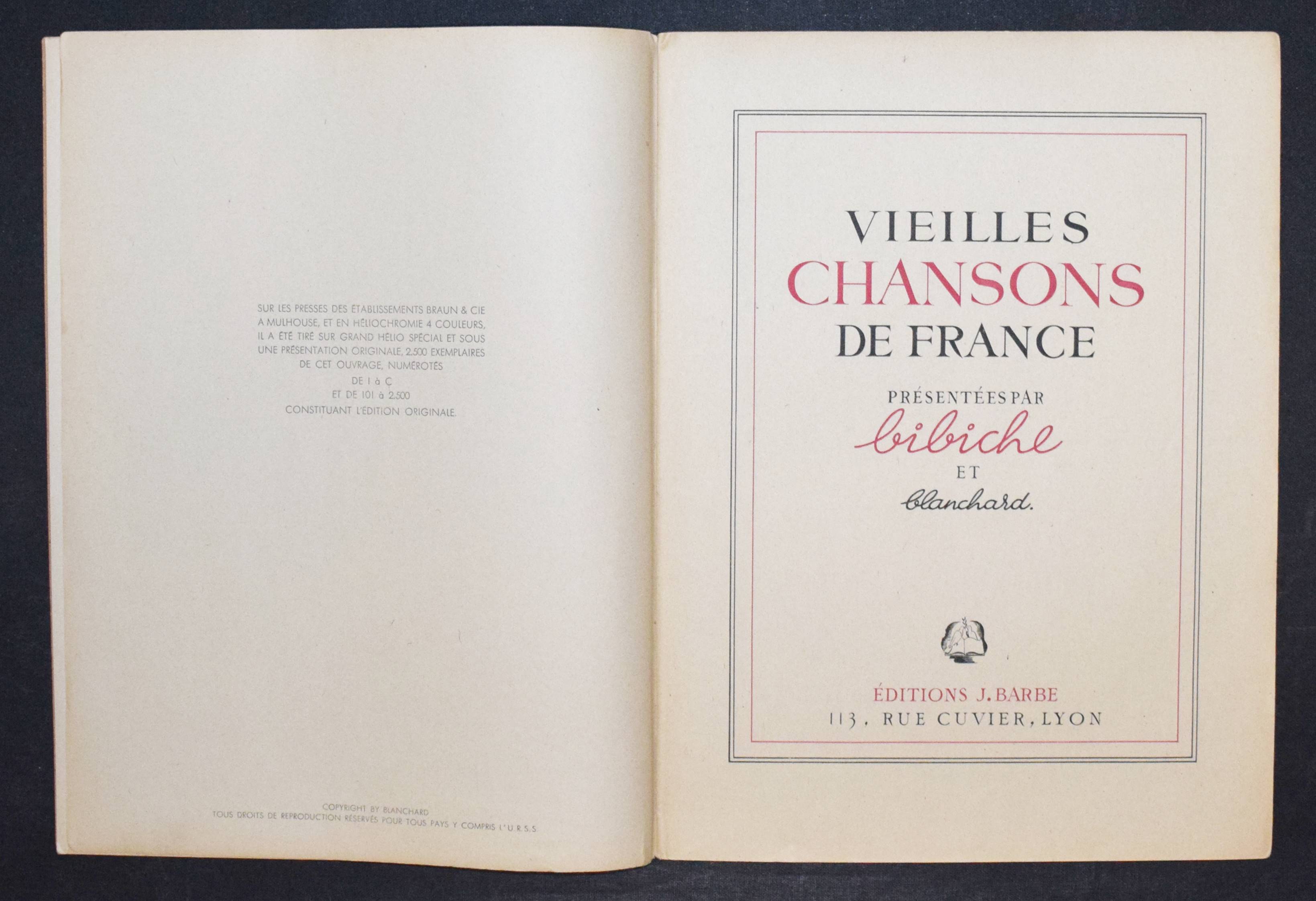 Vieilles chansons de France presentées par Bibiche et Blanchard. (Deckeltitel: Les chansons de Bibiche par Blanchard). Lyon, J. Barbe 1945. 4°. 10 Bl. mit zahlr. Notenbeispielen u. zahlr. lithograph. Illustrationen. Farbig illustr. OHln. Erste Ausgabe.– Eines von 2500 Exemplaren. – Deckelbild etwas berieben, sonst gutes Exemplar.