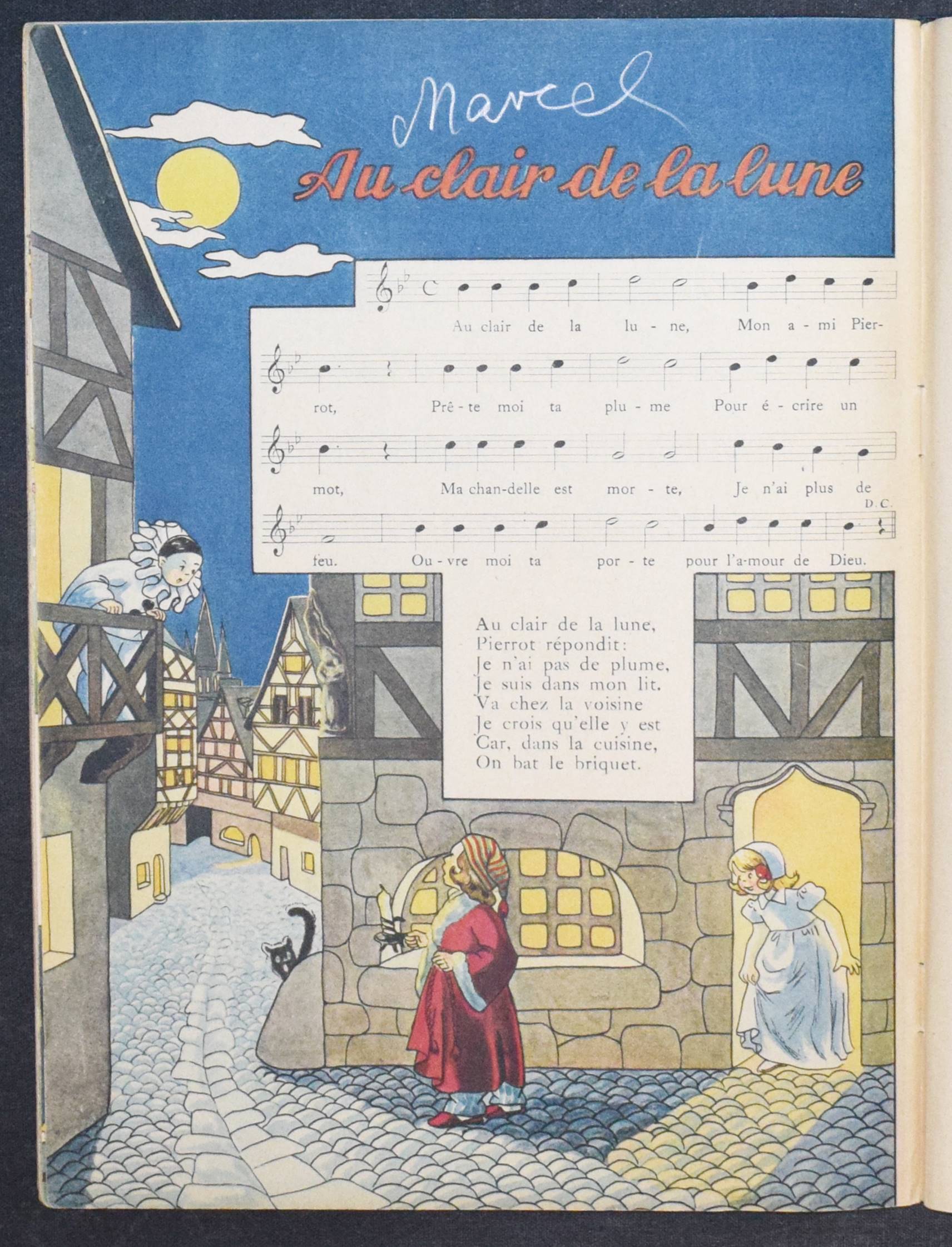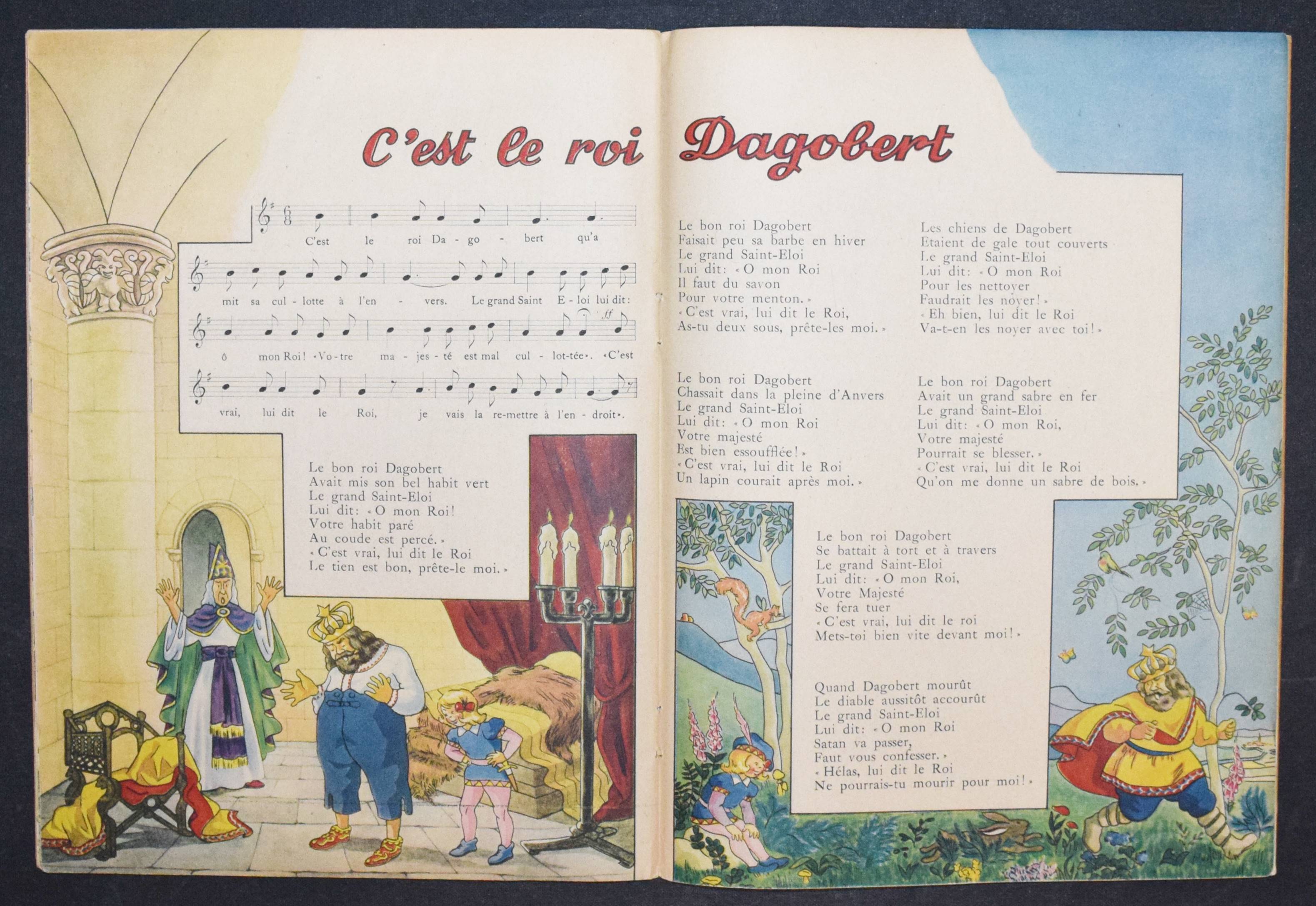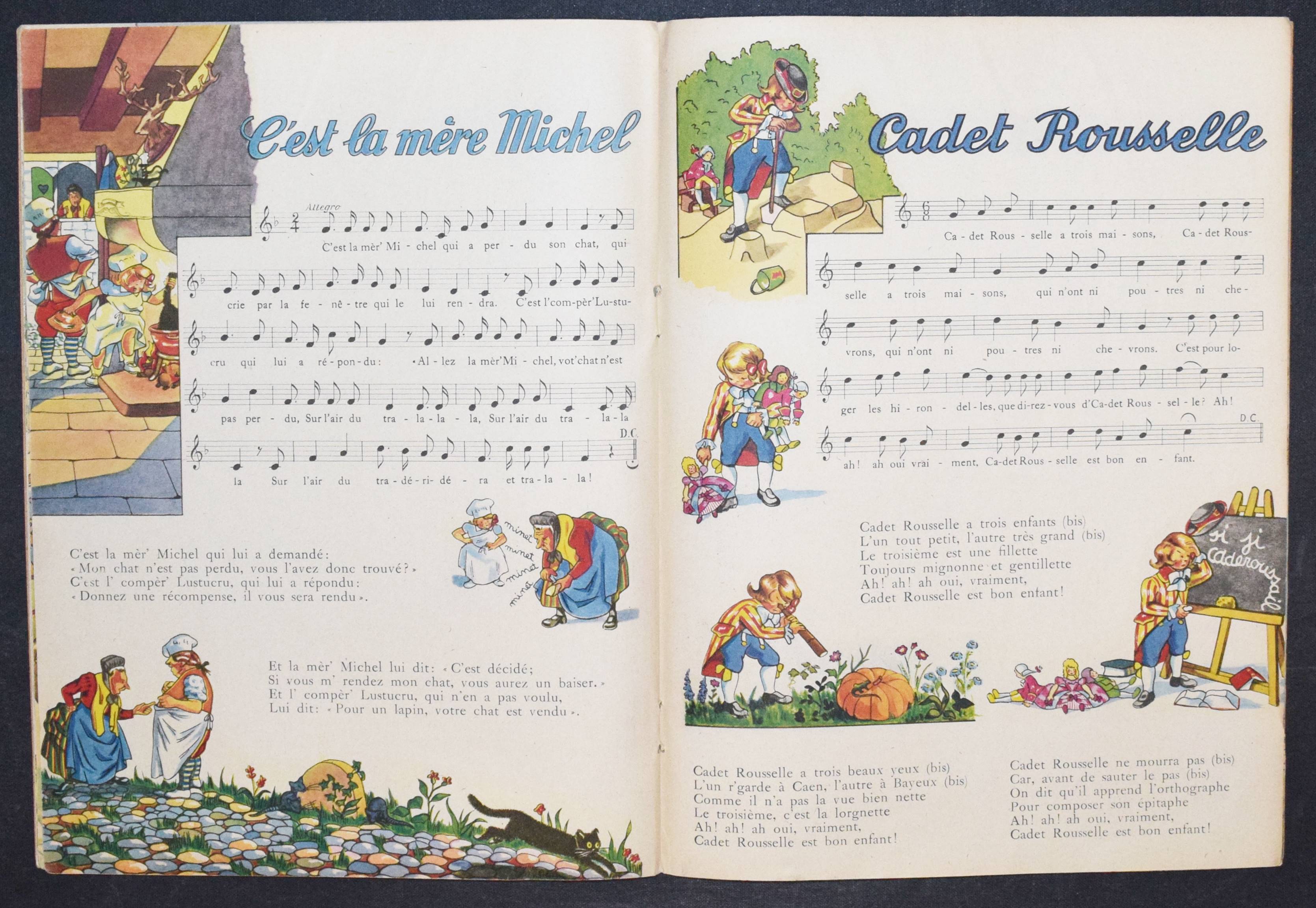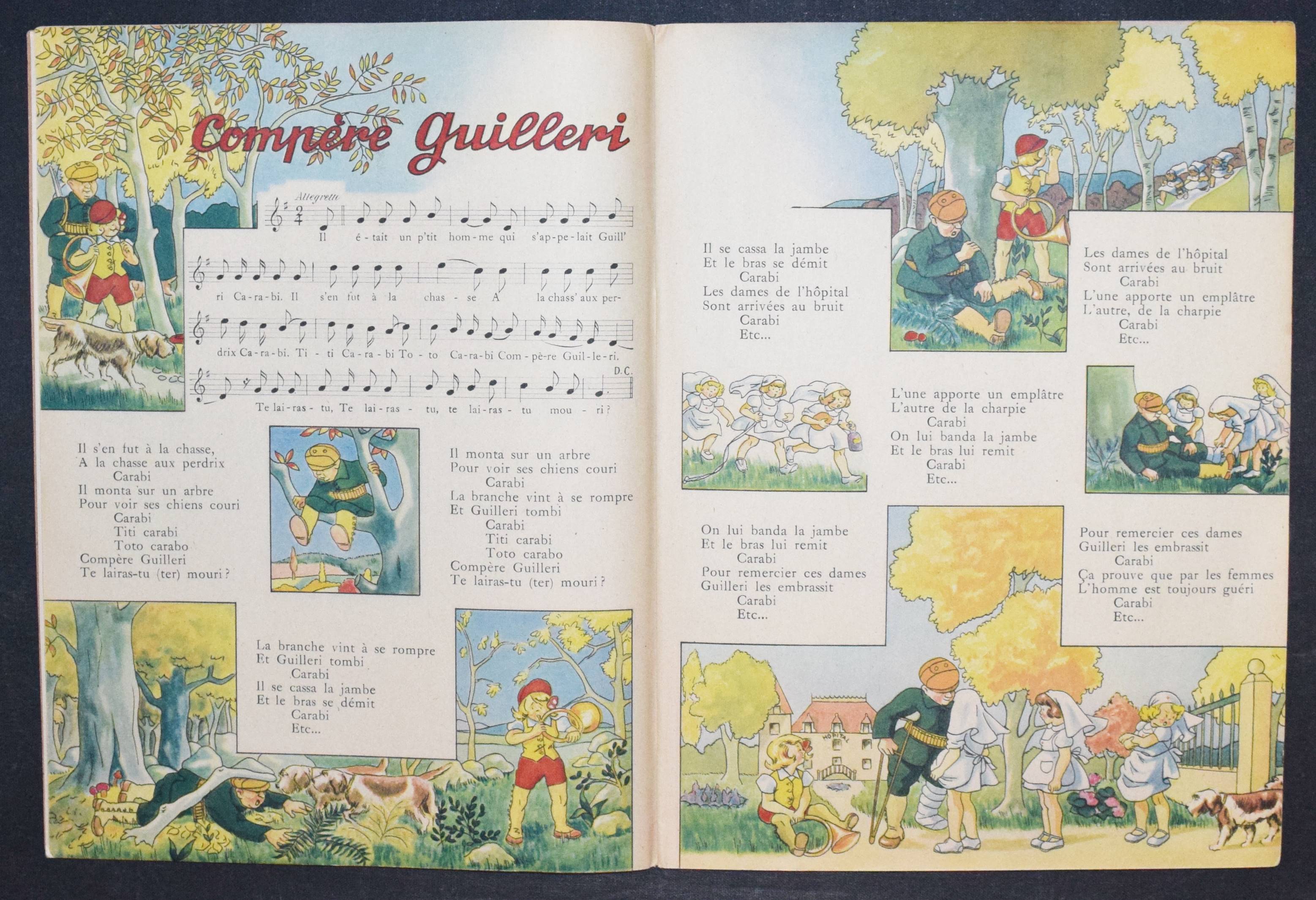 Vieilles chansons de France presentées par Bibiche et Blanchard. (Deckeltitel: Les chansons de Bibiche par Blanchard). Lyon, J. Barbe 1945. 4°. 10 Bl. mit zahlr. Notenbeispielen u. zahlr. lithograph. Illustrationen. Farbig illustr. OHln. Erste Ausgabe.– Eines von 2500 Exemplaren. – Deckelbild etwas berieben, sonst gutes Exemplar.