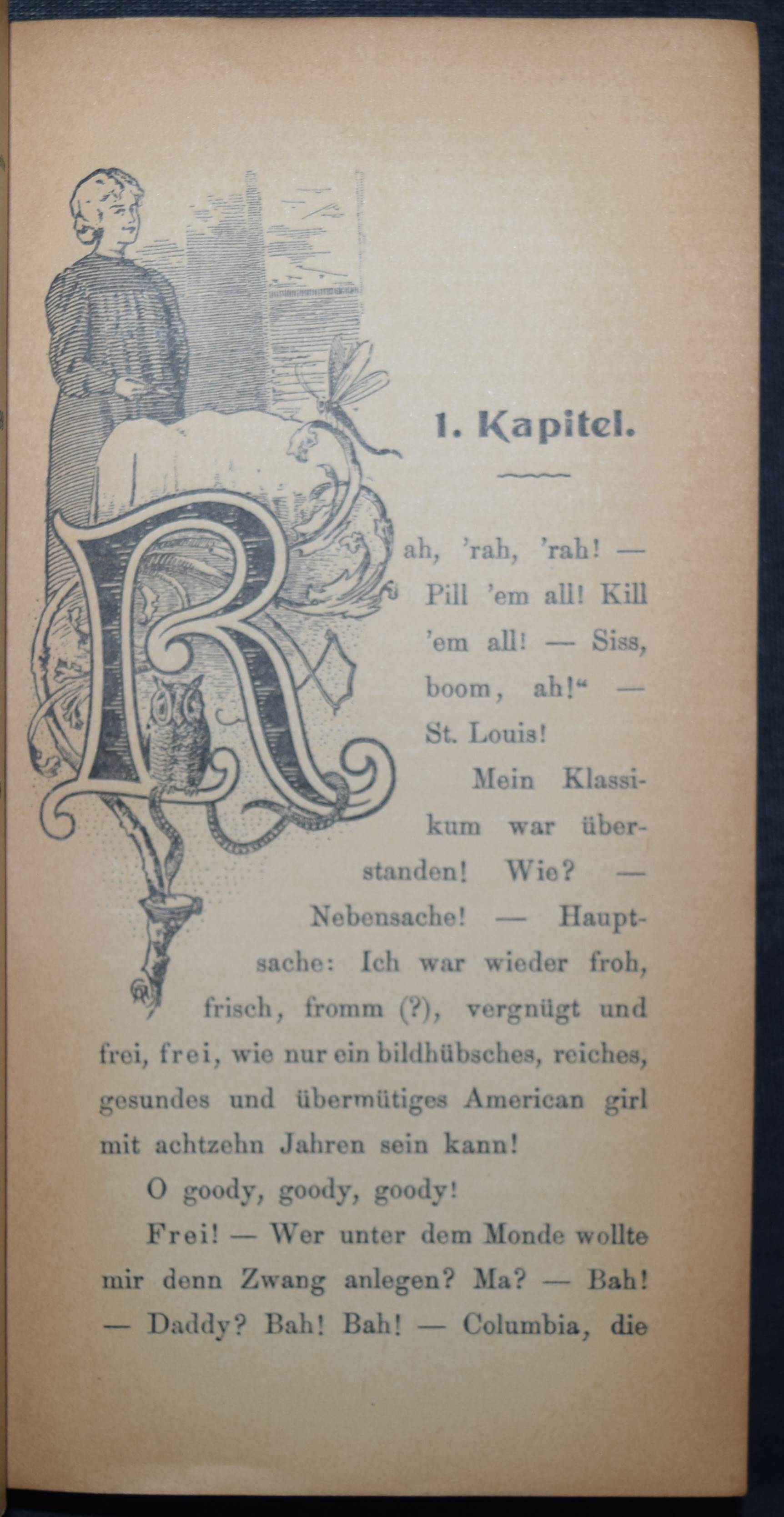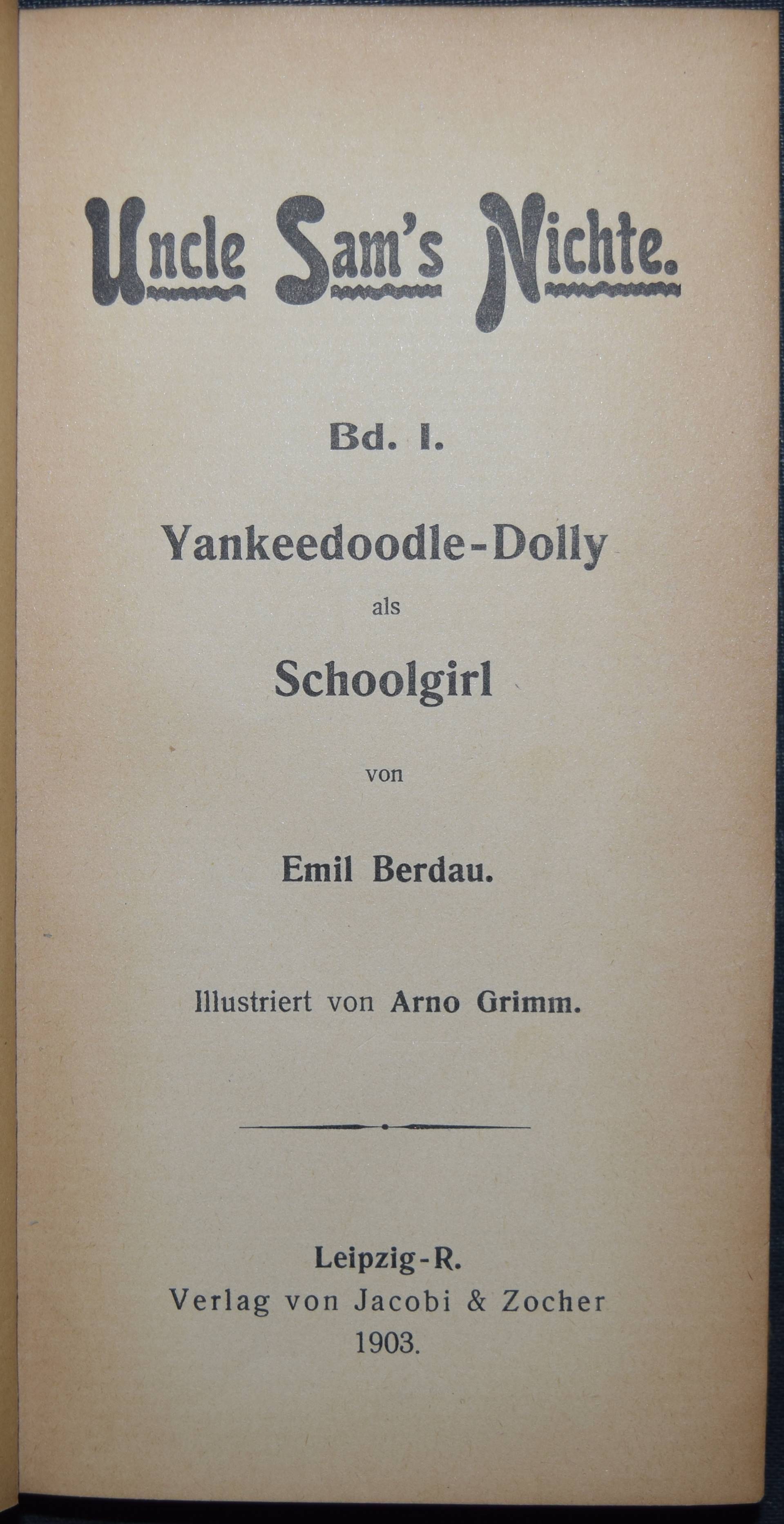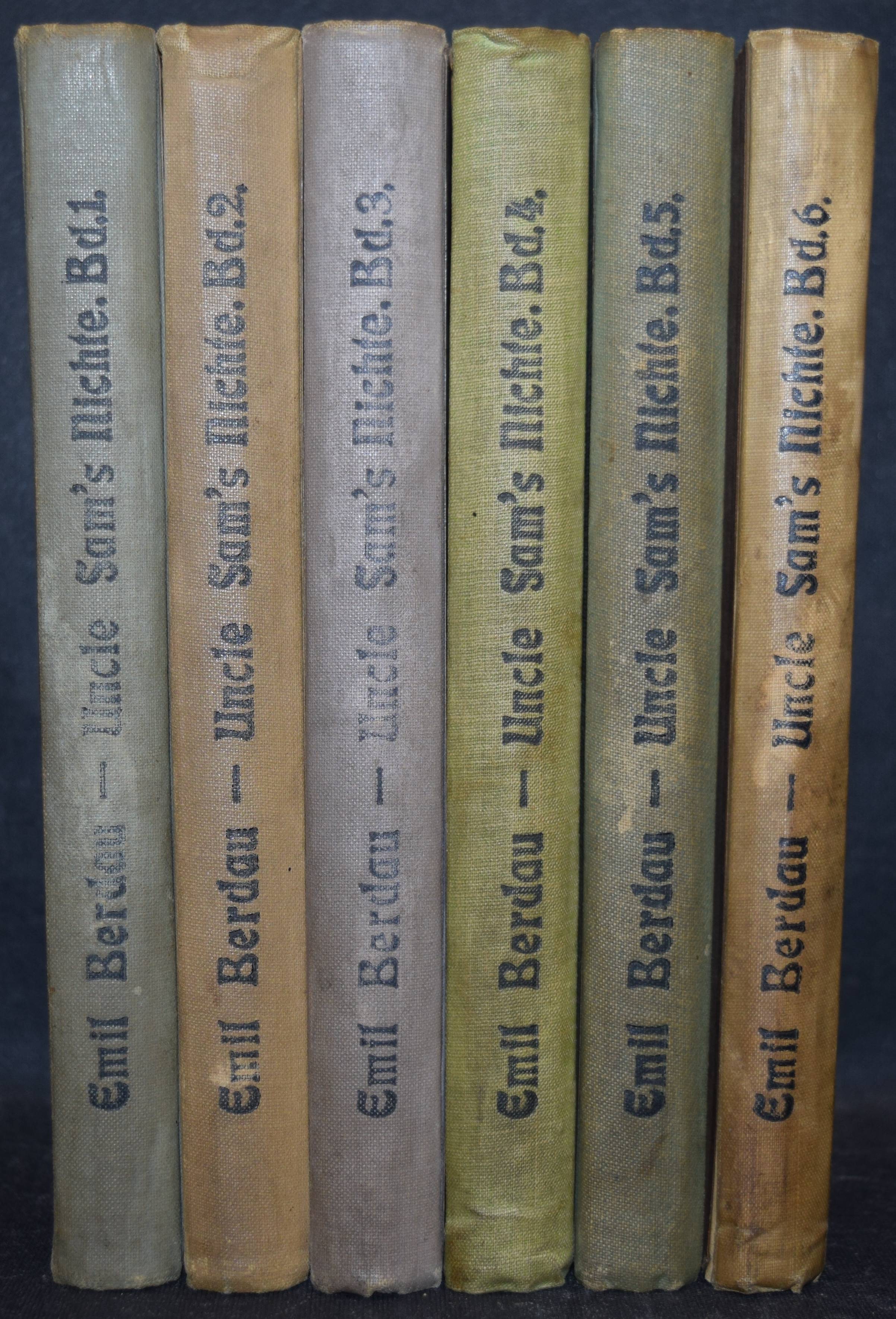 Berdau, Emil. Uncle Sam’s Nichte. Illustriert von Arno Grimm. 6 Bände. Leipzig, Jacobi & Zocher 1903. 8°. Mit zahlr. Illustrationen. Farbig illustr. OHln. Brümmer I, 189. – Erste Ausgabe. – Autobiographisch erzählte Abenteuer einer „Yankeedoodle-Dolly“ als I. Schoolgirl, II. College-Girl, III. Summer-Girl, IV. Roustabout, V. Society-Girl und VI. Housewife. – Der Verfasser hatte seit 1884 die USA durchstreift, bis er Geistlicher in verschiedenen Gemeinden des „wilden“ Westens wurde. – Die lebensnahen Schilderungen amerikanischen Lebens und Denkens für ein deutsches Backfisch-Publikum erfreuten sich großer Beliebtheit. – Einbände etwas berieben u. bestossen, papierbedingt gebräunt, gutes Exemplar der komplett seltenen Reihe.