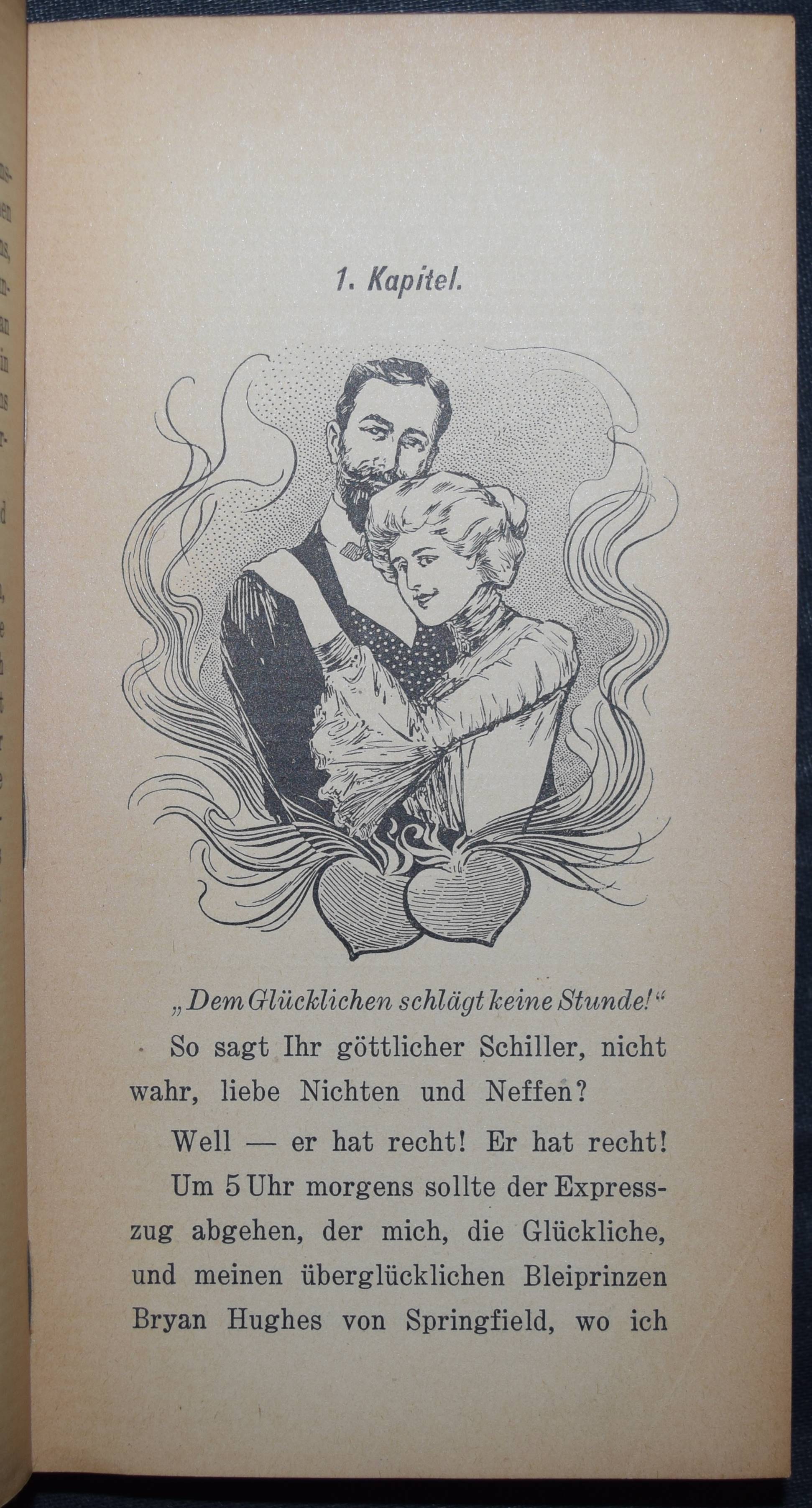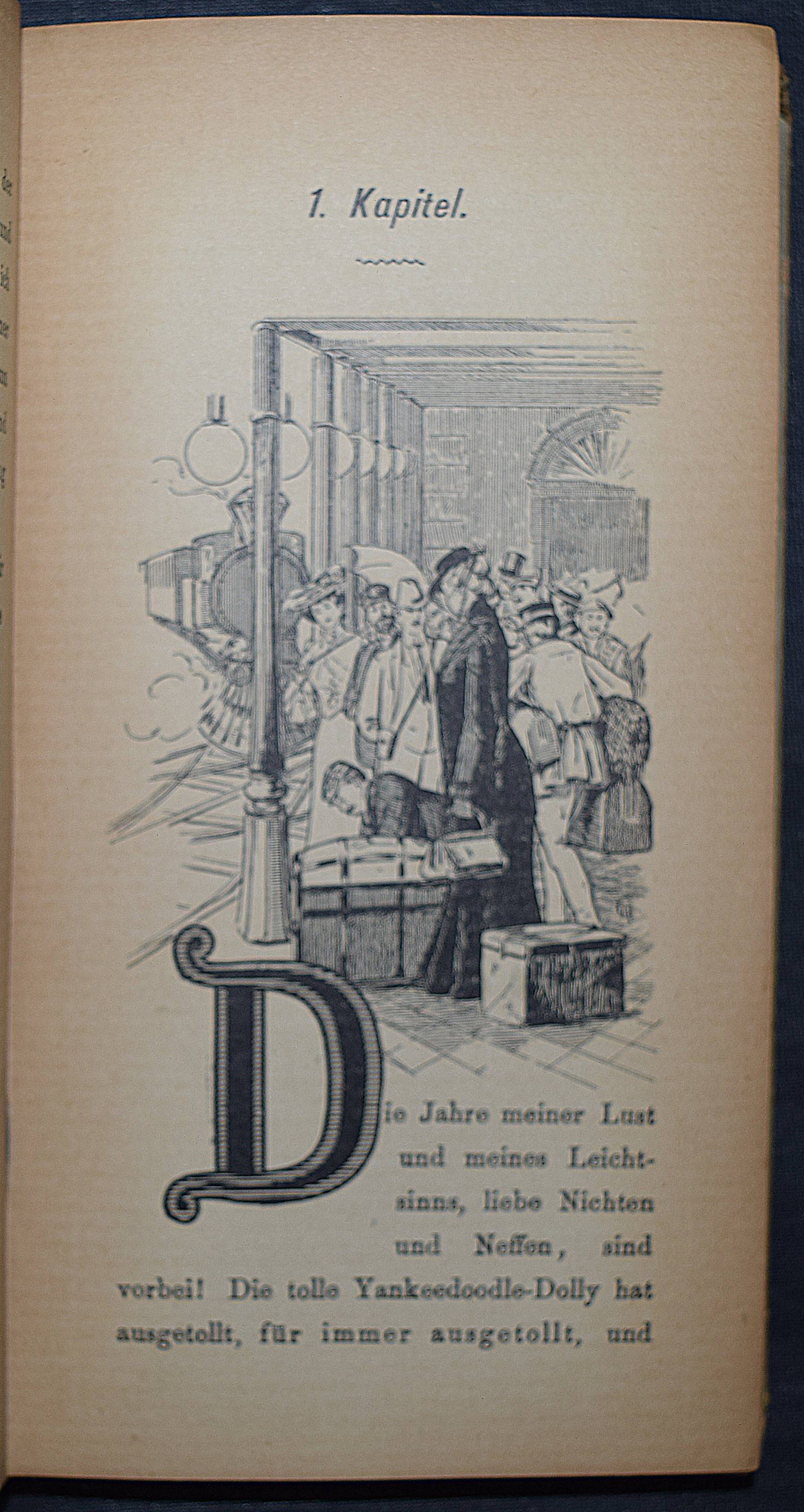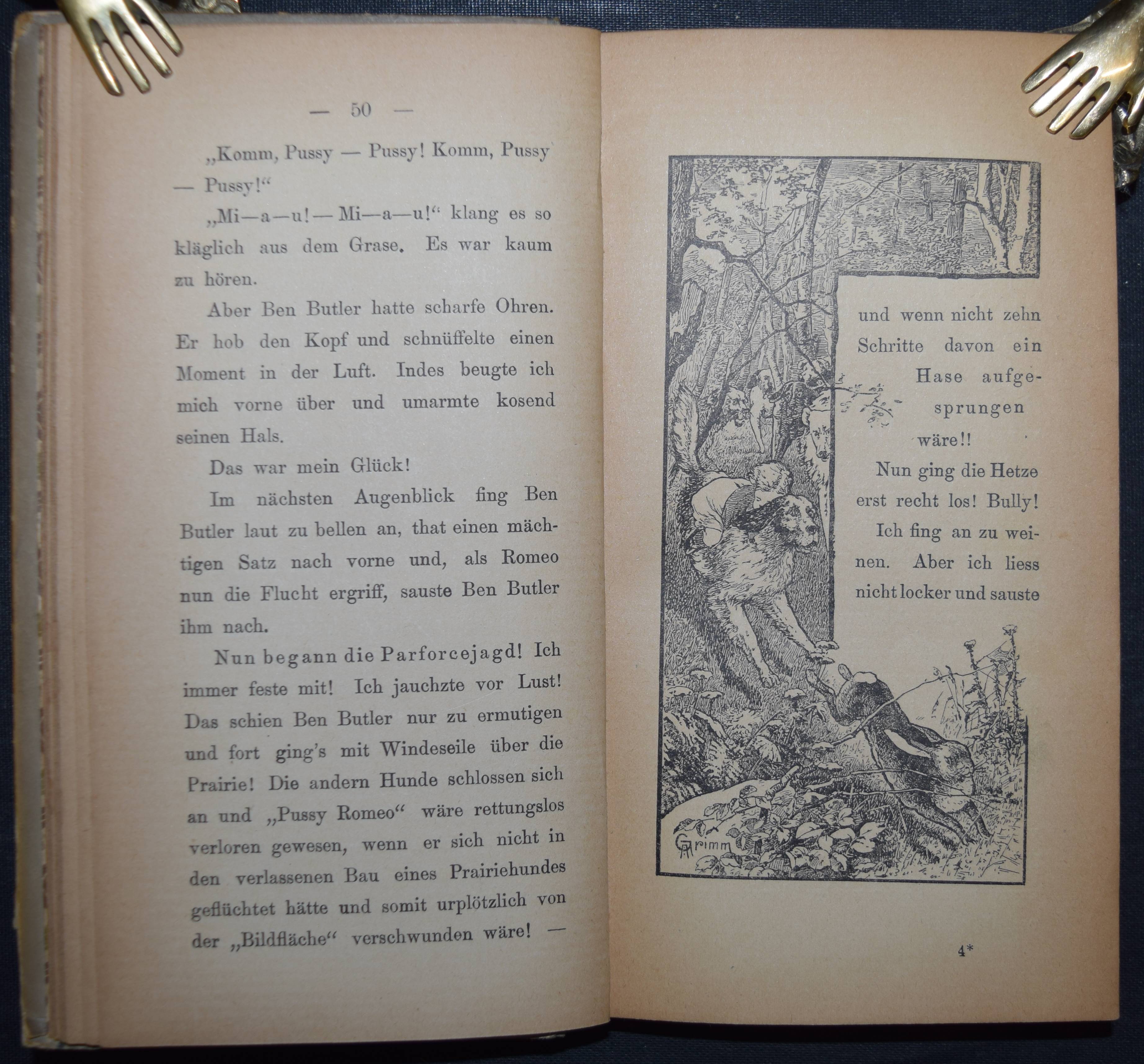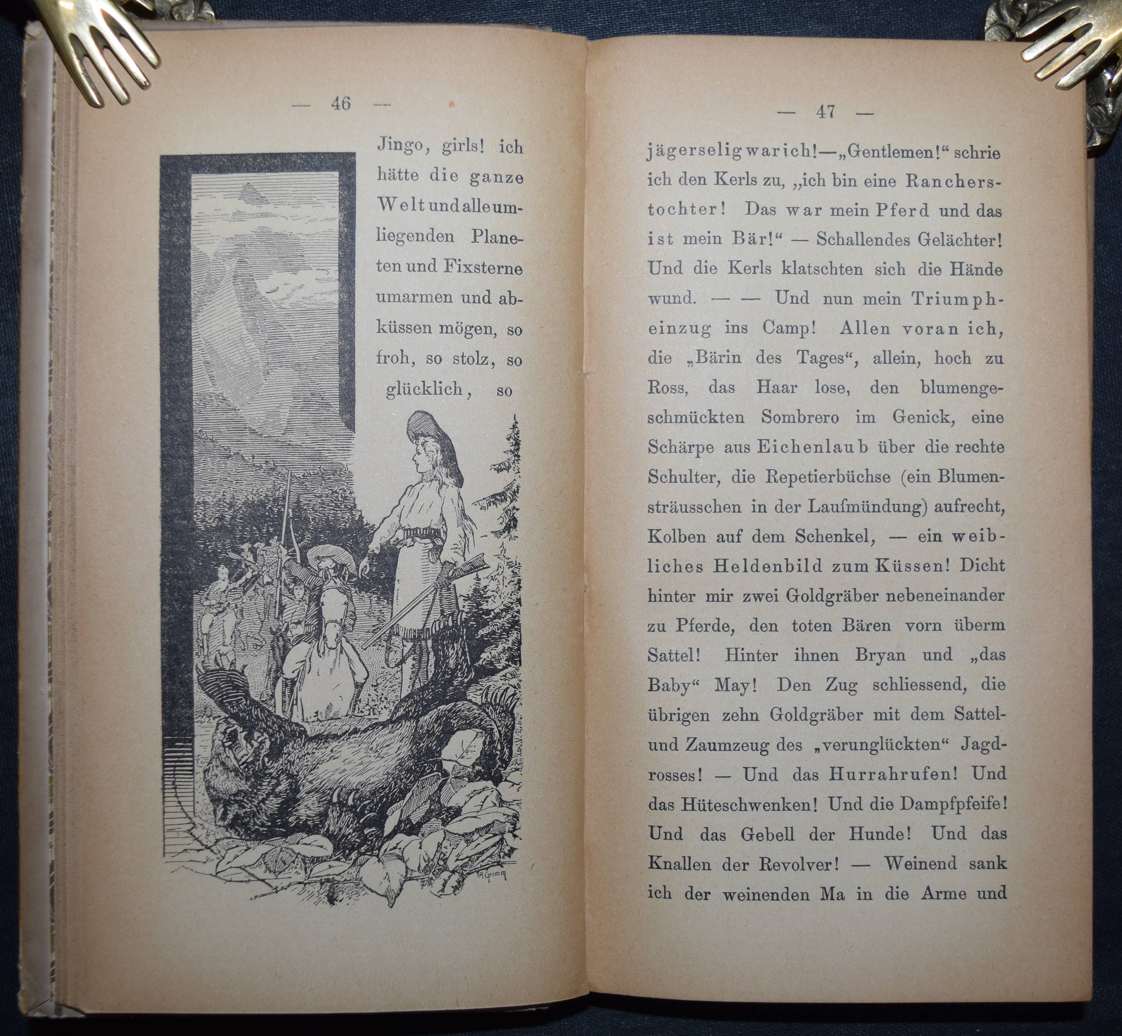 Berdau, Emil. Uncle Sam’s Nichte. Illustriert von Arno Grimm. 6 Bände. Leipzig, Jacobi & Zocher 1903. 8°. Mit zahlr. Illustrationen. Farbig illustr. OHln. Brümmer I, 189. – Erste Ausgabe. – Autobiographisch erzählte Abenteuer einer „Yankeedoodle-Dolly“ als I. Schoolgirl, II. College-Girl, III. Summer-Girl, IV. Roustabout, V. Society-Girl und VI. Housewife. – Der Verfasser hatte seit 1884 die USA durchstreift, bis er Geistlicher in verschiedenen Gemeinden des „wilden“ Westens wurde. – Die lebensnahen Schilderungen amerikanischen Lebens und Denkens für ein deutsches Backfisch-Publikum erfreuten sich großer Beliebtheit. – Einbände etwas berieben u. bestossen, papierbedingt gebräunt, gutes Exemplar der komplett seltenen Reihe.