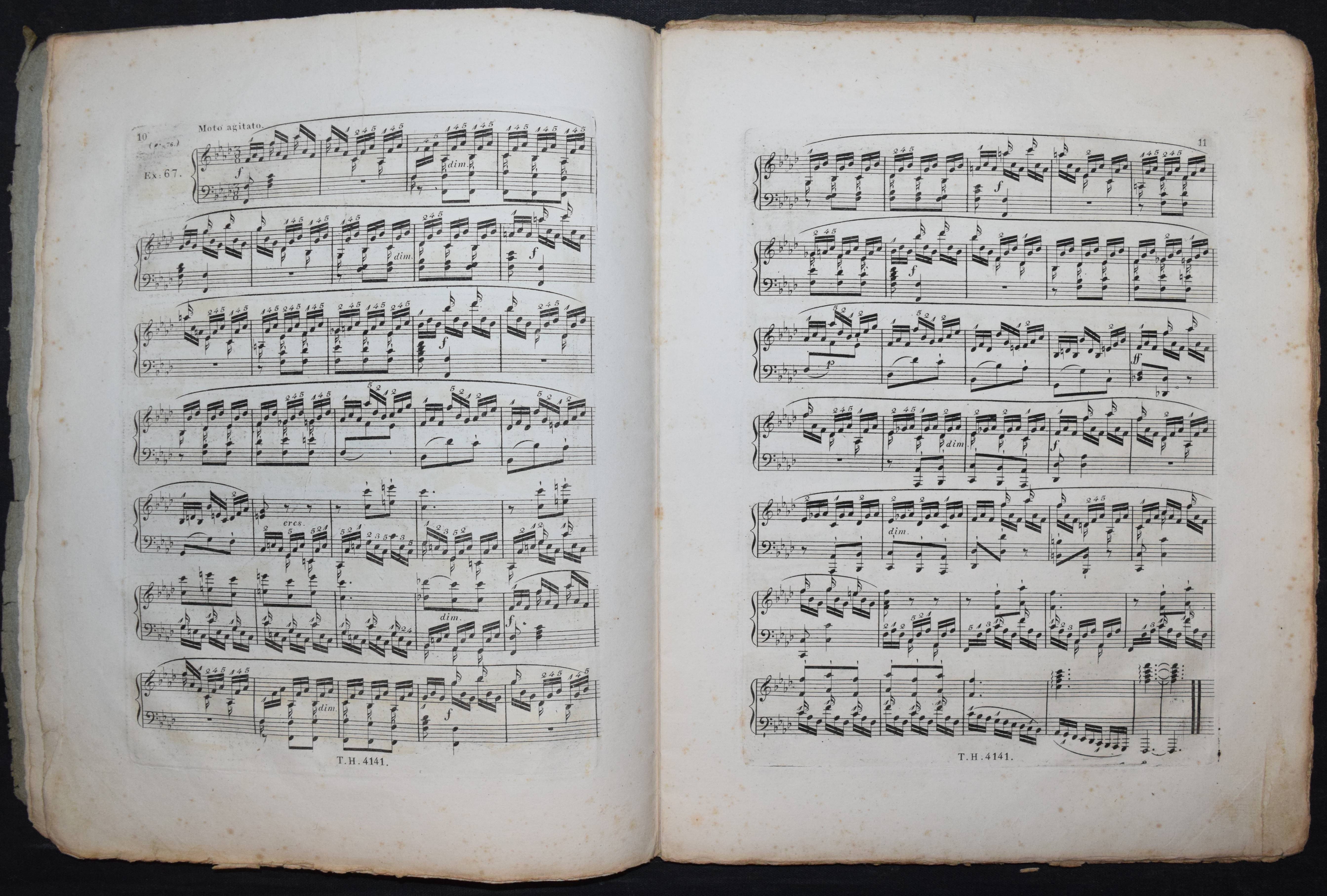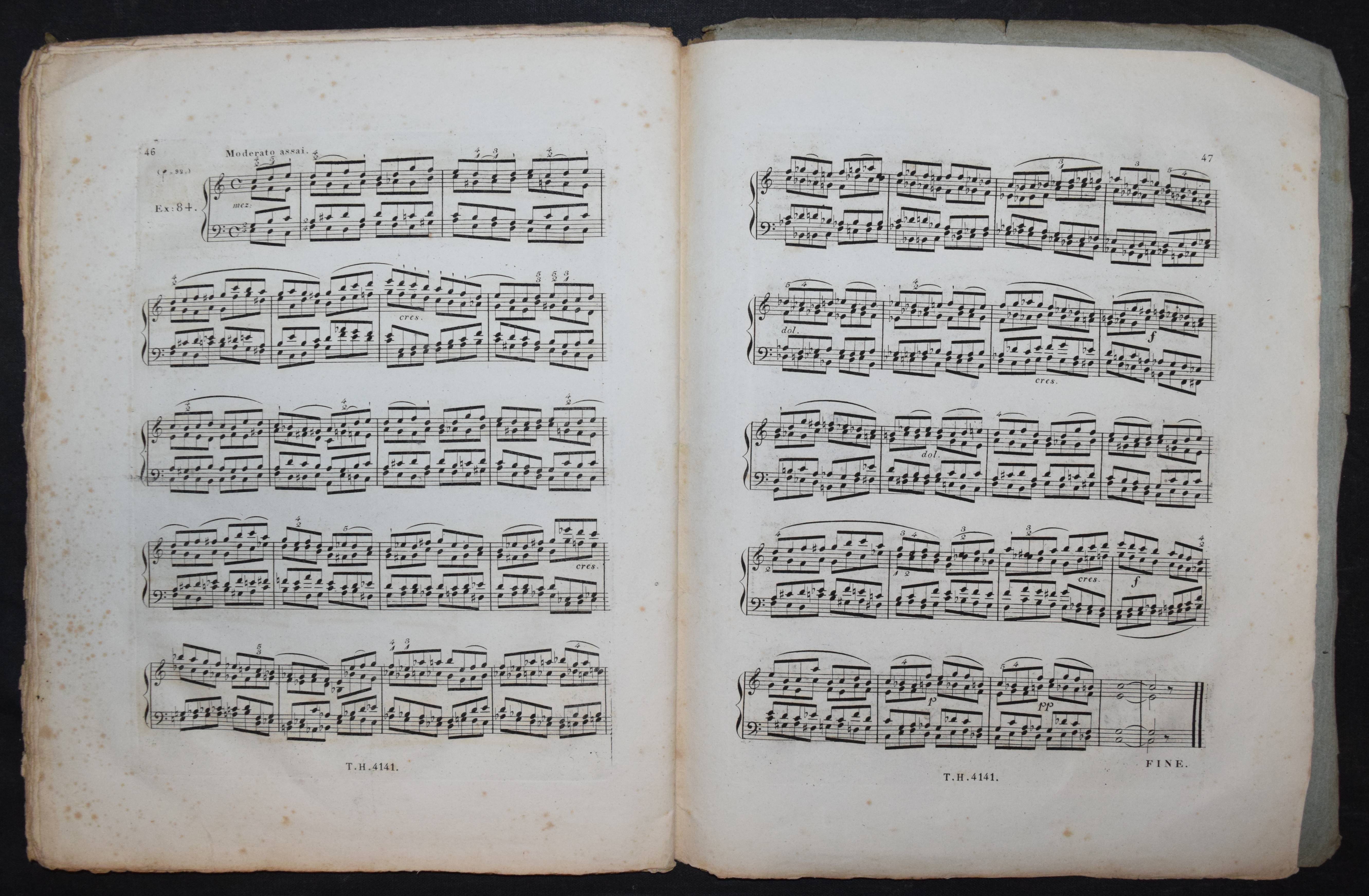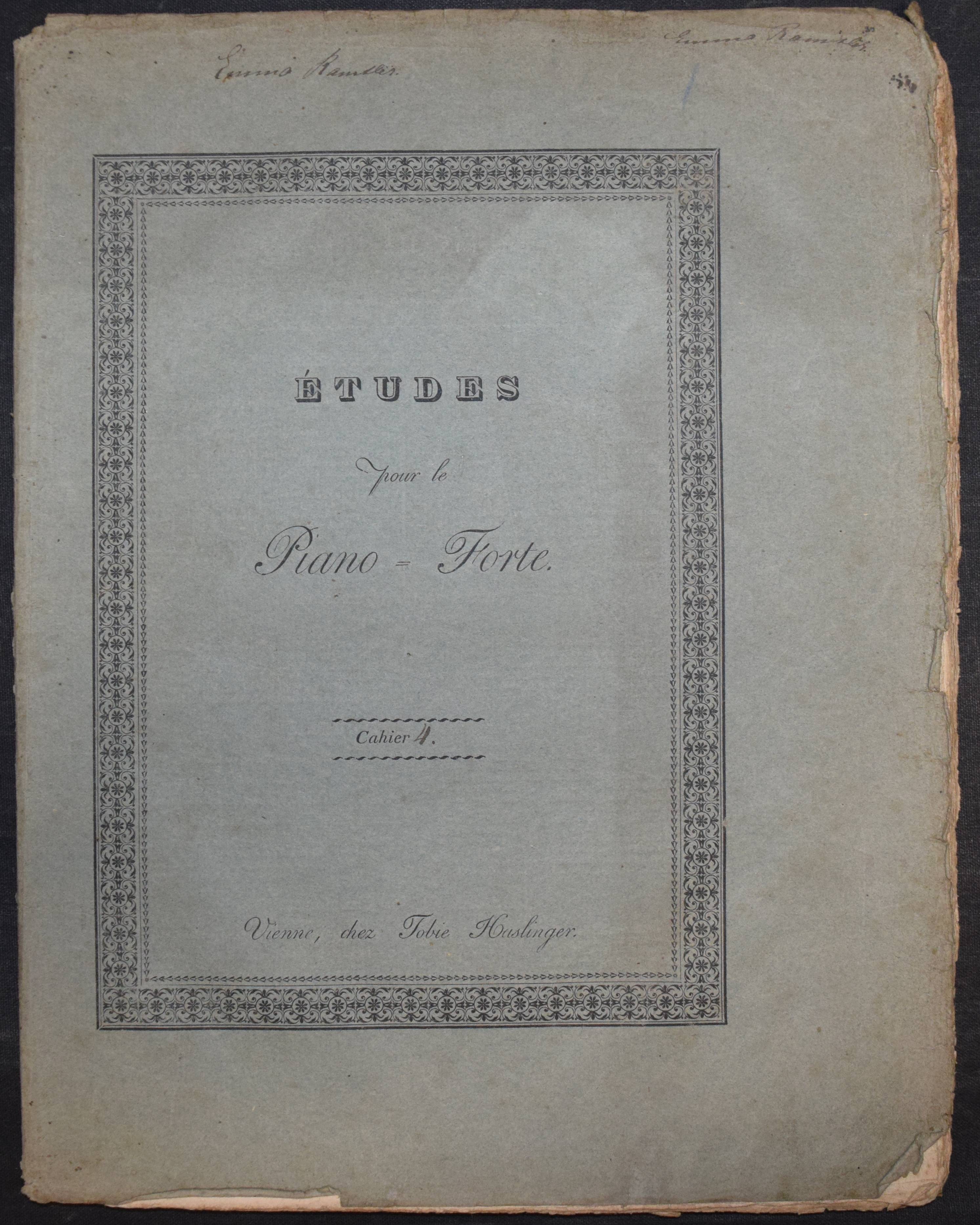 Cramer, J(ohann) B(aptist). Étude pour le piano-forte ou exercices dans les différens tons. Calculés pour faciliter les progrès de ceux qui se proposent d’étudier cet instrument à fond. Cahier 4 (von 4). Nouvelle édition éxacte avec le doigté corrigé et augmenté. Wien, Haslinger o. J. (um 1830). 4°. 47 S. mit gestoch. Titel u. gestoch. Musiknoten. Typogr. OBr. (Platten-Nr. 4141). Der vorliegende Band enthält die „Exercices“ oder Etuden Nr. 64-84. – Cramers Hauptwerk, die berühmte und sehr erfolgreiche Klavierschule erschien zuerst 1815 in Paris. – Umschlag etwas angestaubt, stockfleckig, sonst gutes Exemplar im seltenen Originalumschlag.