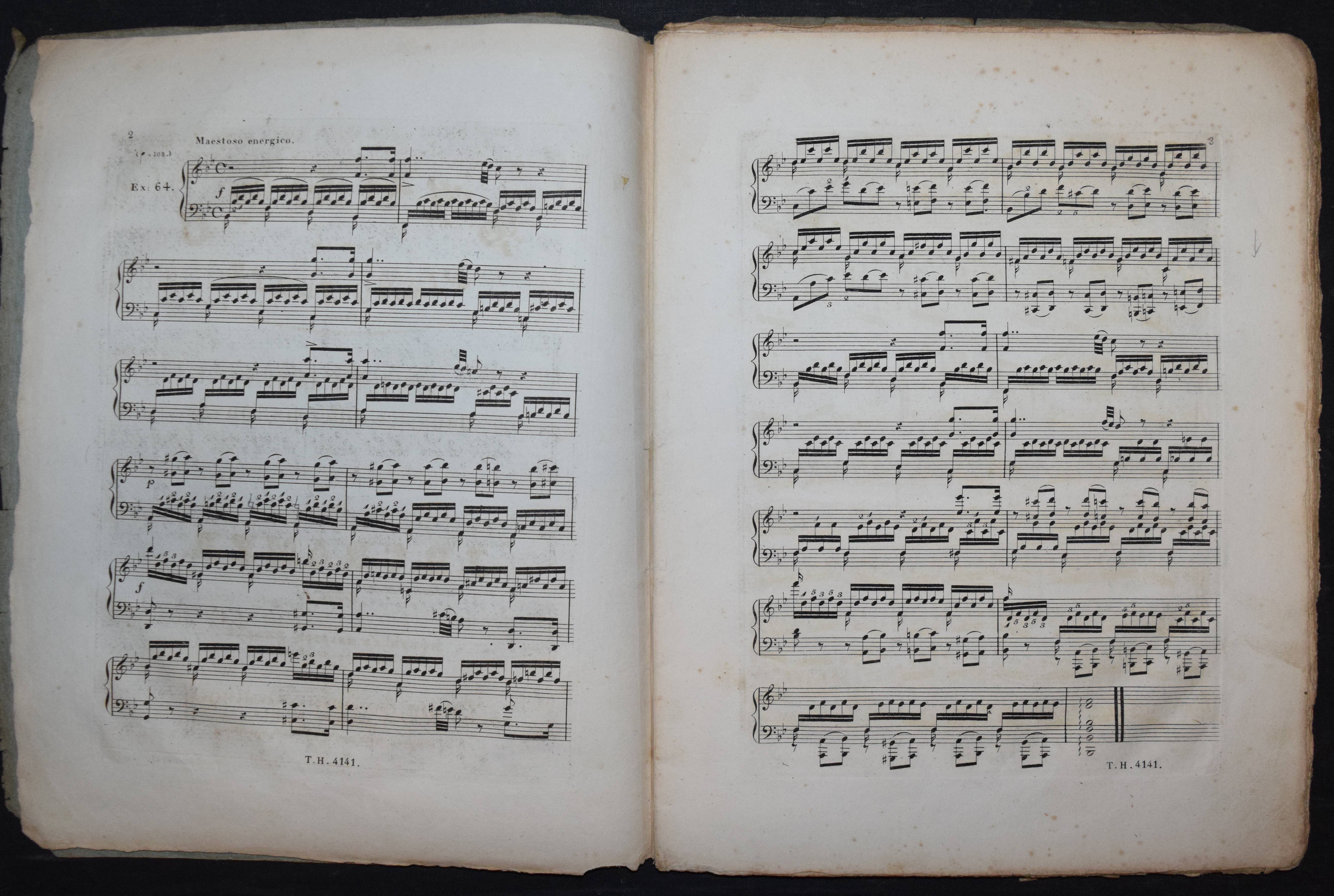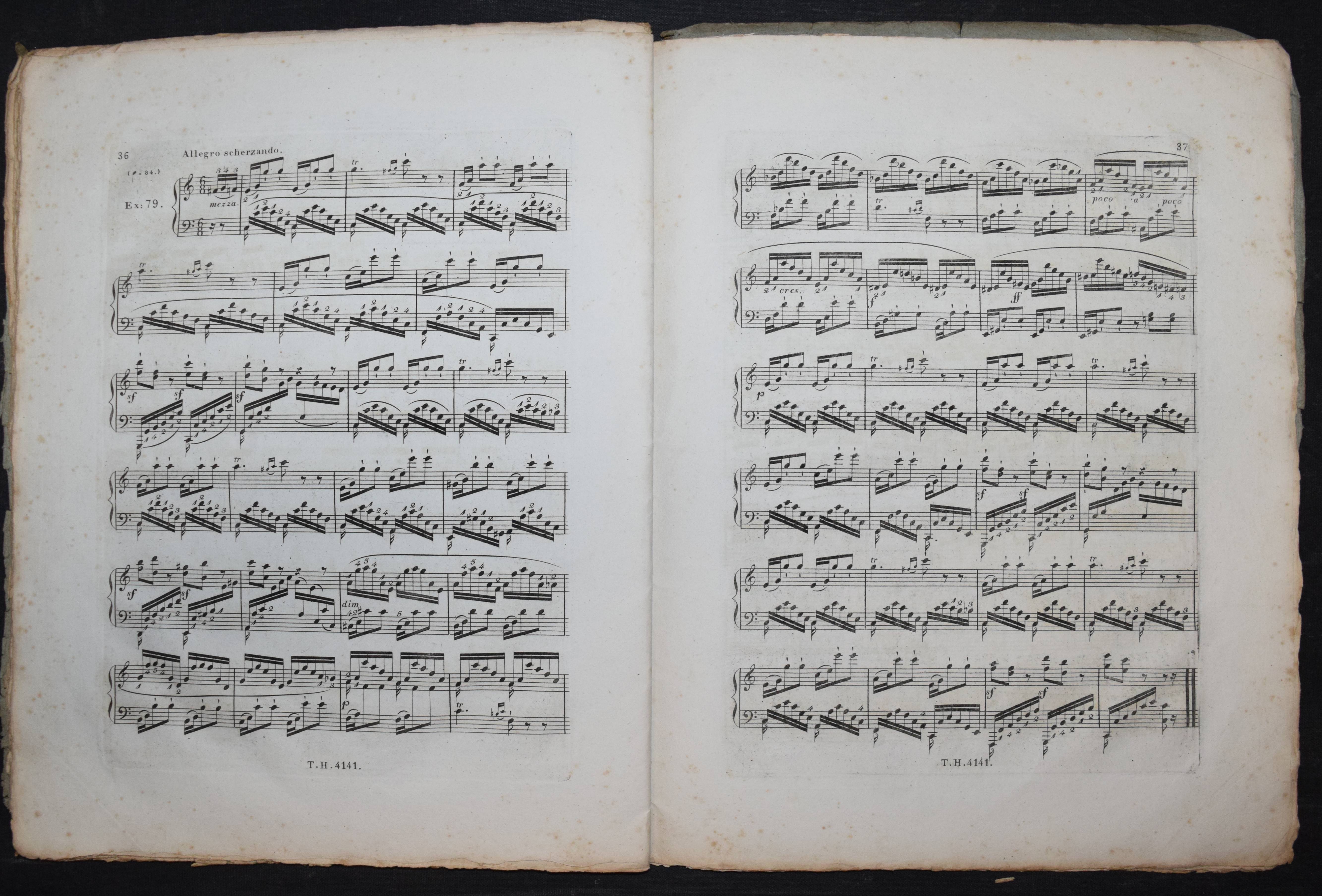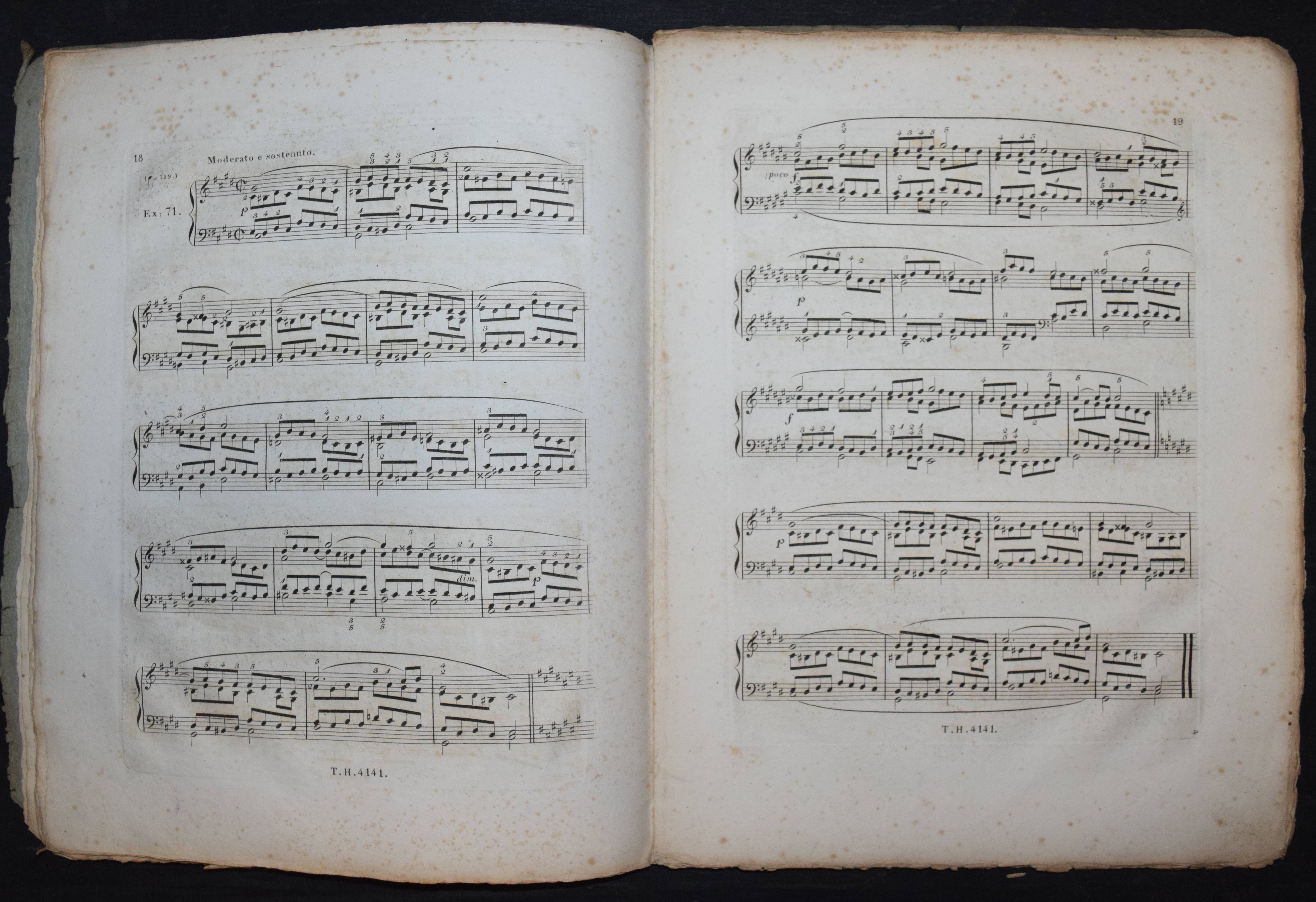 Cramer, J(ohann) B(aptist). Étude pour le piano-forte ou exercices dans les différens tons. Calculés pour faciliter les progrès de ceux qui se proposent d’étudier cet instrument à fond. Cahier 4 (von 4). Nouvelle édition éxacte avec le doigté corrigé et augmenté. Wien, Haslinger o. J. (um 1830). 4°. 47 S. mit gestoch. Titel u. gestoch. Musiknoten. Typogr. OBr. (Platten-Nr. 4141). Der vorliegende Band enthält die „Exercices“ oder Etuden Nr. 64-84. – Cramers Hauptwerk, die berühmte und sehr erfolgreiche Klavierschule erschien zuerst 1815 in Paris. – Umschlag etwas angestaubt, stockfleckig, sonst gutes Exemplar im seltenen Originalumschlag.