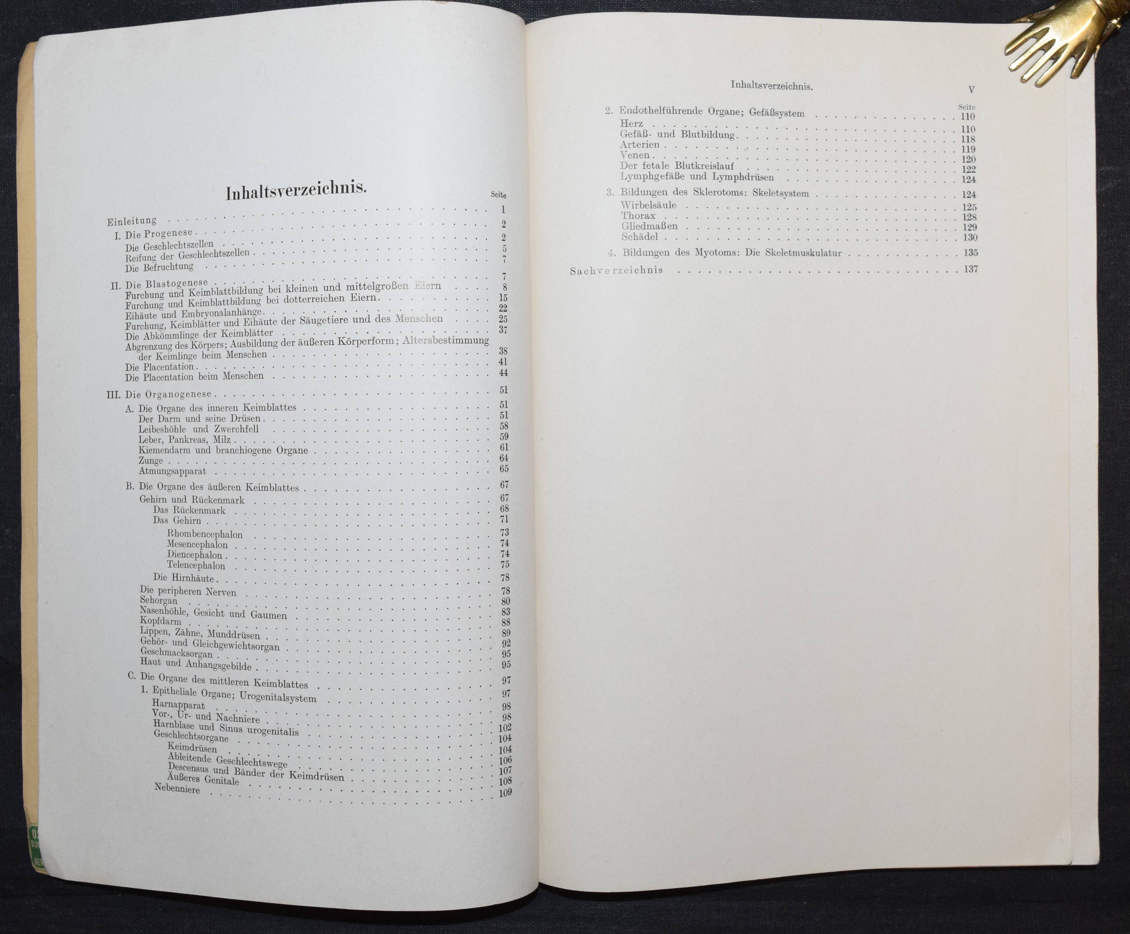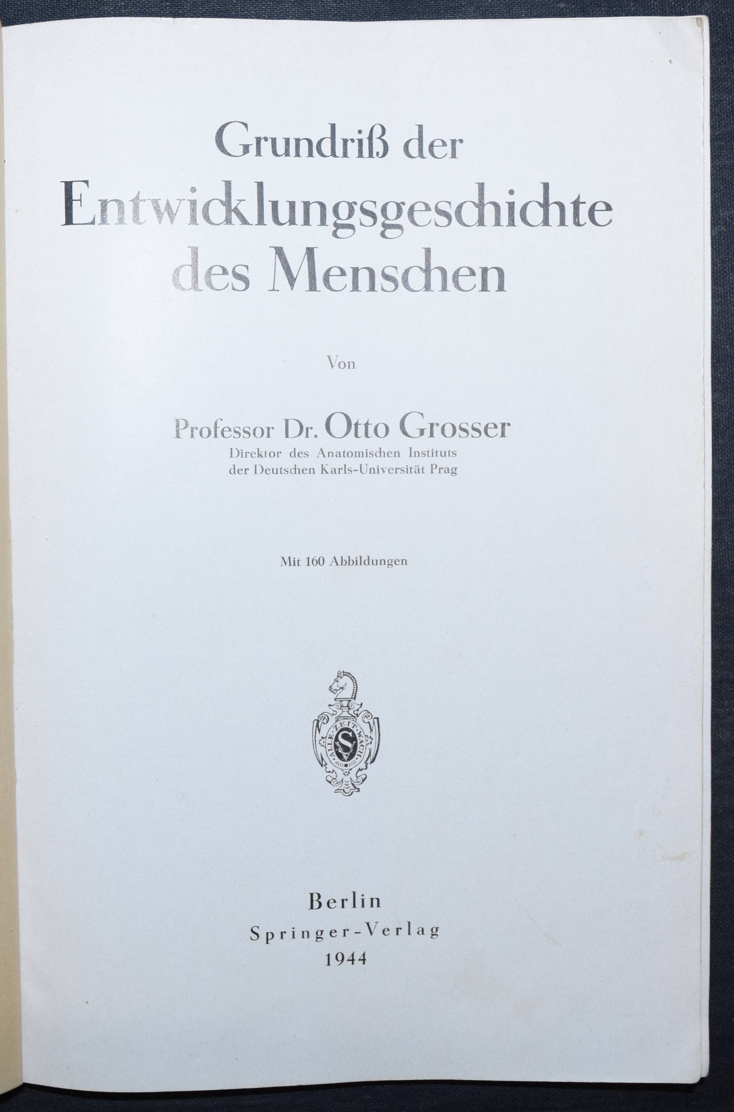 Grosser, Otto. Grundriss der Entwicklungsgeschichte des Menschen. Berlin, Springer 1944. Gr.-8°. V, 143 S zahlr. Abb. OKart. Einband geringf. fl. u. angestaubt, Rücken am Fuß u. Kapital etwas beschädigt., sonst gut erhalten.
