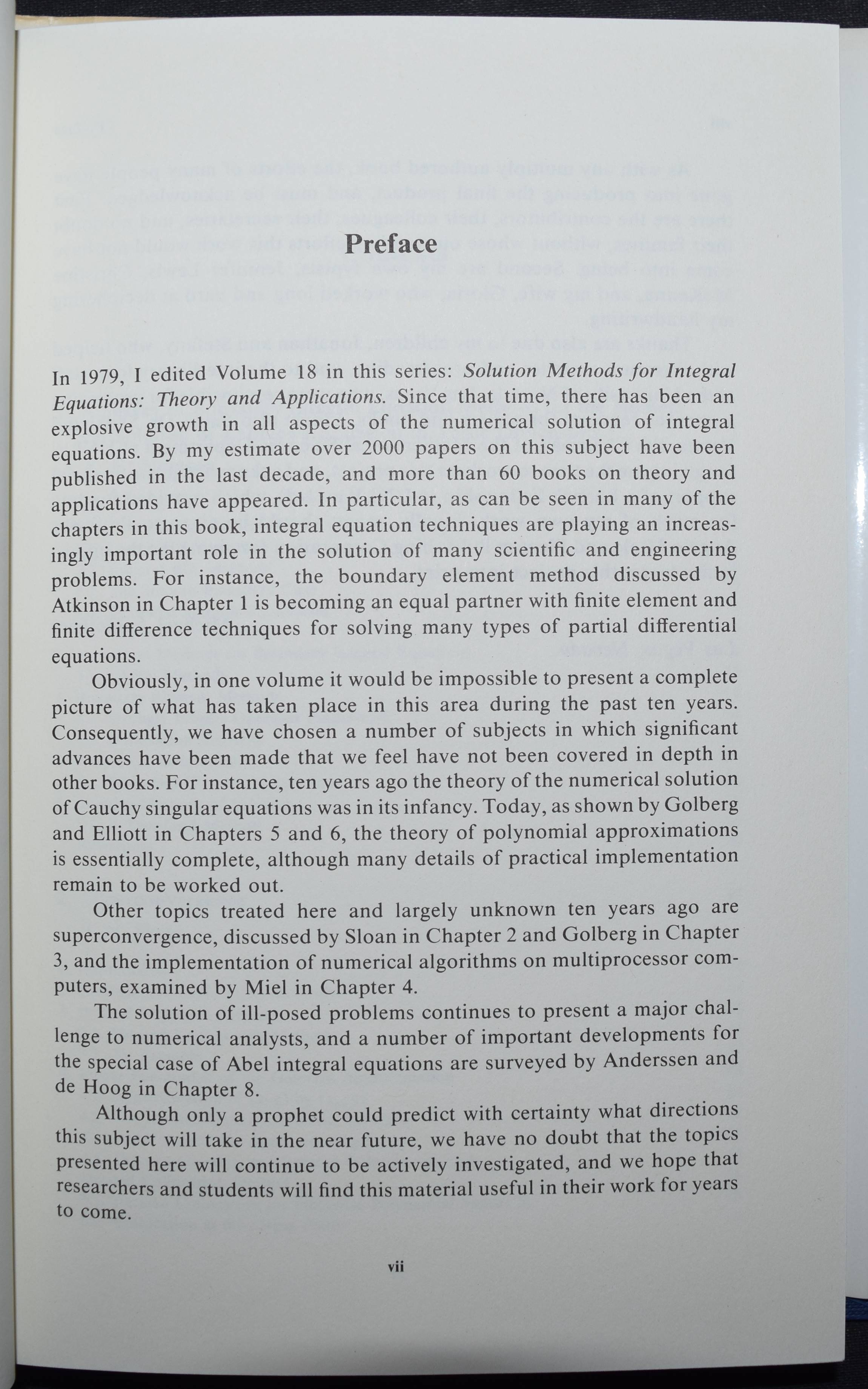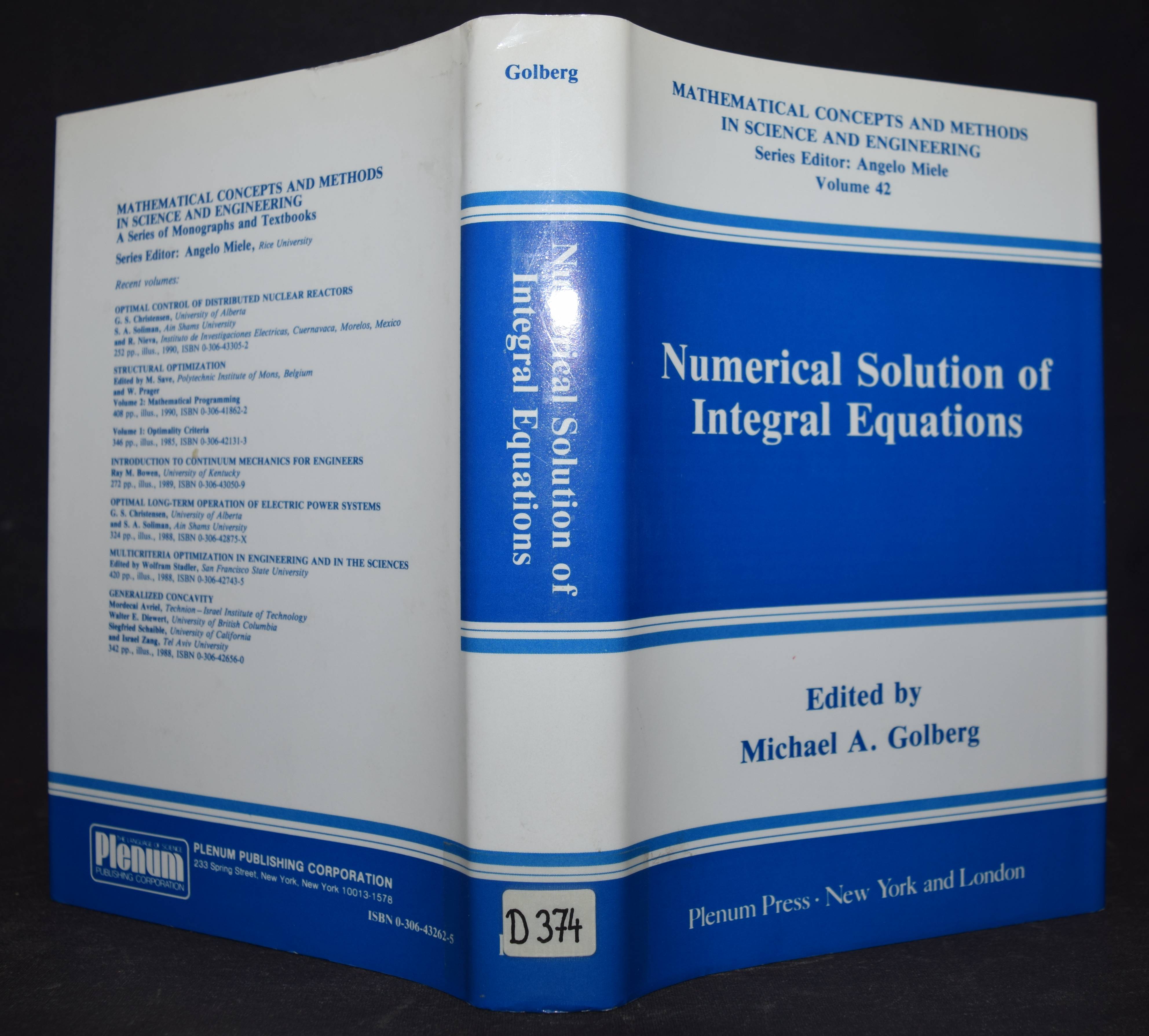 Golberg, Michael A. Numerical solution of integral equations. New York [u.a.], Plenum Press 1990. Gr.-8°. XIII, 417 S. OLn. mit OU. (Mathematical concepts and methods in science and engineering Bd. 42). Einband etwas berieben. Rücken und Schutzumschlag mit Bibliothekssign. u. St. a. T., sonst sehr gutes Exemplar.