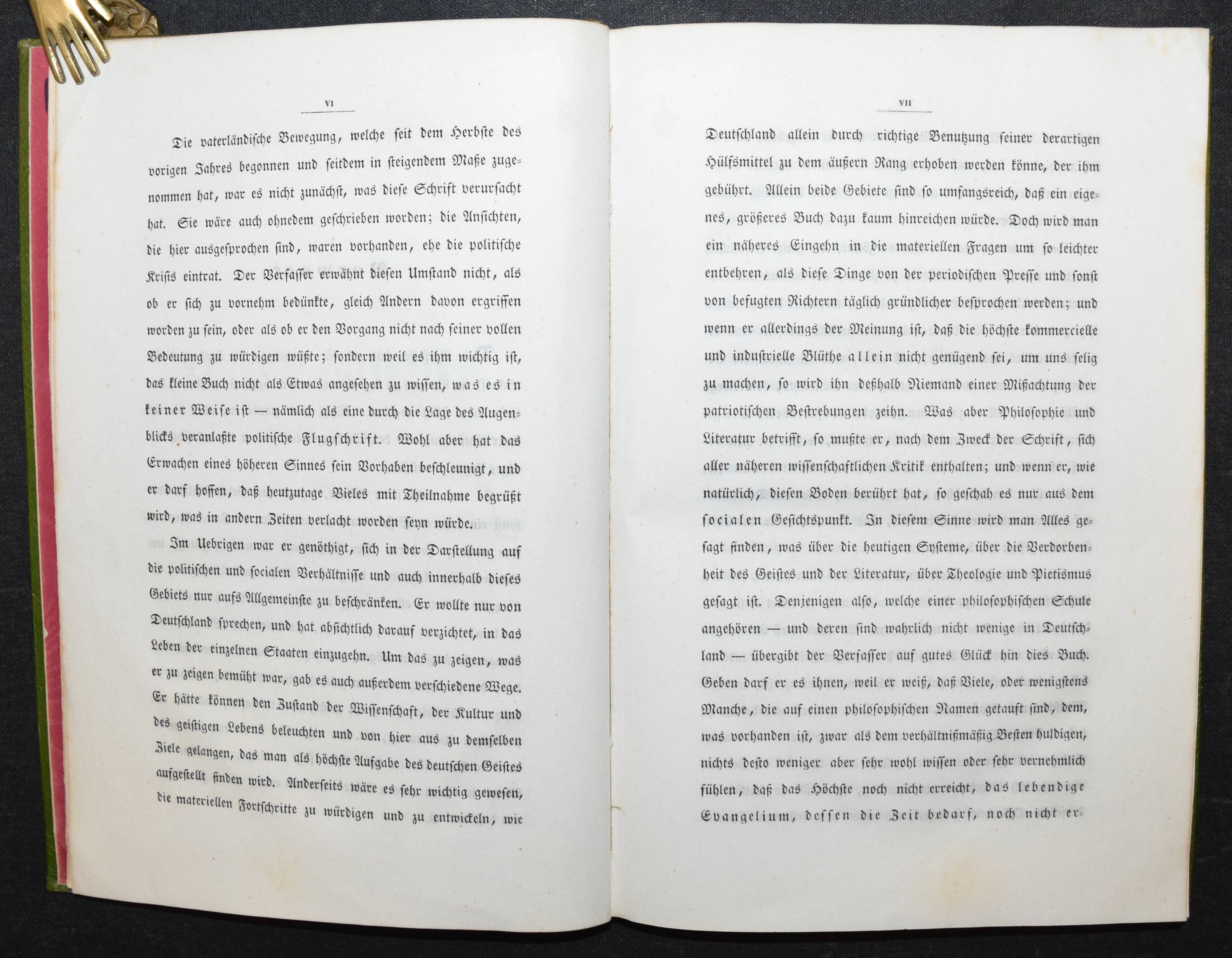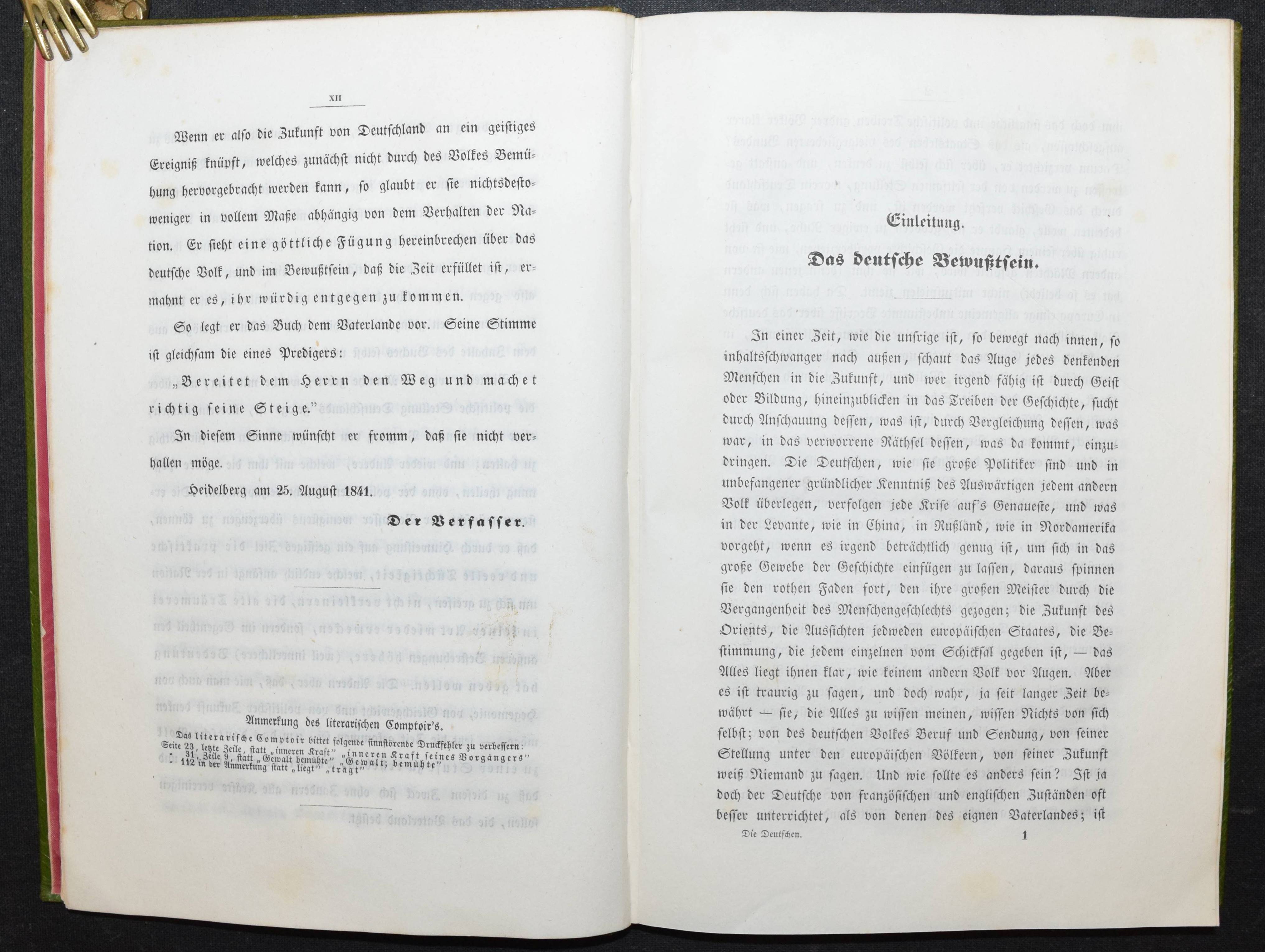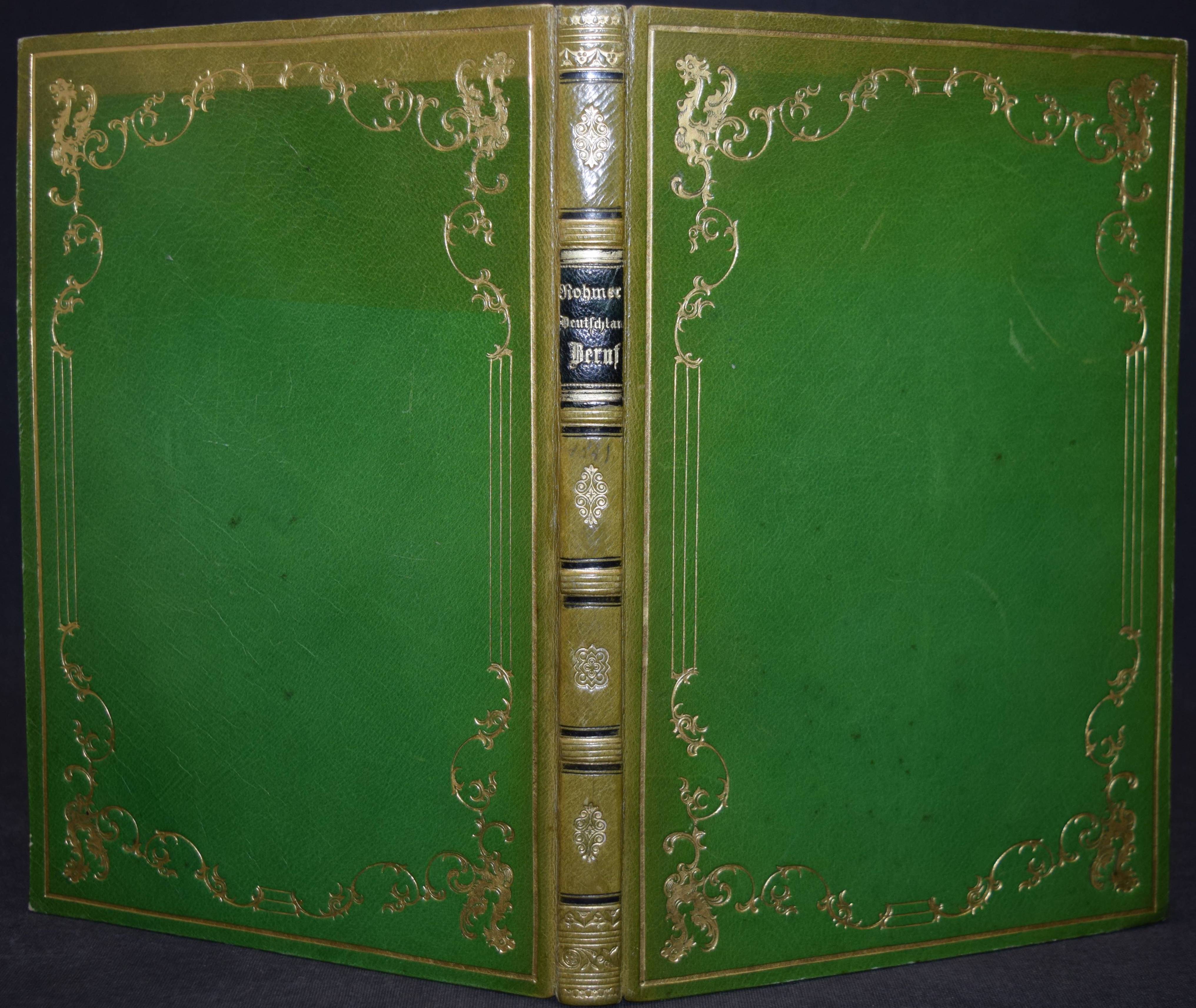 Rohmer, Theodor. Deutschlands Beruf in der Gegenwart und Zukunft. Zürich u. Winterthur, Verlag des literarischen Comptoirs 1841. 8°. XII, 220 S. Grüner Maroquin-Einband d. Zt. mit goldgepr. Rückenschild u. dekorativer Romantikerverg. Slg. Friedländer S. 33. Keller S. 178. Näf S. 21 ff. Ziegenfuss II, 368. – Erste Ausgabe der seltenen Arbeit des bekannten mystisch-politischen Schriftstellers, Philosophen und Psychologen T. Rohmer (1820-1856). Rohmer war wie sein älterer Bruder, dem Politiker und Philosophen F. Rohmer (1814-1856) mit den Politikern Johann Caspar Bluntschli und Heinrich Schultheß befreundet und hat Zeit seines Lebens mit seinem Bruder zusammengearbeitet. – „Im J. 1841 glaubte er mit den Grundzügen seiner Psychologie im Reinen zu sein, deren schriftliche Darlegung sein jüngerer Bruder Theodor übernehmen sollte, welcher überhaupt mehrfach als Verkündiger der Ideen Friedrich’s auftrat. So erscheint Theodor äußerlich auch als Verfasser der von Friedrich inspirirten Schrift: „Deutschlands Beruf in der Gegenwart und Zukunft“ (1841, 2. Auflage 1847), in welcher neben phantastischen Geschichtsbetrachtungen und mystischen Erörterungen über das Wesen Gottes die messianischen Tendenzen Friedrich’s mit jugendlicher Begeisterung kundgegeben werden; gleichzeitig enthält ein Aufsatz Theodor’s: „Die Hoffnung unserer Zeit“ (in der deutschen Vierteljahrsschrift) die Messiashoffnungen seines Bruders. Noch im J. 1841 ging Friedrich R. nach Zürich, wo er mit Bluntschli und der von demselben geleiteten liberal-conservativen Partei in Verbindung trat und lebhaften Antheil am „Beobachter aus der östlichen Schweiz“ bethätigte. Da es ihm an Subsistenzmitteln gebrach und er von stillen Beiträgen seiner Freunde leben mußte, suchte er eine Annäherung an Jul. Fröbel, welcher damals Eigenthümer des Literarischen Comptoirs war, indem er glaubte, durch Veröffentlichung seiner Psychologie ein einträgliches Geschäft zu machen“ (C. v. Prantl in ADB XXIX, 57 im Beitrag über Friedrich Rohmer). – Rücken u. oberer Rand der Deckel etwas aufgehellt, sehr schönes sauberes Exemplar in einem außergewöhnlichen zeitgenöss. Einband.