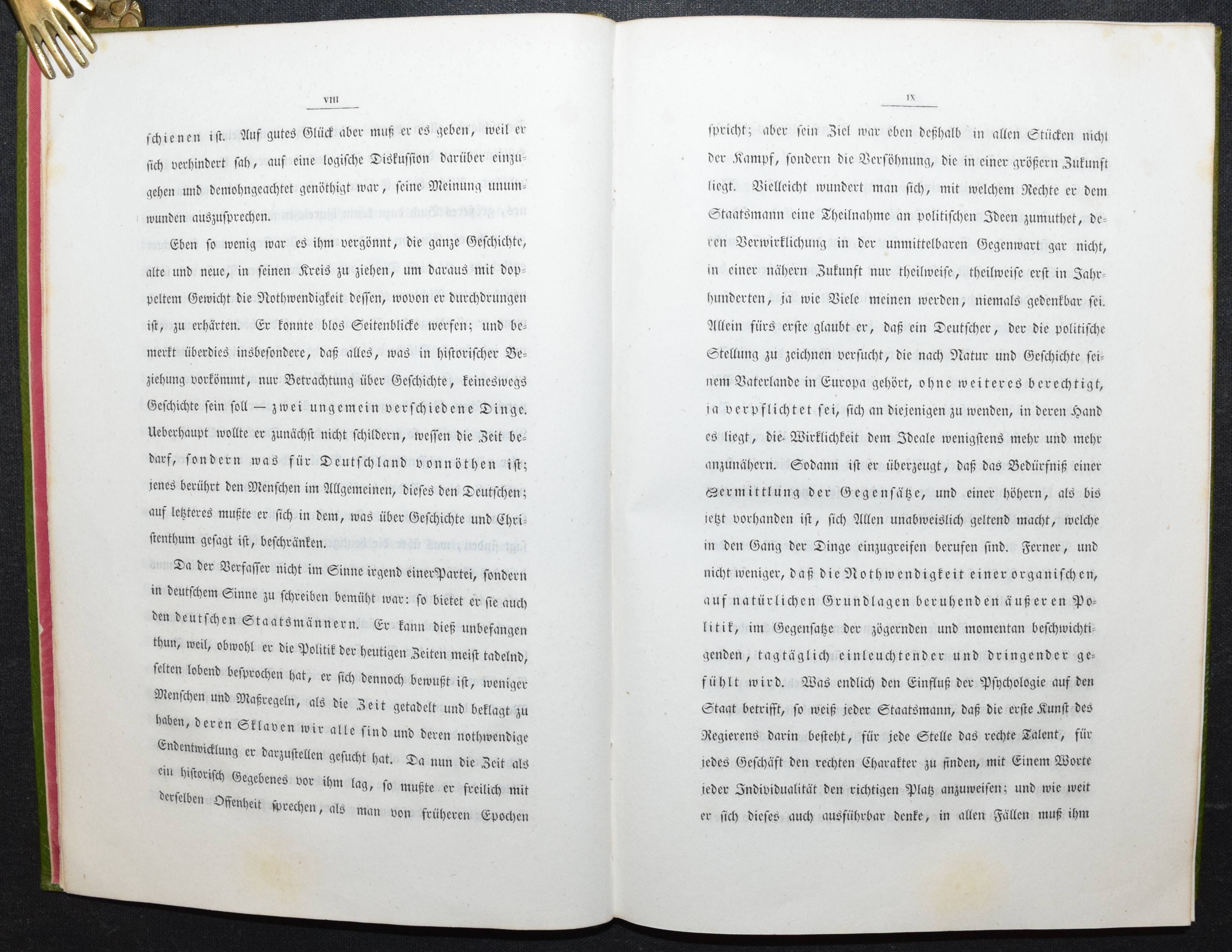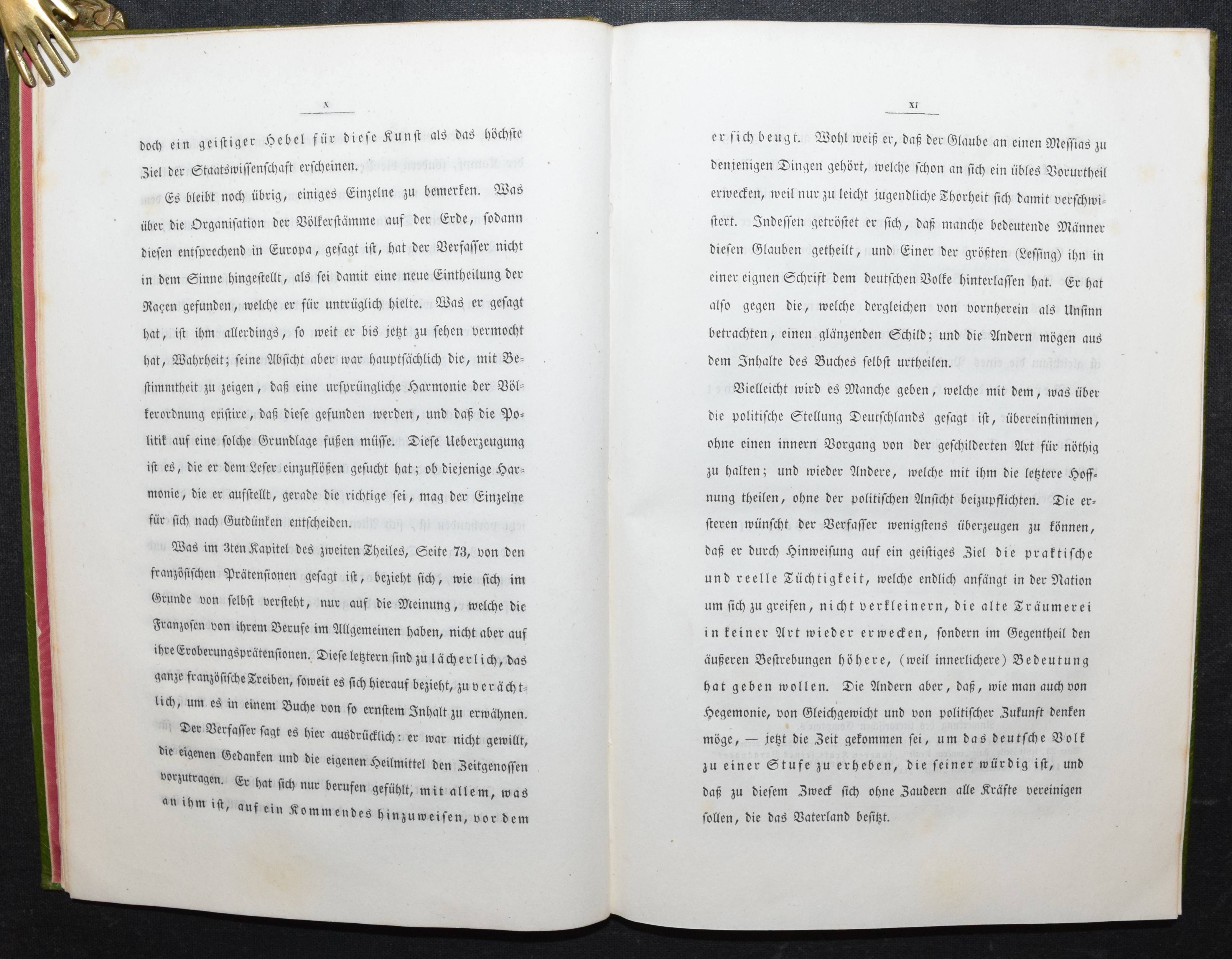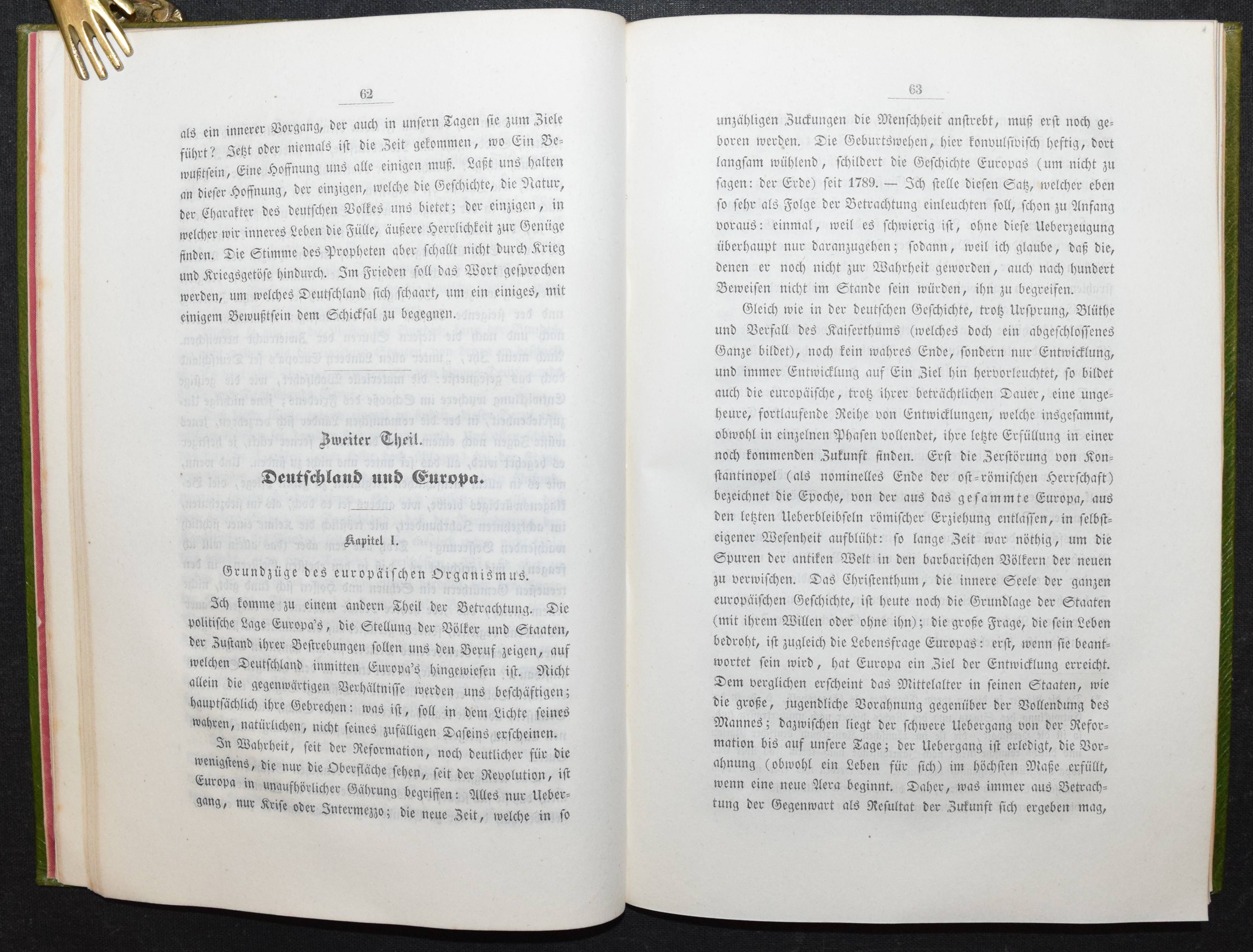 Rohmer, Theodor. Deutschlands Beruf in der Gegenwart und Zukunft. Zürich u. Winterthur, Verlag des literarischen Comptoirs 1841. 8°. XII, 220 S. Grüner Maroquin-Einband d. Zt. mit goldgepr. Rückenschild u. dekorativer Romantikerverg. Slg. Friedländer S. 33. Keller S. 178. Näf S. 21 ff. Ziegenfuss II, 368. – Erste Ausgabe der seltenen Arbeit des bekannten mystisch-politischen Schriftstellers, Philosophen und Psychologen T. Rohmer (1820-1856). Rohmer war wie sein älterer Bruder, dem Politiker und Philosophen F. Rohmer (1814-1856) mit den Politikern Johann Caspar Bluntschli und Heinrich Schultheß befreundet und hat Zeit seines Lebens mit seinem Bruder zusammengearbeitet. – „Im J. 1841 glaubte er mit den Grundzügen seiner Psychologie im Reinen zu sein, deren schriftliche Darlegung sein jüngerer Bruder Theodor übernehmen sollte, welcher überhaupt mehrfach als Verkündiger der Ideen Friedrich’s auftrat. So erscheint Theodor äußerlich auch als Verfasser der von Friedrich inspirirten Schrift: „Deutschlands Beruf in der Gegenwart und Zukunft“ (1841, 2. Auflage 1847), in welcher neben phantastischen Geschichtsbetrachtungen und mystischen Erörterungen über das Wesen Gottes die messianischen Tendenzen Friedrich’s mit jugendlicher Begeisterung kundgegeben werden; gleichzeitig enthält ein Aufsatz Theodor’s: „Die Hoffnung unserer Zeit“ (in der deutschen Vierteljahrsschrift) die Messiashoffnungen seines Bruders. Noch im J. 1841 ging Friedrich R. nach Zürich, wo er mit Bluntschli und der von demselben geleiteten liberal-conservativen Partei in Verbindung trat und lebhaften Antheil am „Beobachter aus der östlichen Schweiz“ bethätigte. Da es ihm an Subsistenzmitteln gebrach und er von stillen Beiträgen seiner Freunde leben mußte, suchte er eine Annäherung an Jul. Fröbel, welcher damals Eigenthümer des Literarischen Comptoirs war, indem er glaubte, durch Veröffentlichung seiner Psychologie ein einträgliches Geschäft zu machen“ (C. v. Prantl in ADB XXIX, 57 im Beitrag über Friedrich Rohmer). – Rücken u. oberer Rand der Deckel etwas aufgehellt, sehr schönes sauberes Exemplar in einem außergewöhnlichen zeitgenöss. Einband.
