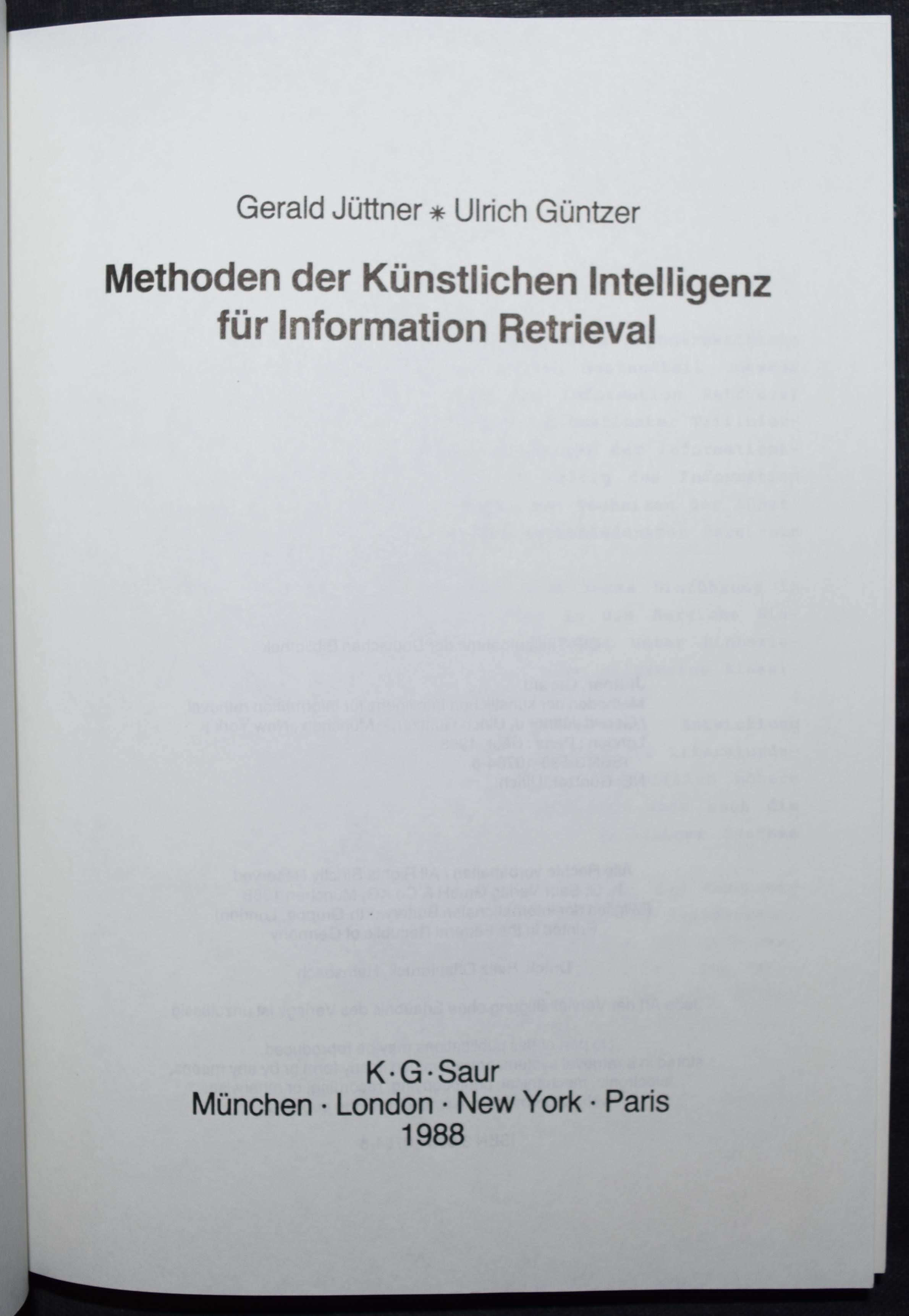 Jüttner, Gerald u. Ulrich Güntzer. Methoden der künstlichen Intelligenz für information retrieval. München [u.a.], Saur 1988. 8°. 254 S. mit zahlr. Diagrammen. OPbd. mit OU. Sehr gutes Exemplar.