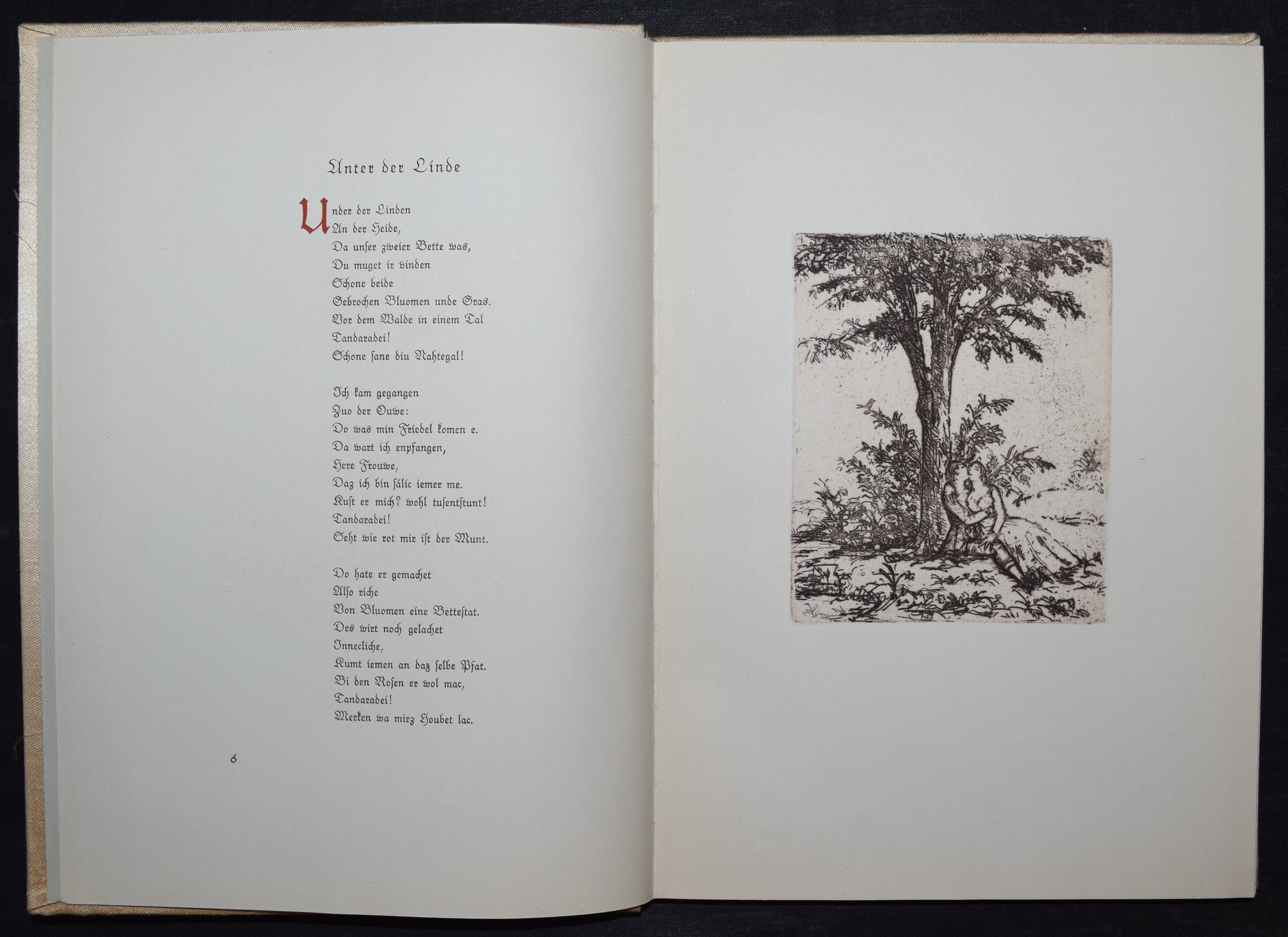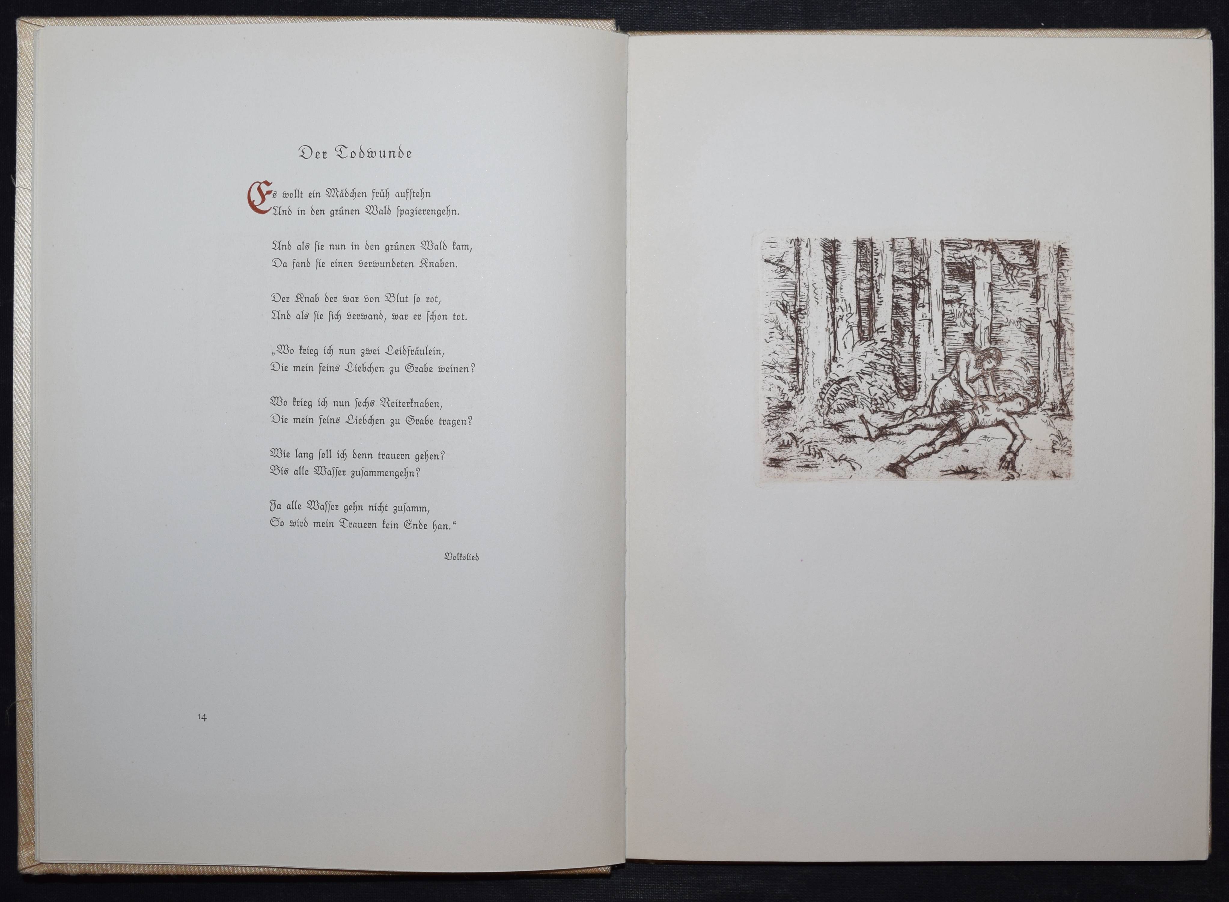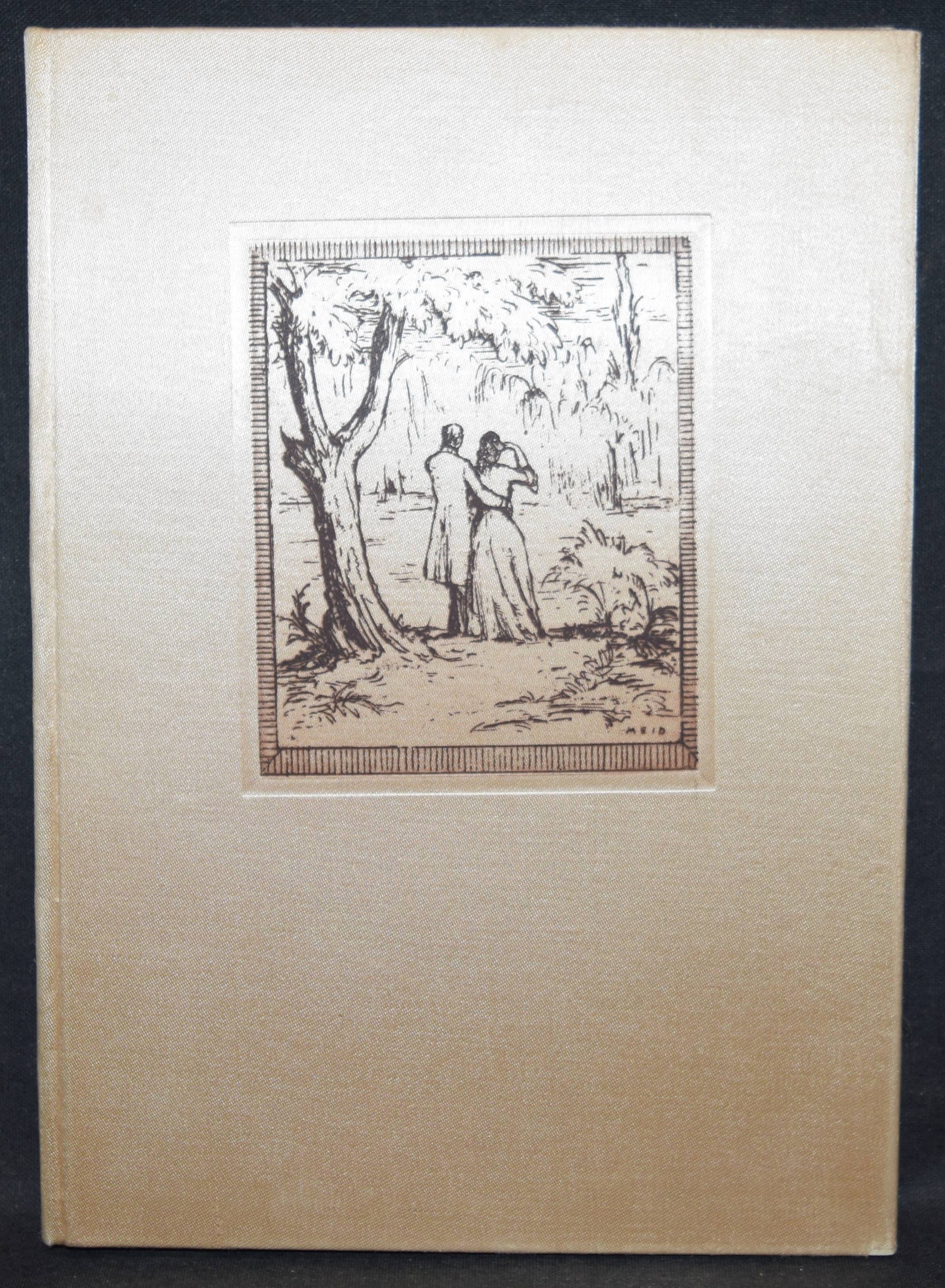 Fischer, Hans W. (Hrsg.). Das tönende Herz. Eine Auslese deutscher Gedichte vom Mittelalter bis zur Gegenwart. Gesammelt und mit einem Nachwort versehen. Mit acht Originalradierungen von Hans Meid. Berlin, Deutsche Buchgemeinschaft o. J. (1931). 4°. 107 (1) S. 2 Bl. mit 8 Orig.-Radierungen. Beigefarb. Orig-Seidenband mit Orig.-Radierung als Deckelbild in Orig.-Pappschuber. (Liebhaber-Drucke, Band 1). Jentsch 560-568b. – Text in Rot und Schwarz gedruckt, die Radierungen in Sepia in der Pan-Presse, Berlin gedruckt. – Schönes Exemplar.