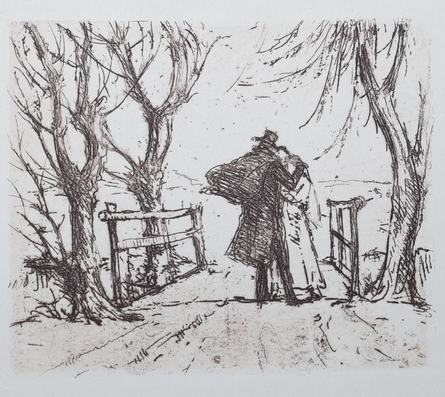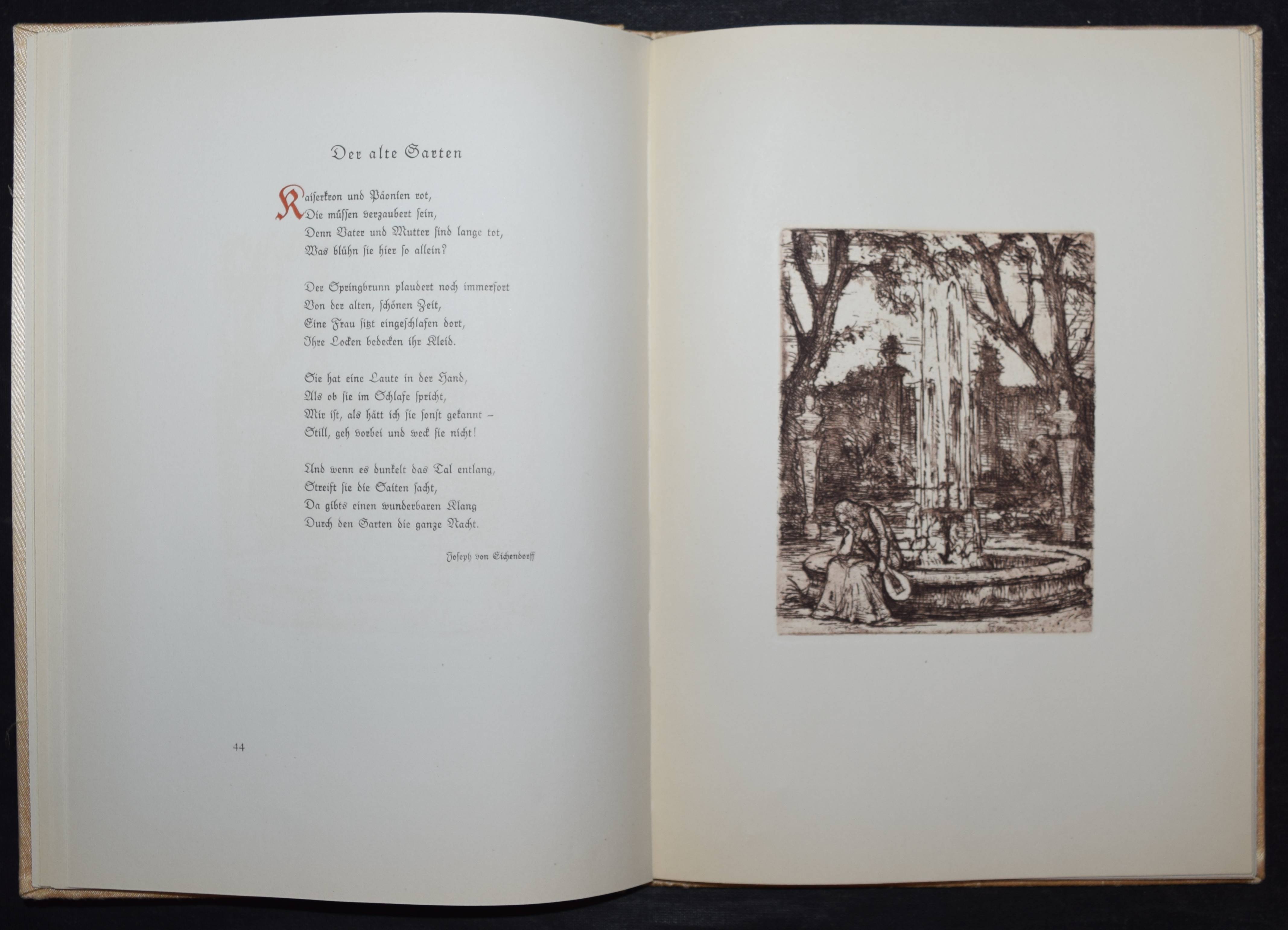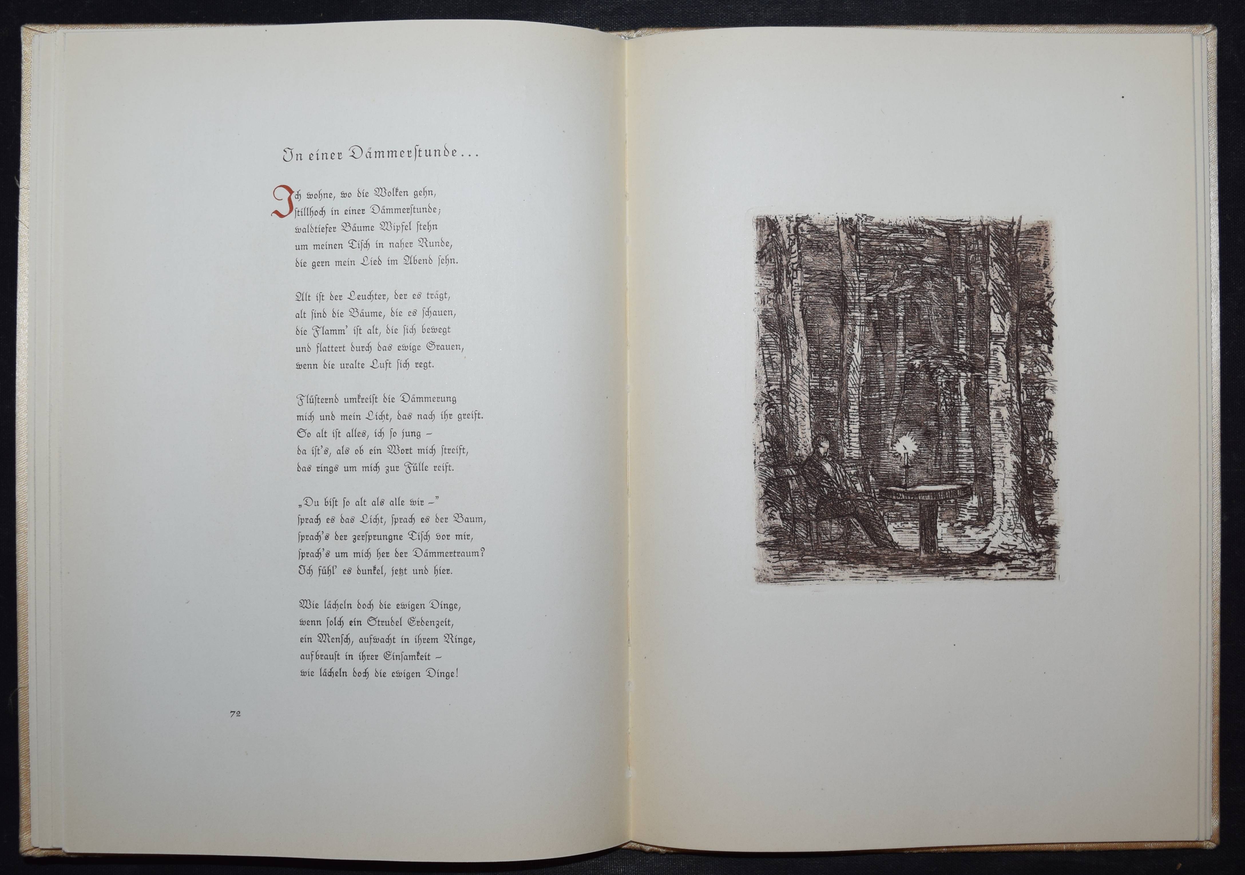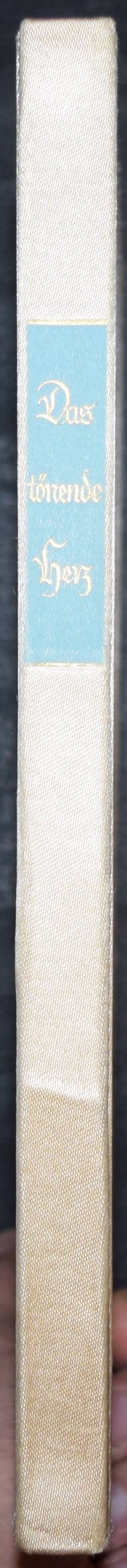 Fischer, Hans W. (Hrsg.). Das tönende Herz. Eine Auslese deutscher Gedichte vom Mittelalter bis zur Gegenwart. Gesammelt und mit einem Nachwort versehen. Mit acht Originalradierungen von Hans Meid. Berlin, Deutsche Buchgemeinschaft o. J. (1931). 4°. 107 (1) S. 2 Bl. mit 8 Orig.-Radierungen. Beigefarb. Orig-Seidenband mit Orig.-Radierung als Deckelbild in Orig.-Pappschuber. (Liebhaber-Drucke, Band 1). Jentsch 560-568b. – Text in Rot und Schwarz gedruckt, die Radierungen in Sepia in der Pan-Presse, Berlin gedruckt. – Schönes Exemplar.