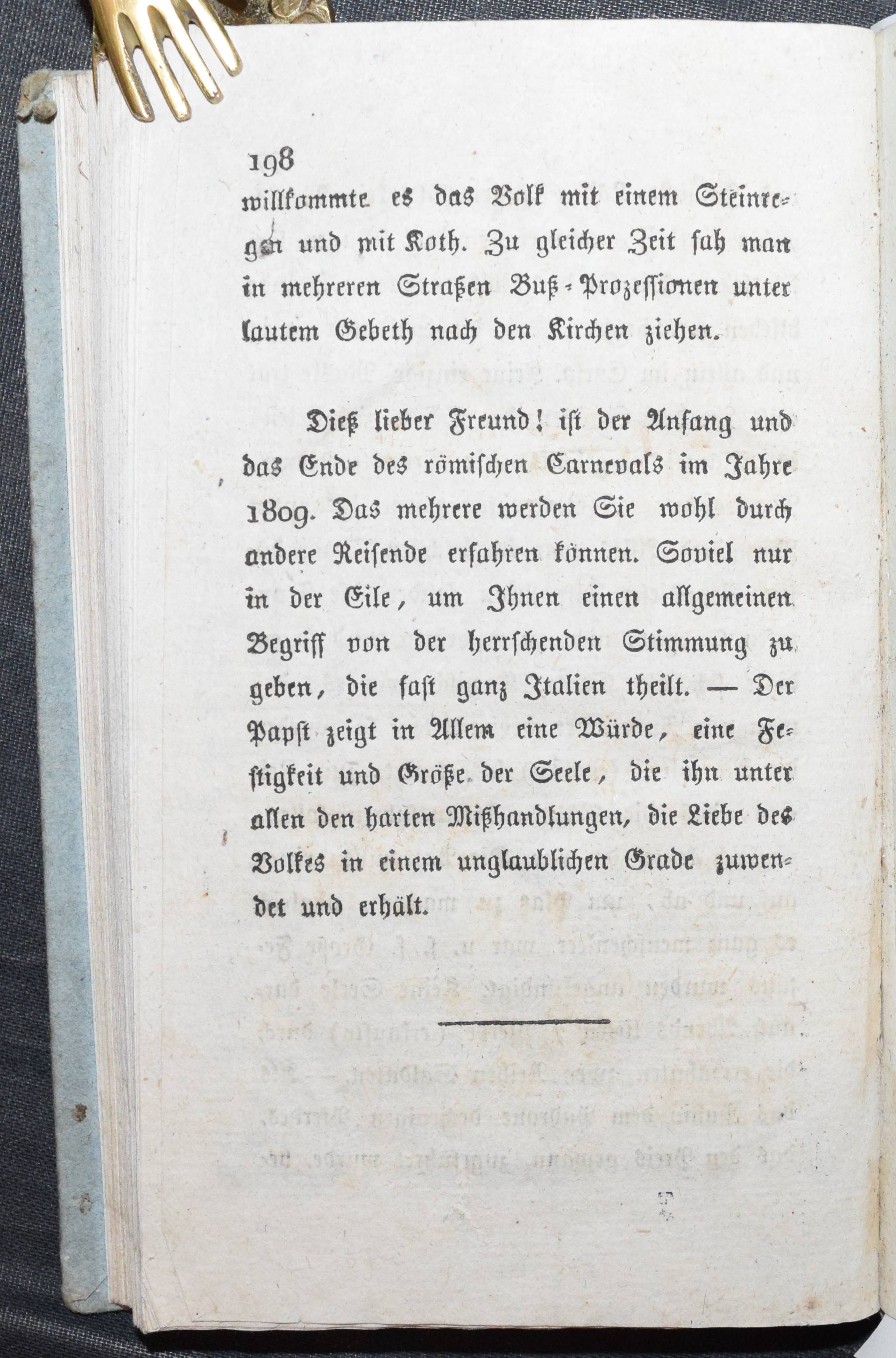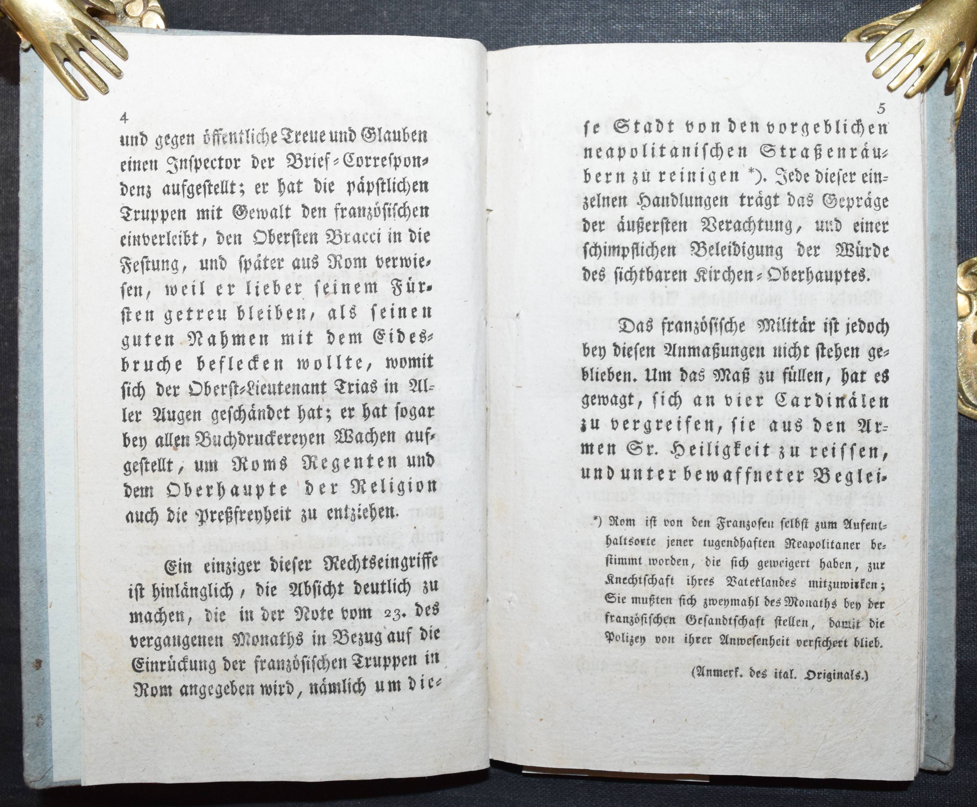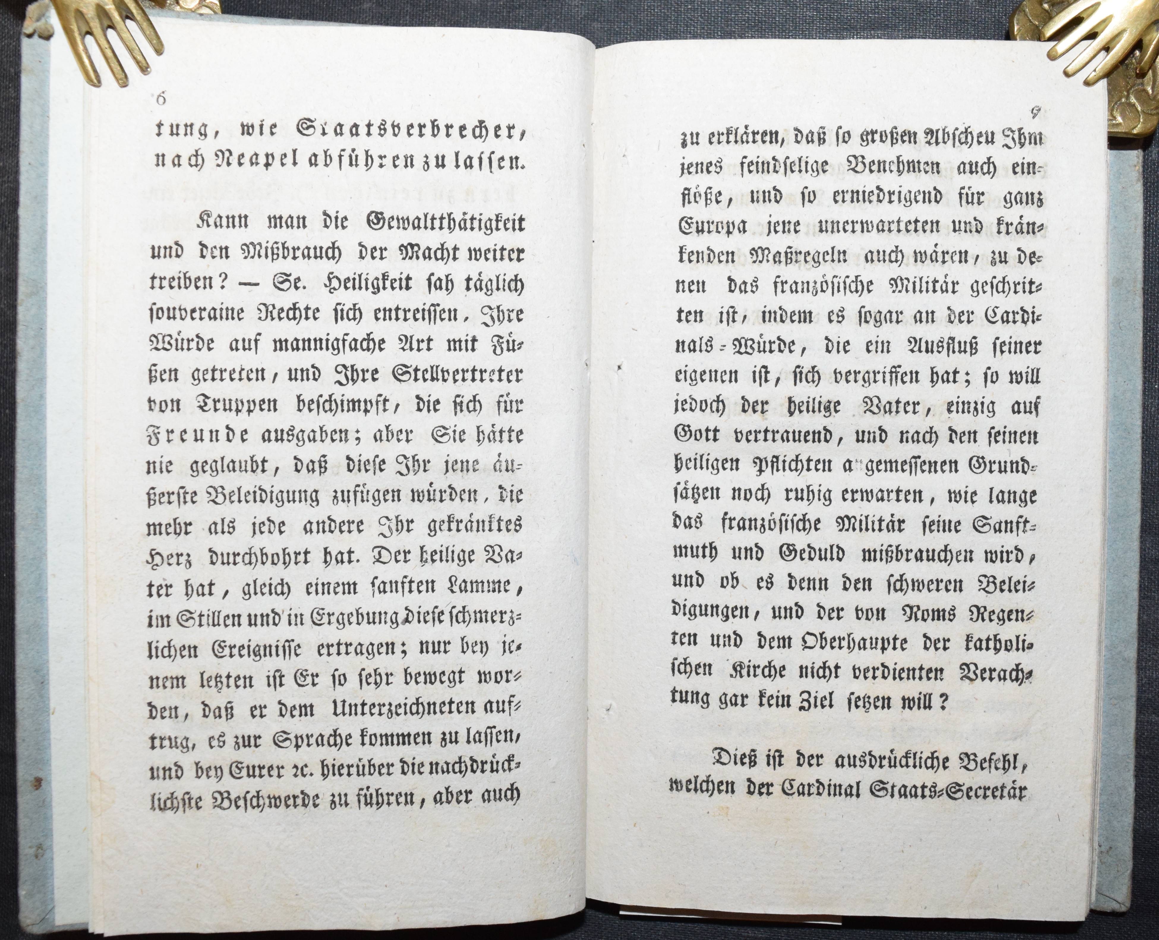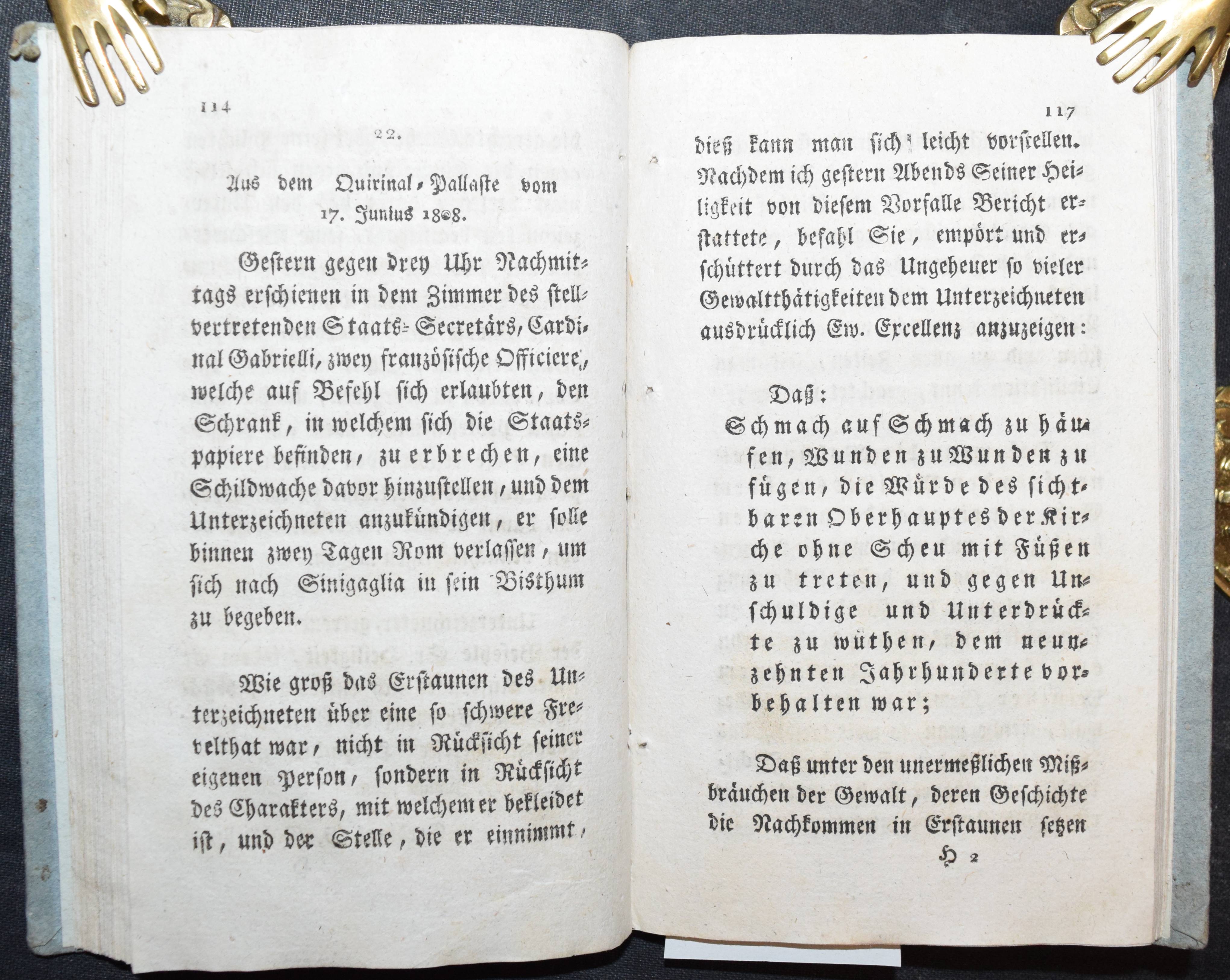 (Hormayr zu Hortenburg, Joseph v.). Correspondenz zwischen dem römischen und französisch-kaiserlichen Hofe. Germanien [i.e. Tübingen], 1808 [eig. 1809]. 8°. 198 S. Interims-Pbd. d. Zt. Holzmann-Bohatta VII, 2488. Vgl. Weller Druckorte I, 208 (Ausg. mit leicht abweichendem Titel bei Cotta in Tübingen). Nicht bei Goed. – Erste Ausgabe. – Diplomatische Auseinandersetzung über die negativen Folgen der Besetzung Roms durch Napoleon für Pius VII. und den Kirchenstaat. – Einband fleckig, zeitgenöss. Besitzvermerk a. T., sonst gut erhalten.