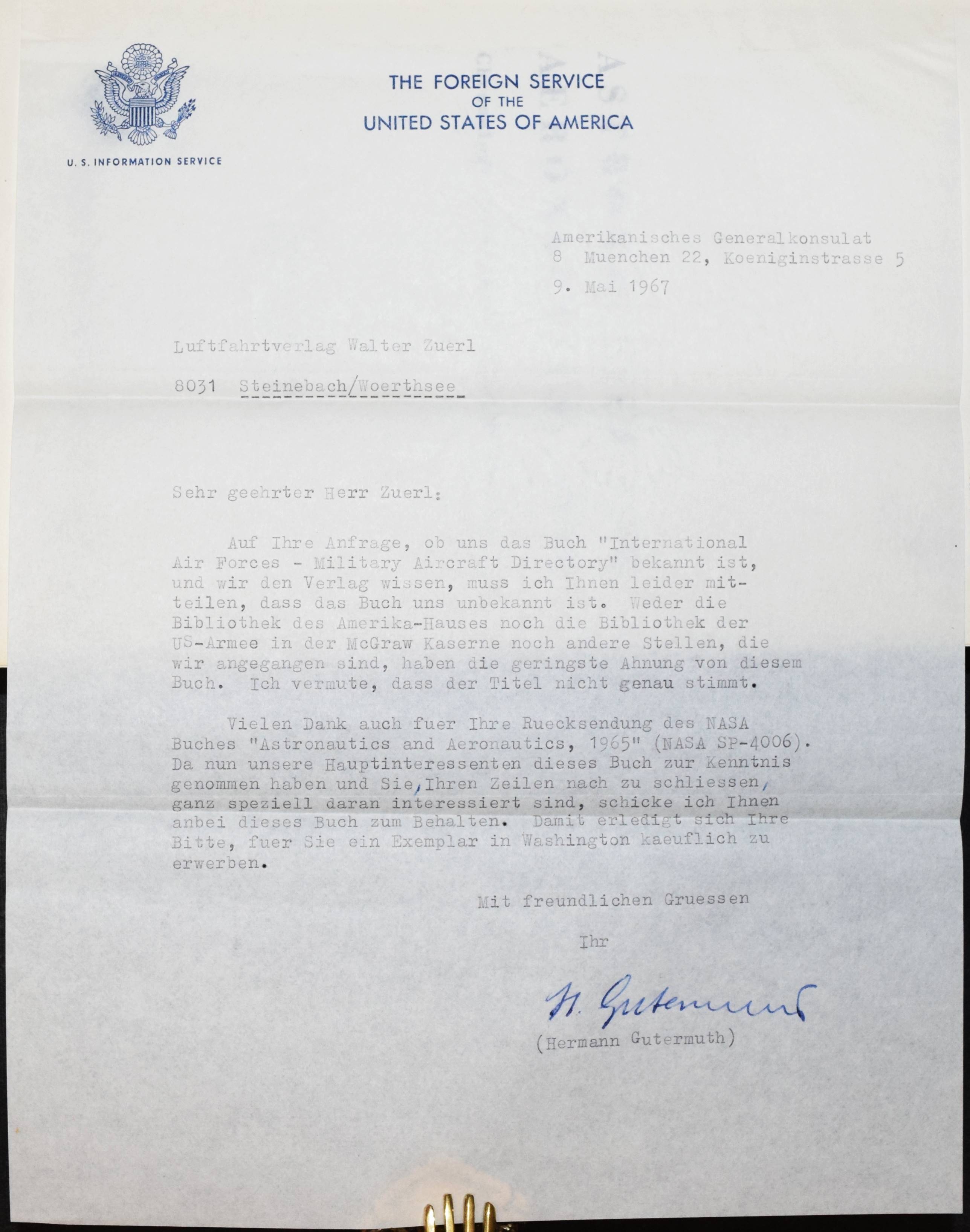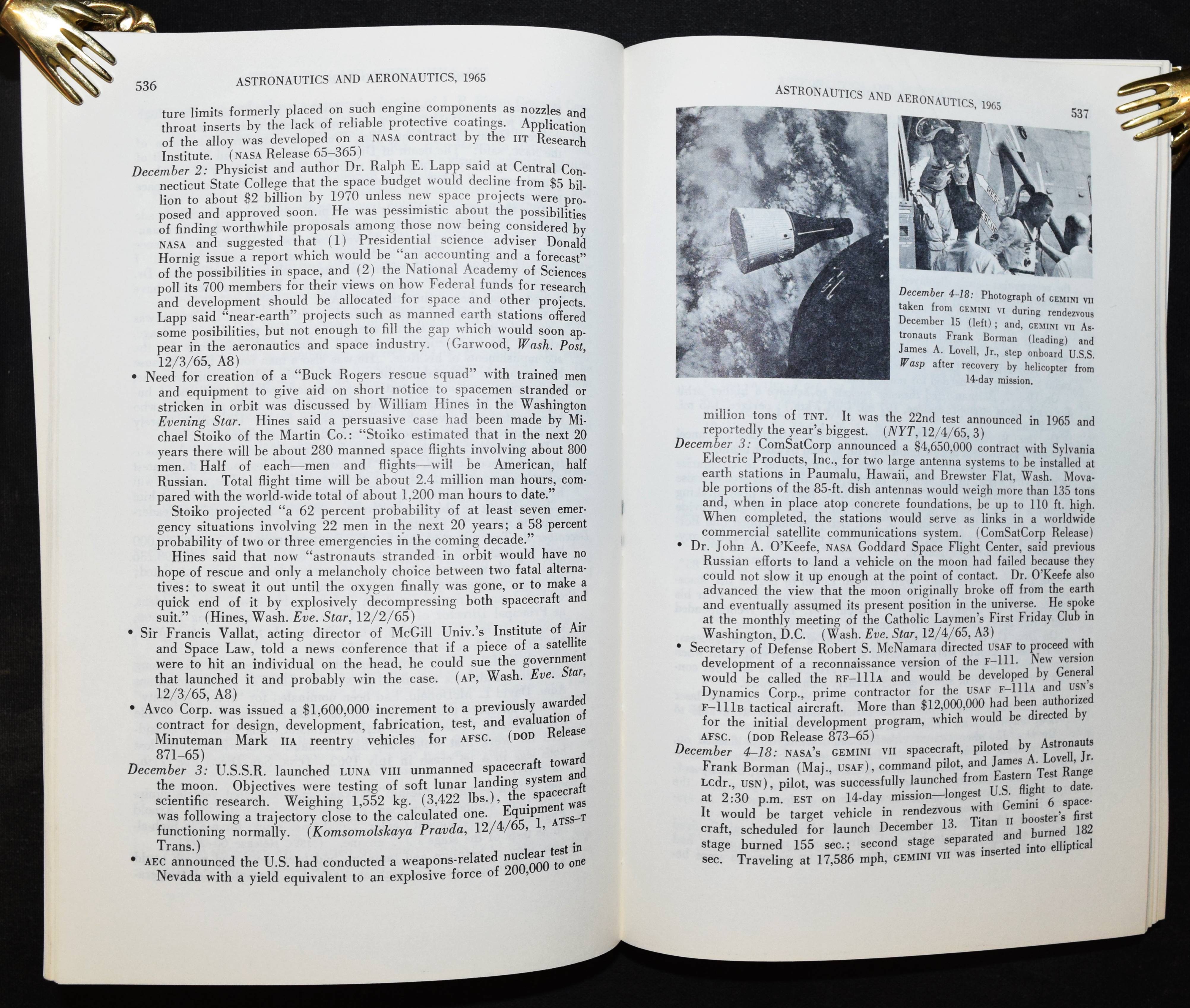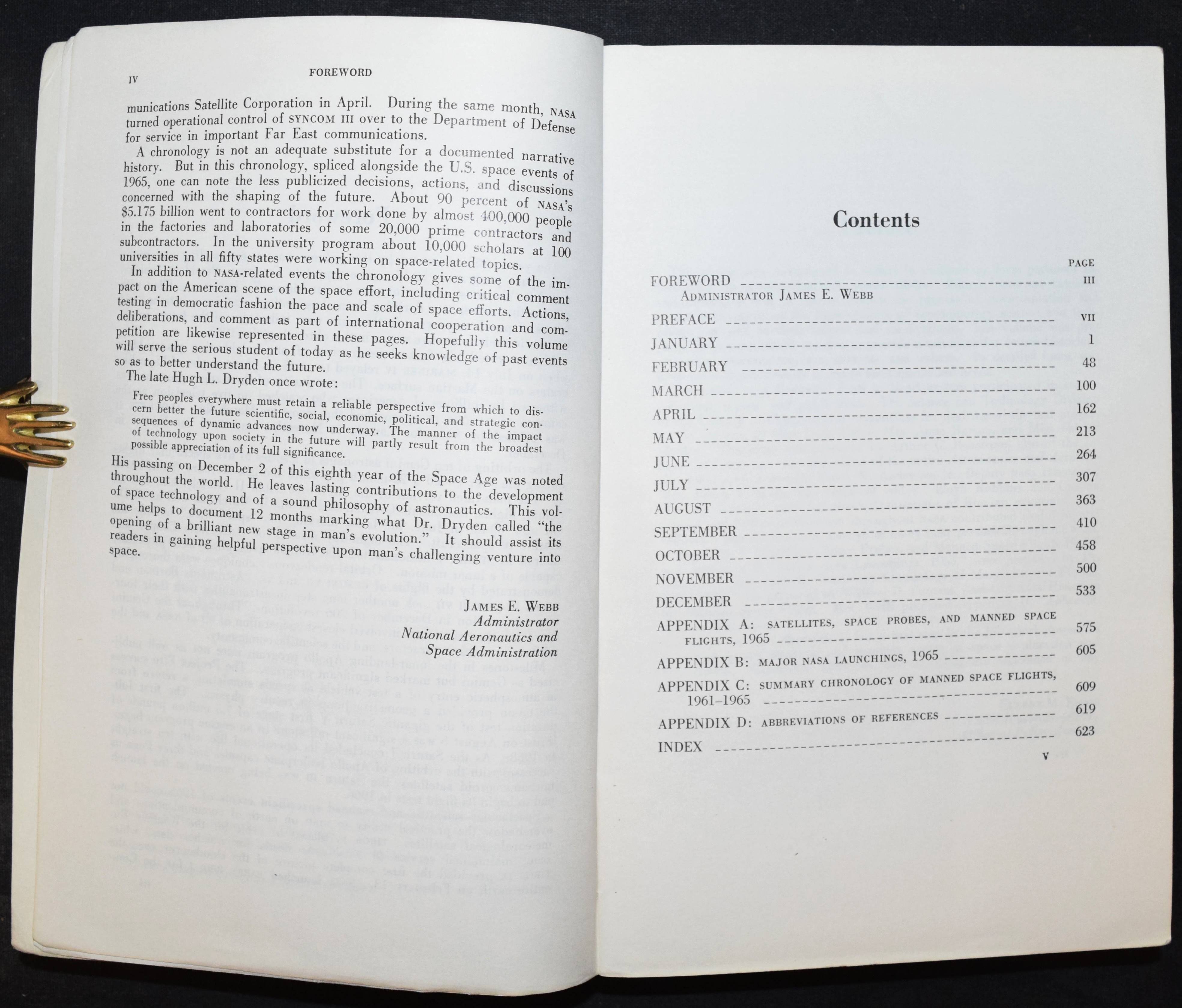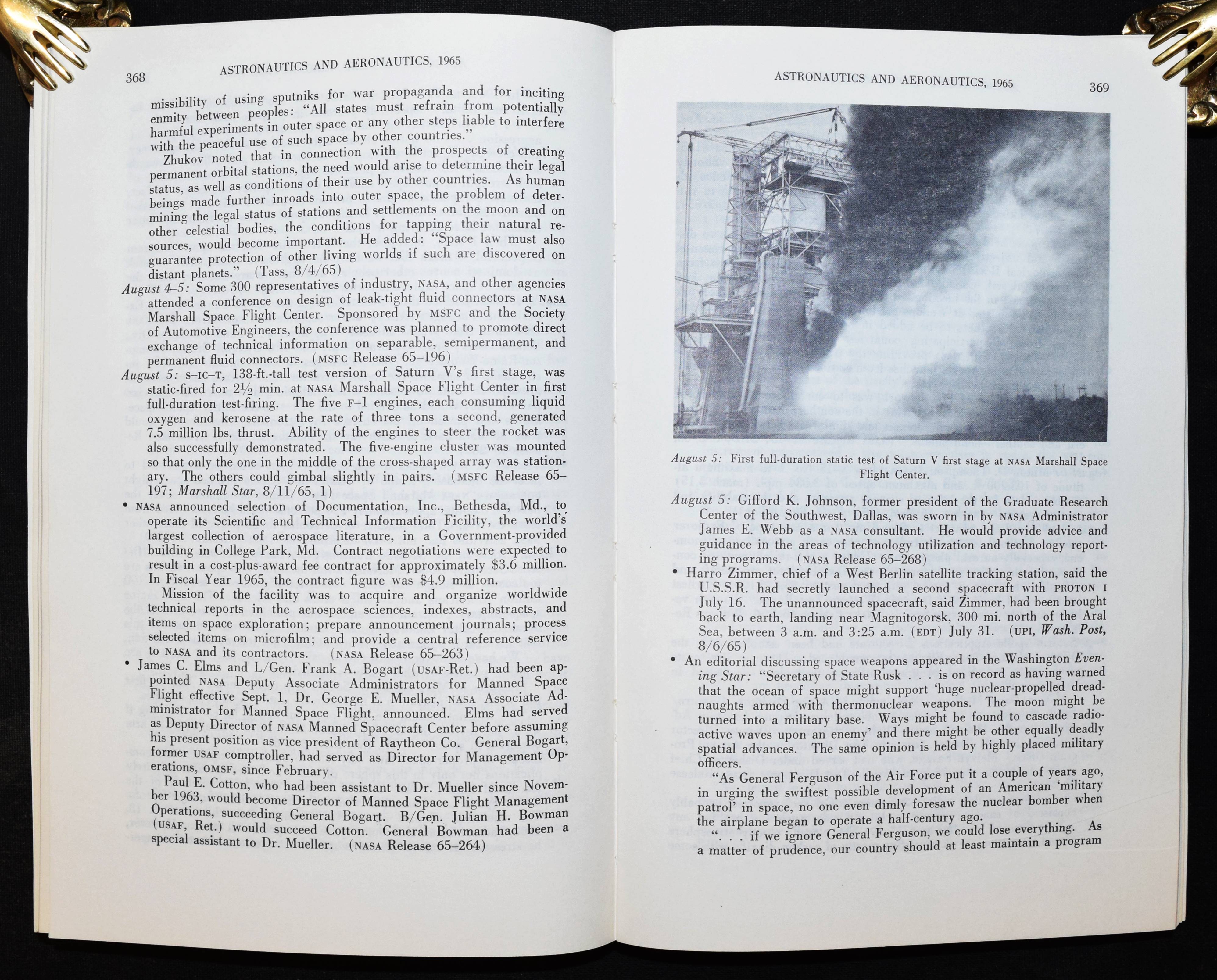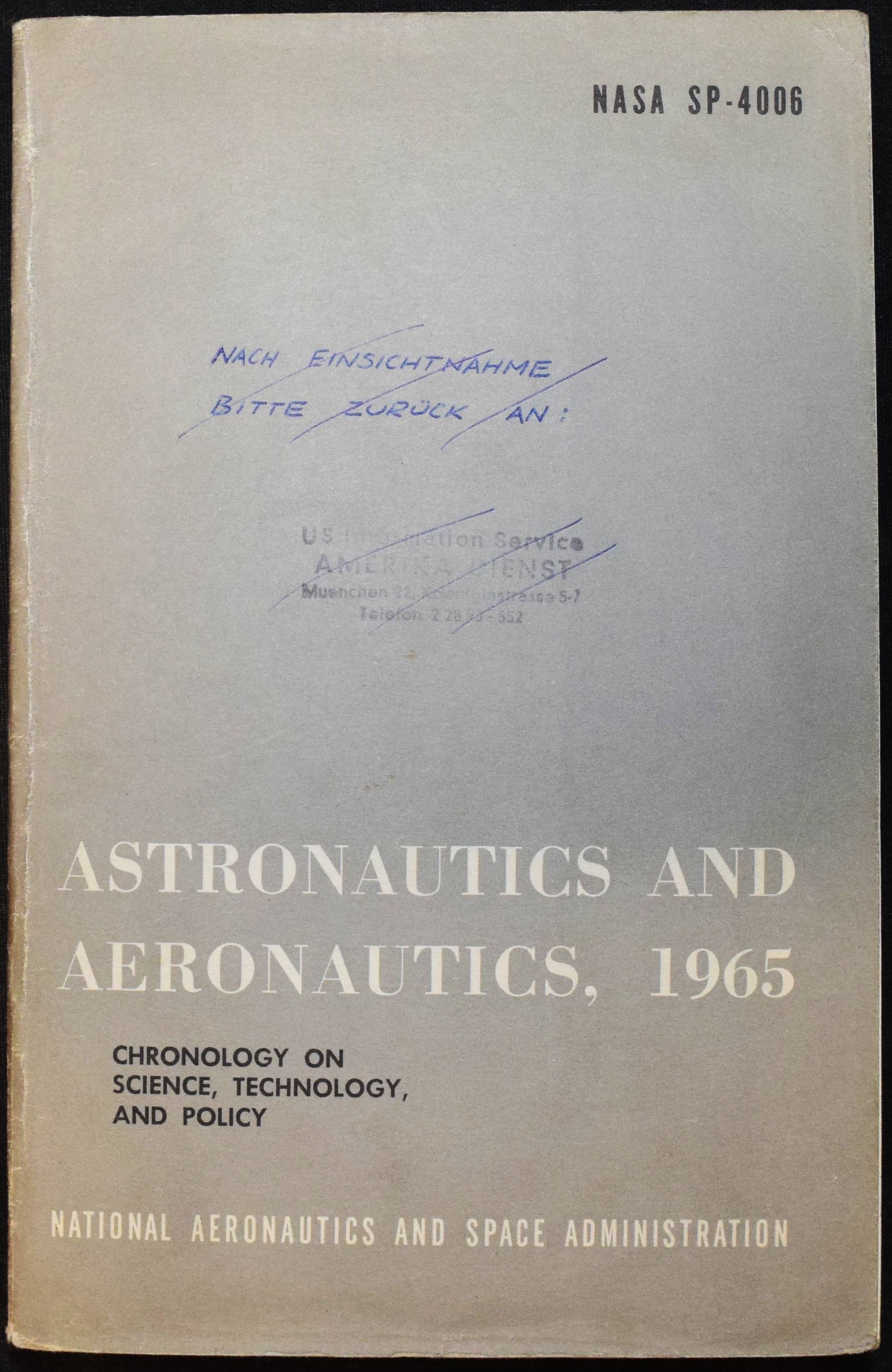 Webb, James E. (Foreword). Astronautics and aeronautics 1965. Chronology on science, technology and policy. Washington, National Aeronautics and Space Administration (NASA) 1966. 8°. V, 1 Bl., 679, (1) S. mit einigen Abb. OKart. (NASA SP-4006). Titelbl. mit mont. Brief des amerikanischen Generalkonsuls Hermann Gutermuth an den Verleger Walter Zuerl. – Umschlag etwas berieben, St.a.D., sonst gutes Exemplar.