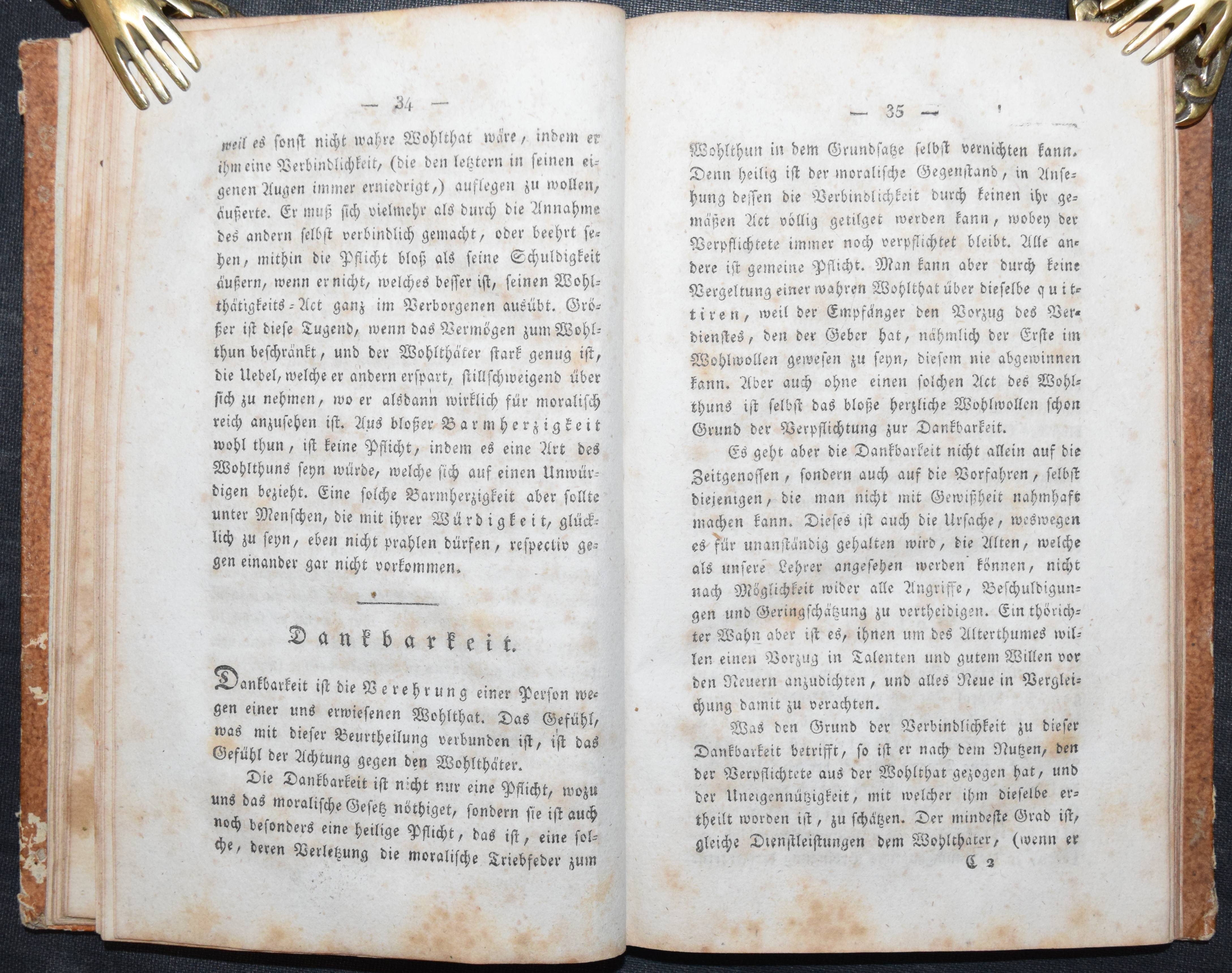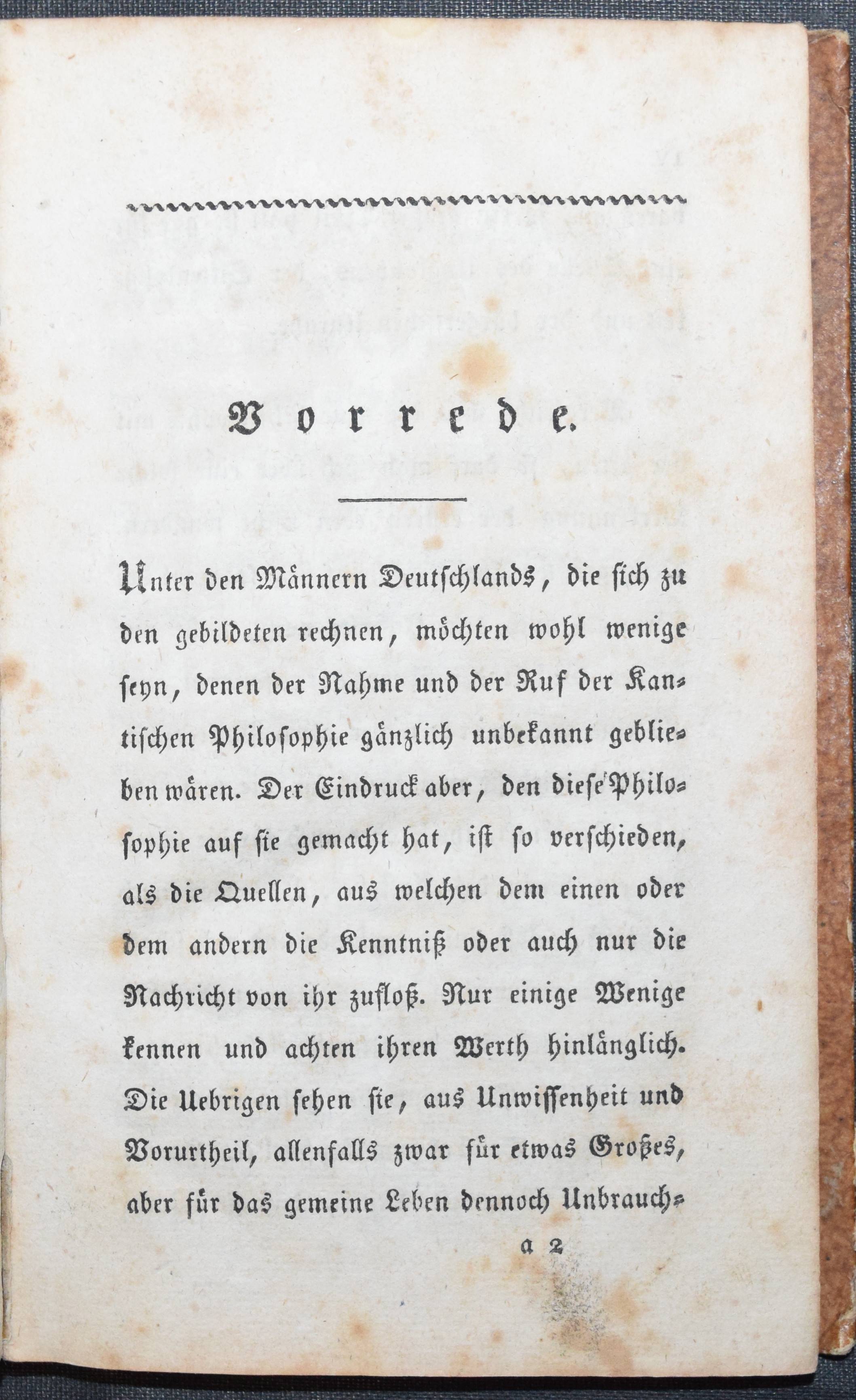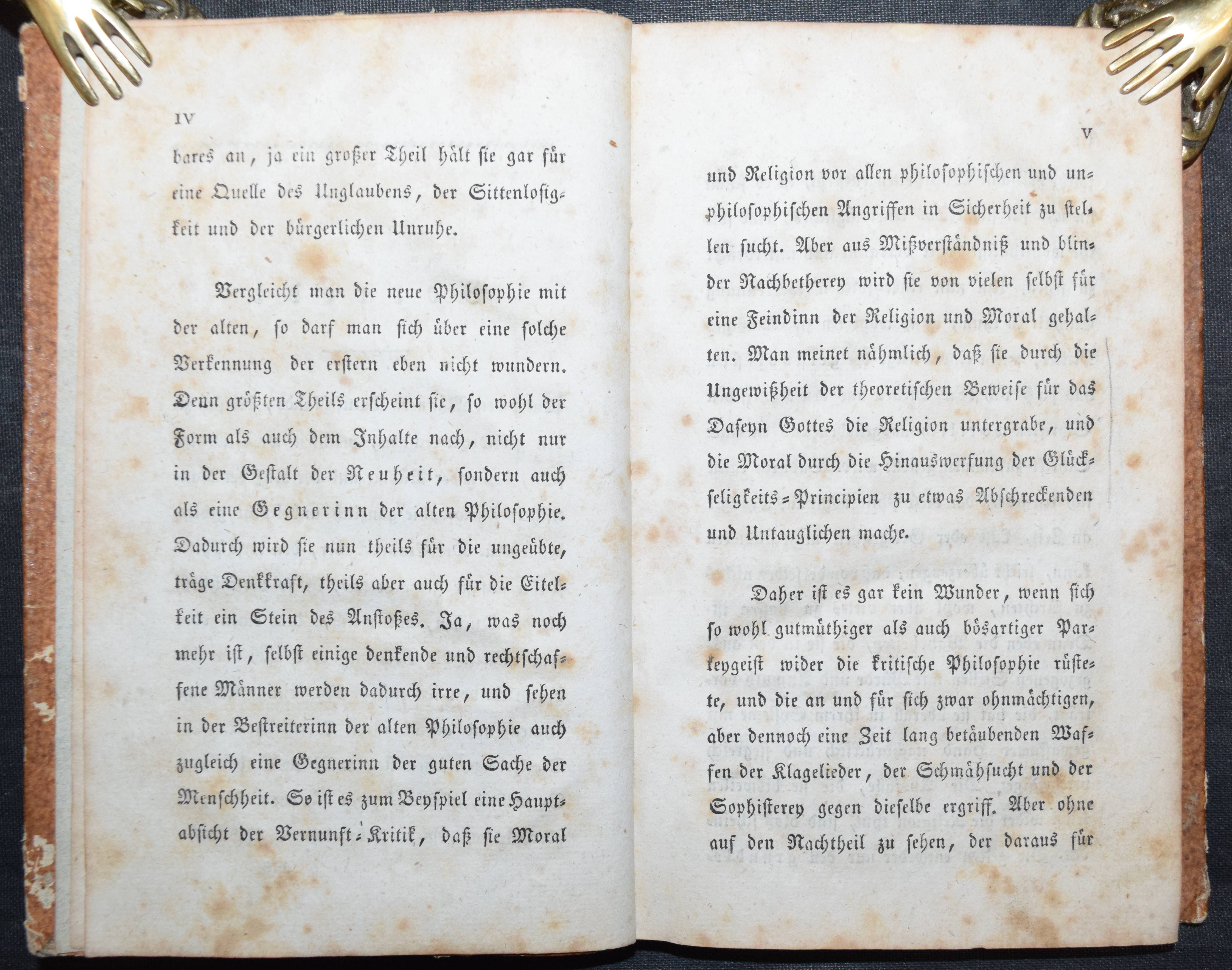 Rätze, J(ohann) G(ottlieb). Kantische Blumenlese, oder solche Stellen aus Kants Schriften, die für jedermann faßlich, interessant und lehrreich sind. Nebst einer Abhandlung über die Haupt-Resultate der Kantischen Philosophie. 3., verm. Aufl. Wien, Bauer 1814. 8°. XVI, 127 S. Pbd d. Zeit mit goldgepr. Rückentitelschild. Einband teils stärker berieben u. besch., durchgehend braun- u. stockfl.