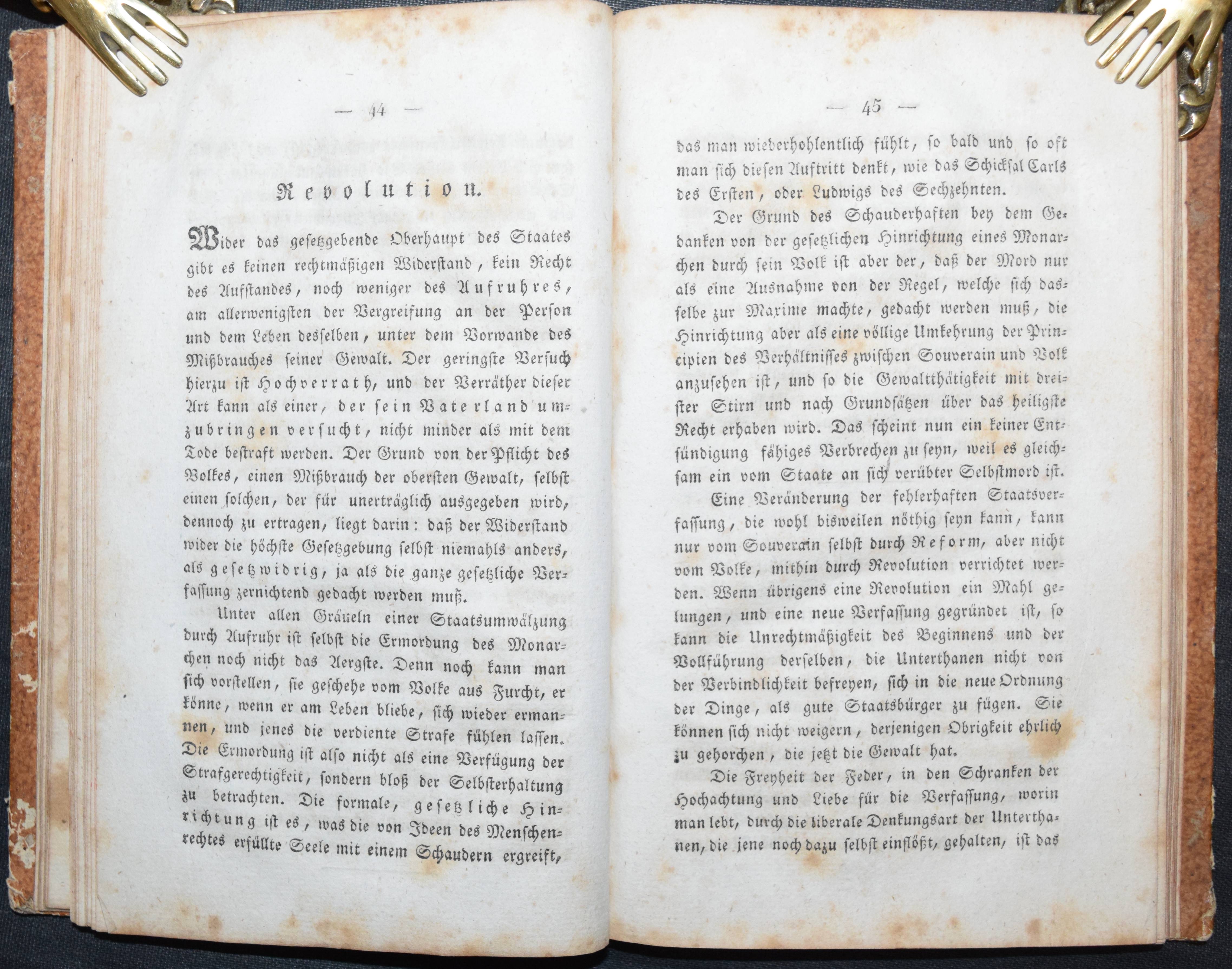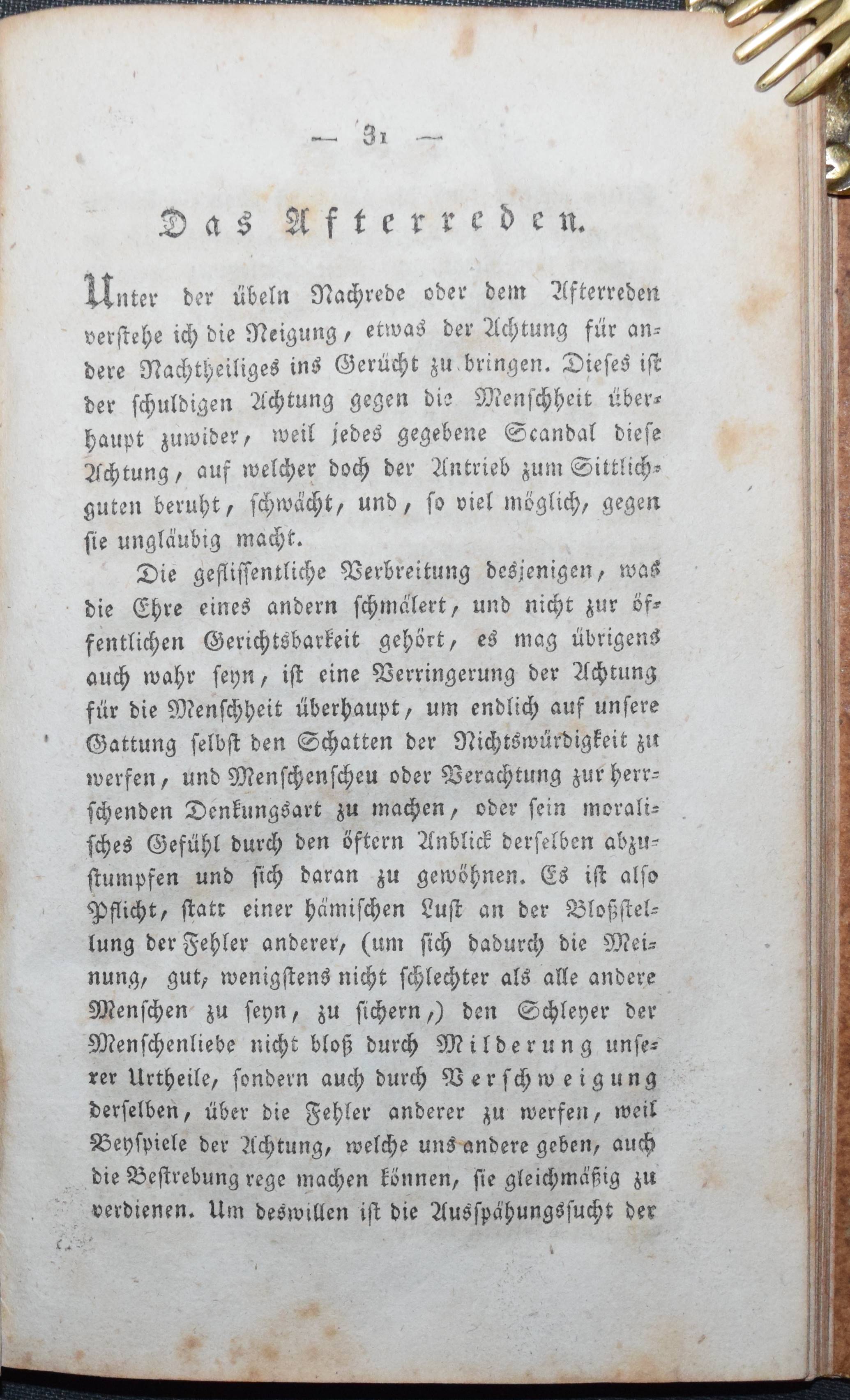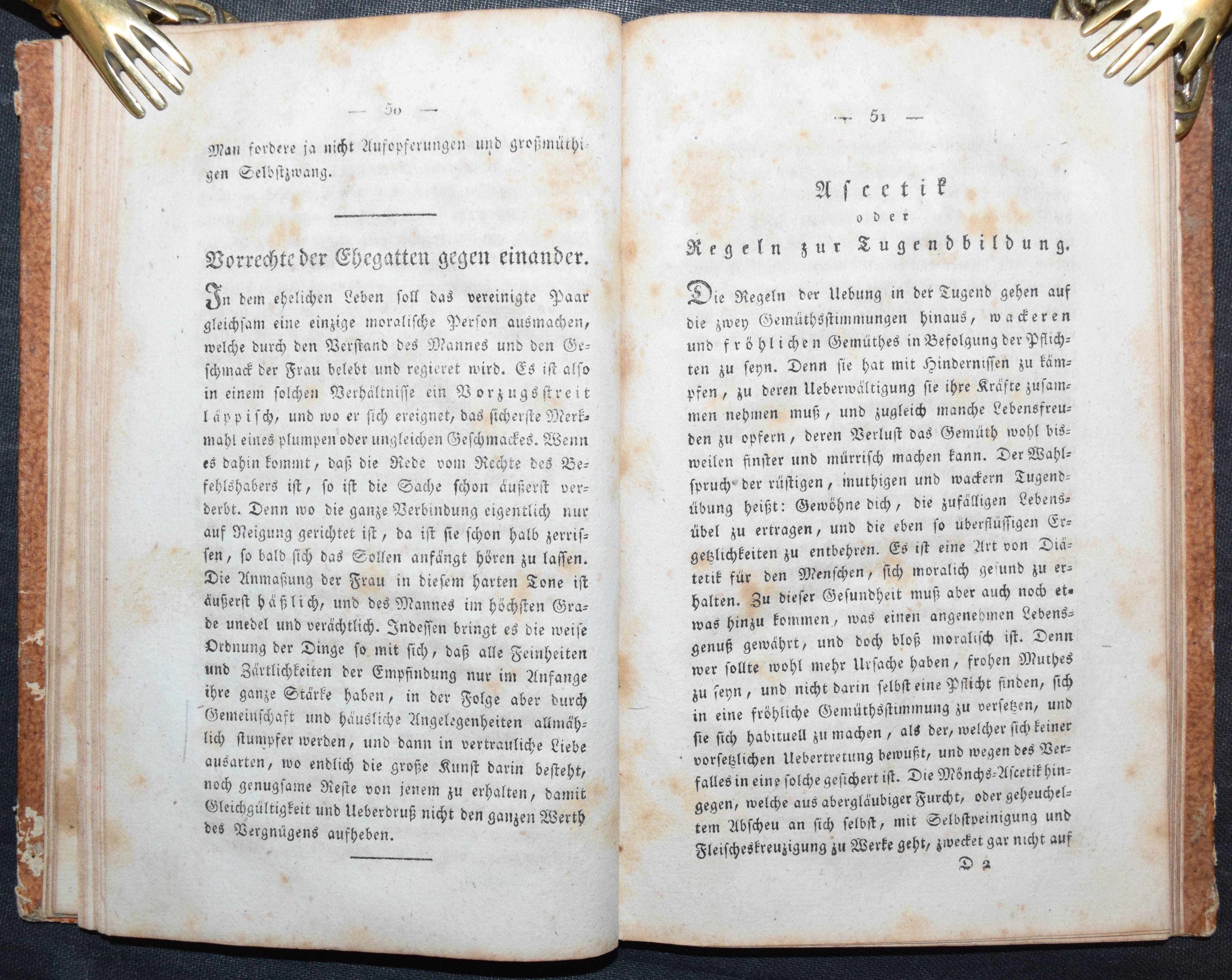 Rätze, J(ohann) G(ottlieb). Kantische Blumenlese, oder solche Stellen aus Kants Schriften, die für jedermann faßlich, interessant und lehrreich sind. Nebst einer Abhandlung über die Haupt-Resultate der Kantischen Philosophie. 3., verm. Aufl. Wien, Bauer 1814. 8°. XVI, 127 S. Pbd d. Zeit mit goldgepr. Rückentitelschild. Einband teils stärker berieben u. besch., durchgehend braun- u. stockfl.