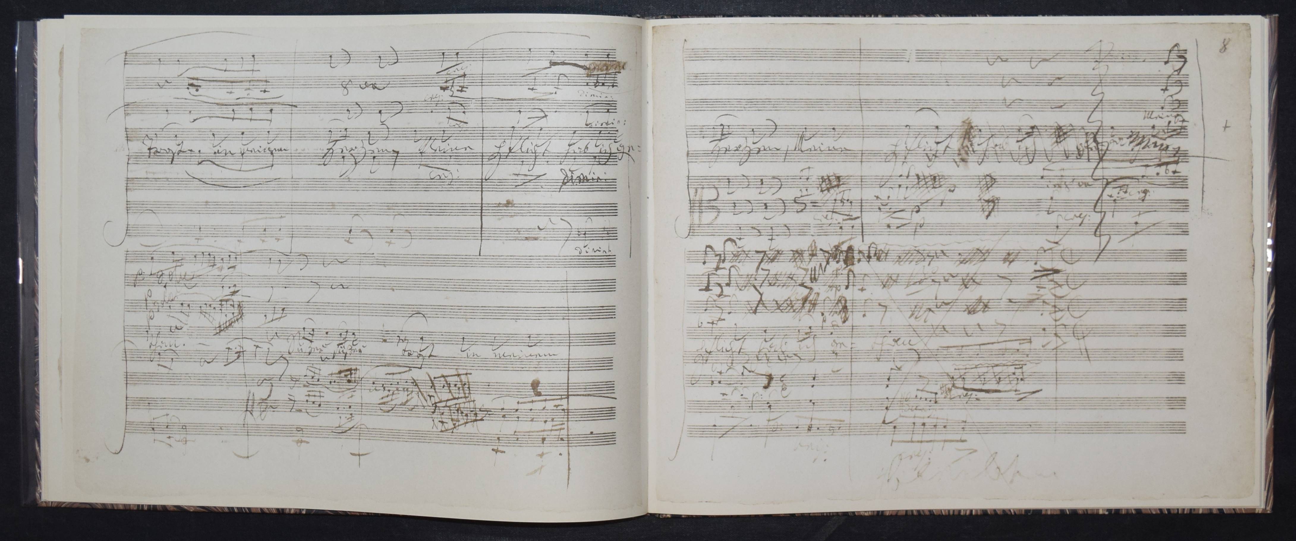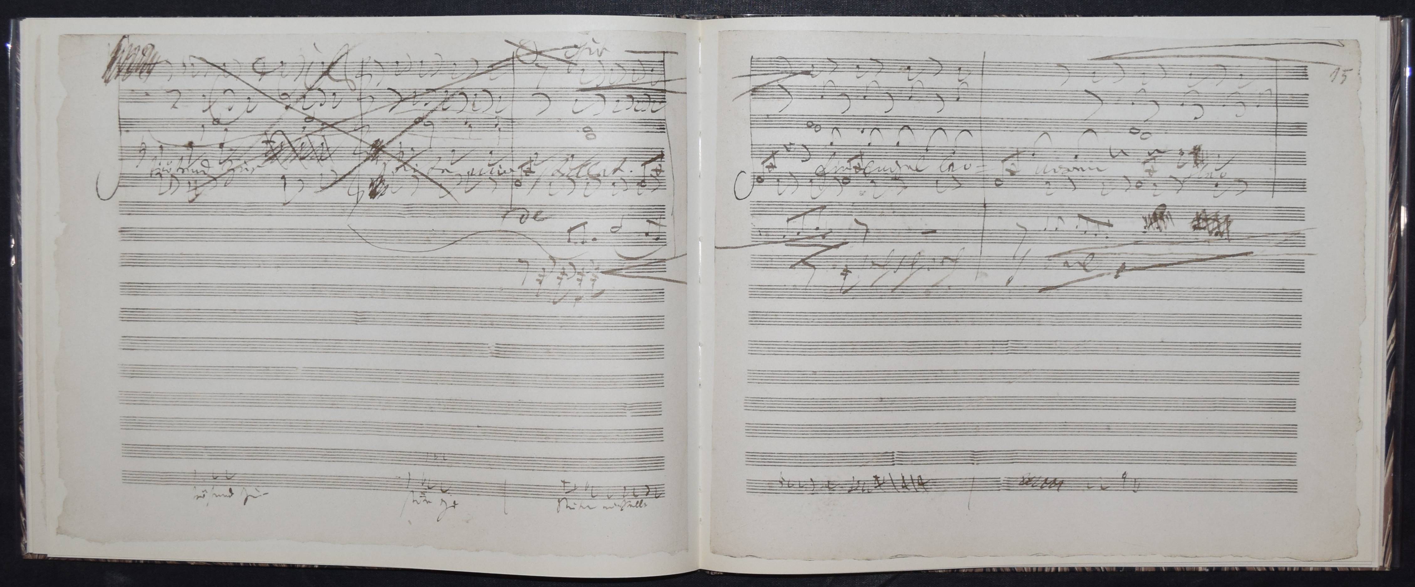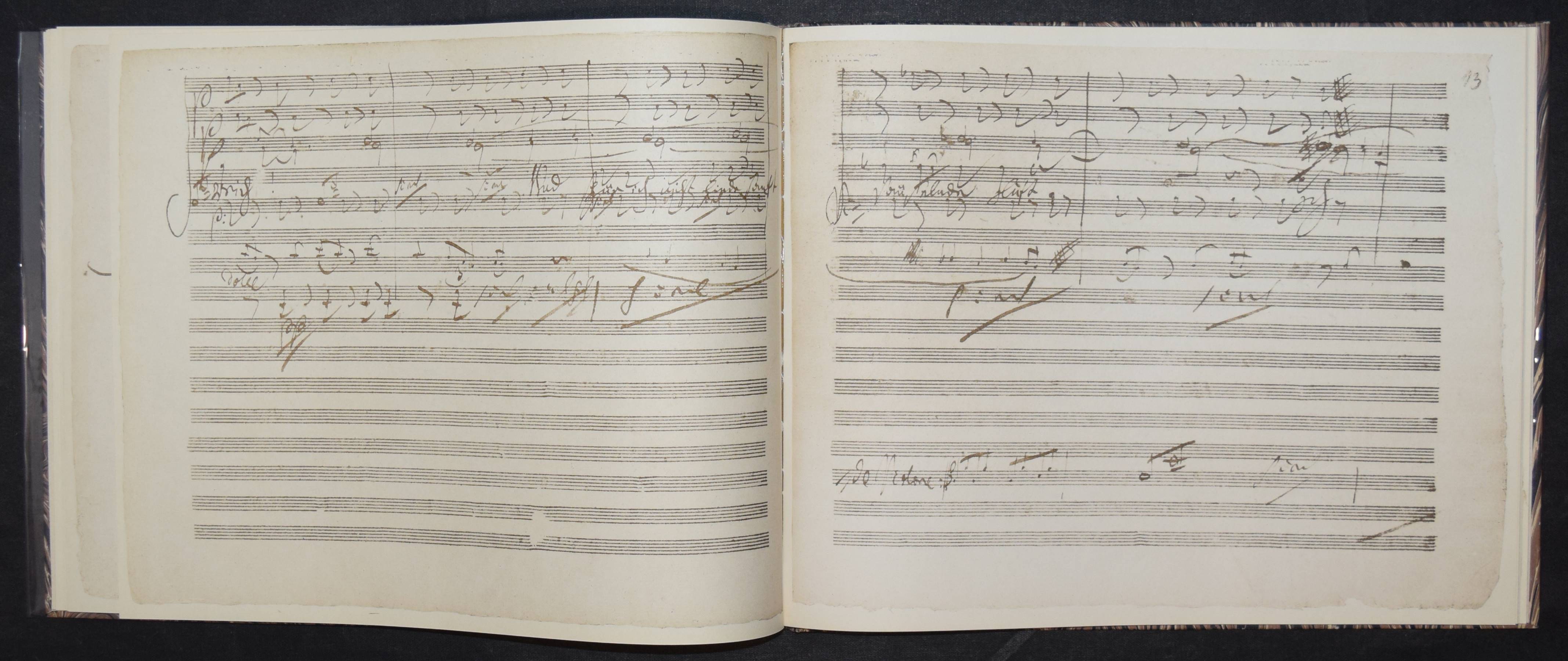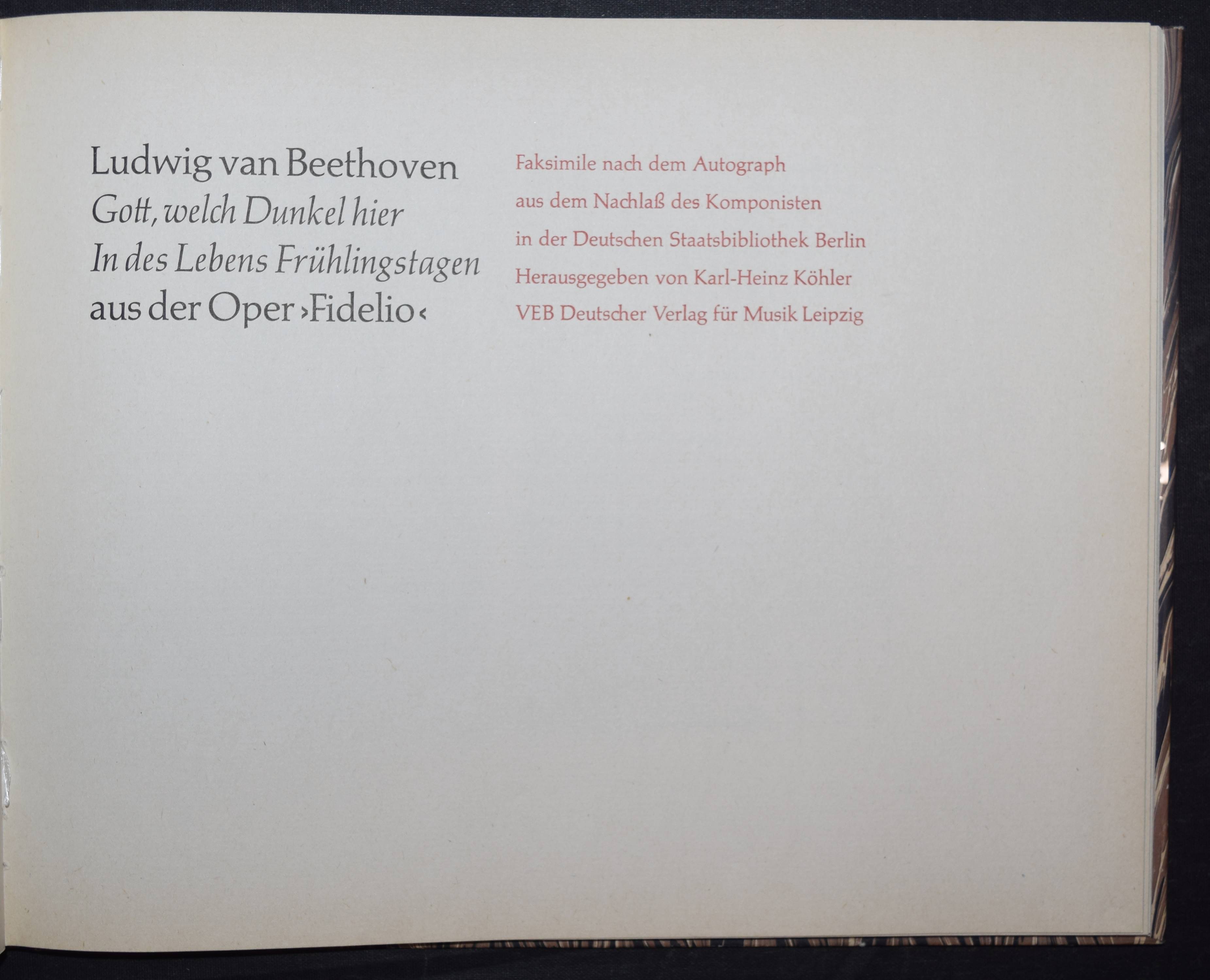 Beethoven, Ludwig van. Gott, welch Dunkel hier / In des Lebens Frühlingstagen. Aus der Oper „Fidelio“. Faksimile nach dem Autograph aus dem Nachlaß des Komponisten in der Deutschen Staatsbibliothek Berlin. Herausgegeben von Karl-Heinz Köhler. Leipzig, VEB Deutscher Verlag für Musik 1976. Quer-4°. 14 S., 23 nn Blätter mit 44 Faksimile-Abb. Marmor. OPbd. mit Orig.-Klarsichschutzumschlag. Kapitale geringf. berieben, Schutzumschlag mit 3 kl. Randläsuren, sehr gutes Exemplar.