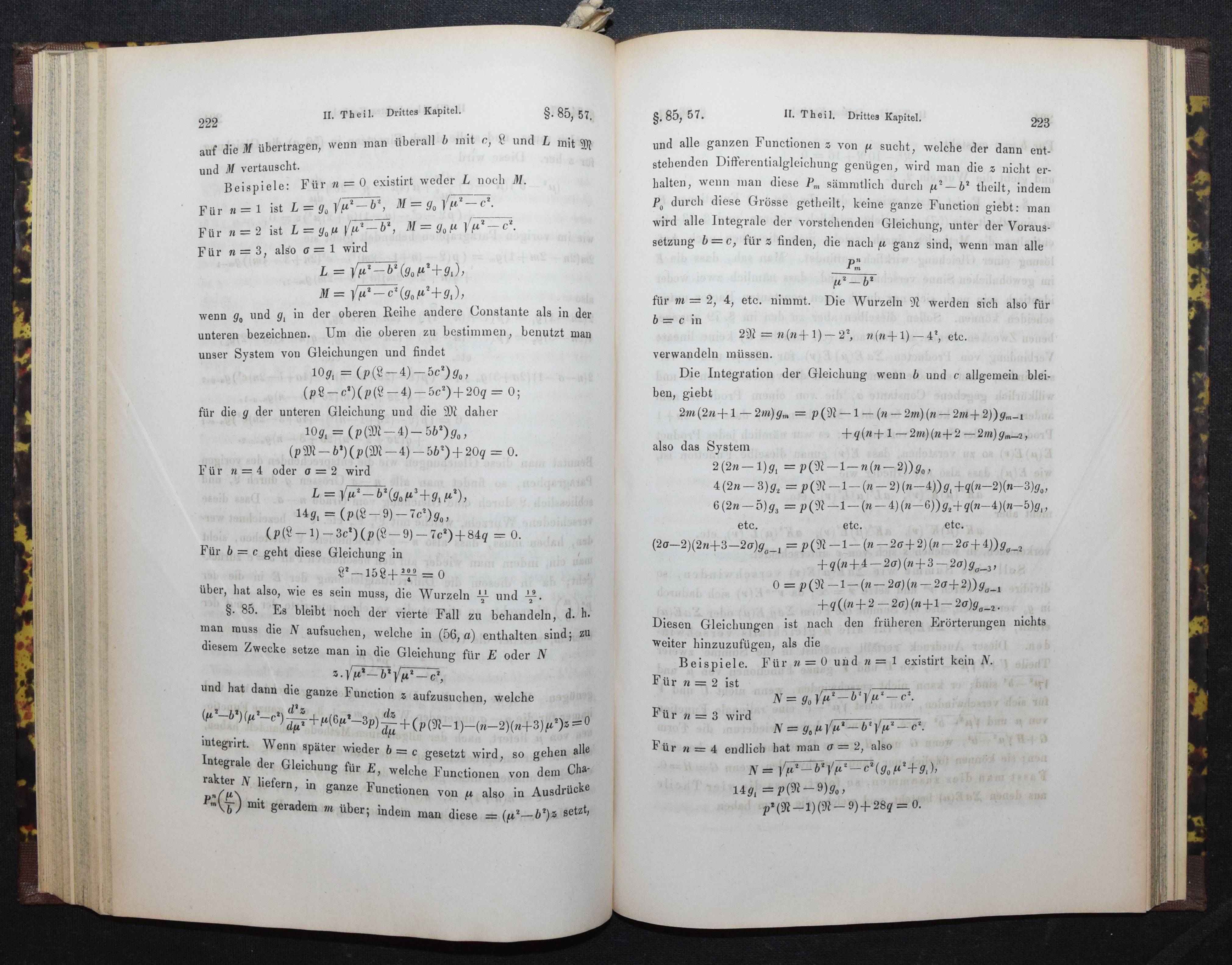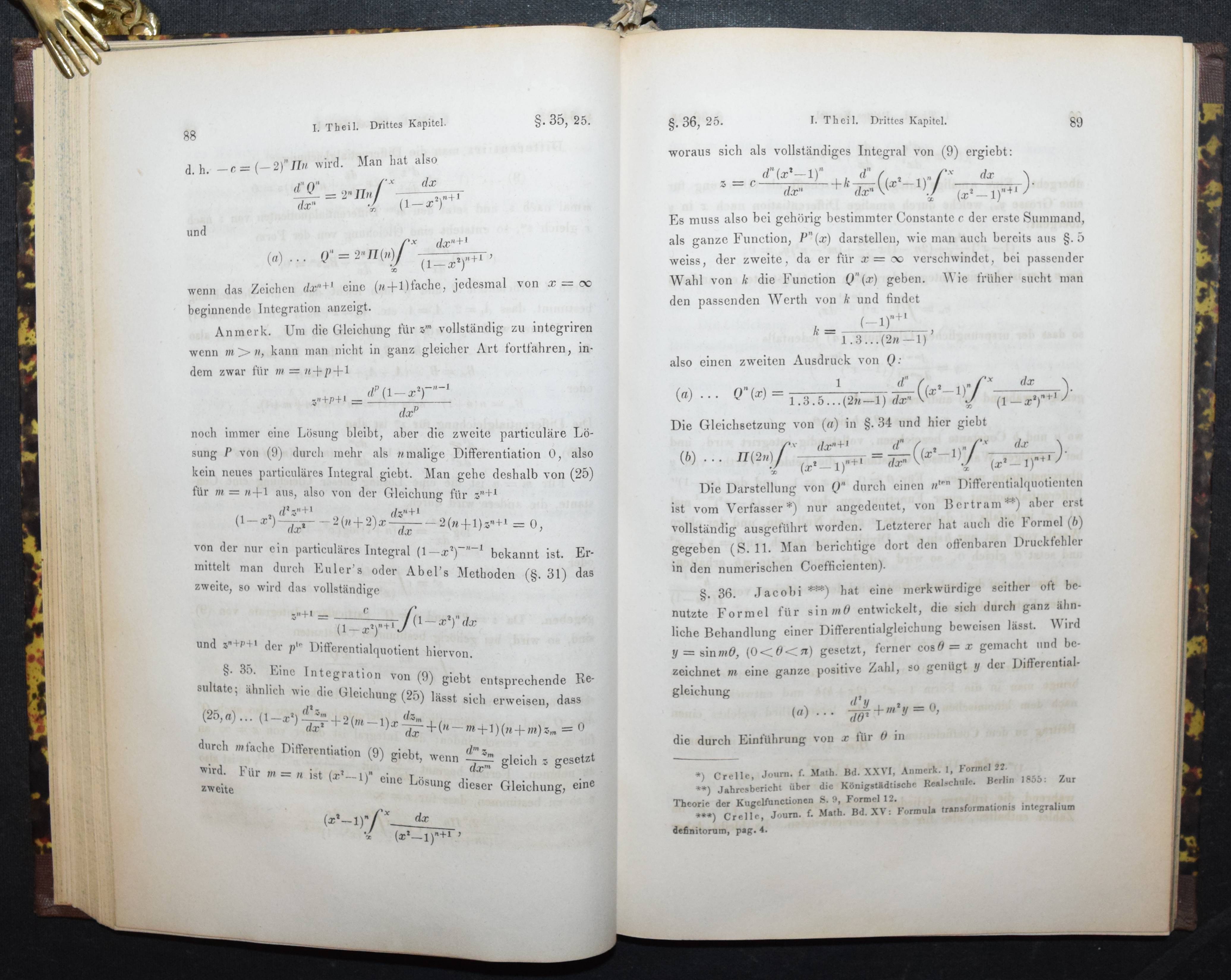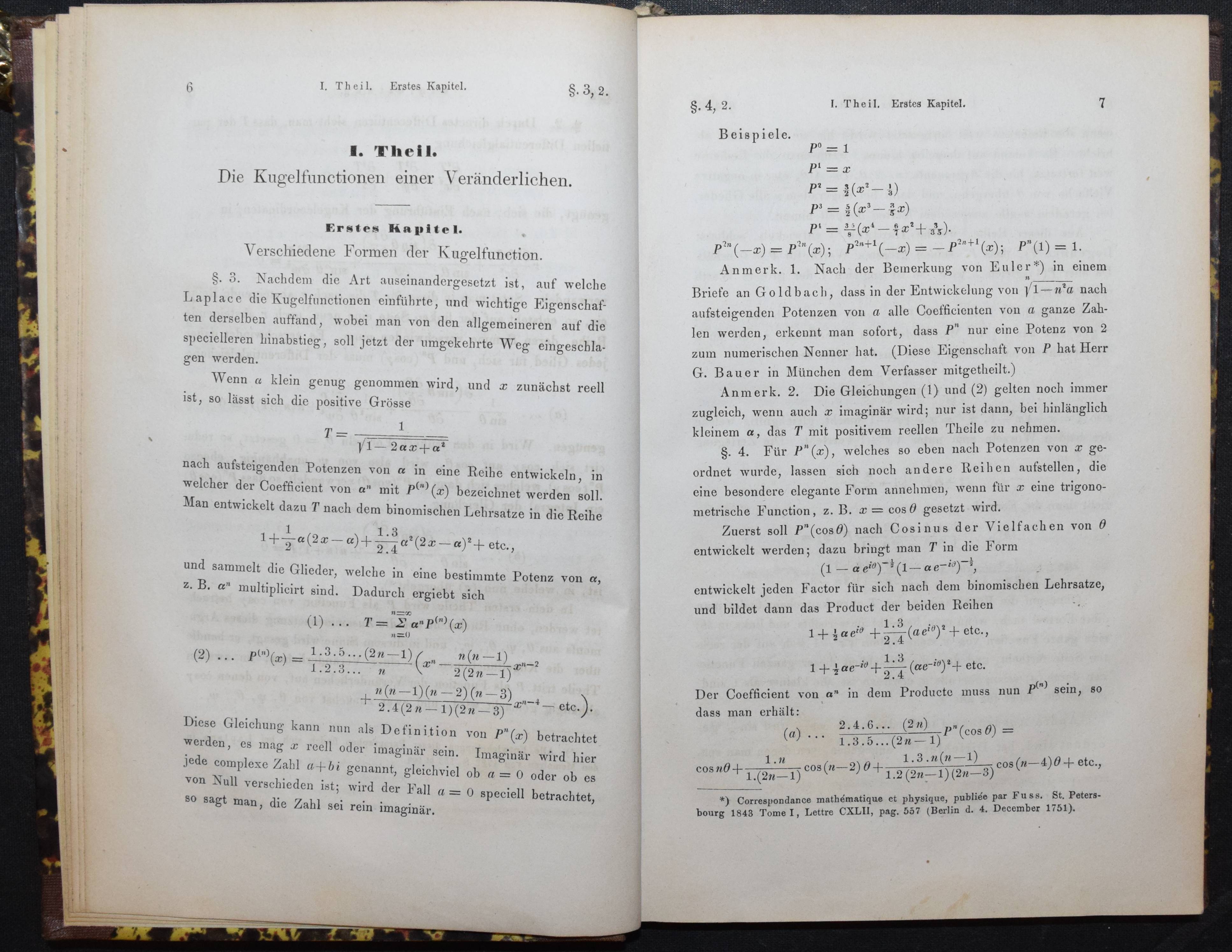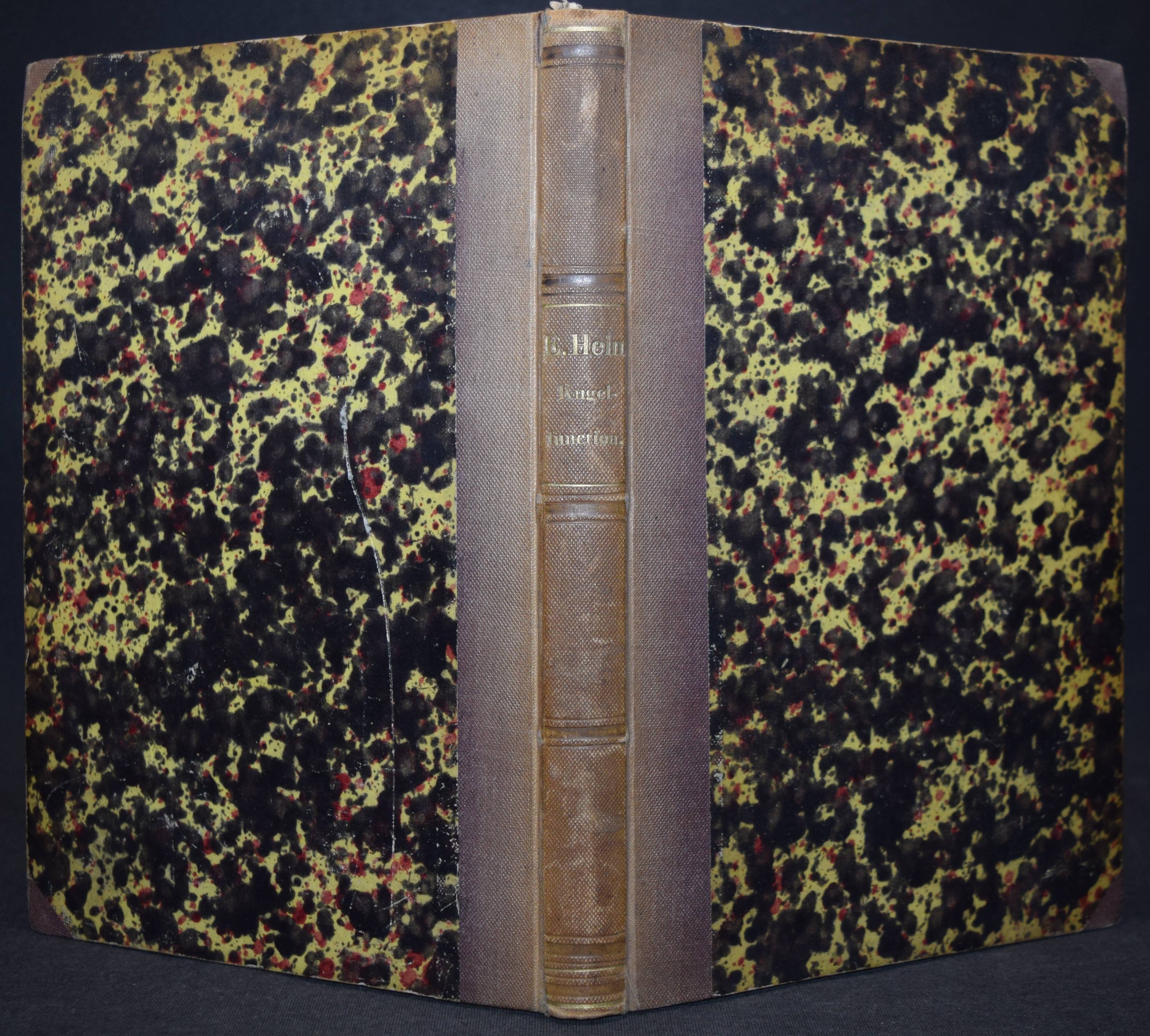 Heine, (Heinrich) E(duard). Handbuch der Kugelfunctionen. Berlin, Reimer 1861. Gr.-8°. XIV, 1 Bl., 382 S. Hln. d. Zt. mit goldgepr. Rückentitel u. Linienverg. Gottwald / Ilgauds / Schlote, Lex. bedeutender Mathematiker S. 196. – Seltene erste Ausgabe des Hauptwerks des Berliner Mathematikers H. E. Heine (1821-1881). – „Einen wesentlichen Anteil hat H. am Ausbau der Theorie der Kugelfunktionen und an deren Anwendung auf Randwertaufgaben der Potentialtheorie. Sein Handbuch über Kugelfunktionen wurde noch 100 Jahre später (1961) neu aufgelegt. Historisch wichtig wurde, daß H. die Weiterführung einer Präzisierung des Identitätssatzes für trigonometrische Reihen G. Cantor überließ. Dessen entsprechende Untersuchungen über gewisse Mengen von Punkten, in denen keine Konvergenz vorausgesetzt wird, enthielten den Keim zur Mengenlehre (1872)“ (R. Jentsch). – Rücken etwas aufgehellt u. berieben, sonst sehr gutes sauberes Exemplar.