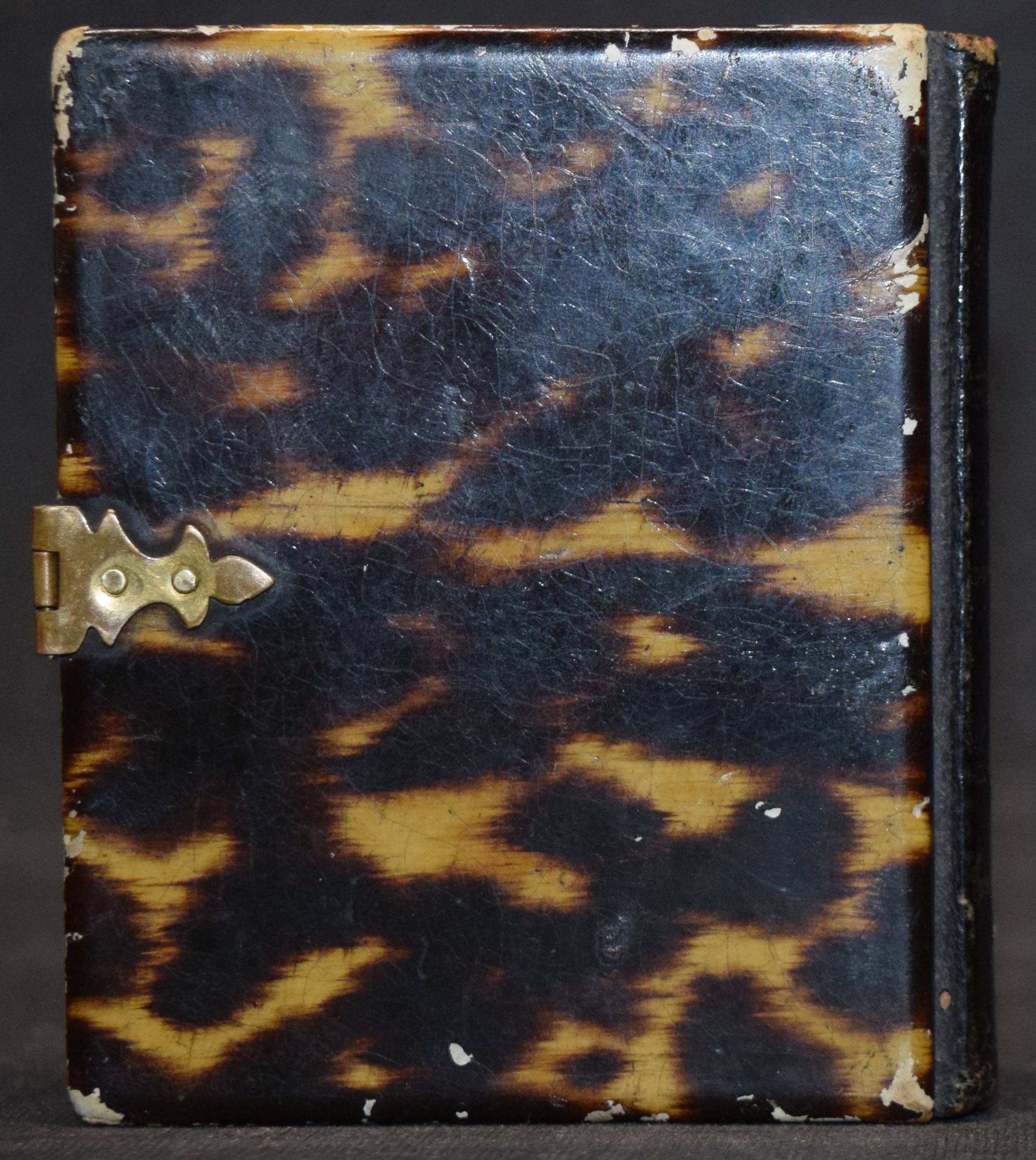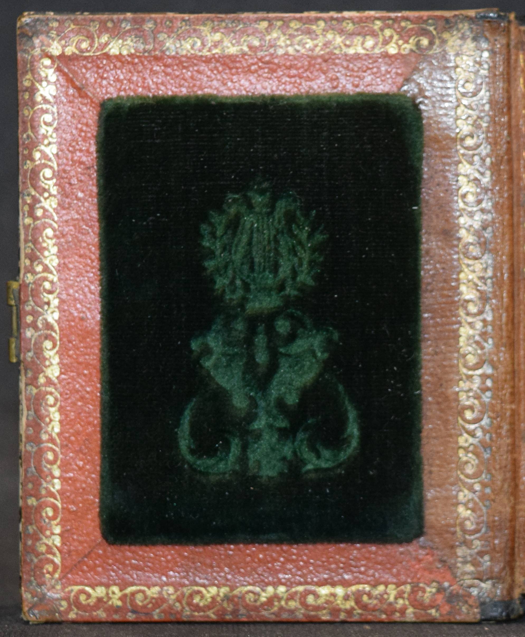 Ambrotypie – Ganzkörper-Porträt eines jungen Mannes mit Zigarre an einer Kommode lehnend. Von V. L. Richardson (Namenprägung im Passepartout). Unter ovalem vergoldetem Metall-Passepartout in Orig.-Hldr.-Etui mit marm. Deckeln mit Blumenmalerei, dunkelgrünem Samt-Spiegel mit Wappenprägung, Goldschnitt u. Messing-Schließe. USA um 1860. 5,5 x 4,5 cm., Kassettengr. 8 x 6,5 cm. Sehr gut erhaltene Ambrotypie im prachtvollen Original-Etui. Der amerik. Daguerreo- und Ambrotypist V. L. Richardson (1827-?) betrieb seit ca. 1850 eine Galerie für Daguerreotypie in Zanesville (Ohio).