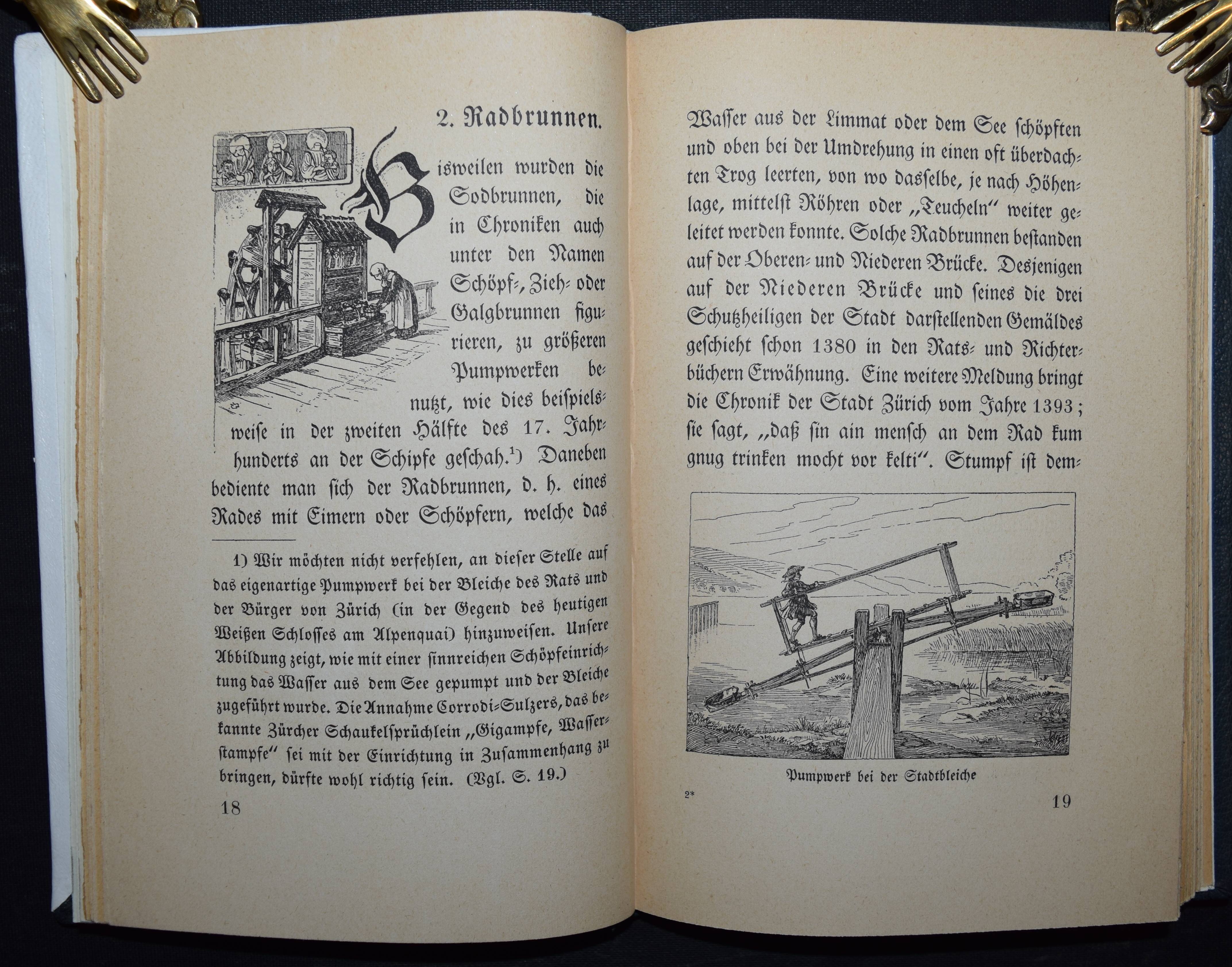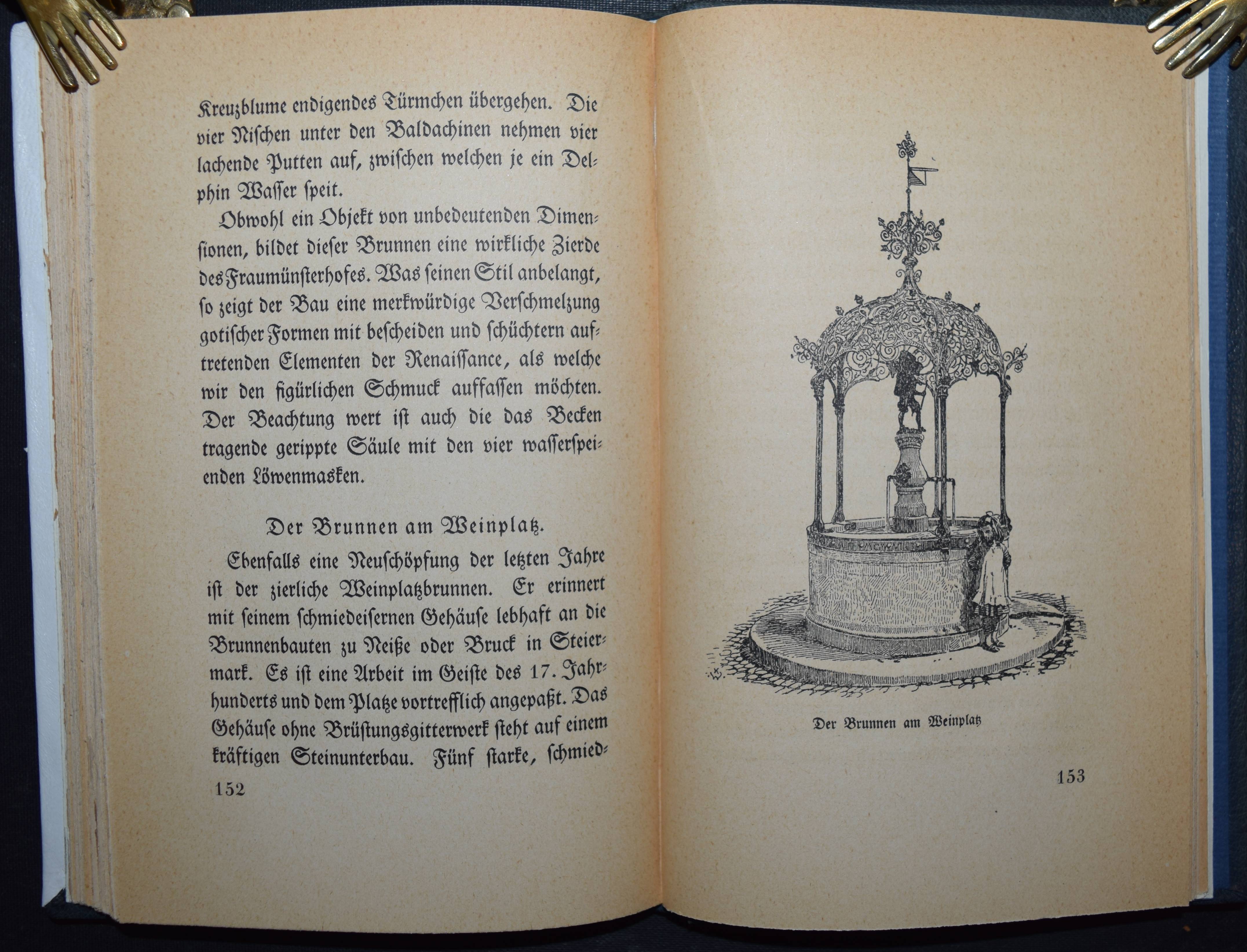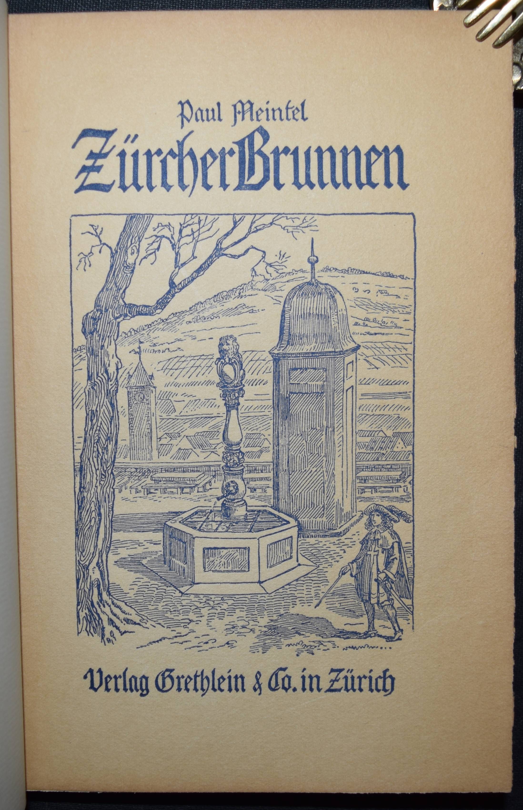 Einband – Zweifarbiger Ledereinband in Dunkelgrün und Weiss mit weißgepr. Rückentitel, signiert: Erica Knus, (Zürich). Inhalt: Meintel, Paul. Zürcher Brunnen. Zürich, Grethlein & Co. (1921). 8°. 171, (2) S. mit zahlr. Illustrationen von Wilhelm Klink. Illustr. OU. beigebunden. Interessanter moderner Handeinband. – Sehr gut erhalten.
