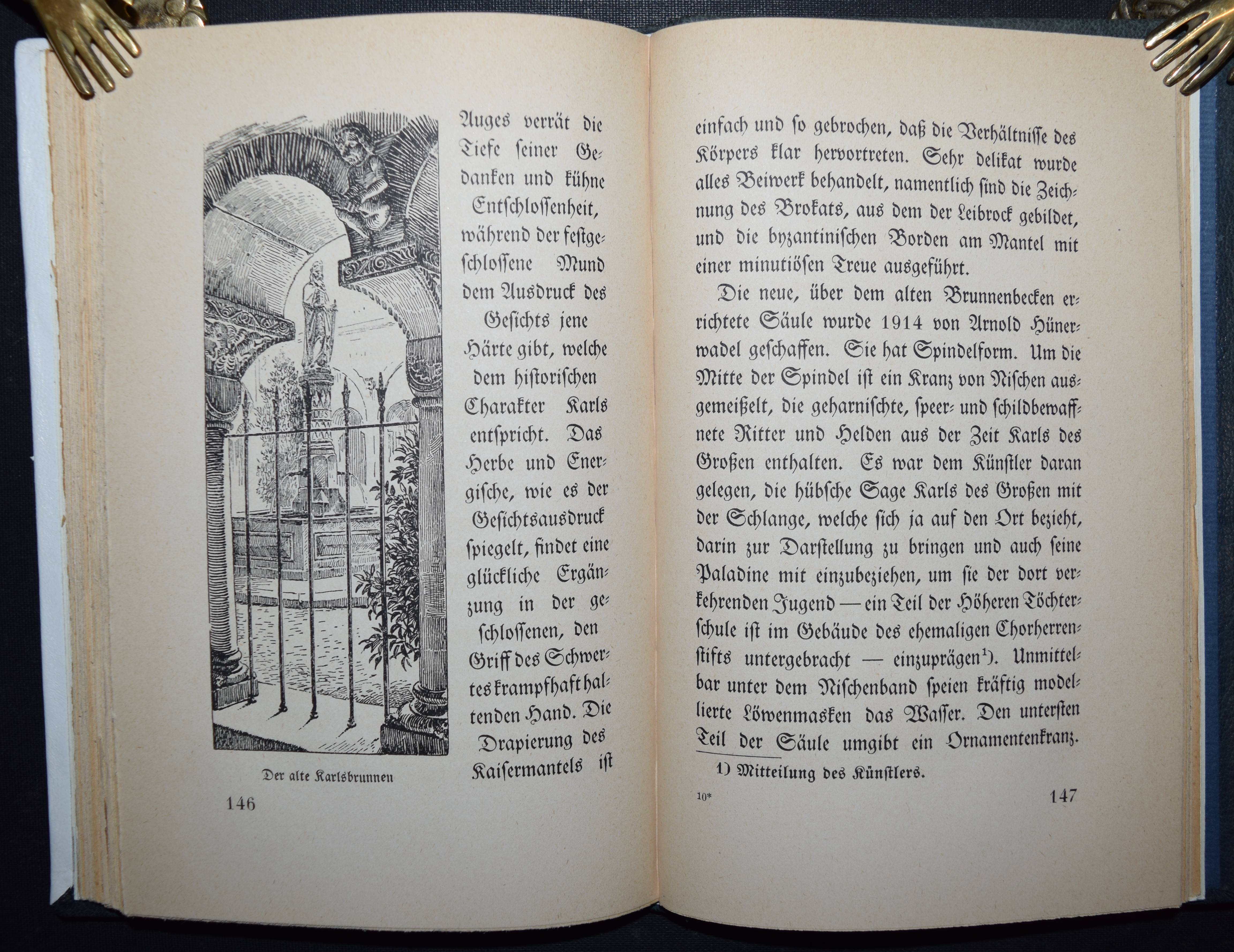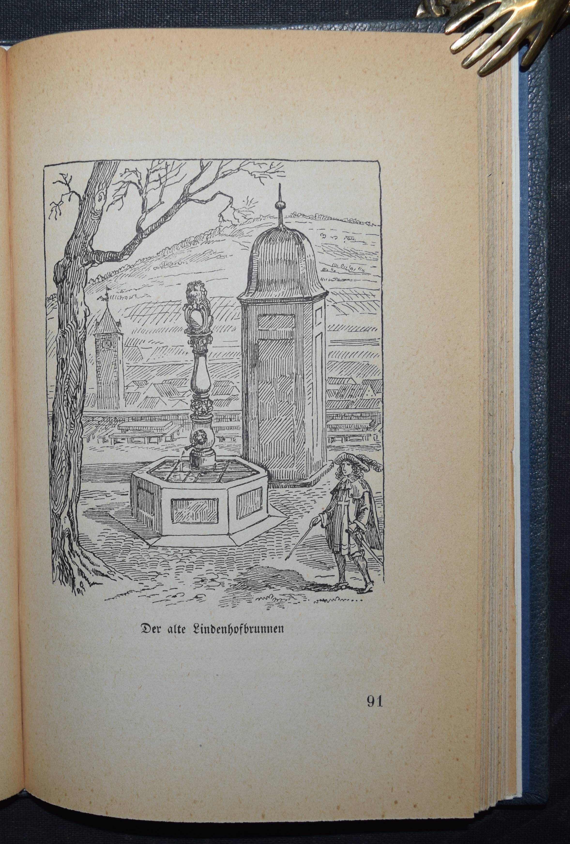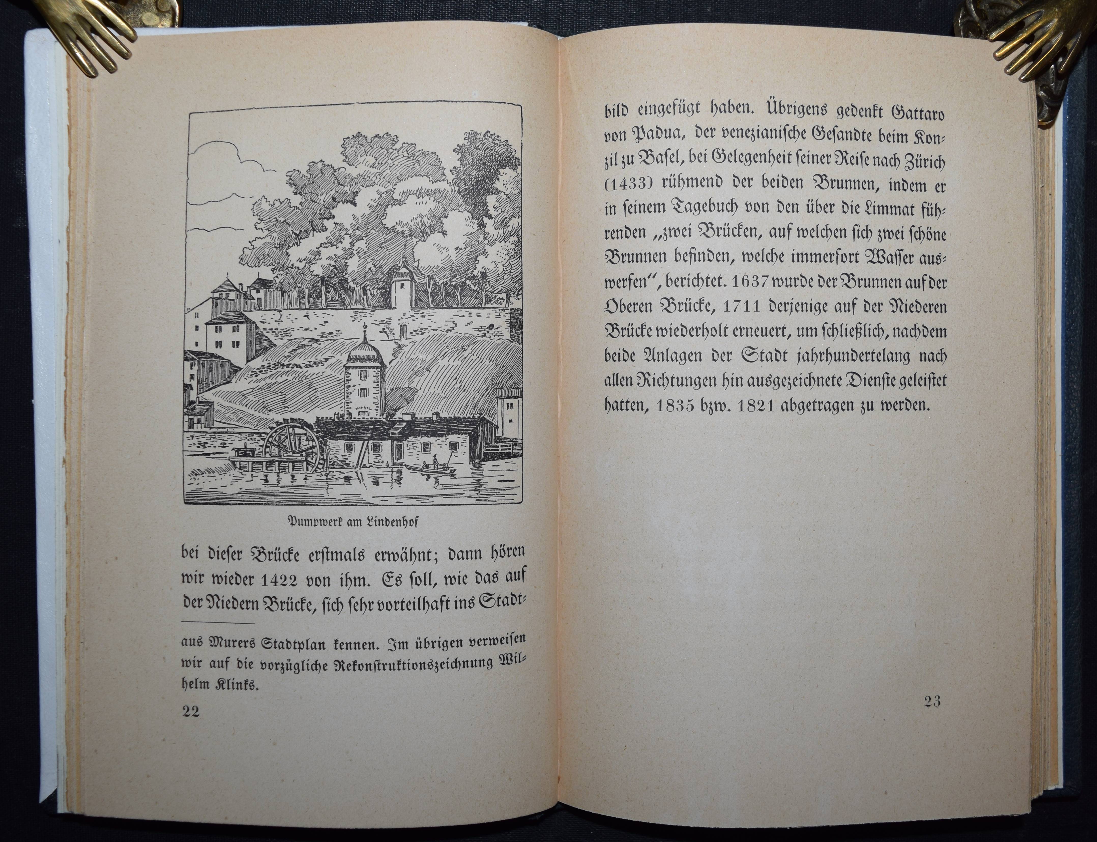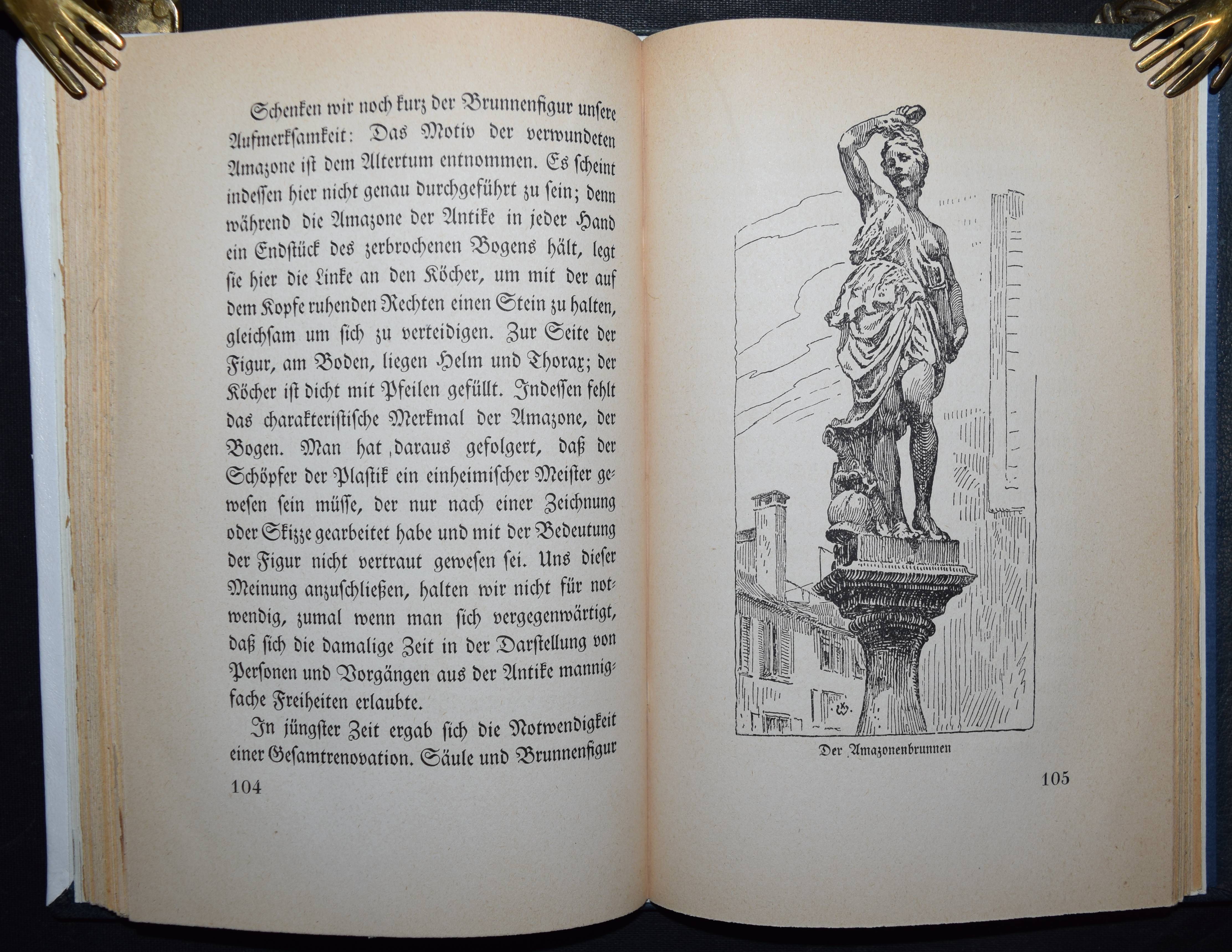 Einband – Zweifarbiger Ledereinband in Dunkelgrün und Weiss mit weißgepr. Rückentitel, signiert: Erica Knus, (Zürich). Inhalt: Meintel, Paul. Zürcher Brunnen. Zürich, Grethlein & Co. (1921). 8°. 171, (2) S. mit zahlr. Illustrationen von Wilhelm Klink. Illustr. OU. beigebunden. Interessanter moderner Handeinband. – Sehr gut erhalten.