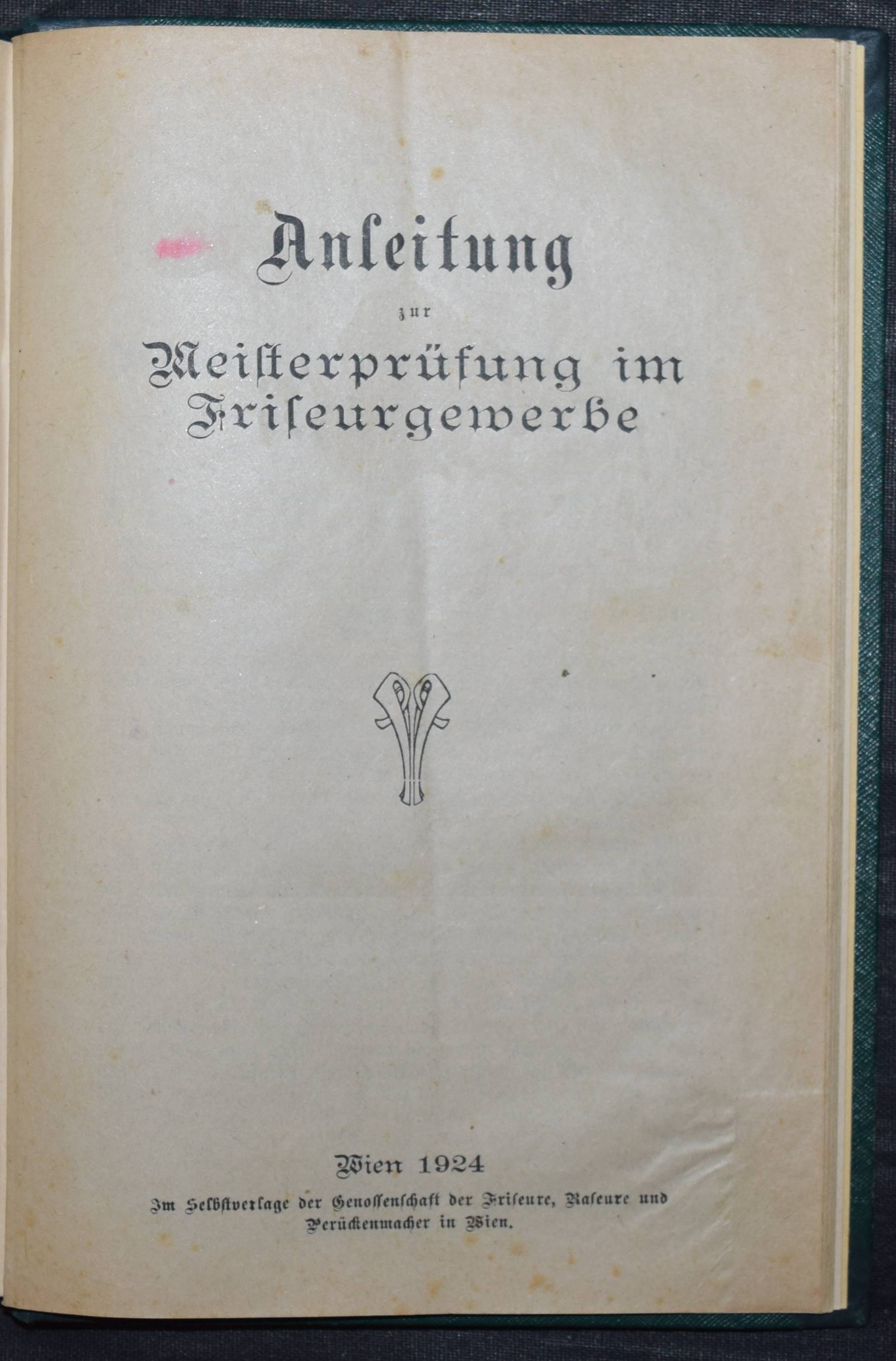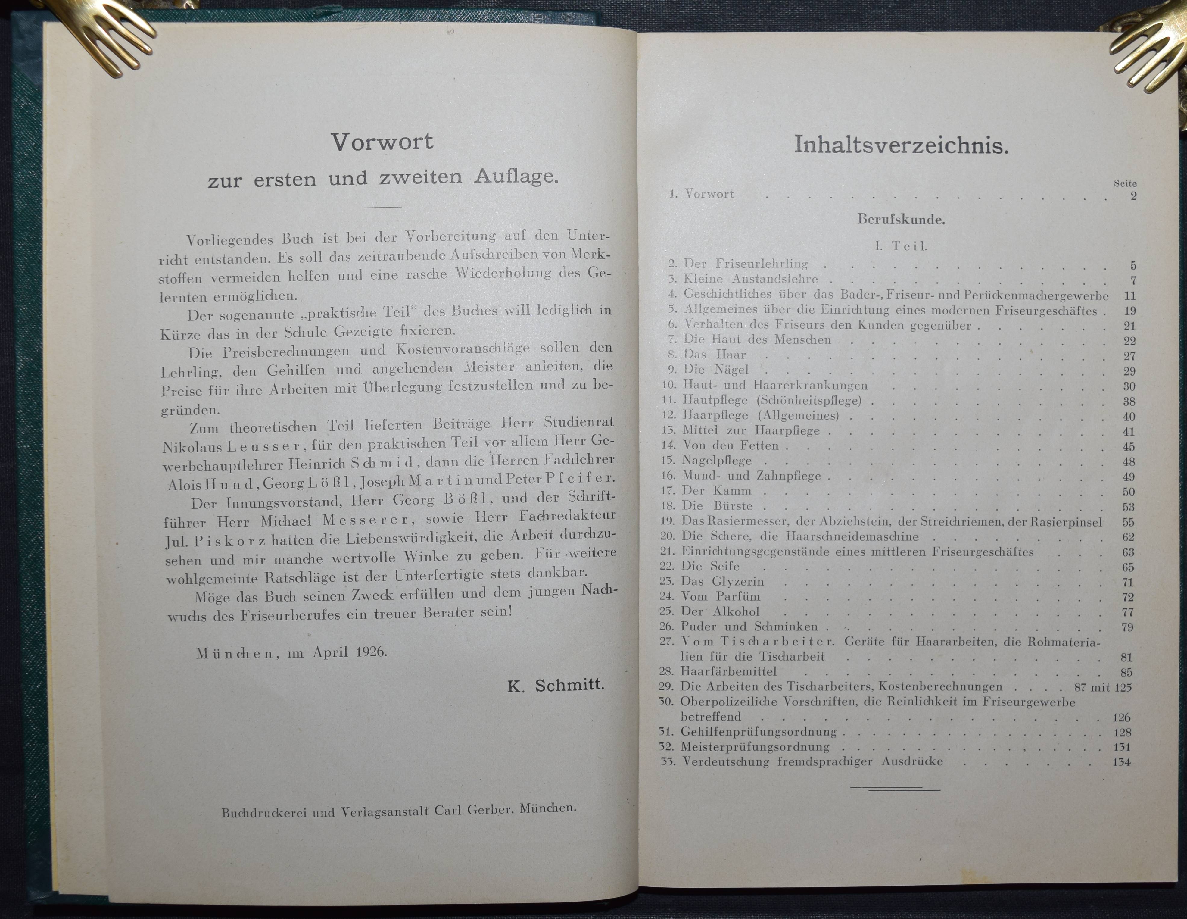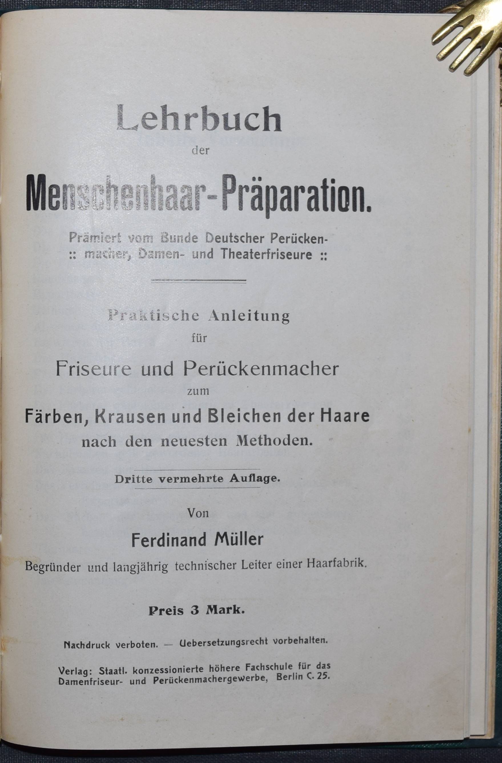 Schmitt, Karl, Nikolaus Leusner und Heinrich Schmid ( Bearb.). Berufskunde für Friseure und Perückenmacher. 2. verb. Aufl. München, Beckstein 1926. 8°. 135 S. mit zahlr. Abb. im Text. Hln. d. Zeit mit goldgepr. Rückentitel. Beigebunden: Müller, Lehrbuch der Menschenhaar-Präparation. Praktische Anleitung für Friseure und Perückenmacher zum Färben, Krausen und Bleichen der Haare nach den neuesten Methoden. 3. verm. Aufl. Berlin, Staatl. konzess. höhhere Fachschule für das Damenfriseur- u. Perückenmachergewerbe. O. J. (um 1925). 77 S., 10 Bl. – Beigebunden: Anleitung zur Meisterprüfung im Friseurgewerbe. Wien, Genossenschaft der Friseure, Raseure und Perückenmacher 1924. 32 S. – N. a. V. u. T., insgesamt sehr gut erhalten.