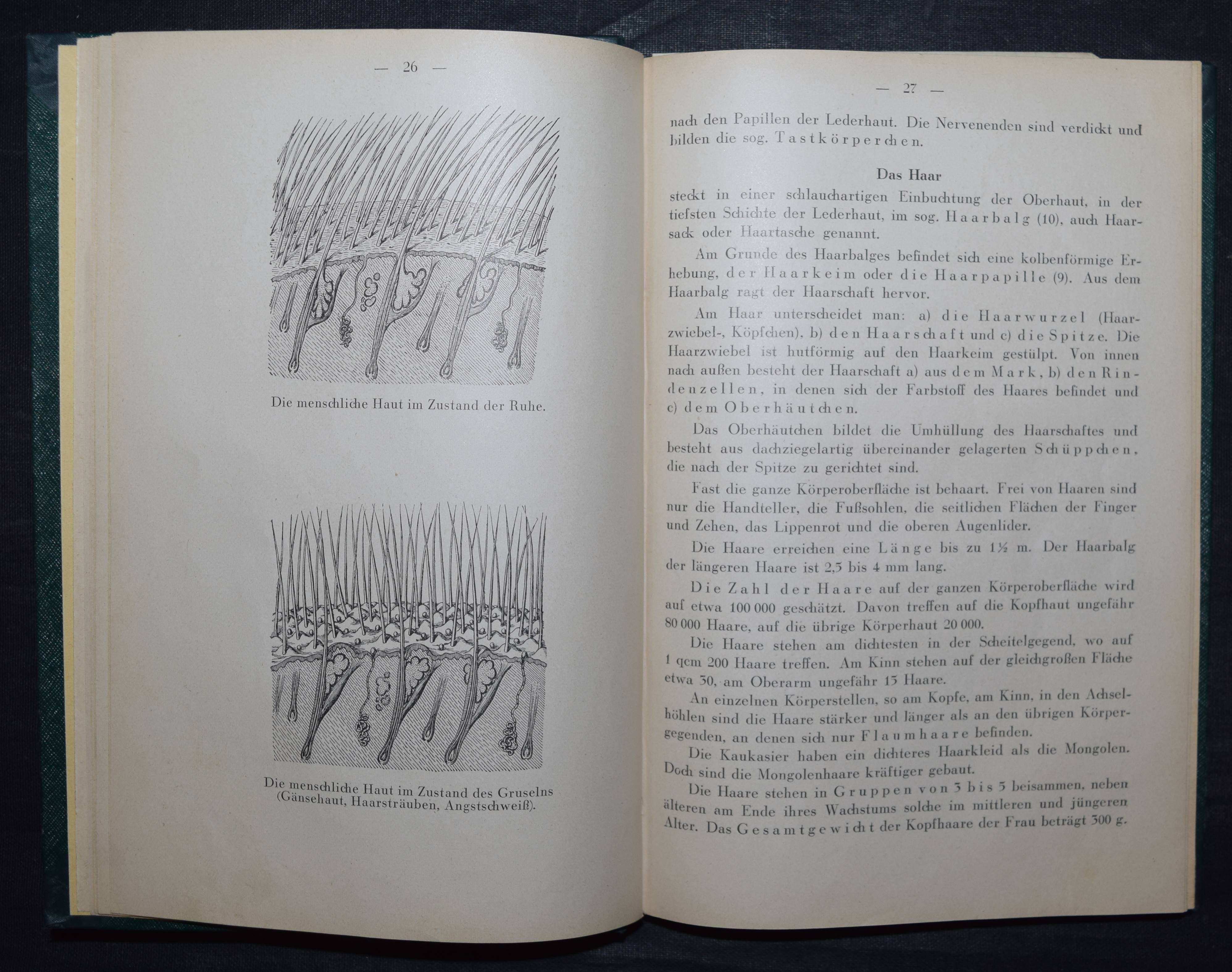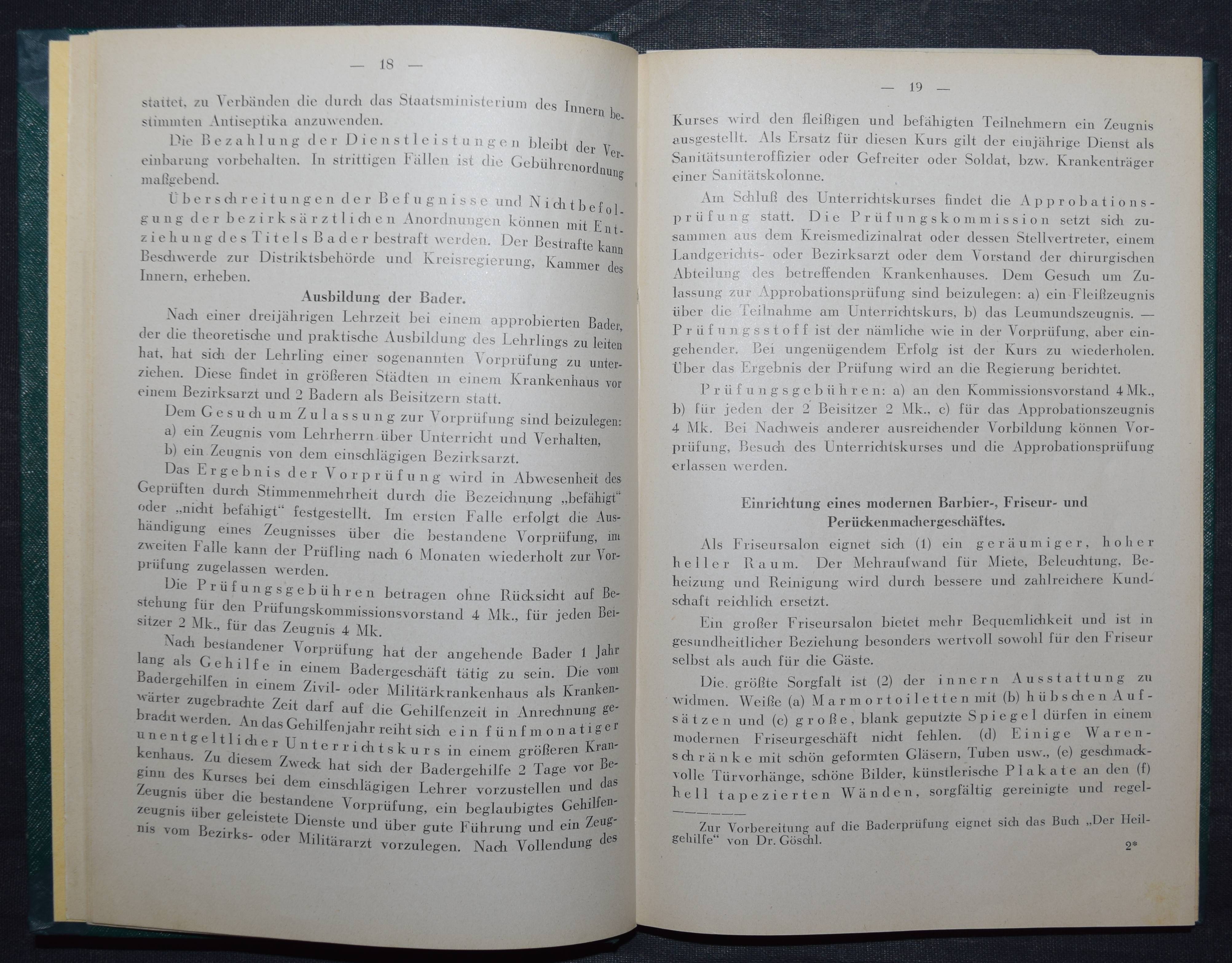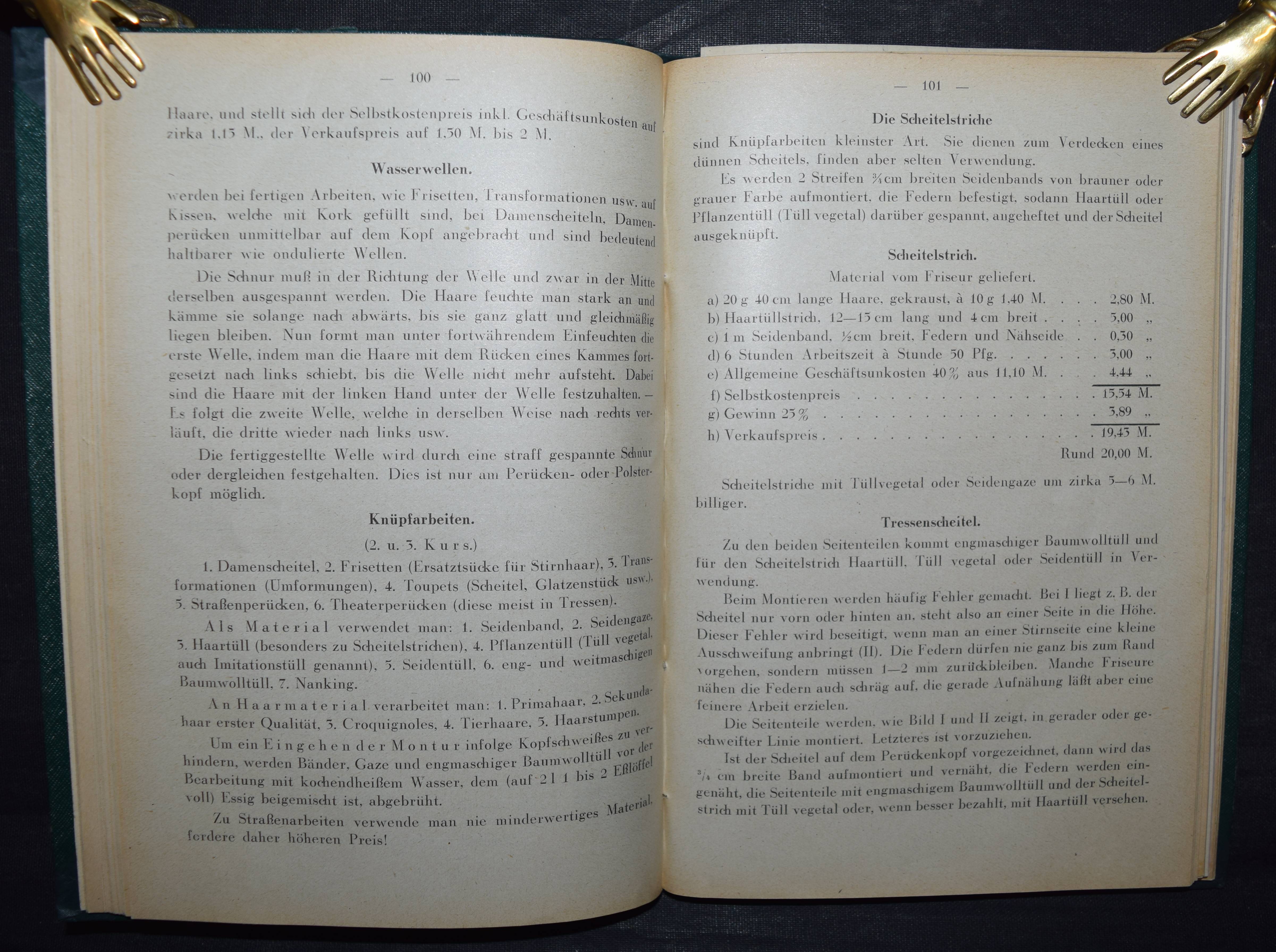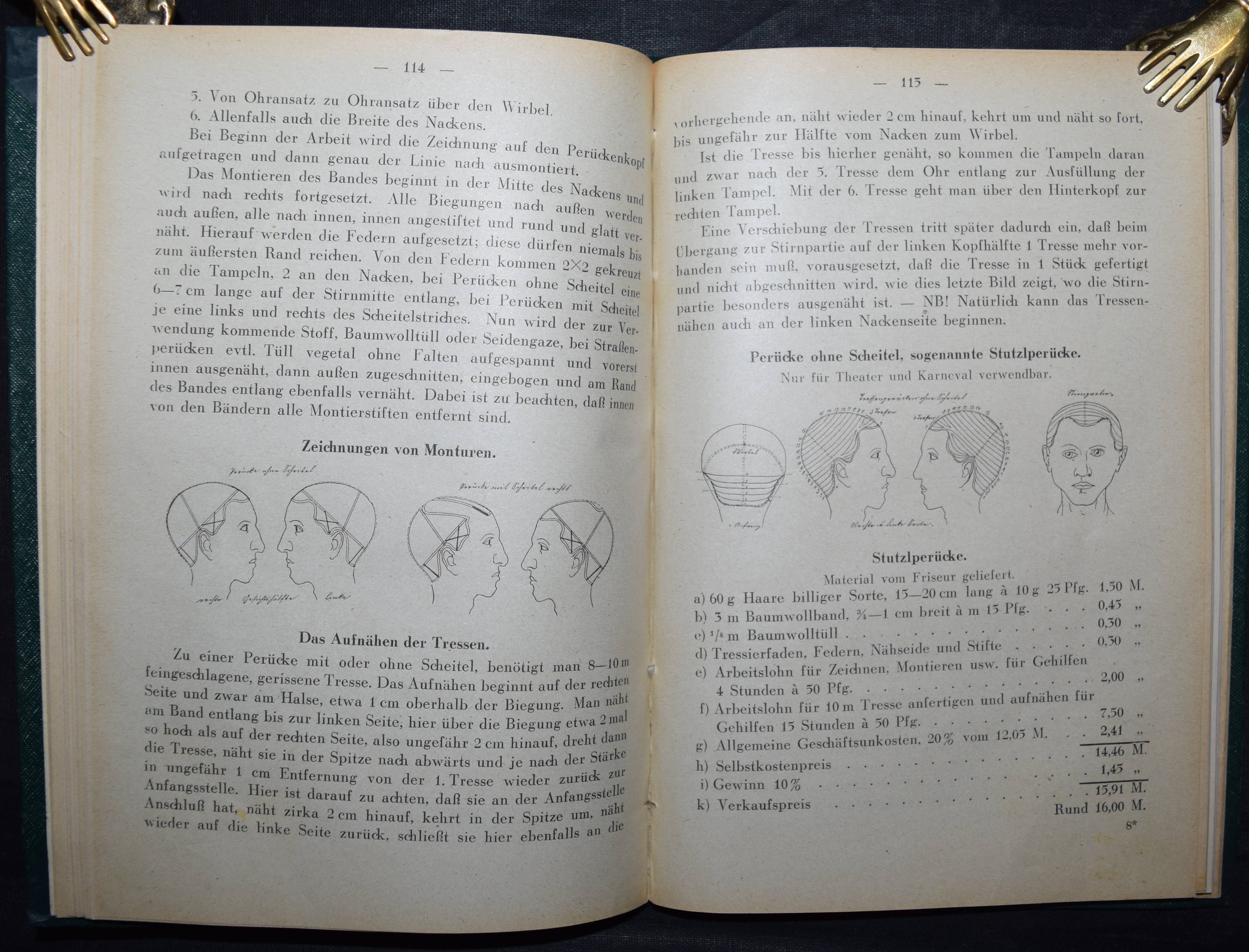 Schmitt, Karl, Nikolaus Leusner und Heinrich Schmid ( Bearb.). Berufskunde für Friseure und Perückenmacher. 2. verb. Aufl. München, Beckstein 1926. 8°. 135 S. mit zahlr. Abb. im Text. Hln. d. Zeit mit goldgepr. Rückentitel. Beigebunden: Müller, Lehrbuch der Menschenhaar-Präparation. Praktische Anleitung für Friseure und Perückenmacher zum Färben, Krausen und Bleichen der Haare nach den neuesten Methoden. 3. verm. Aufl. Berlin, Staatl. konzess. höhhere Fachschule für das Damenfriseur- u. Perückenmachergewerbe. O. J. (um 1925). 77 S., 10 Bl. – Beigebunden: Anleitung zur Meisterprüfung im Friseurgewerbe. Wien, Genossenschaft der Friseure, Raseure und Perückenmacher 1924. 32 S. – N. a. V. u. T., insgesamt sehr gut erhalten.