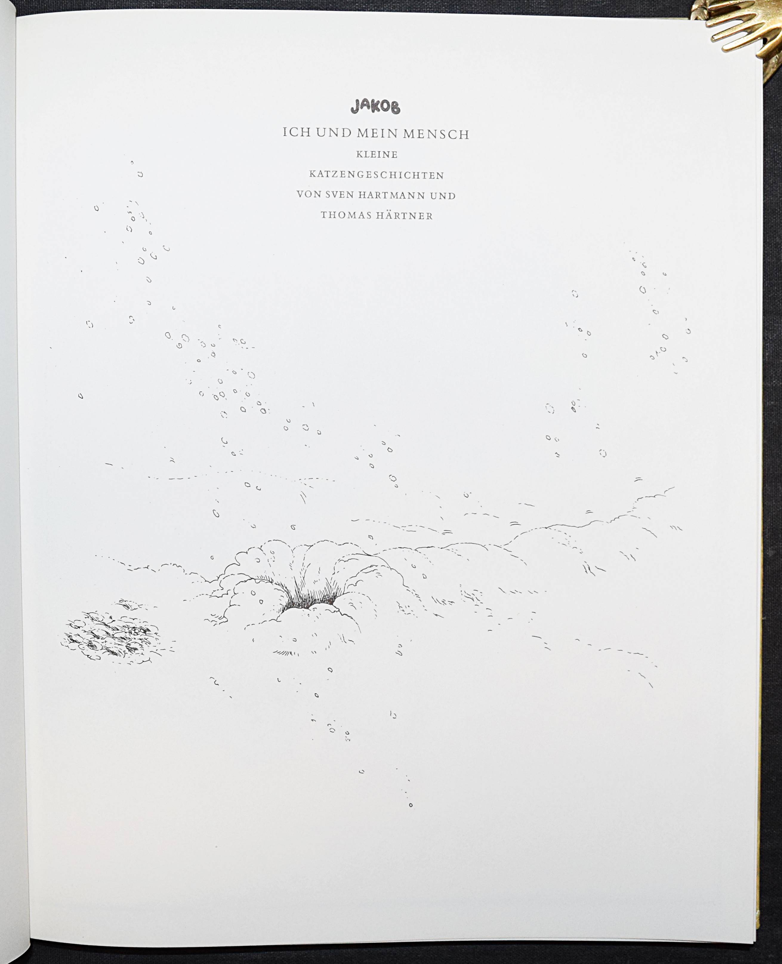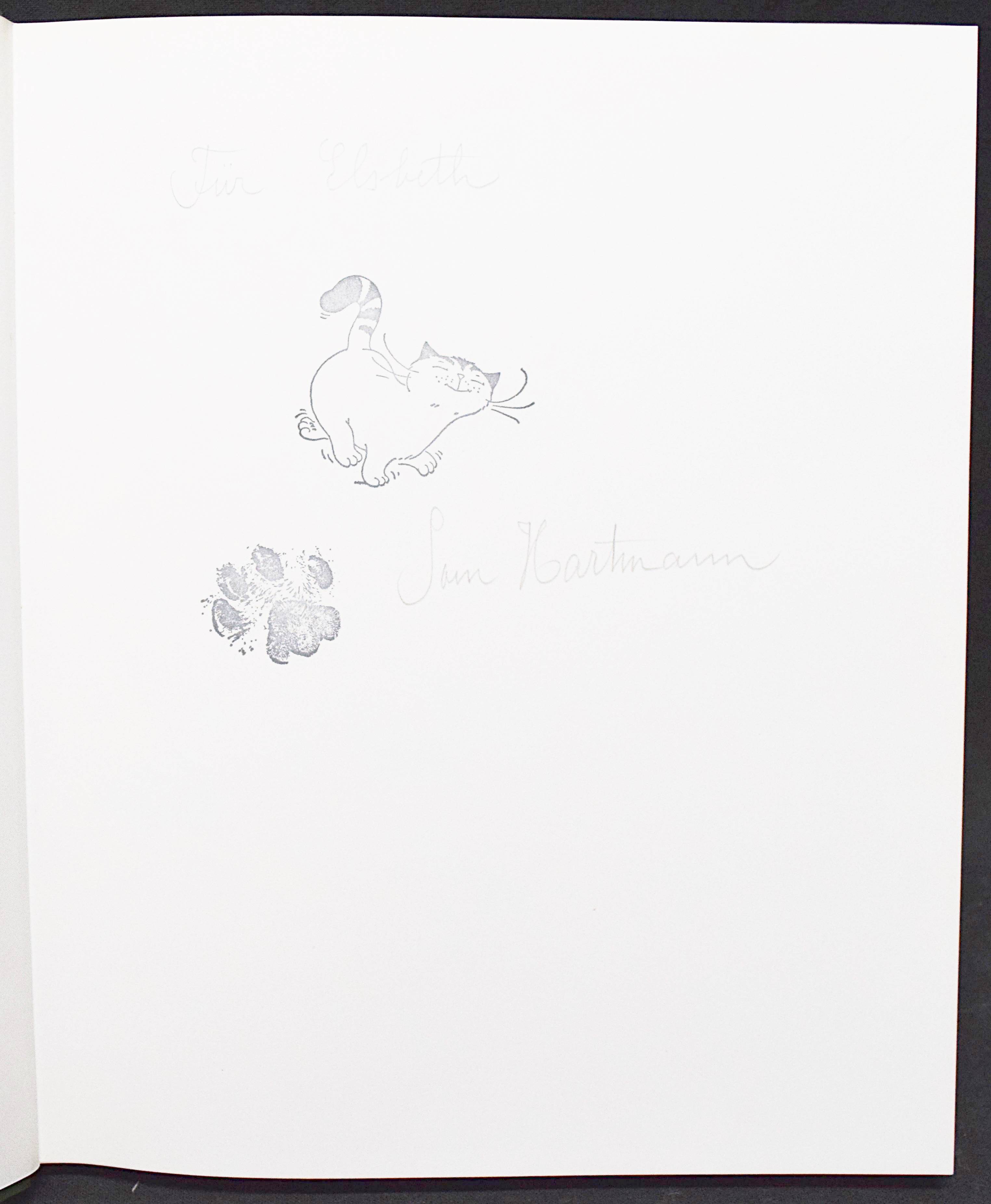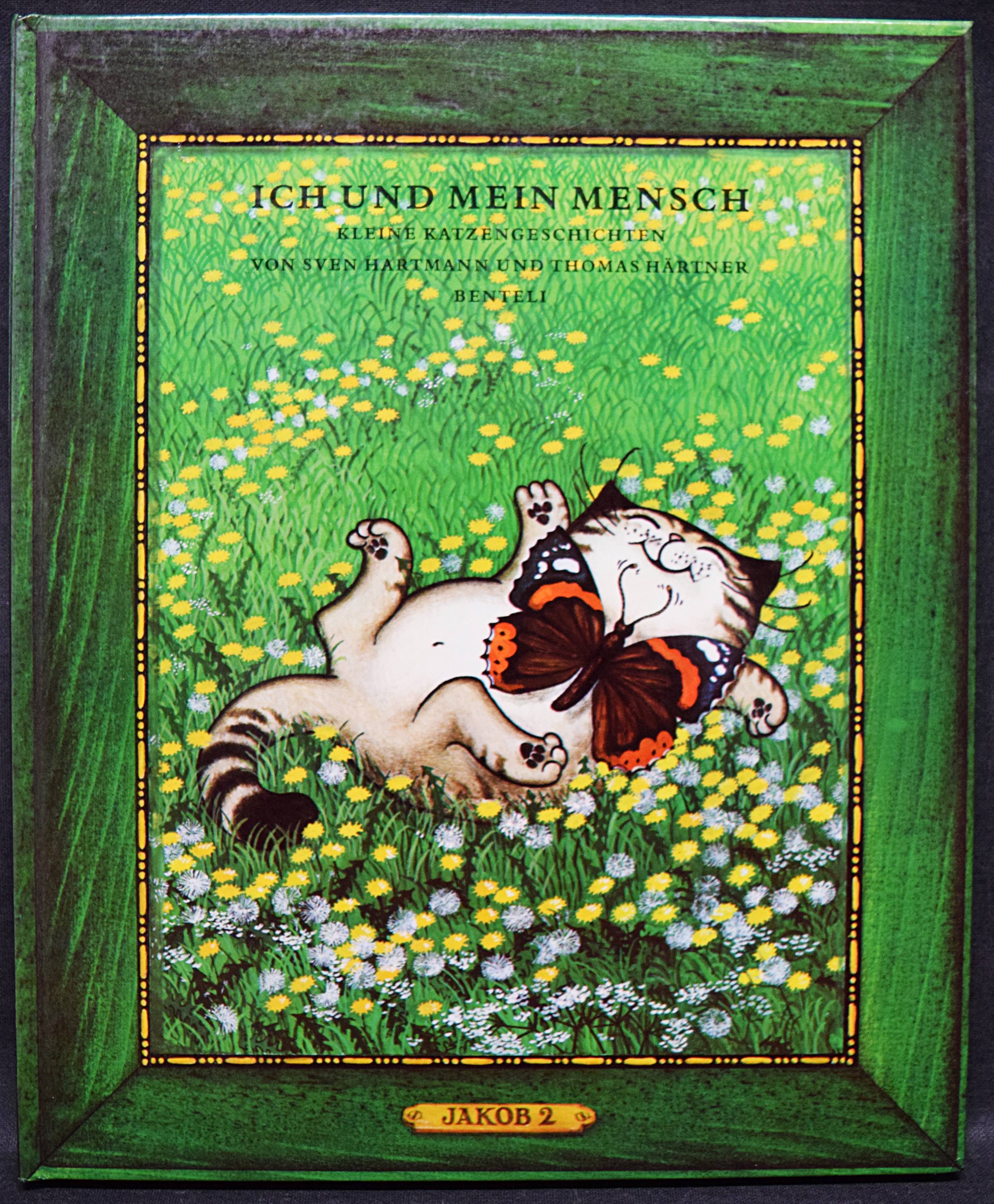 Hartmann, Sven u. Thomas Härtner. Jakob. Ich und mein Mensch. Kleine Katzengeschichten. Bern, Benteli 1977. 4°. 79, (1) S. mit teils farb. Illustrationen. Farbig illustr. OPbd. (Jakob, Band 2). Erste Ausgabe. – Mit eigenhändiger Widmung S. Hartmann auf dem vord. freien Vorsatzblatt. – Sehr gutes Exemplar.