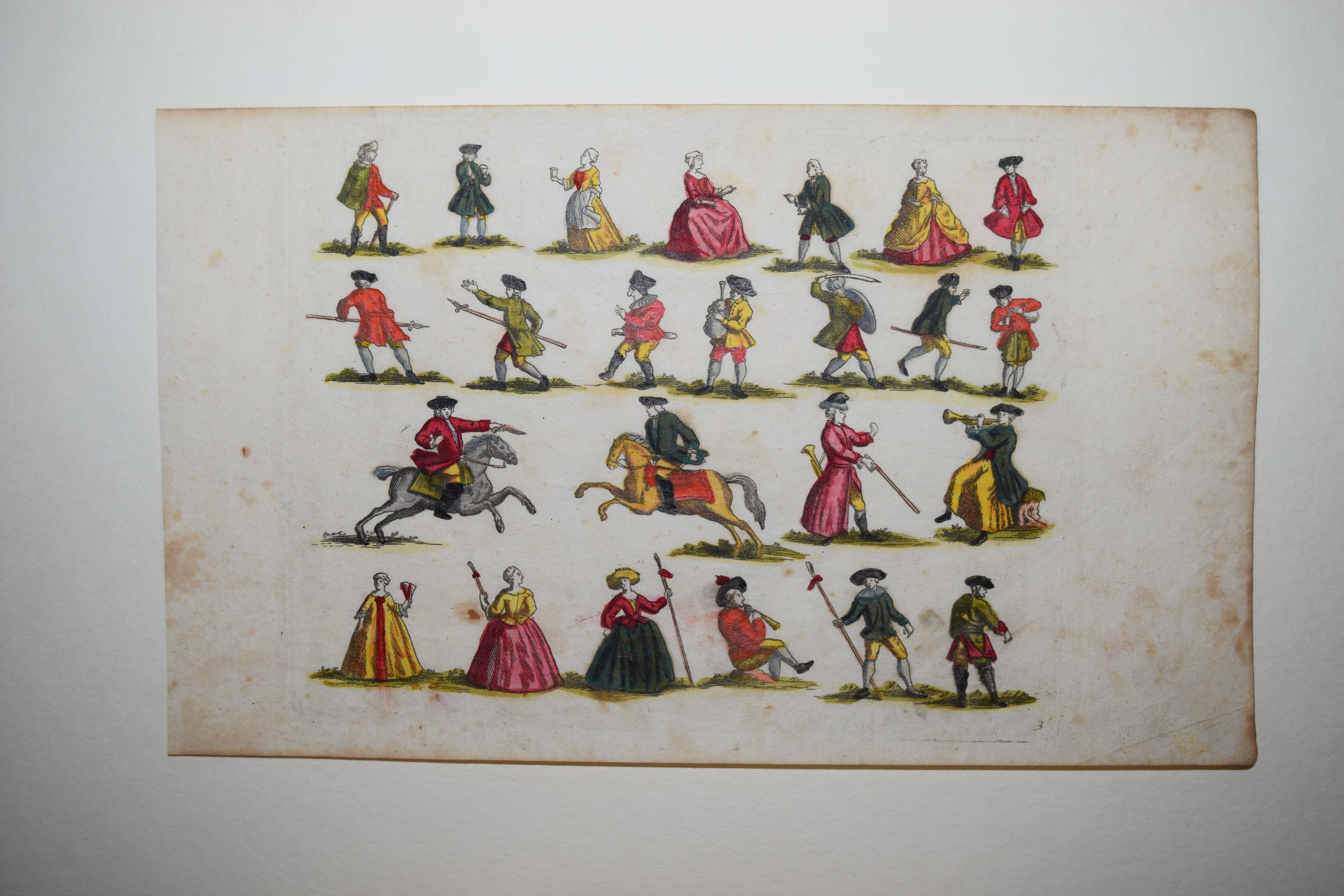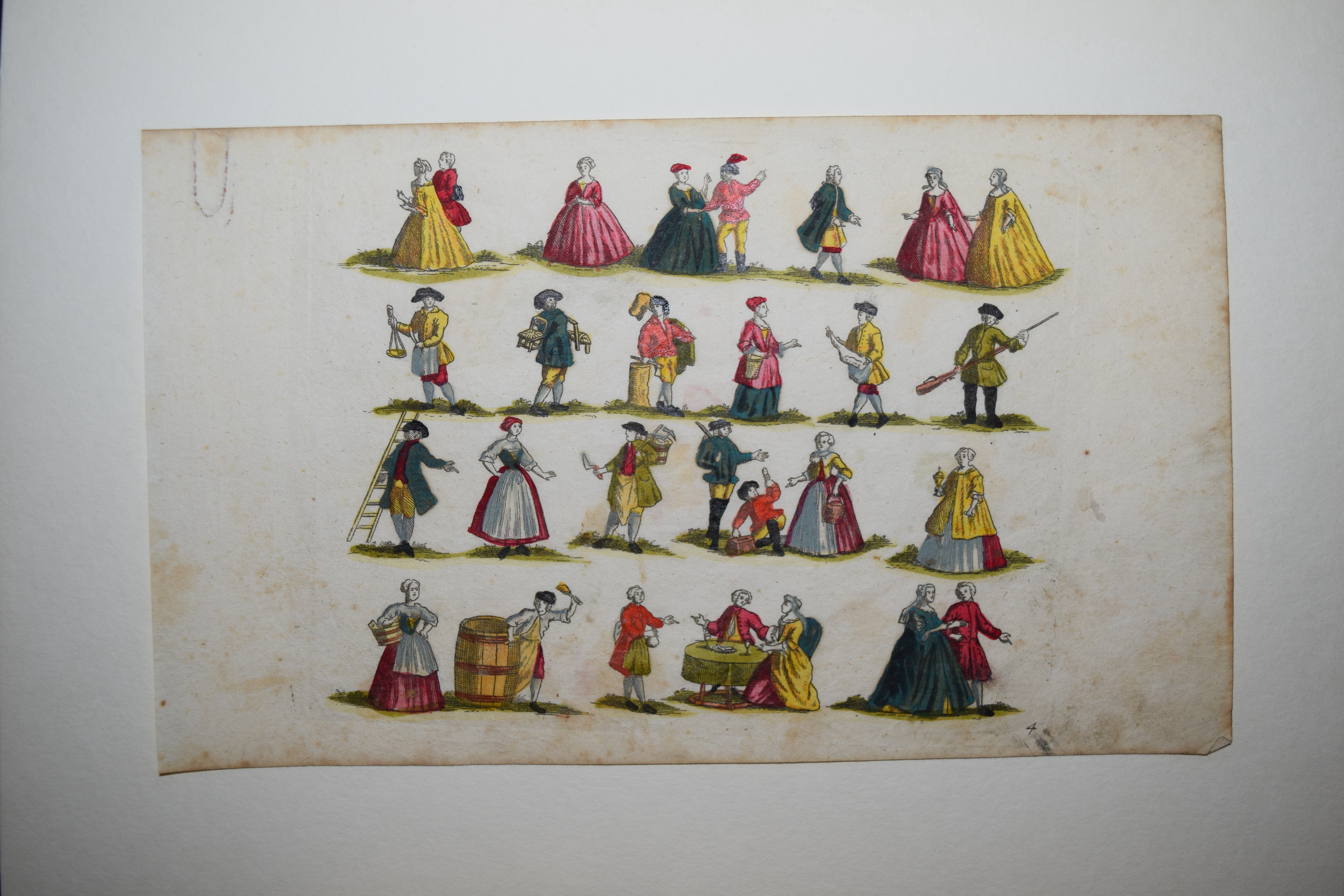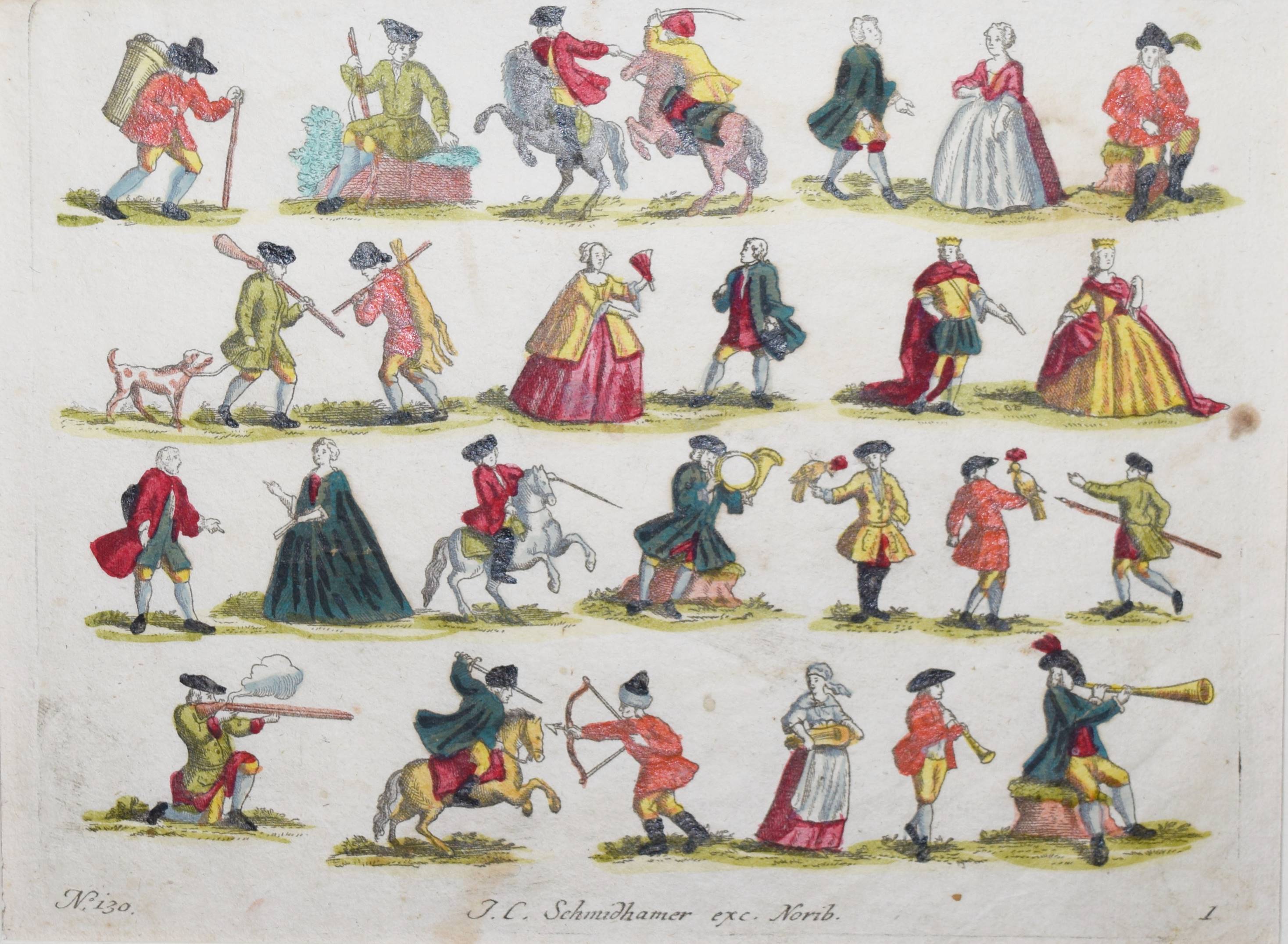 Bilderbogen – Nürnberger Bilderbogen. 4 altkol. num. Kupferstiche aus der Folge Nr. 130 mit je 24 bis 28 Personendarstellungen. Nürnberg, J. C. Schmidham(m)er o. J. (um 1750). Je ca. 16 x 26,5 cm. Mit Fälzchen in den oberen Ecken hinter Passepartouts montiert. Bl. 1 mit der gestoch. Bezeichnung „J. C. Schmidhamer exc. Norib.“ (vgl. Thieme-B. XXX, 131: „Kunstverleger [und Stecher ?] in Nürnberg, um 1750). – Die Darstellungen in schönem Altkolorit zeigen Personen verschiedenster sozialer Schichten und Professionen: Jäger u. Falkner, Musiker, Reiter, galante Paare, Akrobaten u. Pierrot, ambulante Händler, Küfer, Mundschenk, König u. Königin u.v.a. – Stock- u. fingerfl., das erste Bl. mit Rostspur im weißen Rand und oben teils bis zum Plattenrand beschnitten.