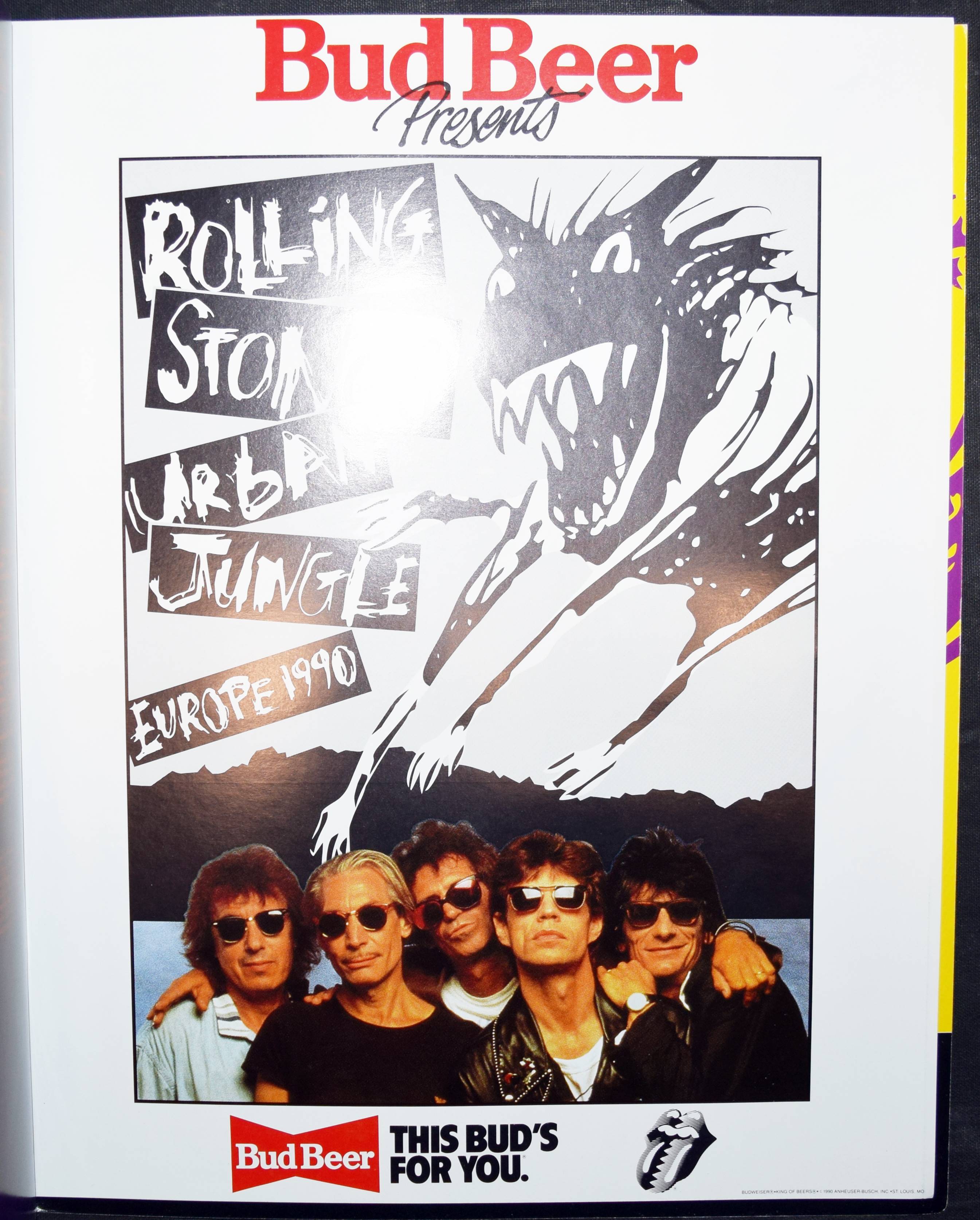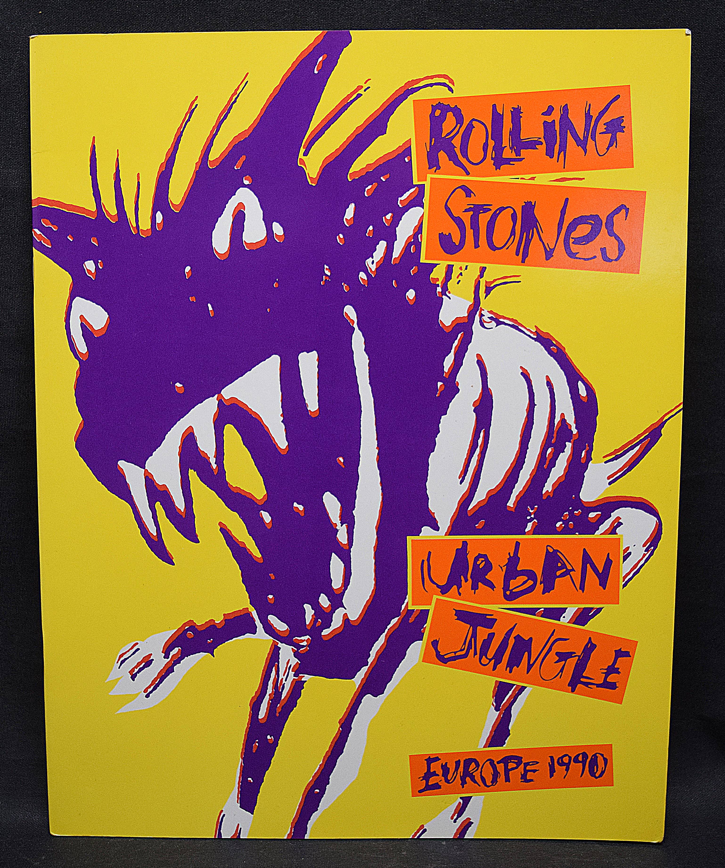 Rolling Stones – Urban Jungle Tour, Europe 1990. Orig.-Programmheft. (Amsterdam), Musidor B. V. 1990. 4°. [12] Bl. mit teils ganzs. farb. Abb. u. farbig illustr. Beilage: „Bud Beer presents…“ Farbig illustr. OKart. Mit einer farbig illustr. Discographie. – Tadellos.