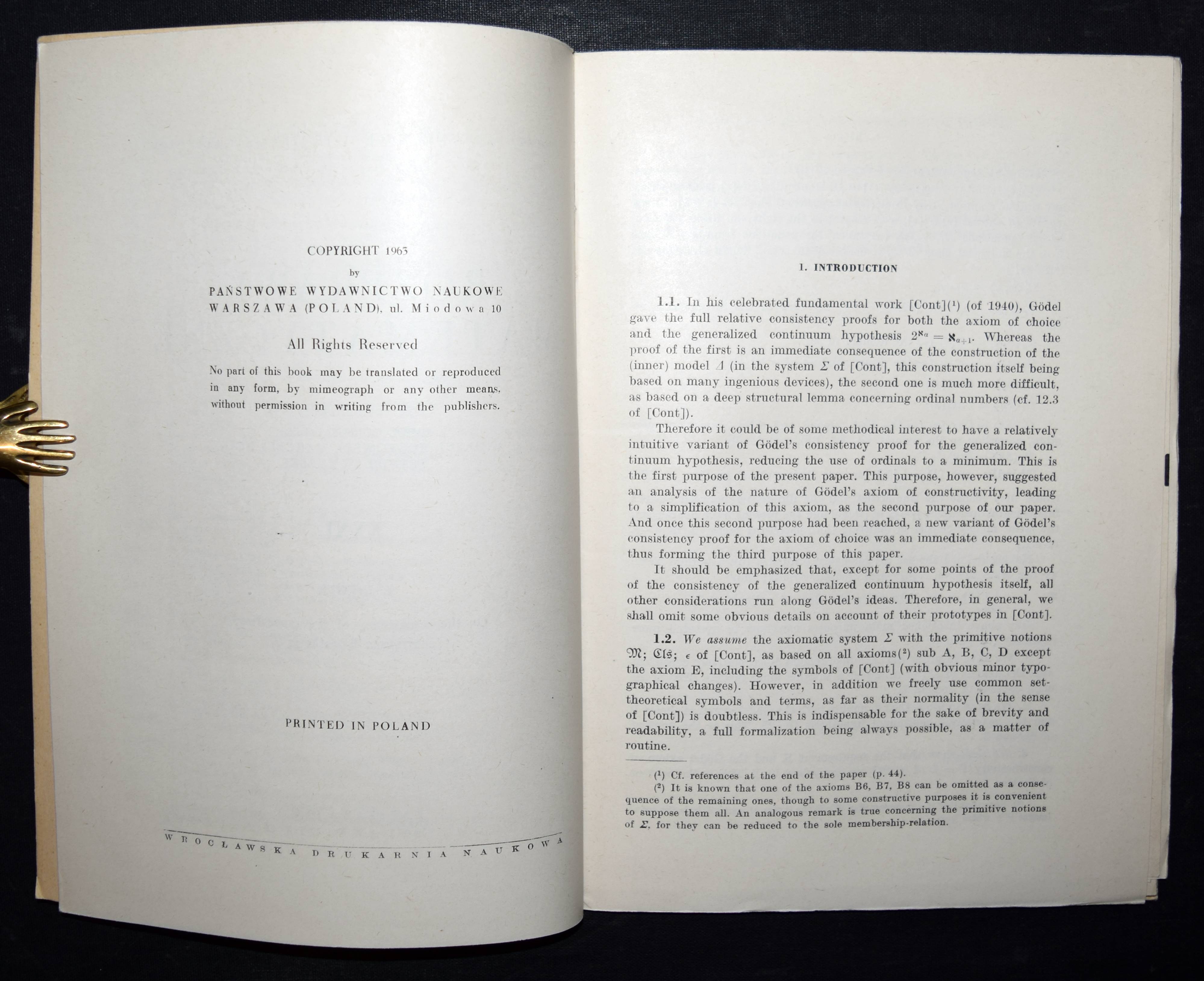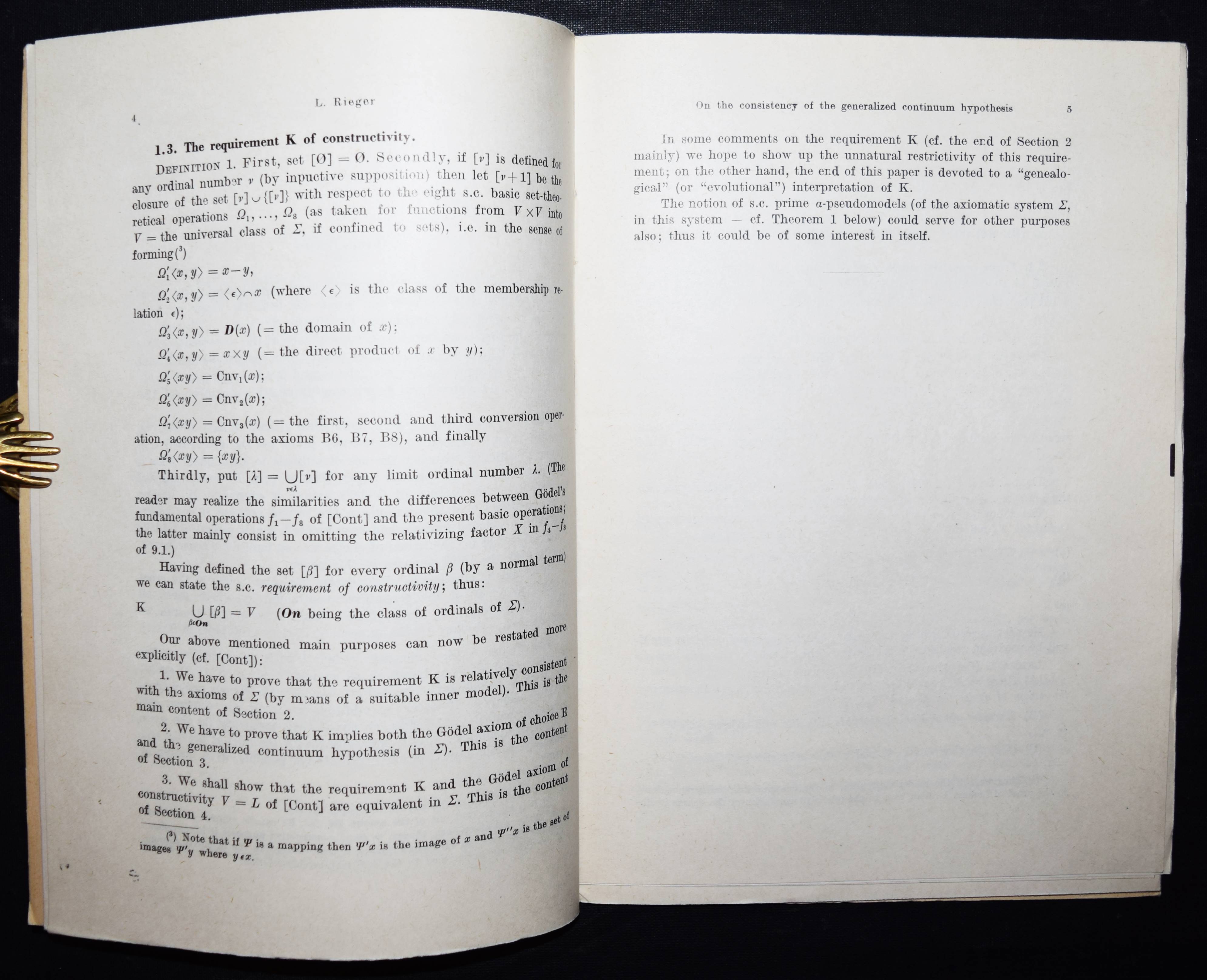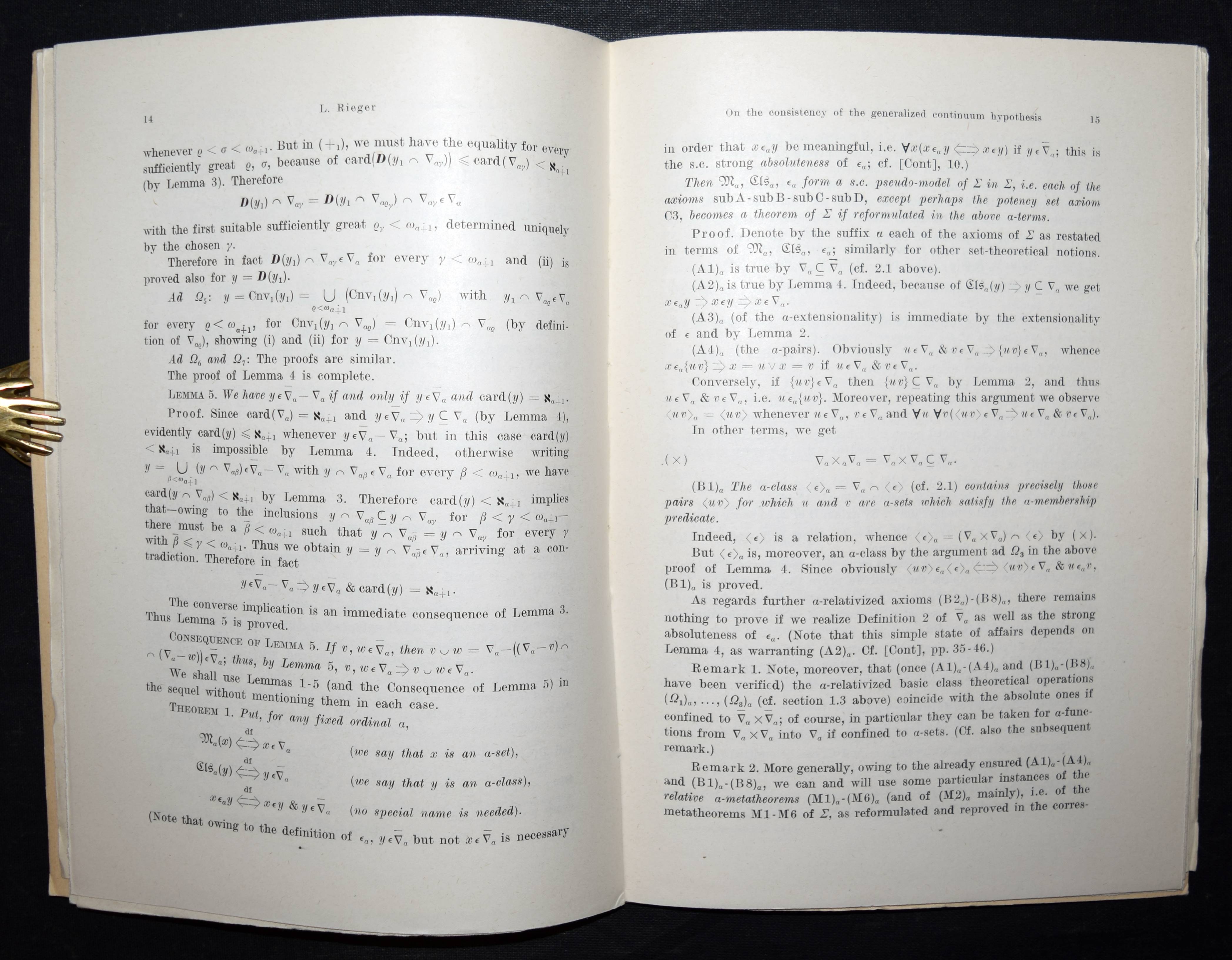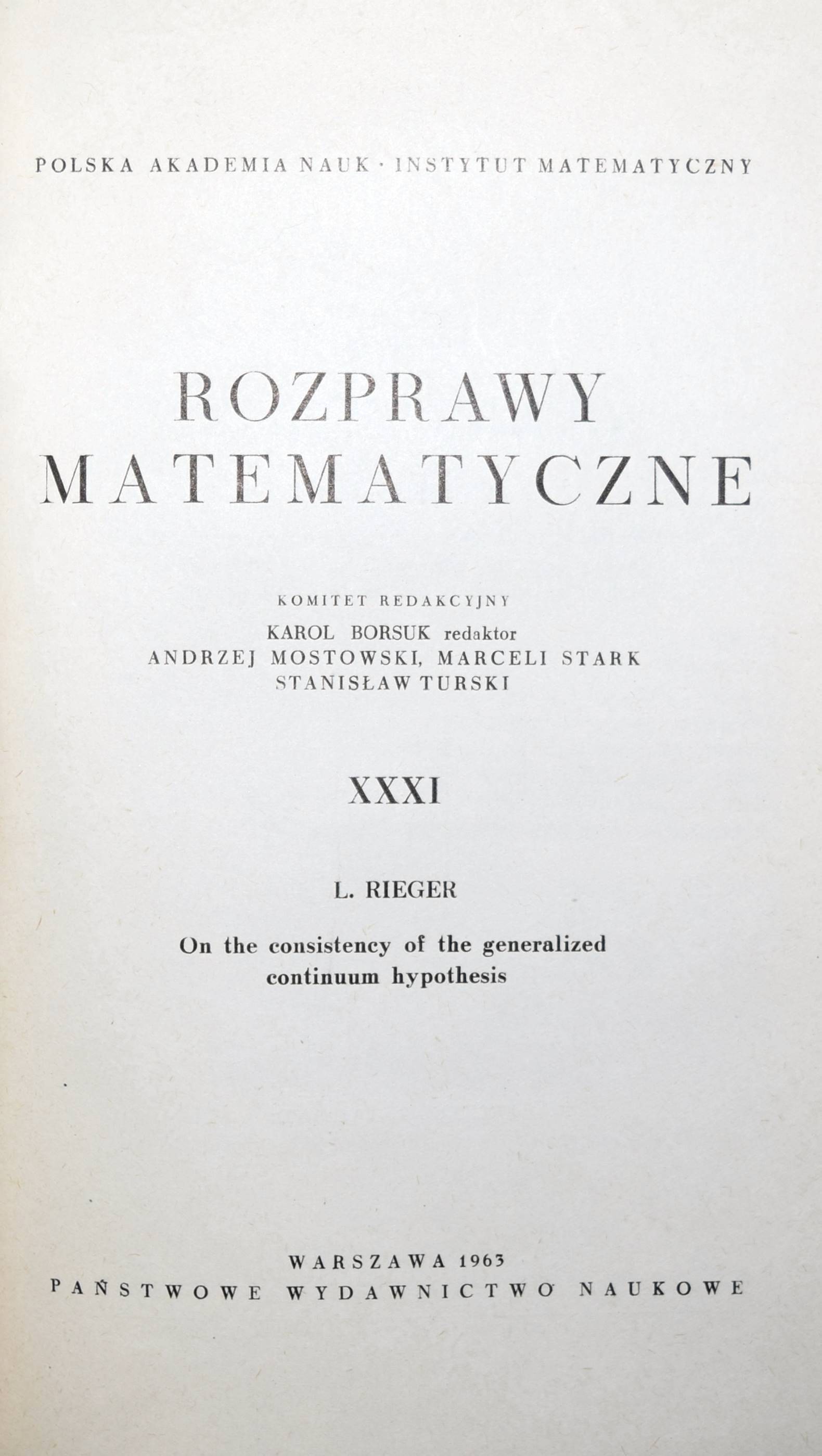 Rieger, L(adislav Svante). On the consistency of the generalized continuum hypothesis. Warszawa (Warschau), Panstwowe Wydawnictwo Naukowe 1963. Gr.-8°. 43, (1) S. OKart. (Rozprawy matematyczne, XXXI). Erste Ausgabe, selten. – „Ab 1954 hat er sich intensiv mit der v. Neumann-Bernays-Gödelschen axiomatischen Mengentheorie beschäftigt und z.B. einen neuen Beweis der relativen Widerspruchsfreiheit des Auswahlaxioms und der Kontinuumhypothese gegeben“ (S. Gottwald in Lexikon bedeutender Mathematiker S. 397). – Sehr gutes Exemplar.