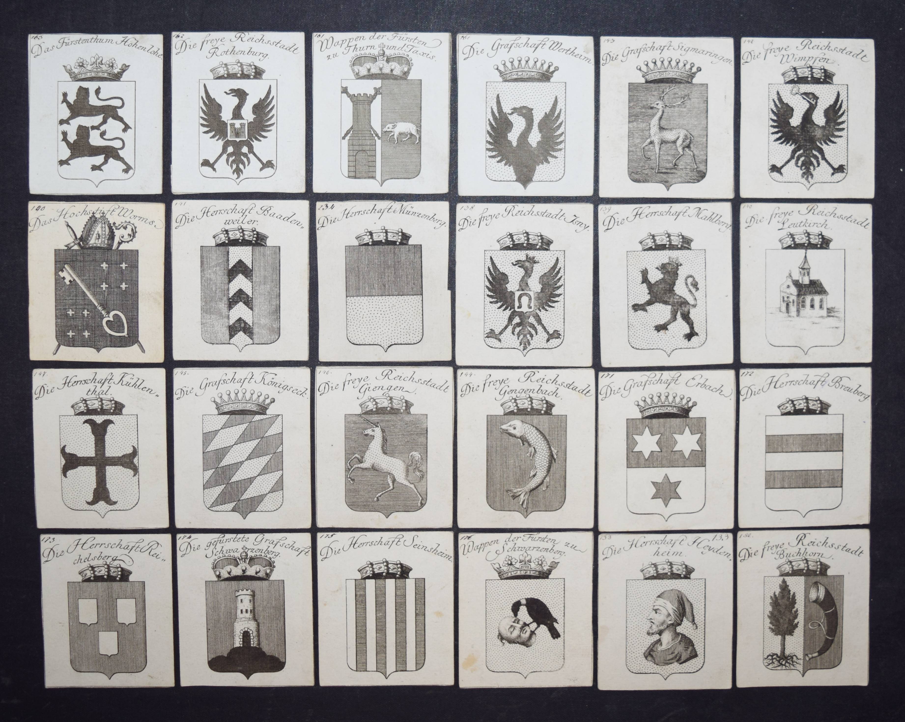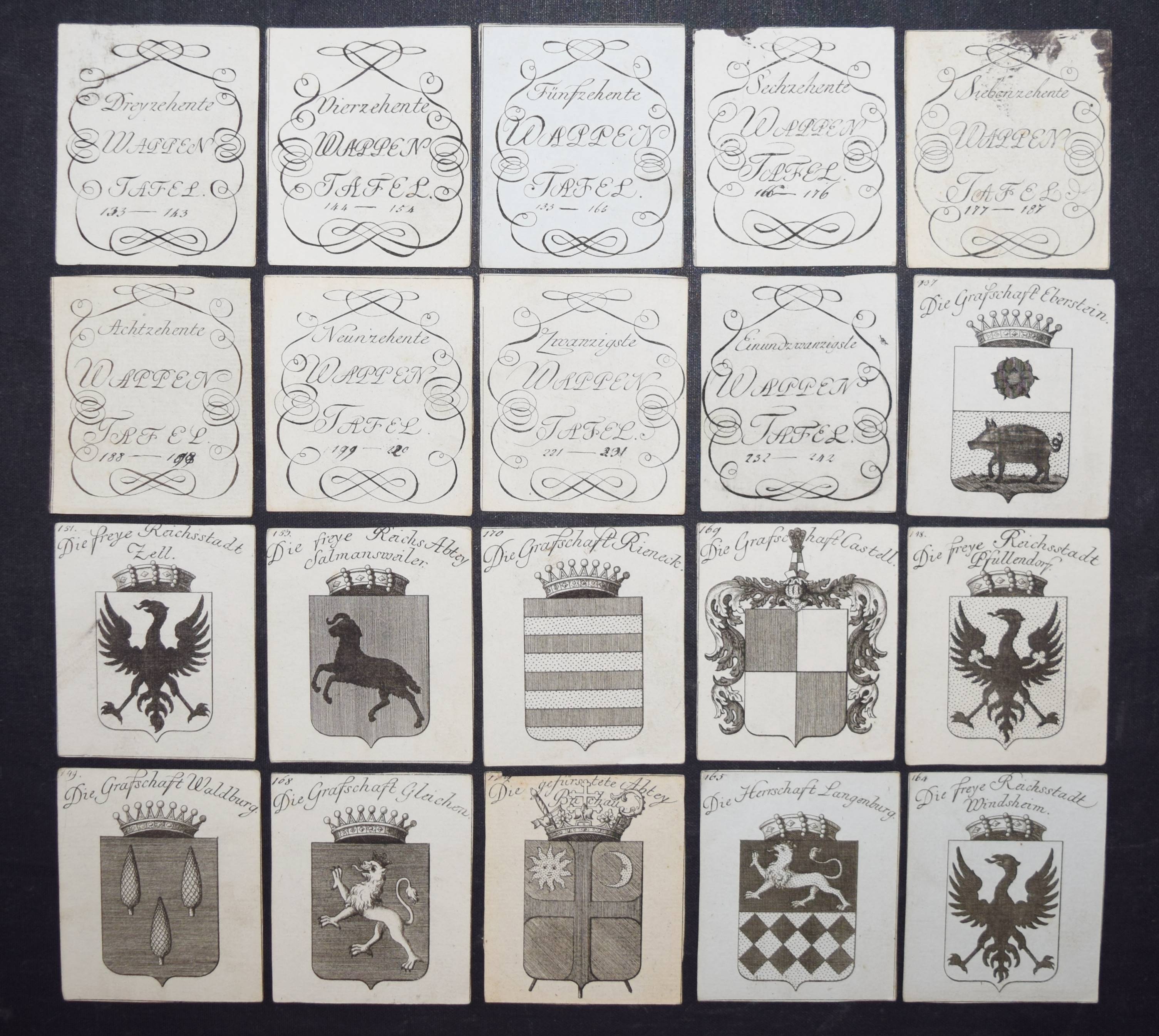 Dreyzehnte (bis) einundzwanzigste Wappen-Tafel. Nr. 133-242. O. O., Dr. u. J. 18. Jahrhundert. 12° (9 x 7 cm.). 104 Kupferstiche auf Karton (9 Titel u. 95 Wappen). Kart.-Umschlag d. Zt. in Pappschuber. Mit Wappen süddeutscher Reichsstädte, Grafschaften und Fürstenhäuser; Gengenbach, Herrschaft Kühlenthal, Herrschaft Münzenberg, Reichsstadt Isny, Grafschaft Eberstein, Hochstift Worms, Herrschaft Badenweiler, Reichsstadt Wimpfen, Graphschaft Sigmaringen, Wappen der Fürsten zu Thurn und Taxis, fürstl. Abtey Buchau, Grafschaft Castell, Hochstift Würzburg, Reichsstadt Kempten, Herzogthum Schwaben, Abtey Kaisersheim, Fürstenthum Zweybrücken, Herzogthum Westphalen, Reichsstadt Worms, Herzogthum Franken u.v.a. – Schuber u. Umschlag berieben, nur vereinzelt leicht braunfl.