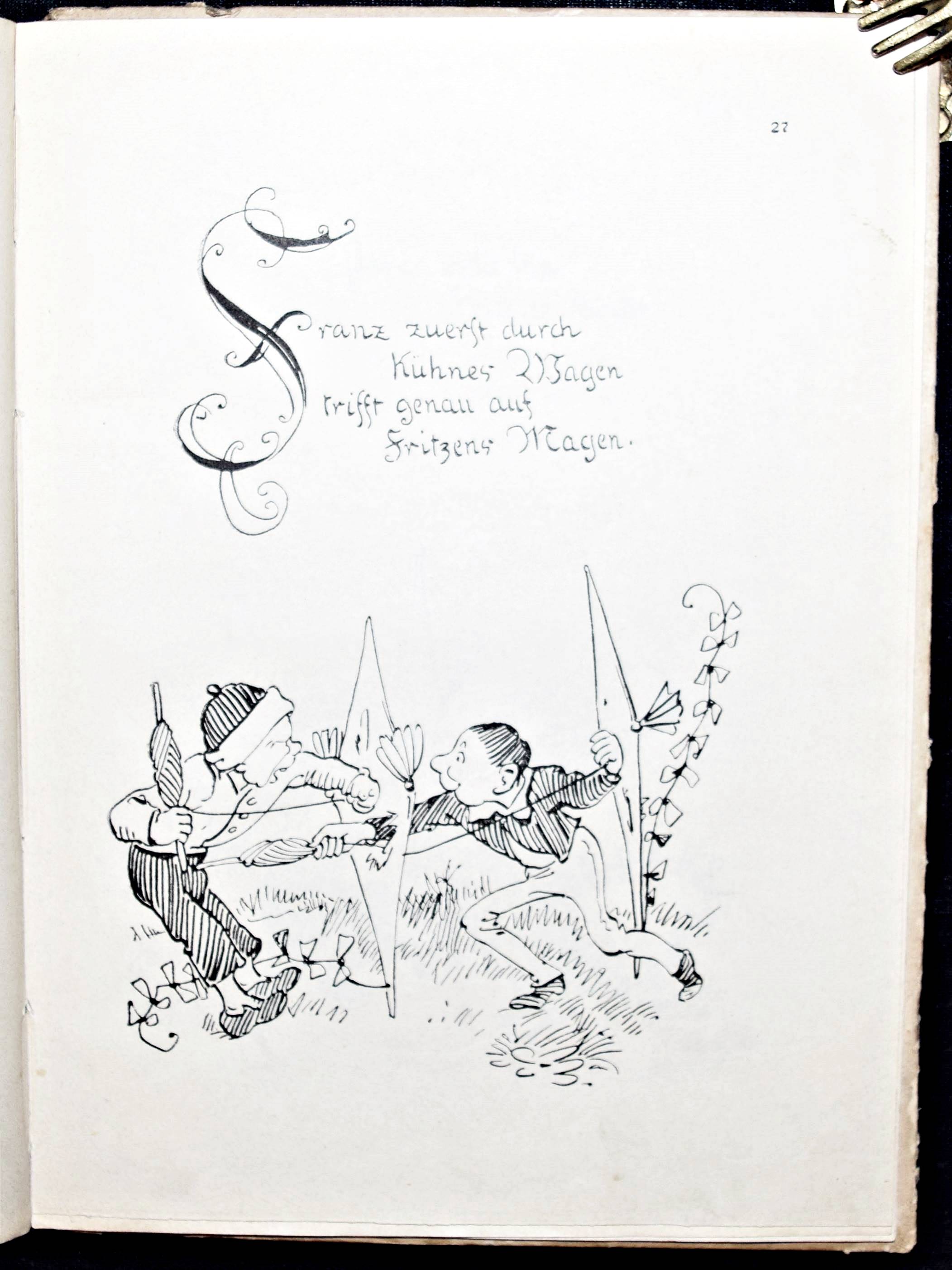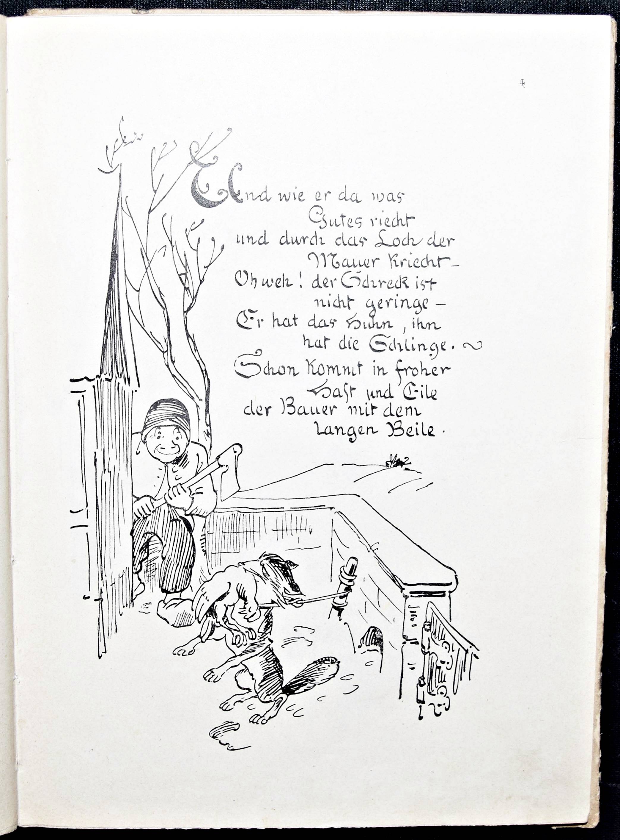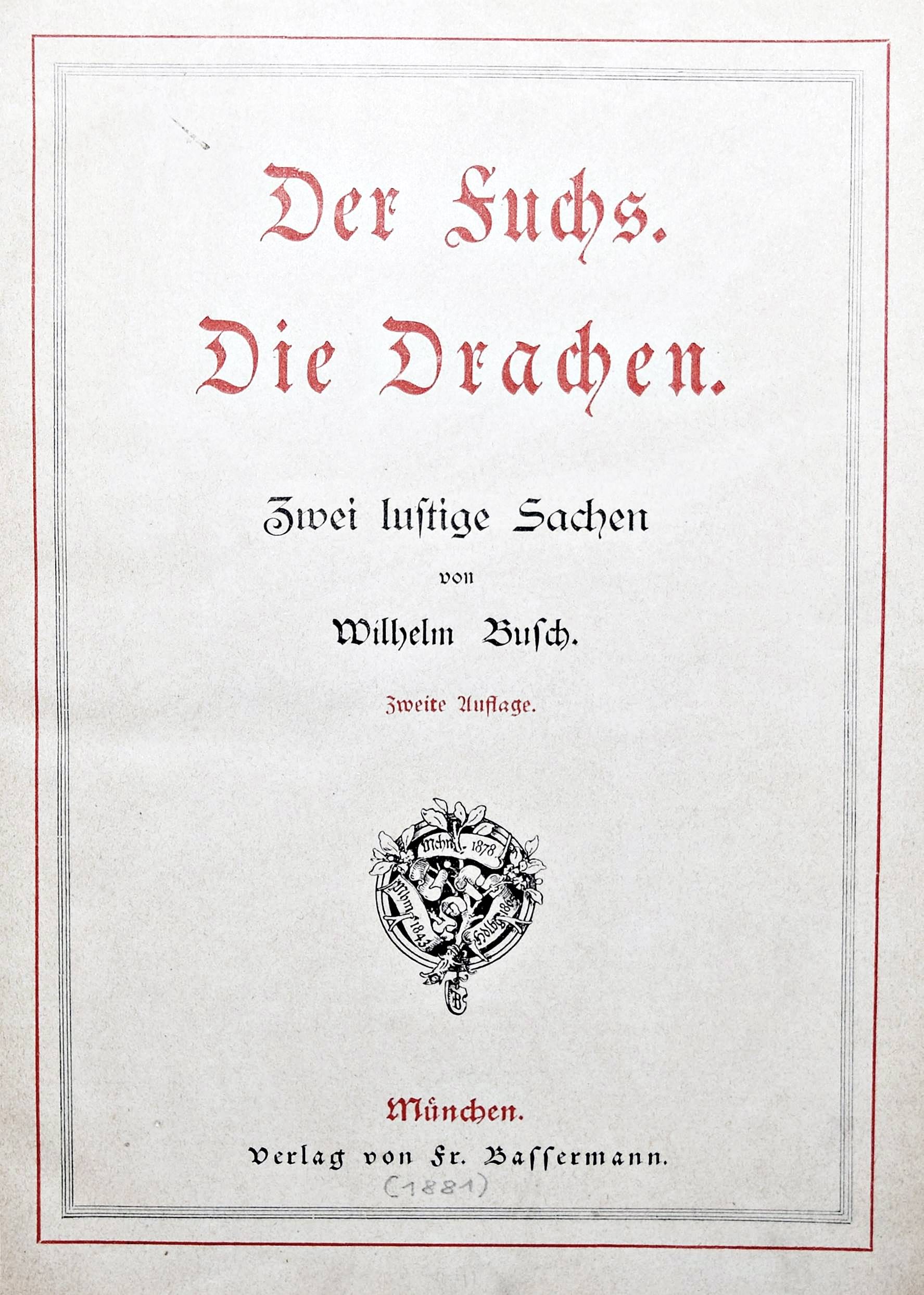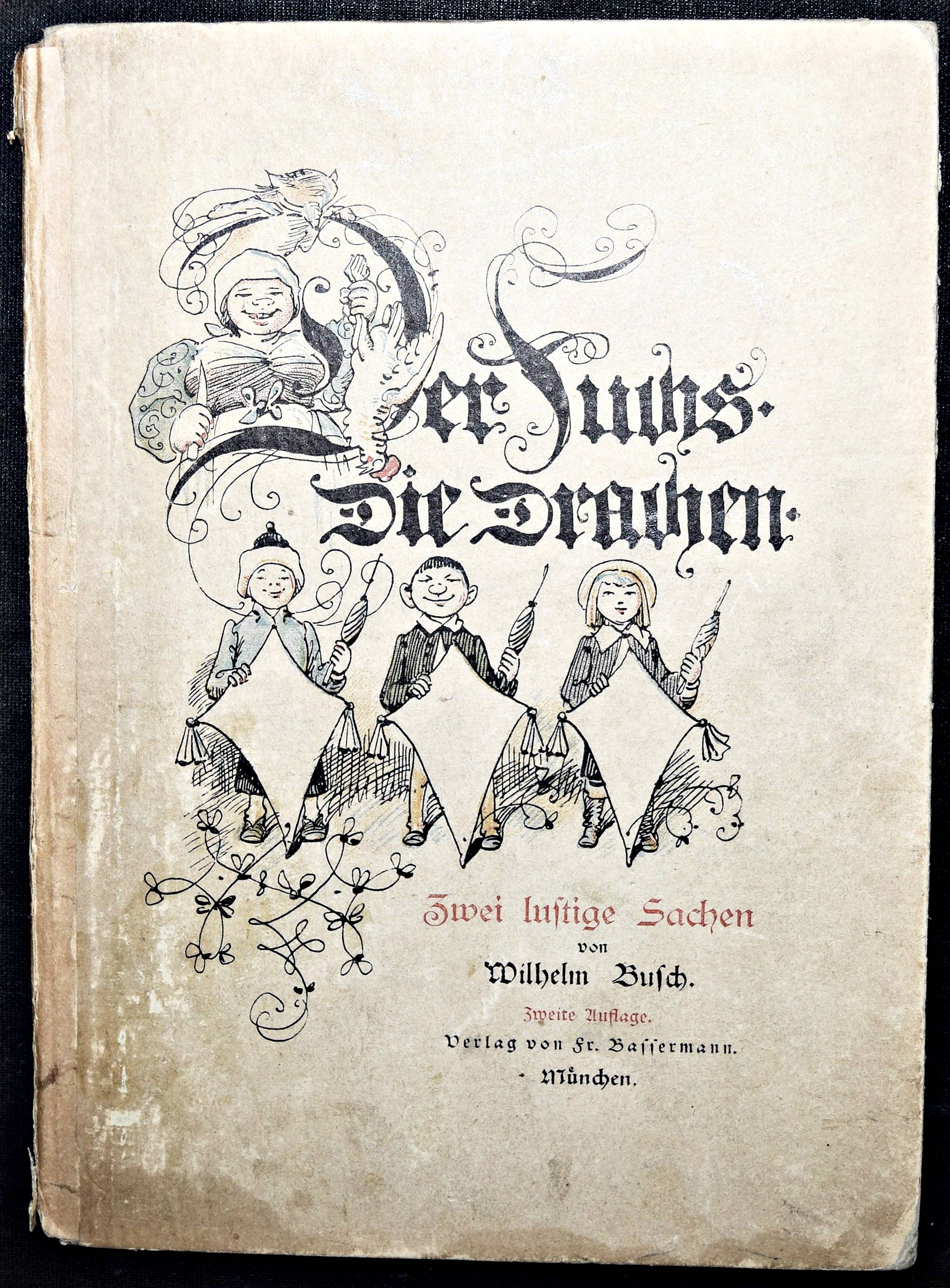 | Busch, Wilhelm. Der Fuchs. Die Drachen. Zwei lustige Sachen. 2. Aufl. München, Bassermann o. J. (1881). 8°. [2] Bl., 37 num. Bl., [1] Bl. mit 38 Zinkotypien. Farbig illustr. OPbd. Ries, Busch III, 1084. Rümann, Illustr. Bücher 205. Vanselow 76. – Eines der seltensten Bilderbücher W. Buschs. – Auch der Text ist von Busch geschrieben und mit den Bildern zusammen klischiert. – Rücken alt mit Papier überklebt, Kapital u. Fuß geringf. beschädigt, Deckel etwas angestaubt u. berieben, zeitgenöss. Widm. auf dem vord. Innendeckel, gutes sauberes Exemplar.