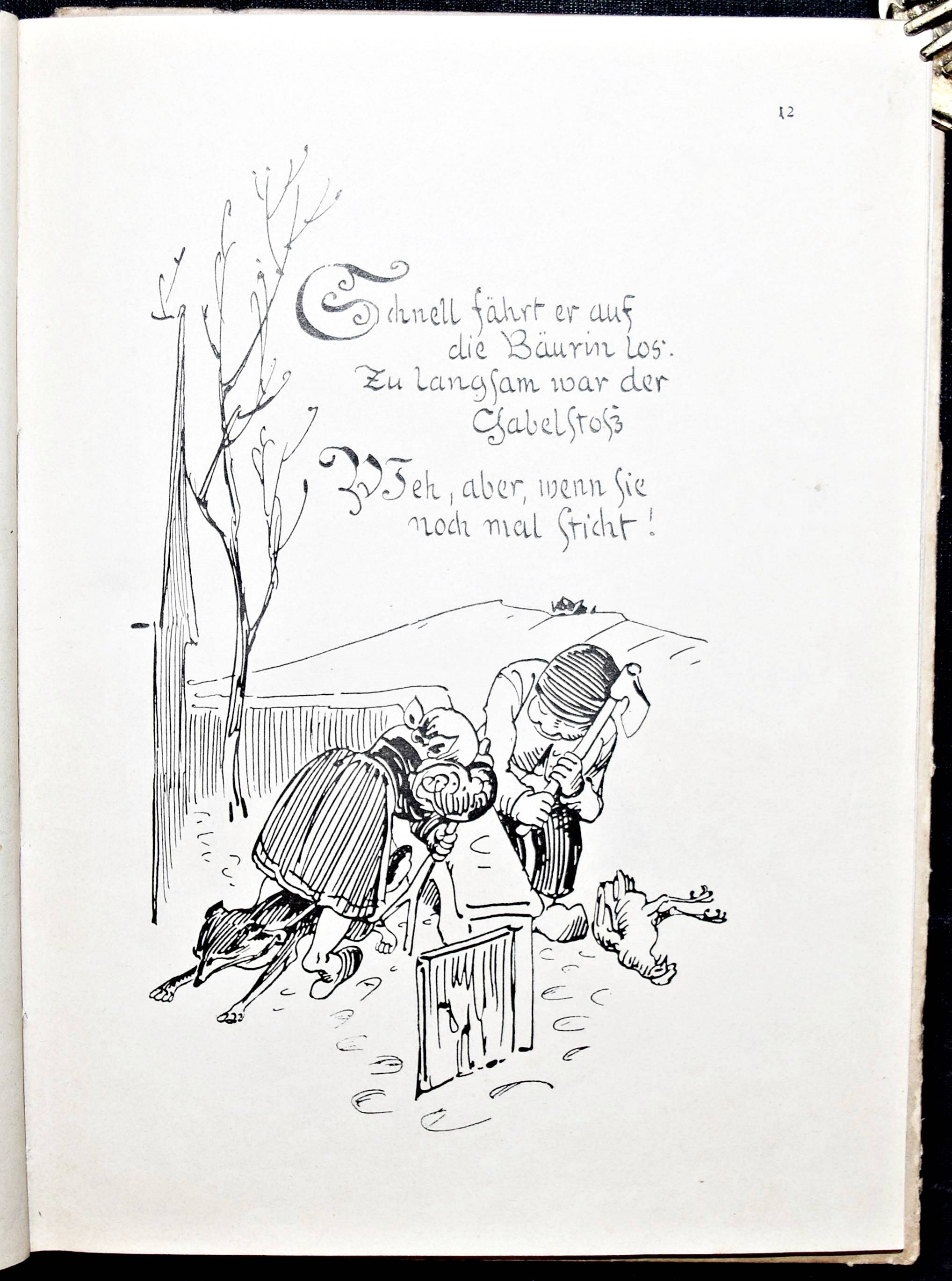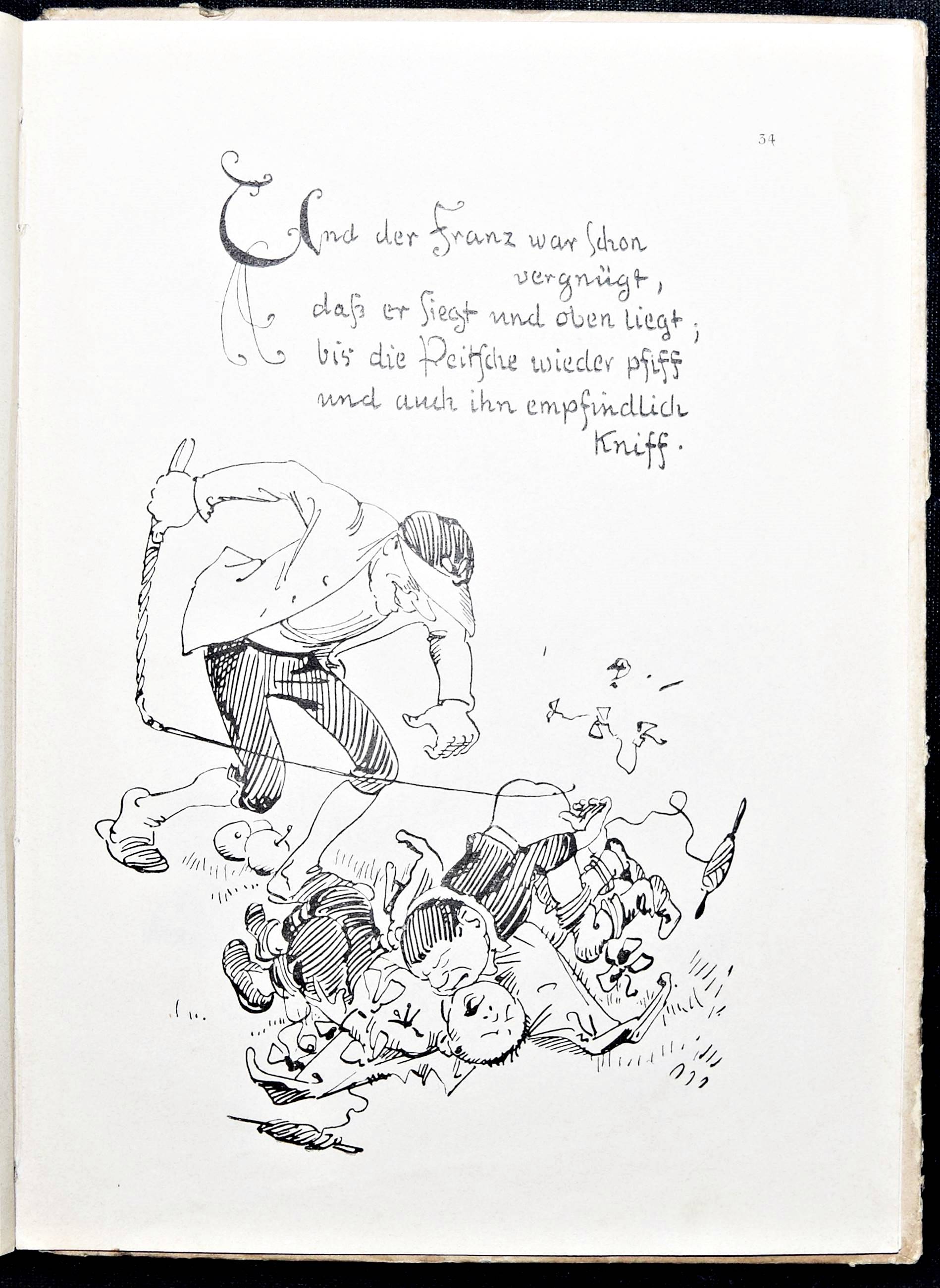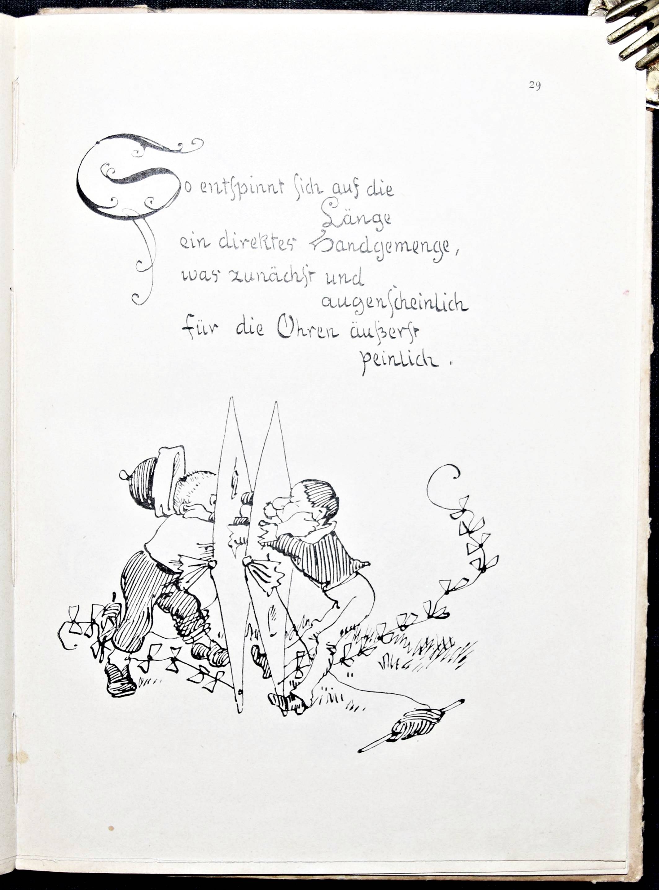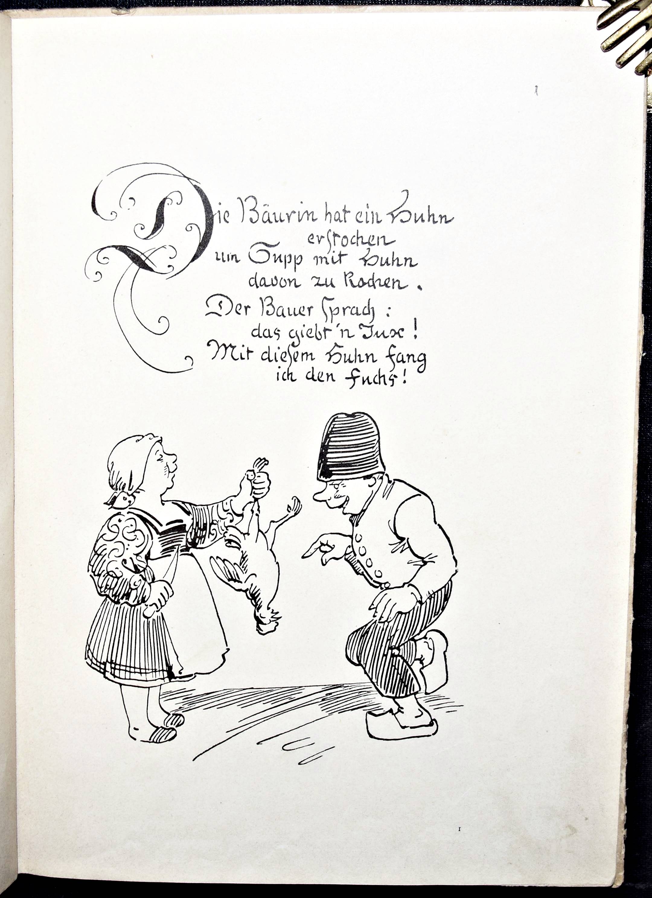 | Busch, Wilhelm. Der Fuchs. Die Drachen. Zwei lustige Sachen. 2. Aufl. München, Bassermann o. J. (1881). 8°. [2] Bl., 37 num. Bl., [1] Bl. mit 38 Zinkotypien. Farbig illustr. OPbd. Ries, Busch III, 1084. Rümann, Illustr. Bücher 205. Vanselow 76. – Eines der seltensten Bilderbücher W. Buschs. – Auch der Text ist von Busch geschrieben und mit den Bildern zusammen klischiert. – Rücken alt mit Papier überklebt, Kapital u. Fuß geringf. beschädigt, Deckel etwas angestaubt u. berieben, zeitgenöss. Widm. auf dem vord. Innendeckel, gutes sauberes Exemplar.