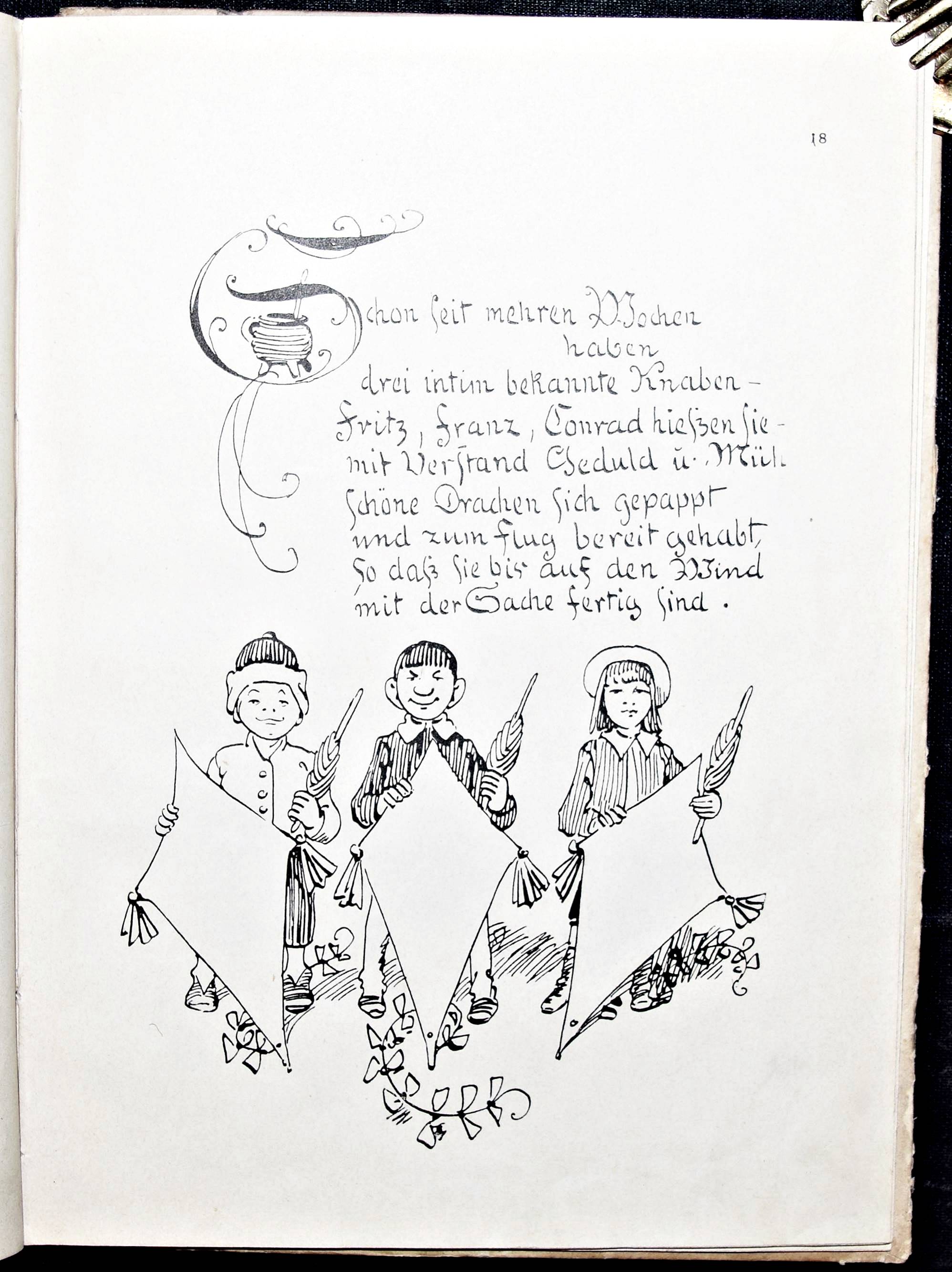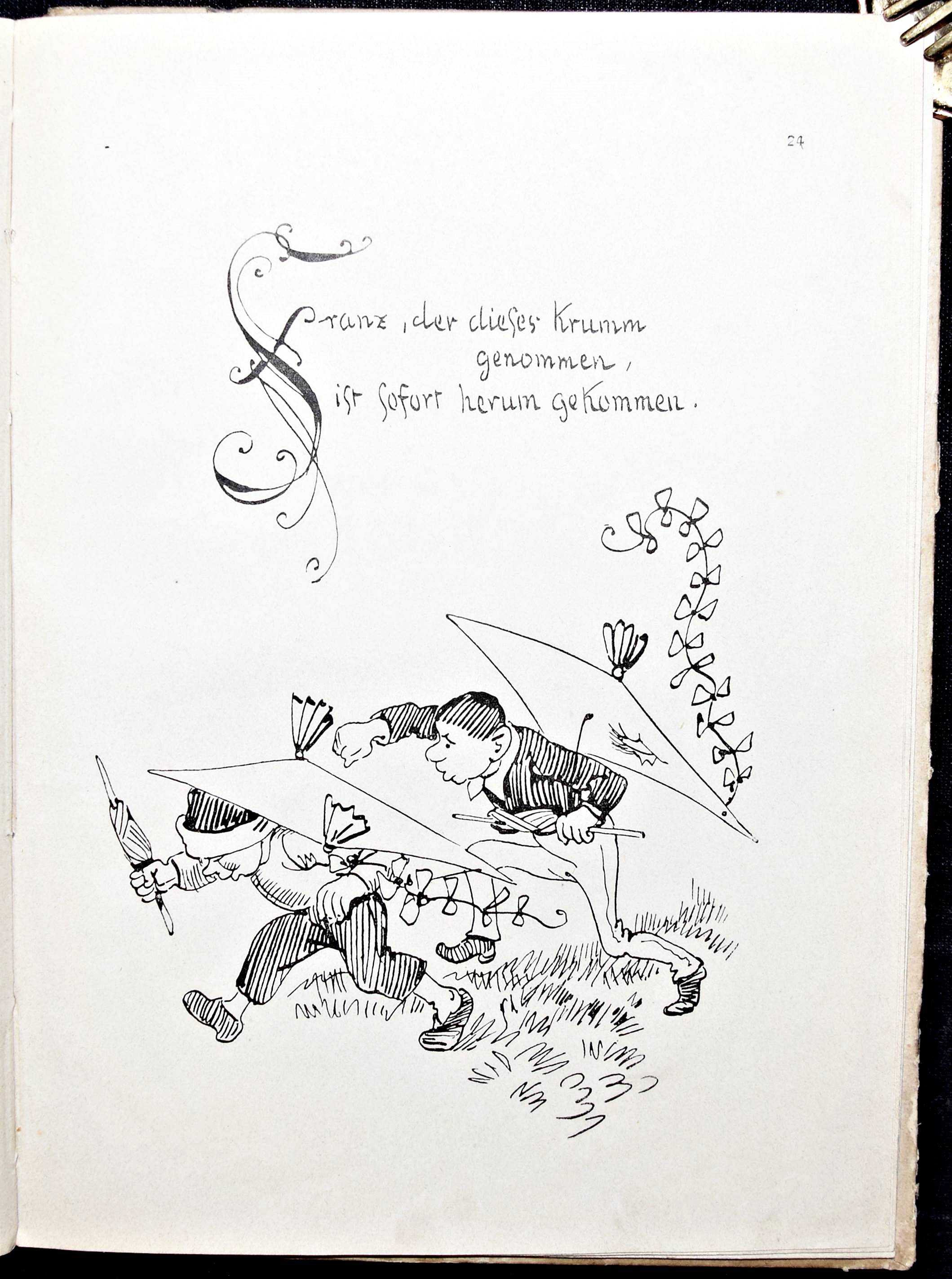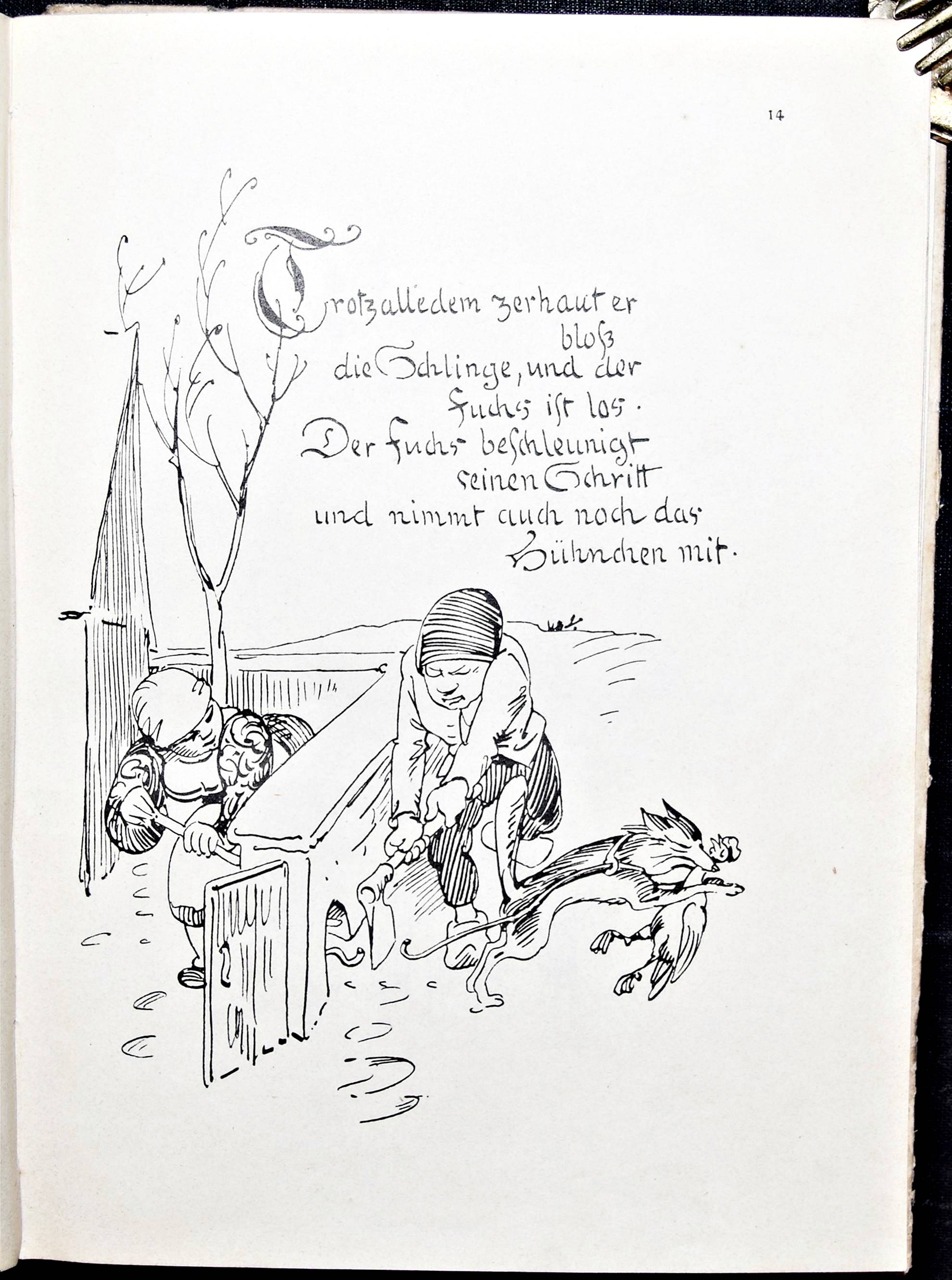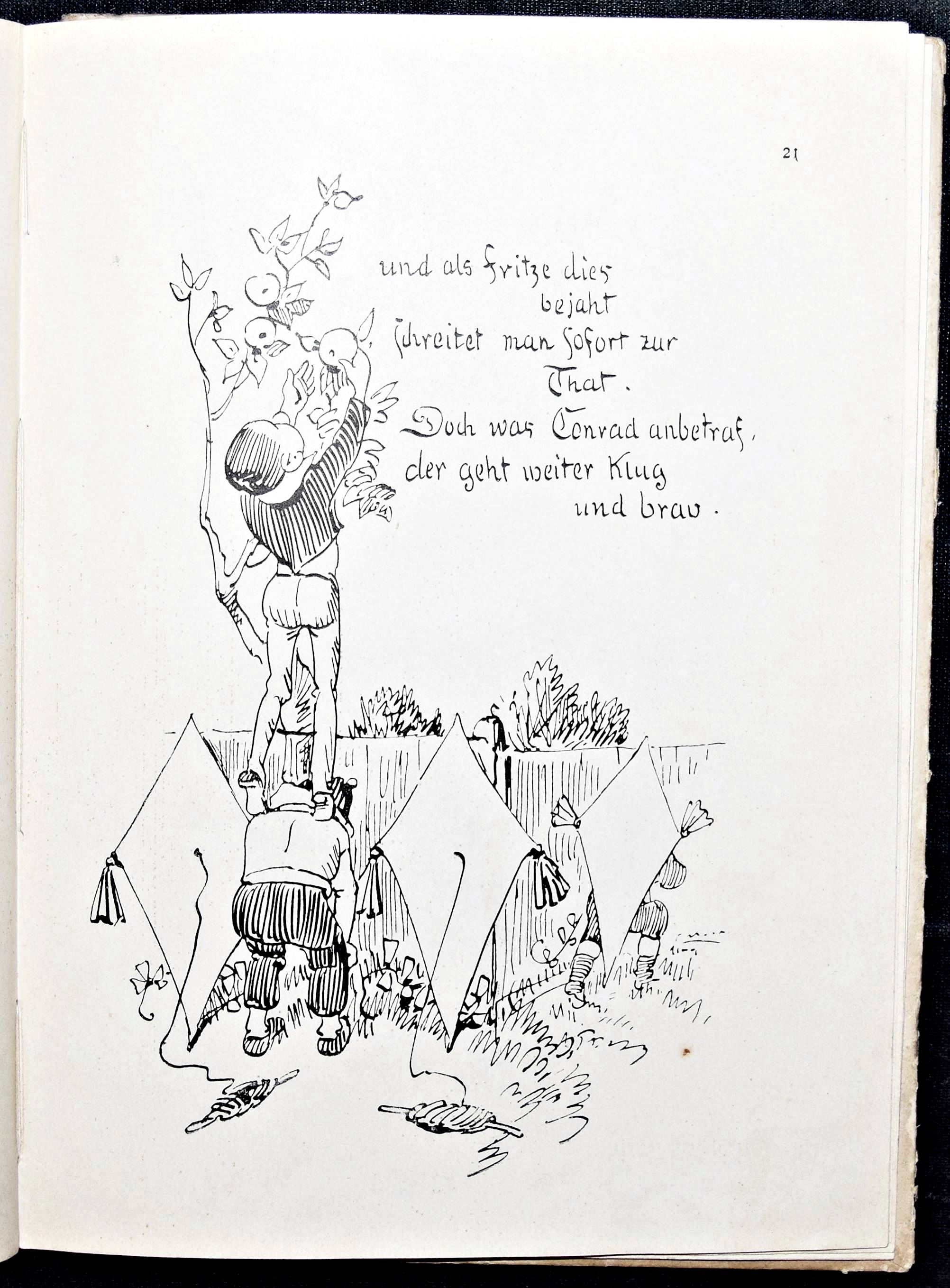 | Busch, Wilhelm. Der Fuchs. Die Drachen. Zwei lustige Sachen. 2. Aufl. München, Bassermann o. J. (1881). 8°. [2] Bl., 37 num. Bl., [1] Bl. mit 38 Zinkotypien. Farbig illustr. OPbd. Ries, Busch III, 1084. Rümann, Illustr. Bücher 205. Vanselow 76. – Eines der seltensten Bilderbücher W. Buschs. – Auch der Text ist von Busch geschrieben und mit den Bildern zusammen klischiert. – Rücken alt mit Papier überklebt, Kapital u. Fuß geringf. beschädigt, Deckel etwas angestaubt u. berieben, zeitgenöss. Widm. auf dem vord. Innendeckel, gutes sauberes Exemplar.