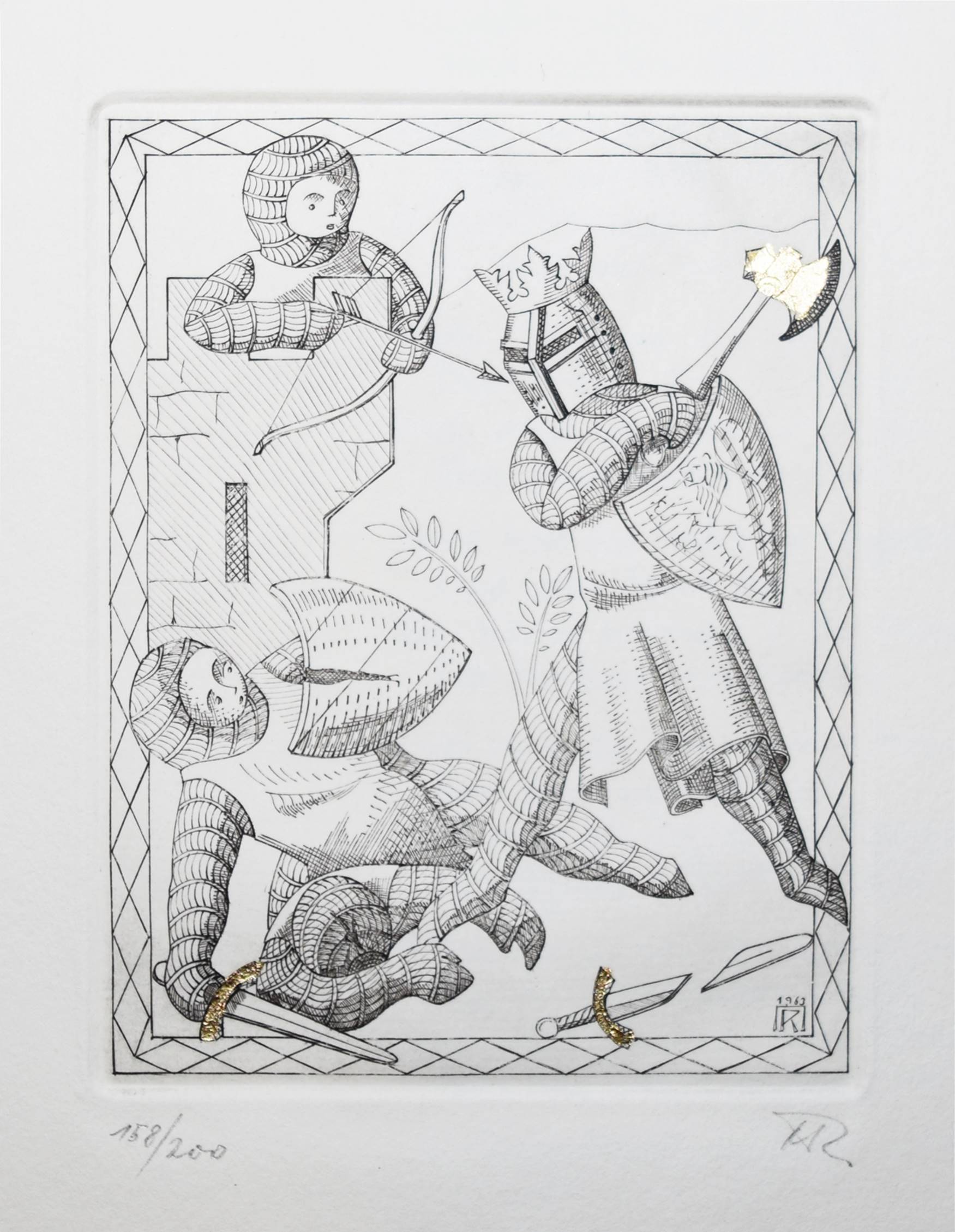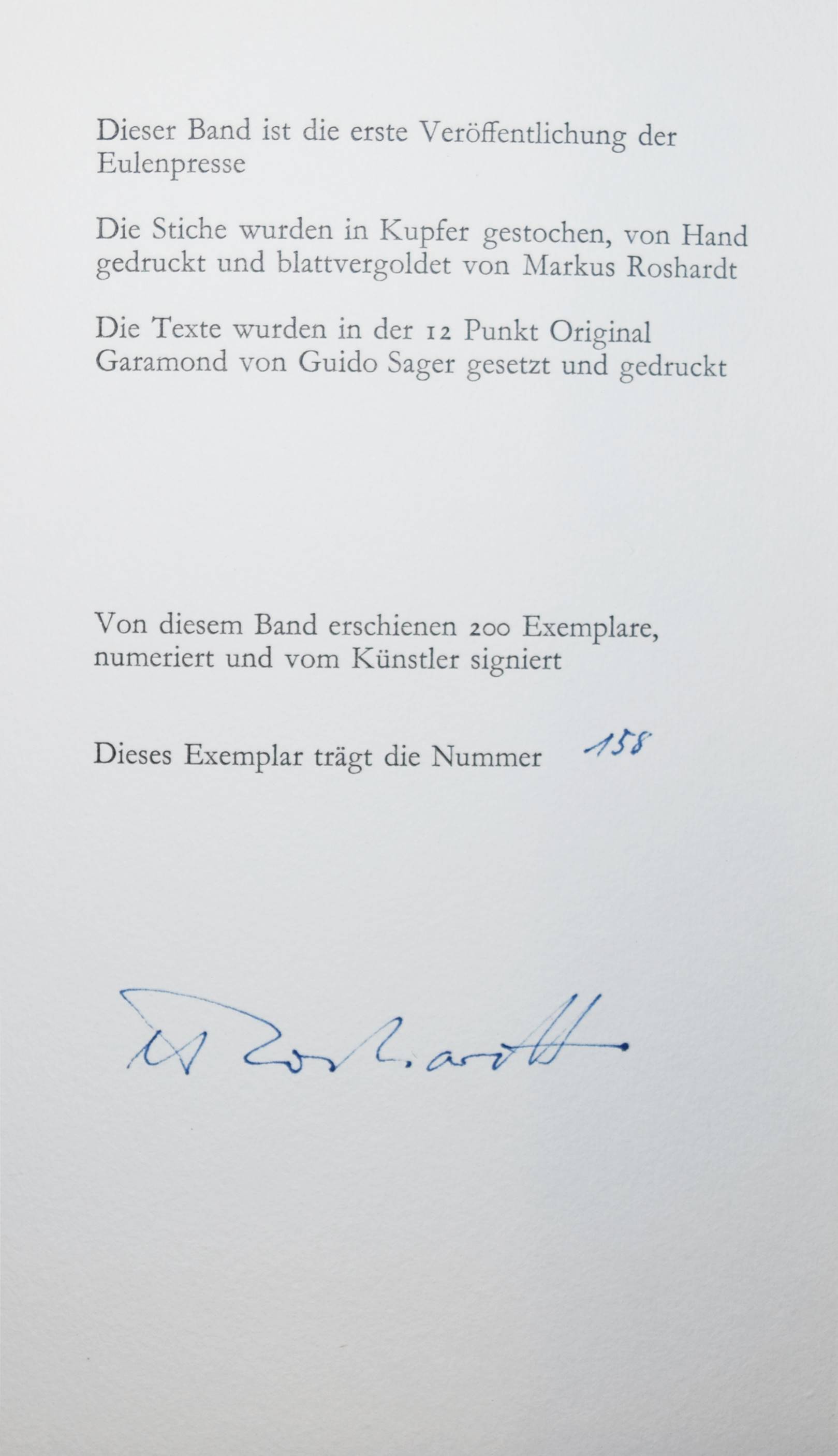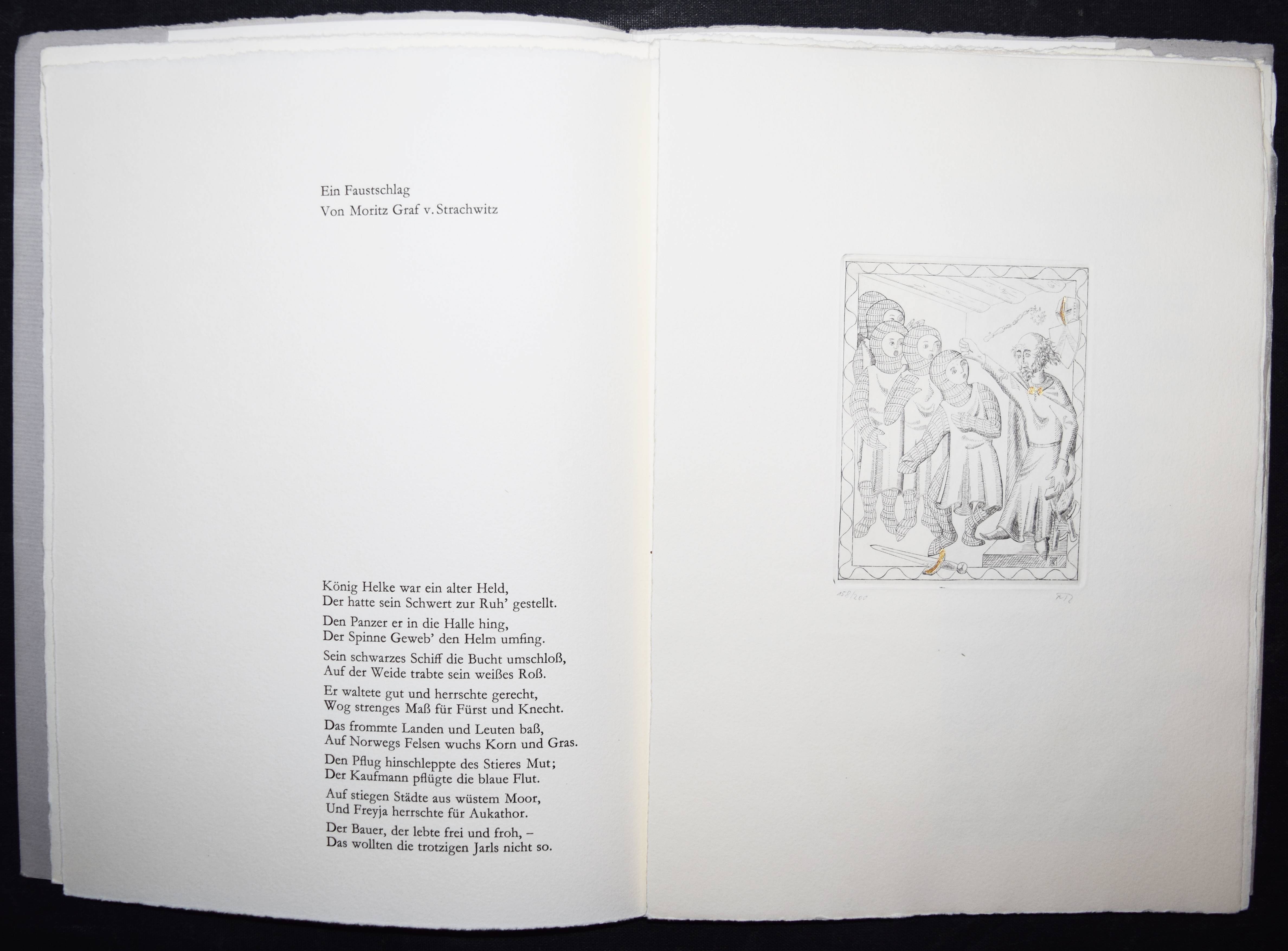 Strachwitz, Moritz Graf v Ein Faustschlag. – (Und): Ludwig Uhland. Schwäbische Kunde. – (Und): M. Graf v. Strachwitz. Richard Löwenherz’ Tod. (Baden), Eulenpresse o. J. (1965). 4°. [13] Bl. mit 3 monogrammierte u. num. Orig.-Radierungen mit Blattgold-Applikationen von Markus Roshardt. Illustr. OKart. Nicht bei Spindler. – Erster Druck der Eulenpresse. – Eines von 200 num. Exemplaren, im Impressum von M. Roshardt signiert. – Sehr gutes Exemplar.