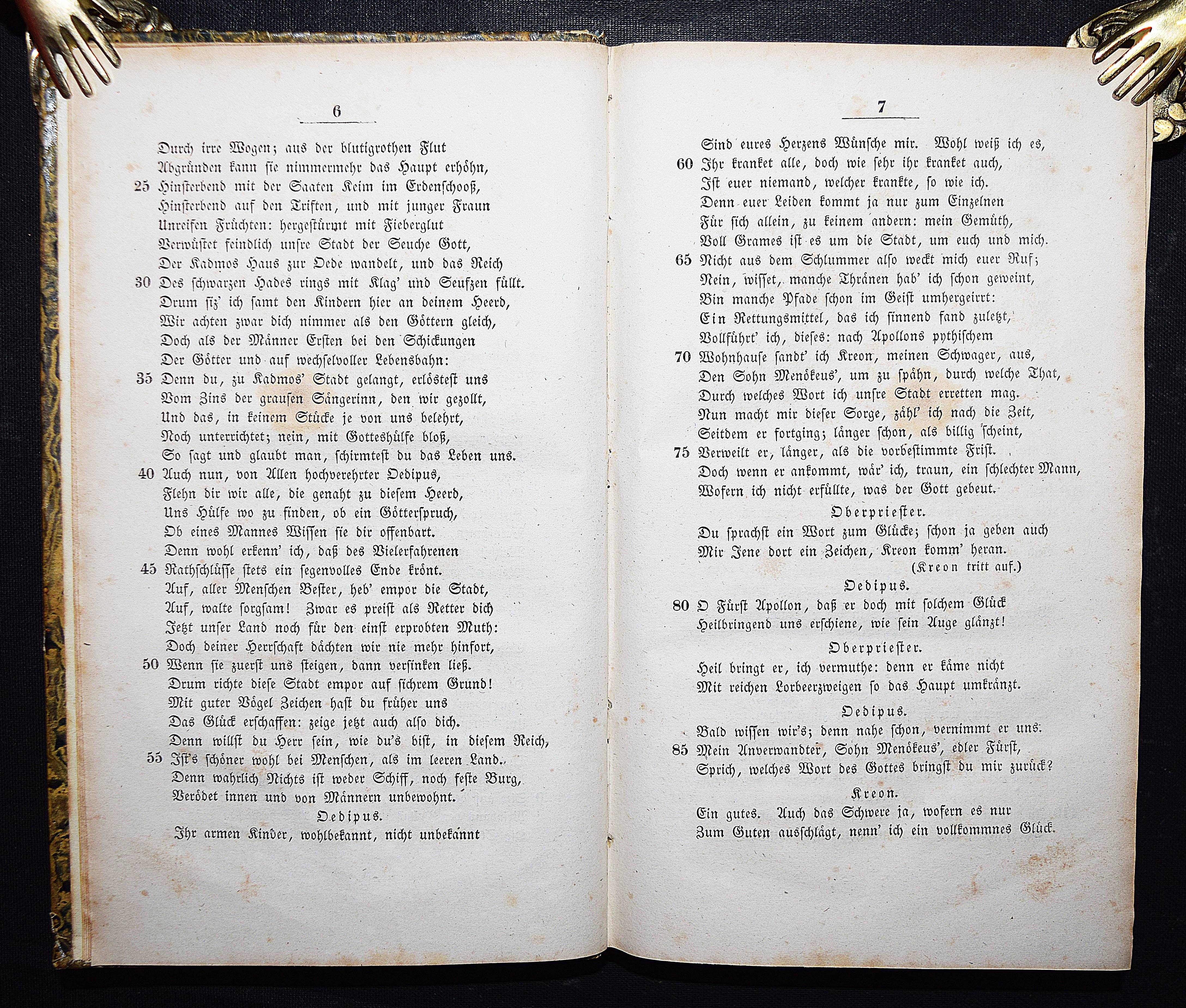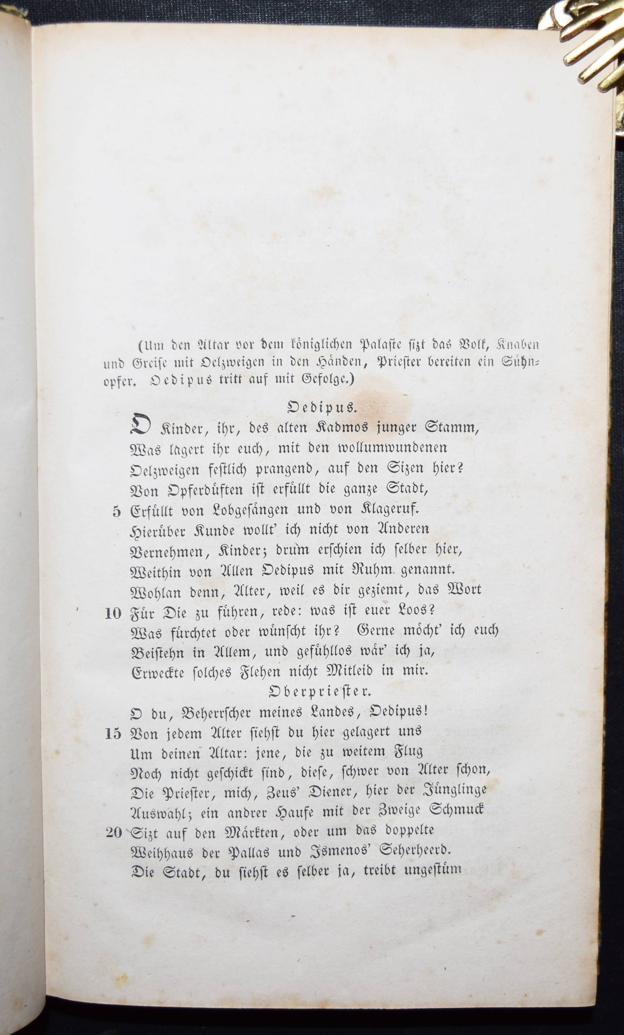 Sophokles. (Tragödien). (Übersetzt) von J(ohann) J(akob) C(hristian) Donner. Heidelberg, Winter 1839. 8°. 488 S., 2 Bl. Marm. Pbd. d. Zt. mit handschr. Rückensch. ADB V, 334. Goed. XVII, 301, 6. – Seltene erste Ausgabe der berühmten Übersetzungen. – „Sein Hauptwerk ist die Uebersetzung der Dramen von Sophokles, die er 1838 und 1839 veröffentlichte und die im J. 1875 die achte Auflage erlebt hat. Dieses Werk hob seinen Namen in die Reihe der Uebersetzer ersten Ranges empor. Als Sophokles’ Oedipus und Antigone auf Veranlassung König Friedrich Wilhelms IV. von Mendelssohn musikalisch bearbeitet wurden, wurde die Donner’sche Uebersetzung zu Grunde gelegt, da man fand, daß diese durch Schönheit und Wohlklang der Sprache sich am besten dazu eigne“ (K. Klüpfel in ADB). – N. a. V. u. St. a. T., stellenweise stockfleckig, gutes Exemplar.