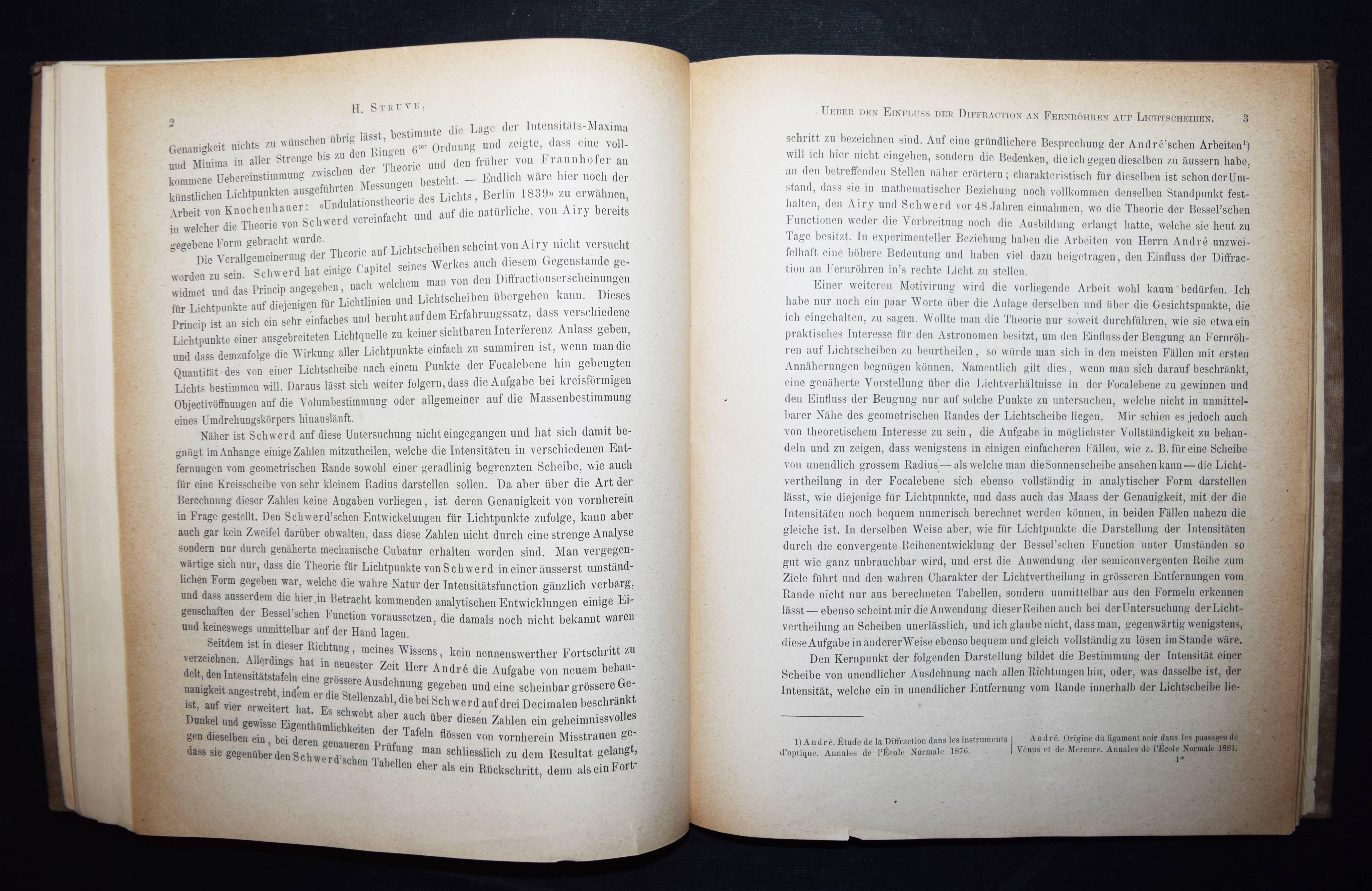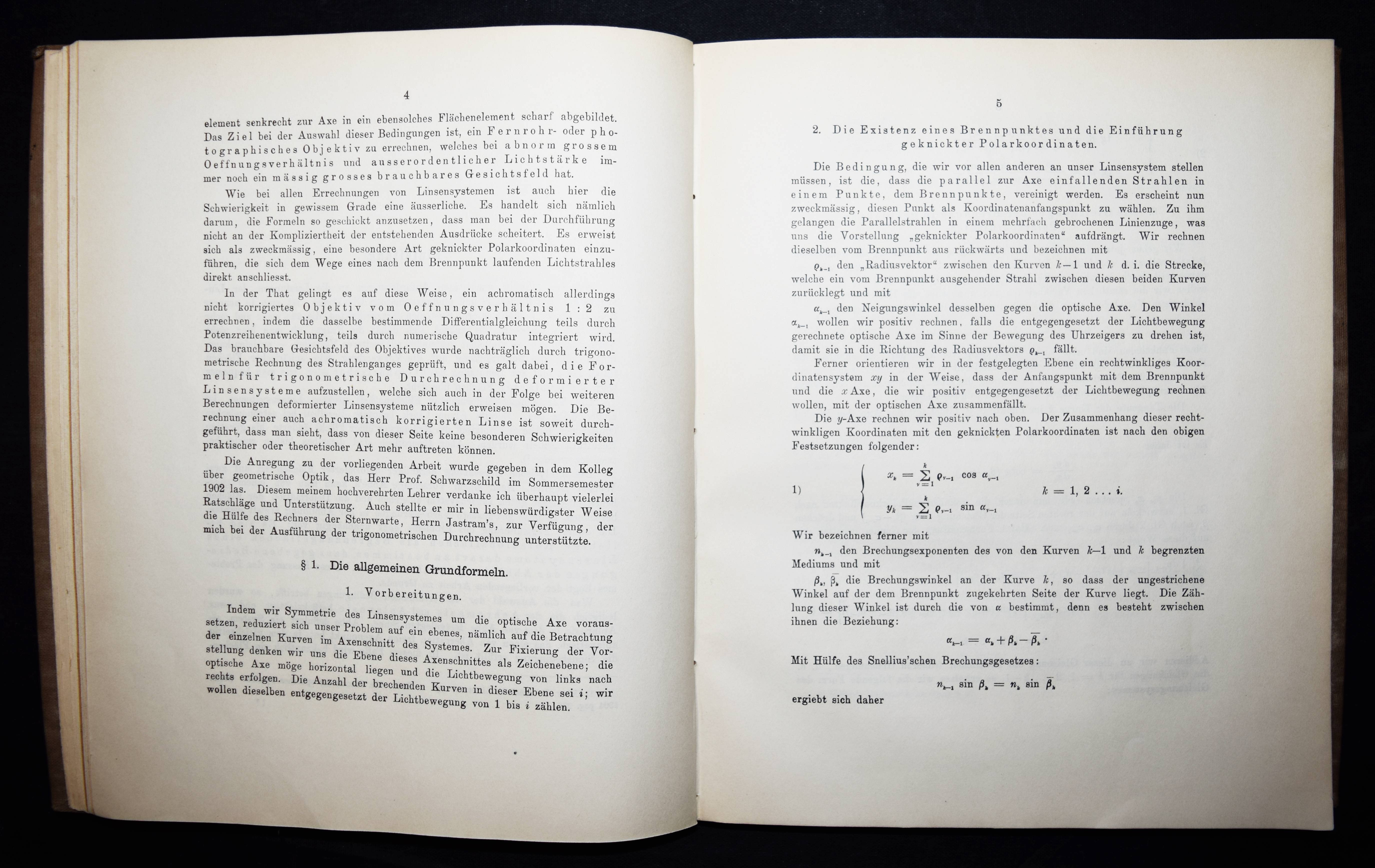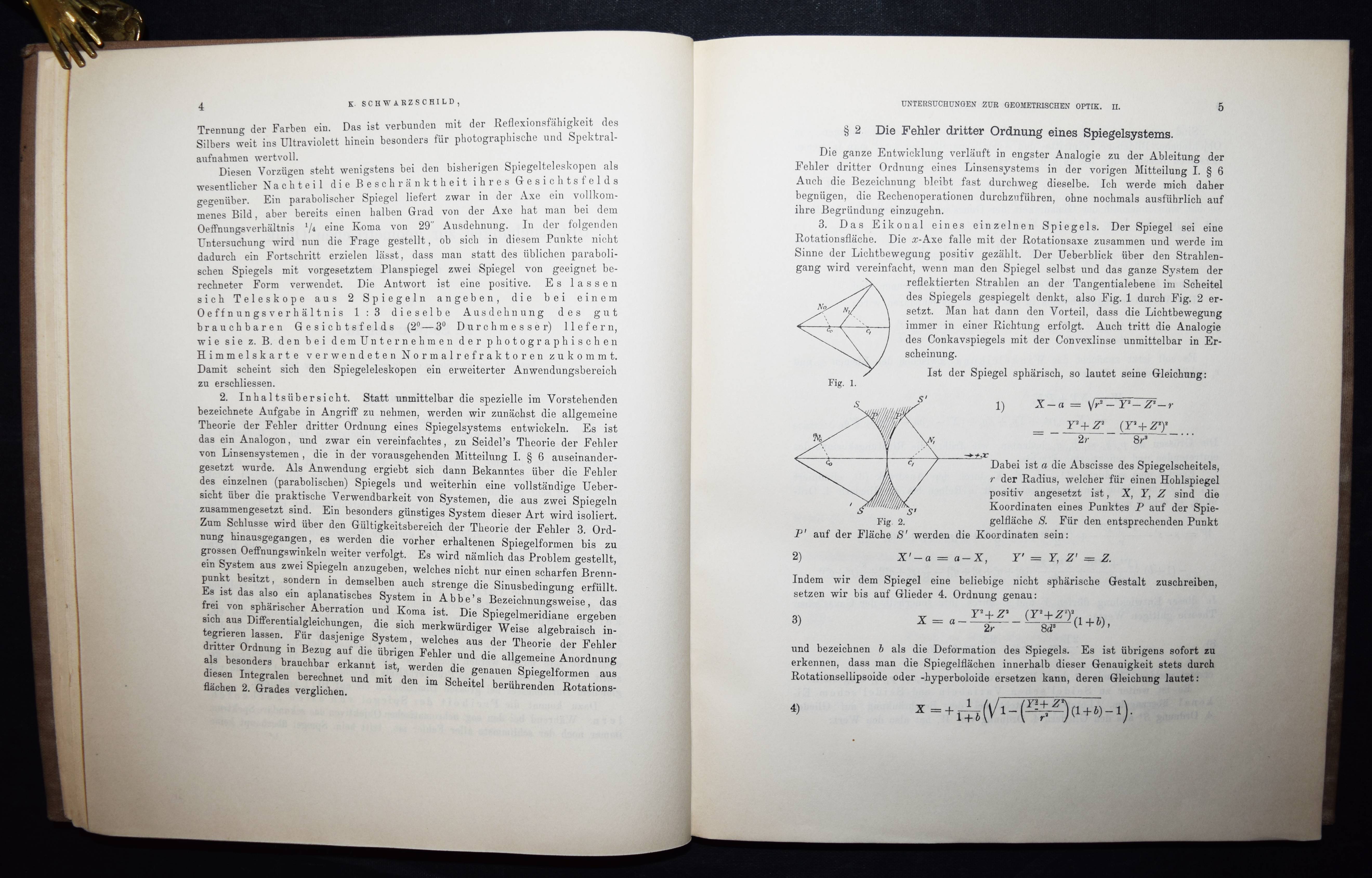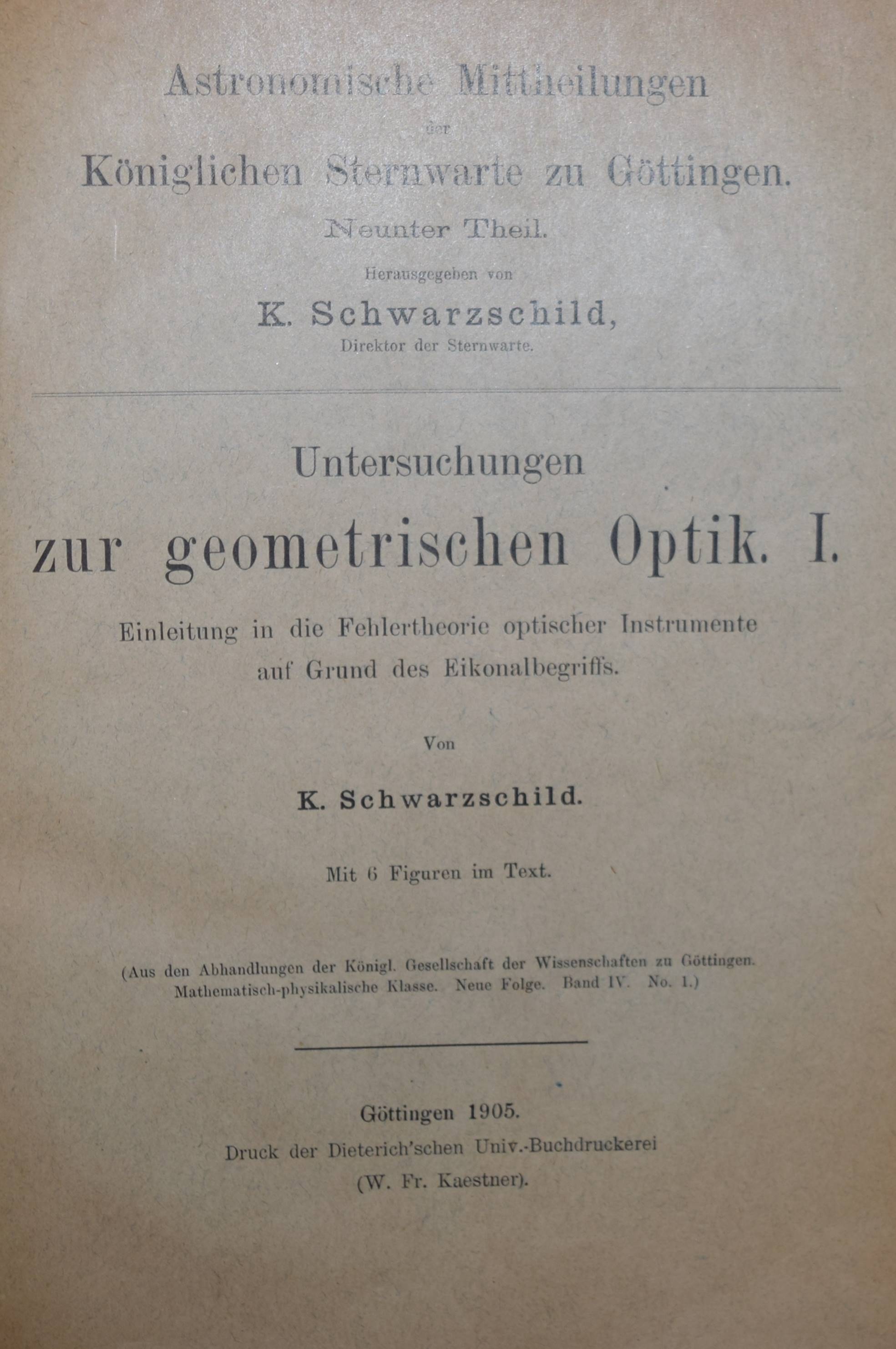 Schwarzschild, K(arl). Untersuchungen zur geometrischen Optik I. u. II (von 3). In: Astronomische Mittheilungen der Königlichen Sternwarte zu Göttingen. 9. u. 10. Theil. Göttingen, Dieterich’sche Univ.-Druckerei 1905. 4°. 31 S.; 28 S. mit zus. 15 Text-Figuren. Ln. d. Zt. DSB XII, 249. NDB XXIV, 33 f. Reinisch / Wittmann, Karl Schwarzfeld S. 83 (mit Abb.) u.104. – Wie alle ersten Ausgaben der Arbeiten des bedeutenden Astrophysikers sehr selten. – „Die Arbeiten Karl Schwarzschilds zur Optik, und hier insbesondere zur Teleskopoptik, sind fundamental, wie so viele seiner astrophysikalischen Arbeiten. Sie bilden bis heute die Grundlage für das Design, das Verständnis und die Optimierung des optischen Strahlengangs großer und bedeutender Teleskope. Selbst die optischen Entwürfe heutiger Teleskopgiganten bis 40 Meter Öffnung fußen mit ihren Drei-Spiegel-Anastigmaten auf seinen Arbeiten… Sein fundamentales Werk zur aberrationsbehafteten optischen Abbildung gliedert sich in drei Abhandlungen: „I. Einleitung in die Fehlertheorie optischer Instrumente auf Grund des Eikonalbegriffs“,”II. Theorie der Spiegelteleskope“,”III. Über die astrophotographischen Objektive“. Alle drei sind 1905 in den Astronomischen Mitteilungen der Königlichen Sternwarte zu Göttingen, Teil 9, 10 und 11 erschienen… ″ (H. E. Nicklas in Reinisch/Wittmann S. 81 ff.). – Der Astronom, Mathematiker und Physiker K. Schwarzschild (1873-1916) „gilt weltweit als einer der begabtesten und bedeutendsten Astronomen aller Zeiten und als Mitbegründer der Astrophysik. Geboren in Frankfurt am Main, wirkte er von 1901 bis 1909 als Professor für Astronomie und Direktor der Sternwarte in Göttingen und von 1909 bis 1916 als Direktor des Astrophysikalischen Observatoriums in Potsdam. Im Laufe seines allzu kurzen Lebens veröffentlichte Schwarzschild etwa 150 wissenschaftliche Arbeiten, viele davon von fundamentaler Bedeutung für die Entwicklung der Astronomie und Astrophysik“ (K. Reinsch u. A. D. Wittmann). – Beigebunden: Linnemann, Martin. Ueber nicht-sphärische Objektive. Inaug.-Dissertation. Göttingen, Ebda. 1905. 40, (2) S. mit 4 Text-Figuren. – „Vorlesungen und Uebungen besuchte ich bei den Herren Professoren und Dozenten: Brendel, Czermak, Hilbert, Klein, Lindemann, Röntgen, Schwarzschild, Seeliger, Voigt“ u.v.a. – Beigebunden: Struve, Hermann. Über den Einfluss der Diffraction an Fernröhren auf Lichtscheiben. – (Und): Ders. Zur Theorie der Talbot’schen Linien. (Und): Ders. Über die allgemeine Beugungsfigur in Fernröhren. In: Mémoires de l’Académie Impériale des Sciences de St. Pétersbourg, VIIe série. Tome XXX, No. 8, tome XXXI, No. 1 u. tome XXXIV, No. 5. St. Petersburg 1882, 1883 u. 1886. 104 S.; 13 S.; 15 S. typogr. Orig.-Umschläge teils beigebunden. – (Und): Astronomische Nachrichten. Band 138, No. 3289, Band 166, No. 3974 u. Band 168, No. 4010. Mit Artikeln von Otto Birck, T. N. ThieleH. E. Timerding u. Alexander Wilkens. – Außerdem sind 3 Prospekte der Firma Carl Zeiss begebunden: Projektionsmikroskop für das Epidiaskop. – Stereo-Komparatoren nach Pulfrich. – Makro-Projektionsapparat und großer Projektionsapparat. Berlin u.a. 1903. – Sammelband mit sehr seltenen und interessanten Arbeiten zur Optik. – Gelenke, Kapital u. Fuß mit Fehlstellen, Innendeckel mit handschr. Inhaltsverz. u. Bibliotheksst., sonst gut erhalten.